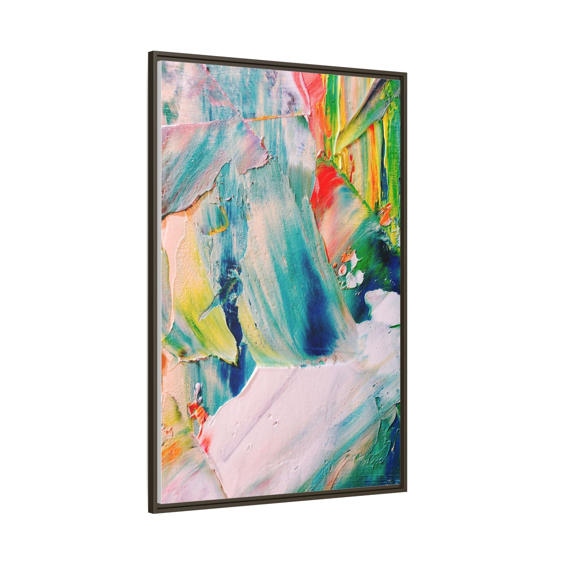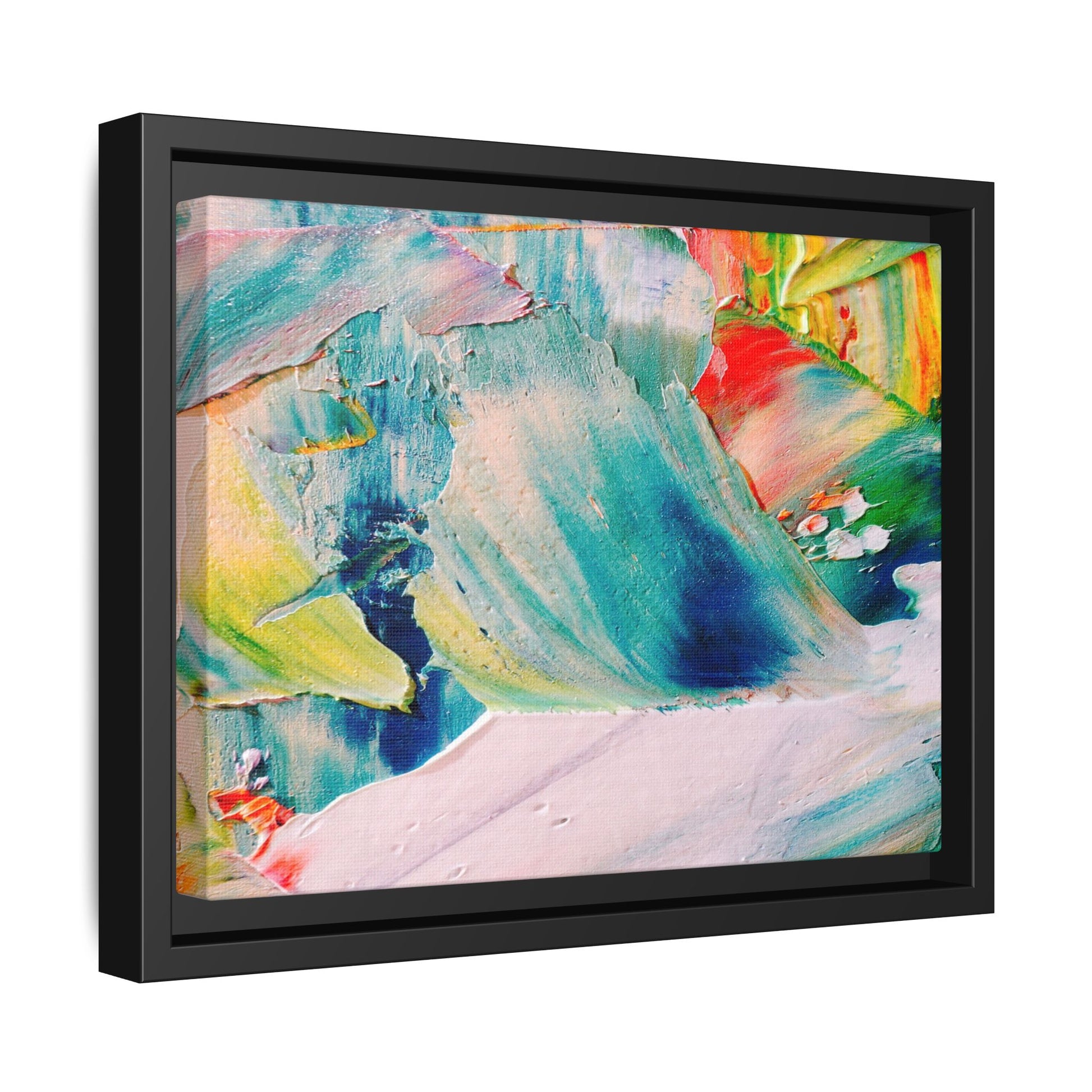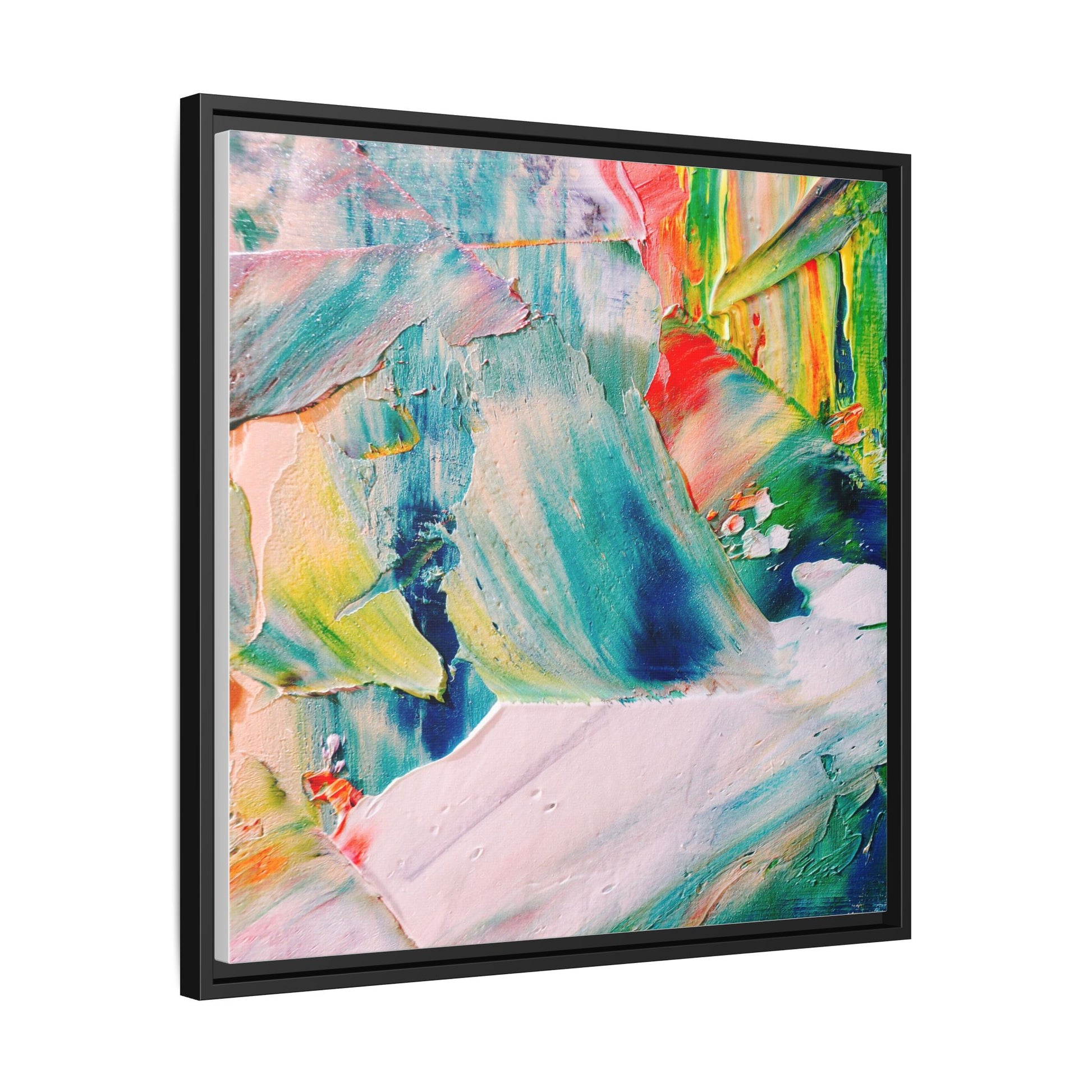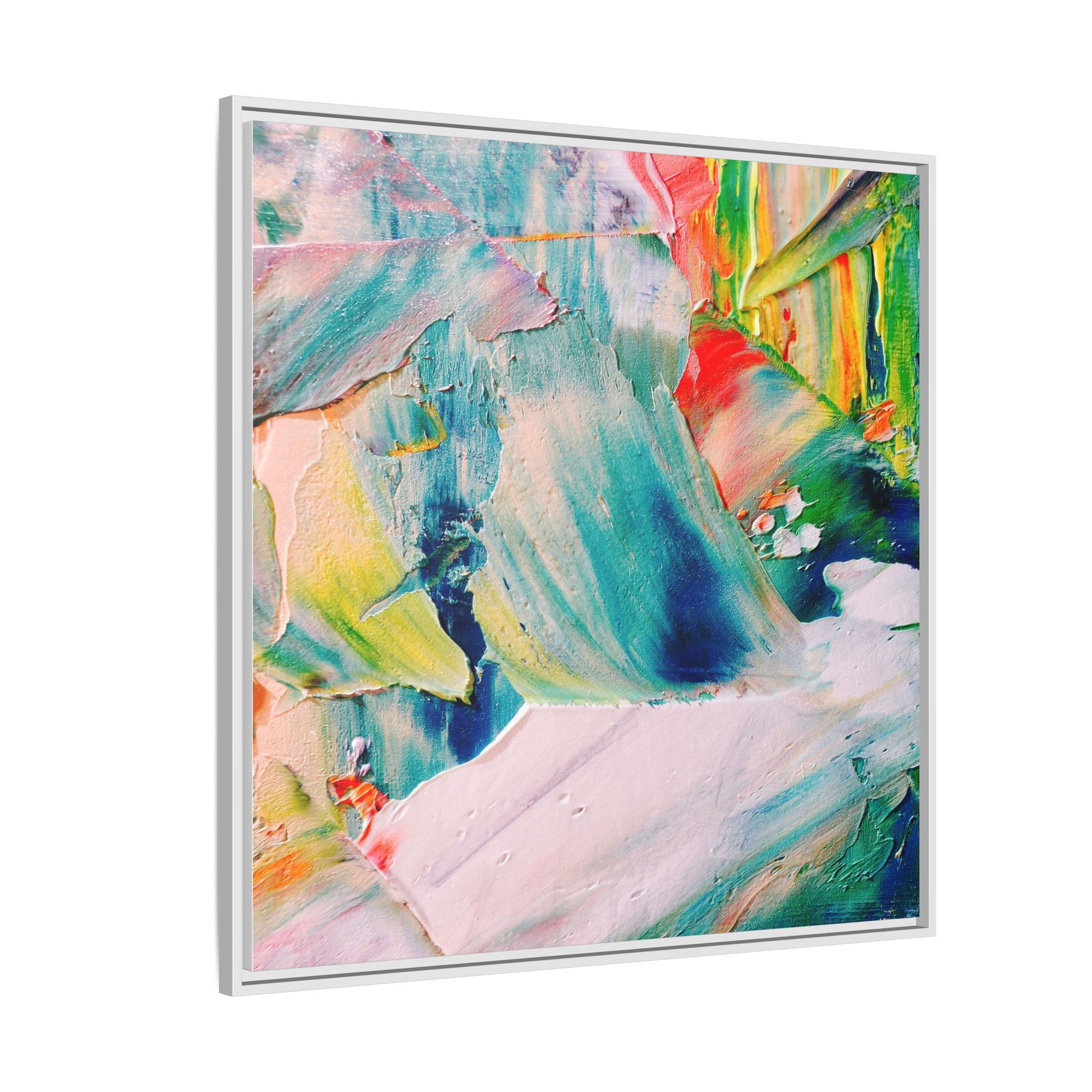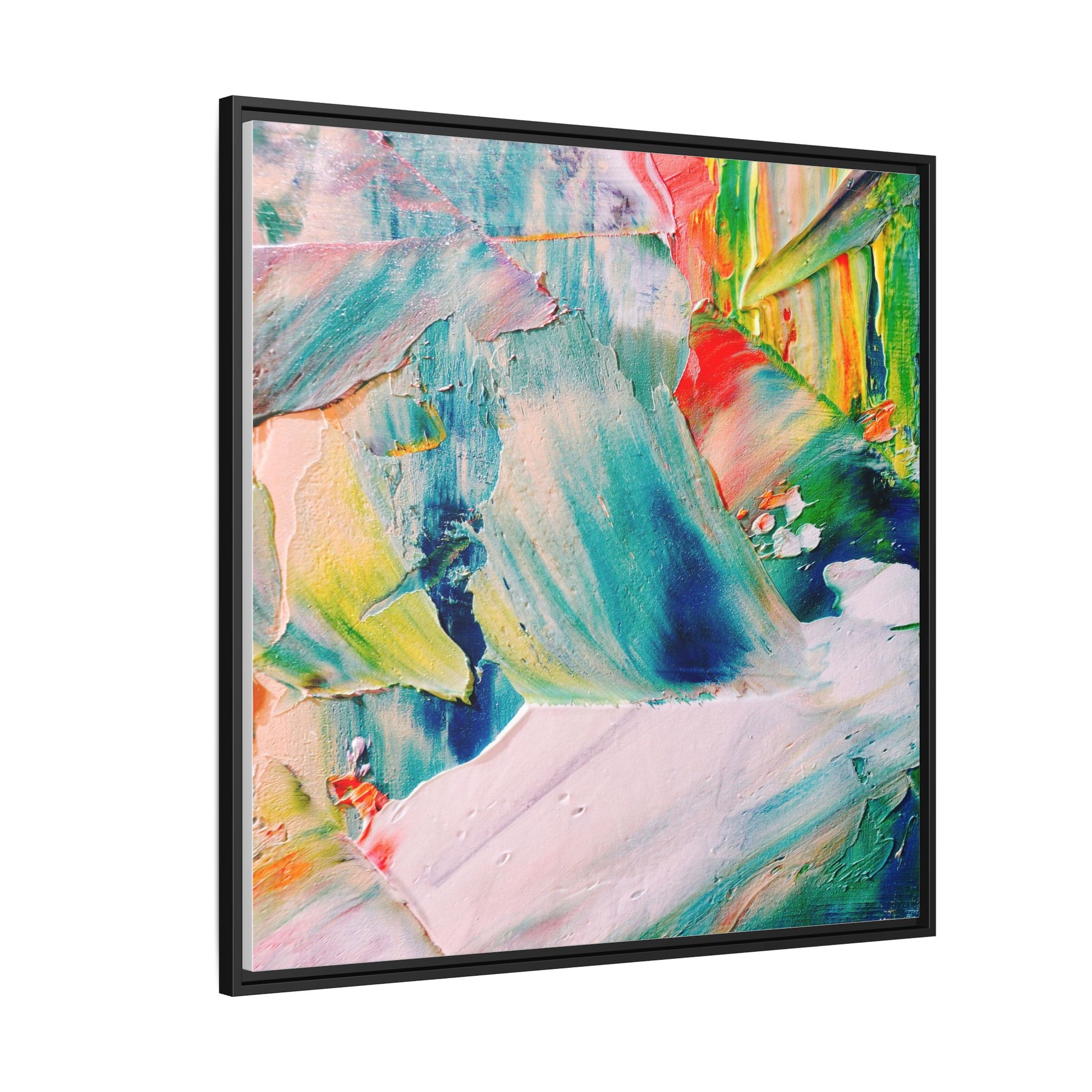 This vibrant abstract painting showcases a dynamic blend of colors and textures, creating a mesmerizing visual experience. The artwork features sweeping brushstrokes in a rich palette of blues, greens, reds, yellows, and soft pastels, with each color bleeding and blending into the next. Thick, layered paint creates a sense of depth and movement, with textured ridges and valleys that catch the light and add dimensionality to the piece. The composition appears fluid and organic, suggesting a sense of motion or a landscape viewed through a kaleidoscopic lens. The painting's impasto technique and bold color choices evoke an emotional, almost visceral response, inviting viewers to explore the intricate details and sweeping gestures of the artwork.