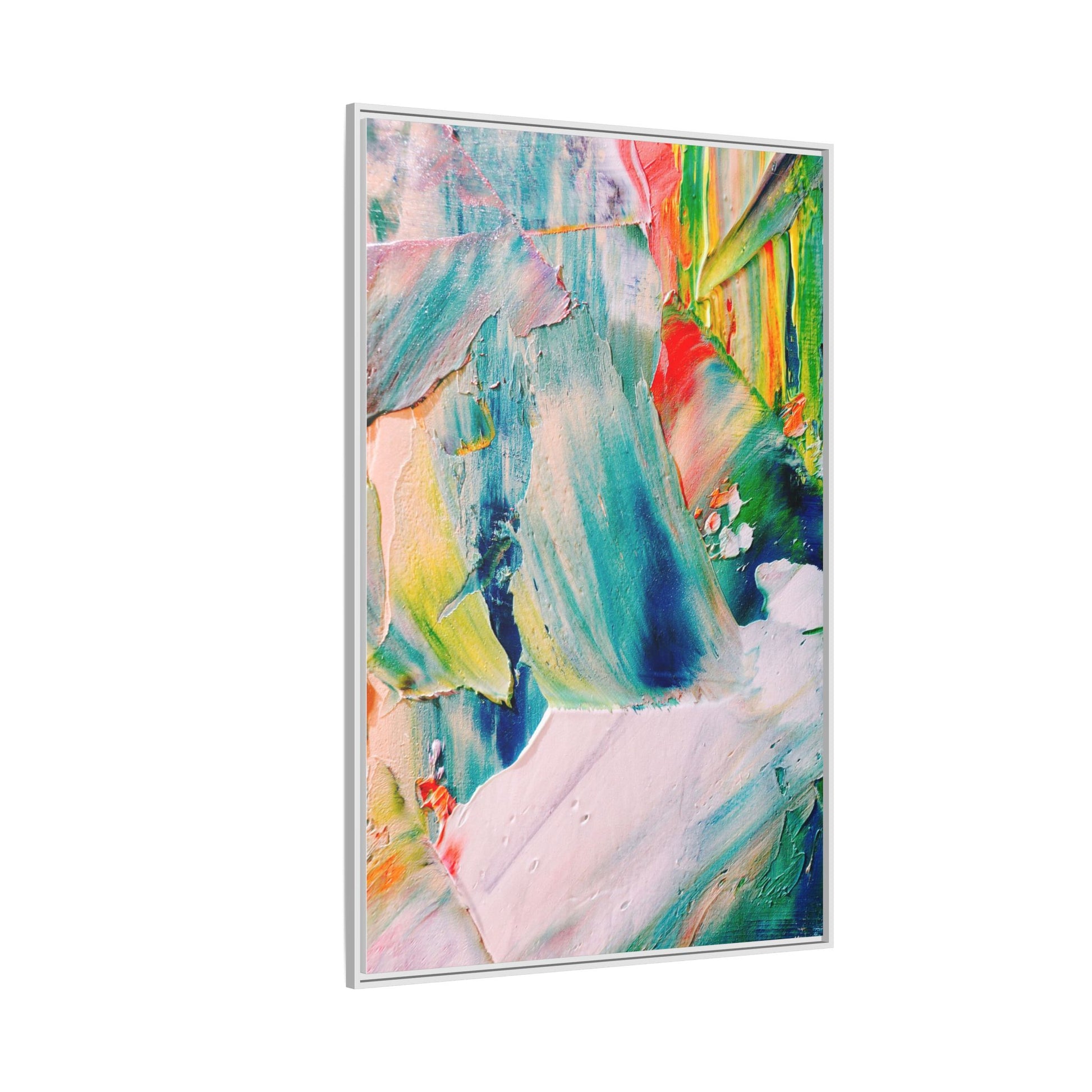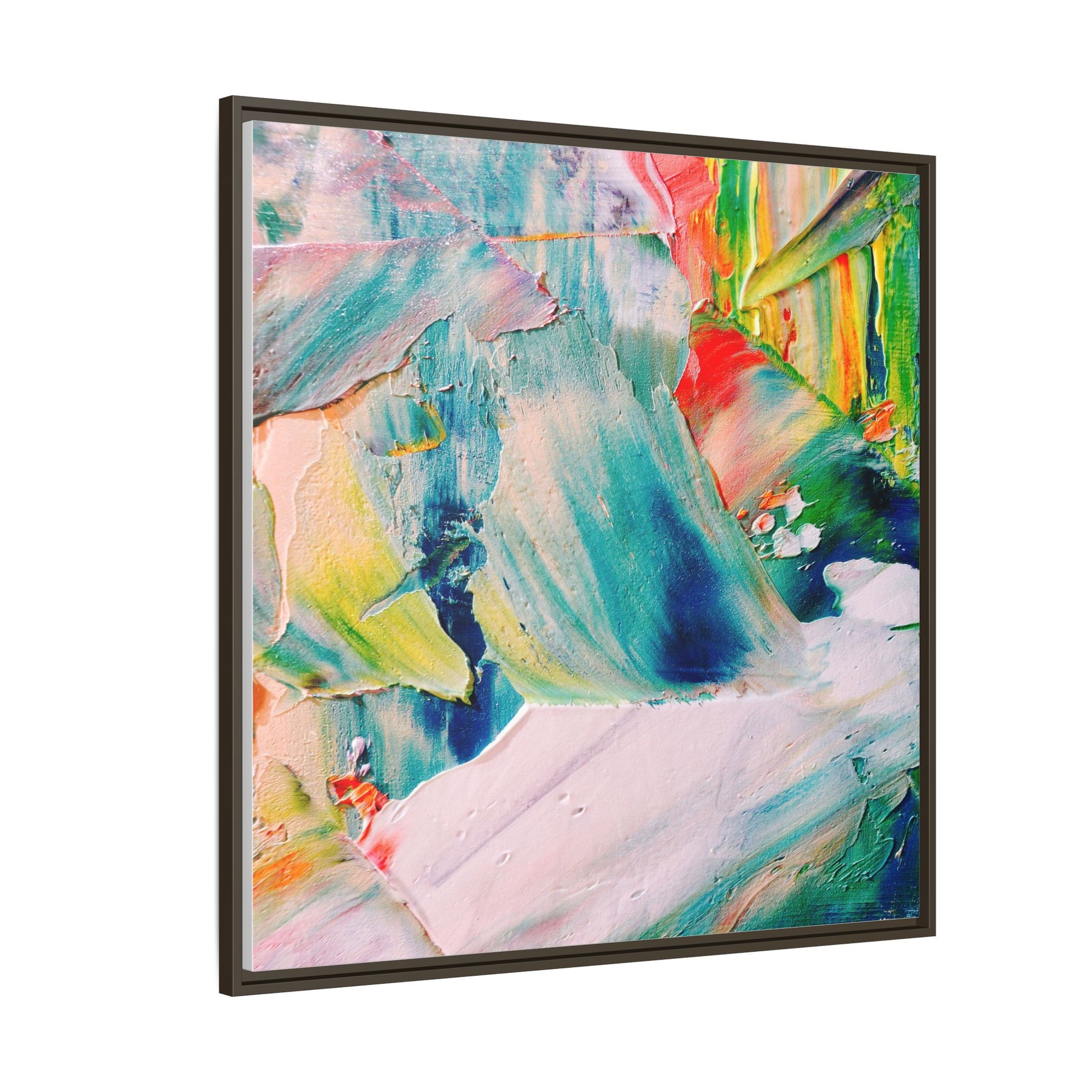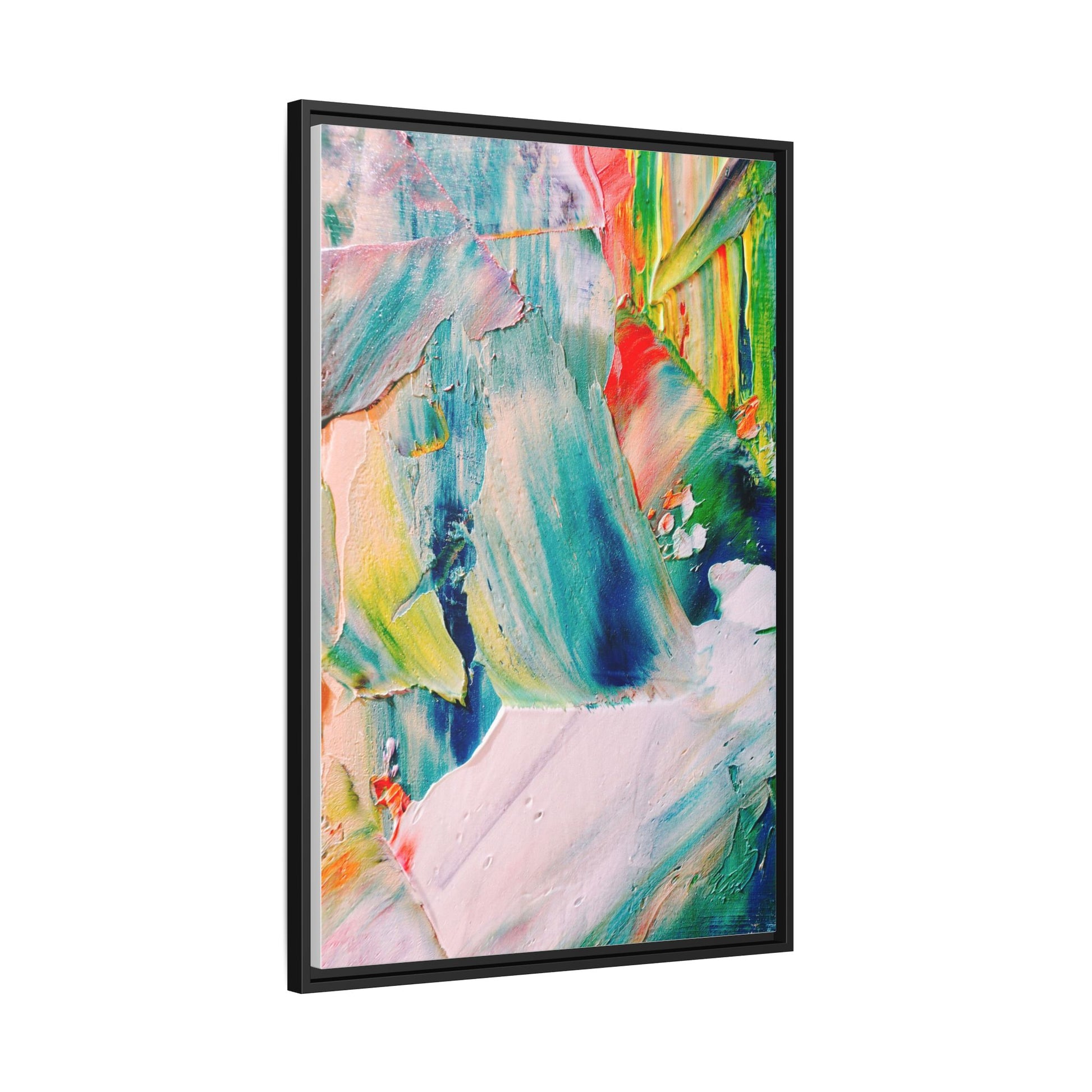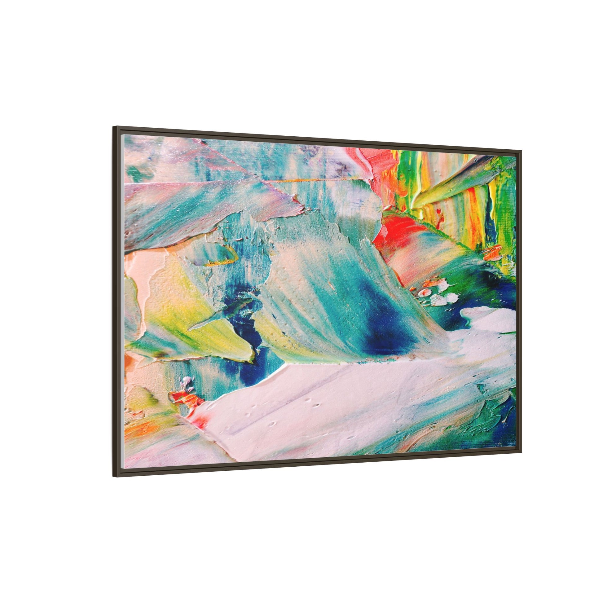 This vibrant abstract painting showcases a dynamic blend of colors and textures, creating a mesmerizing visual experience. The artwork features sweeping brushstrokes in a rich palette of blues, greens, reds, yellows, and soft pastels, with each color bleeding and blending into the next. Thick, layered paint creates a sense of depth and movement, with textured ridges and valleys that catch the light and add dimensionality to the piece. The composition appears fluid and organic, suggesting a sense of motion or a landscape viewed through a kaleidoscopic lens. The painting's impasto technique and bold color choices evoke an emotional, almost visceral response, inviting viewers to explore the intricate details and sweeping gestures of the artwork.