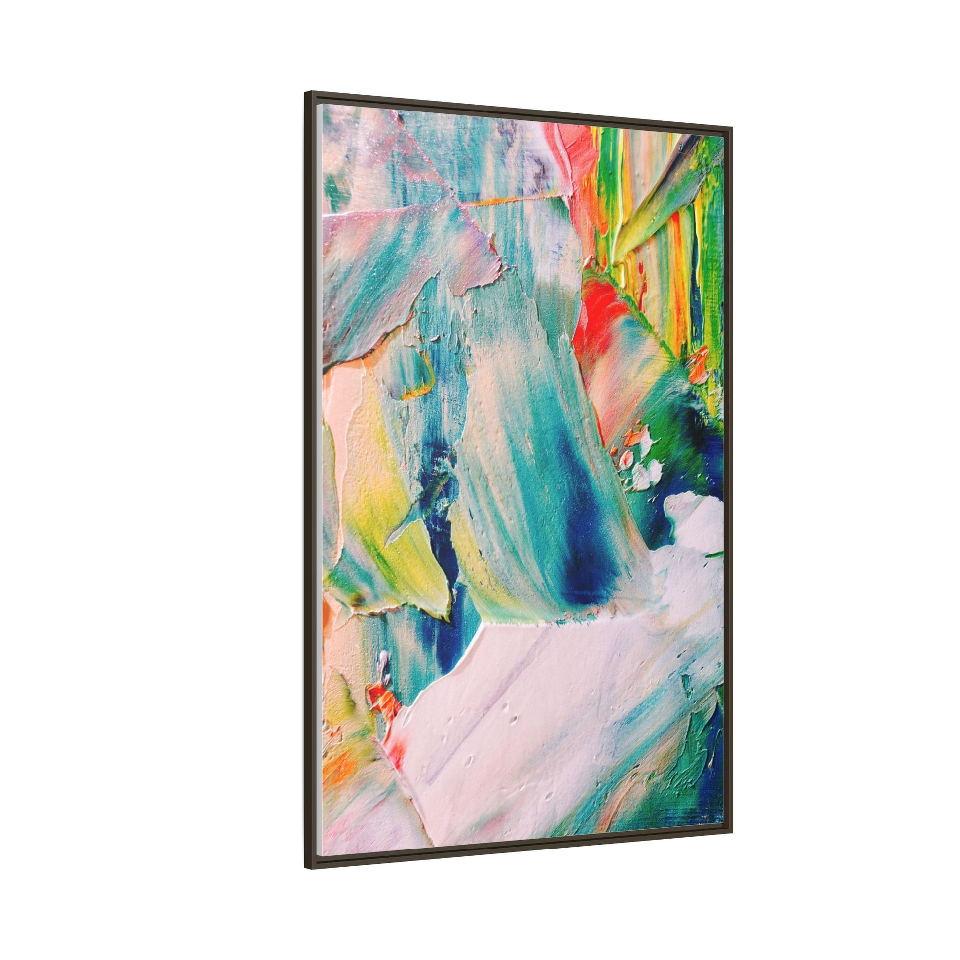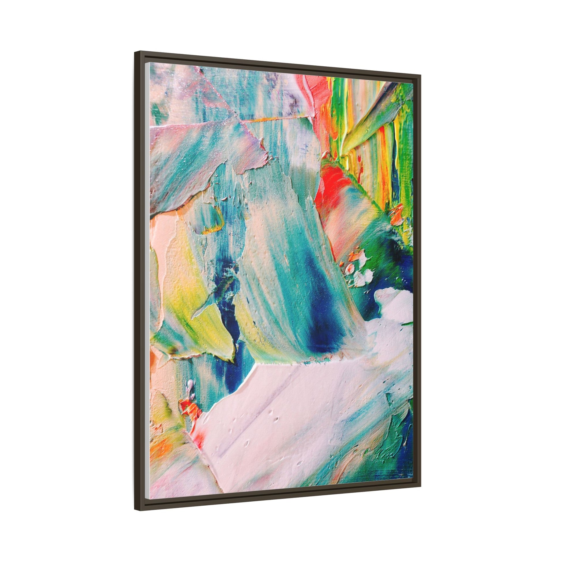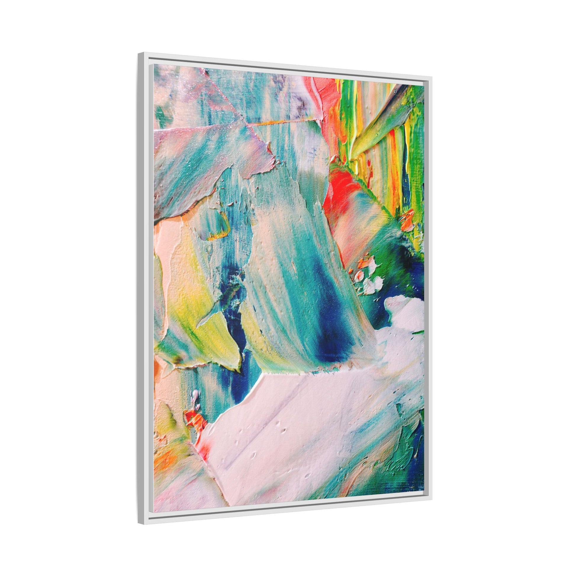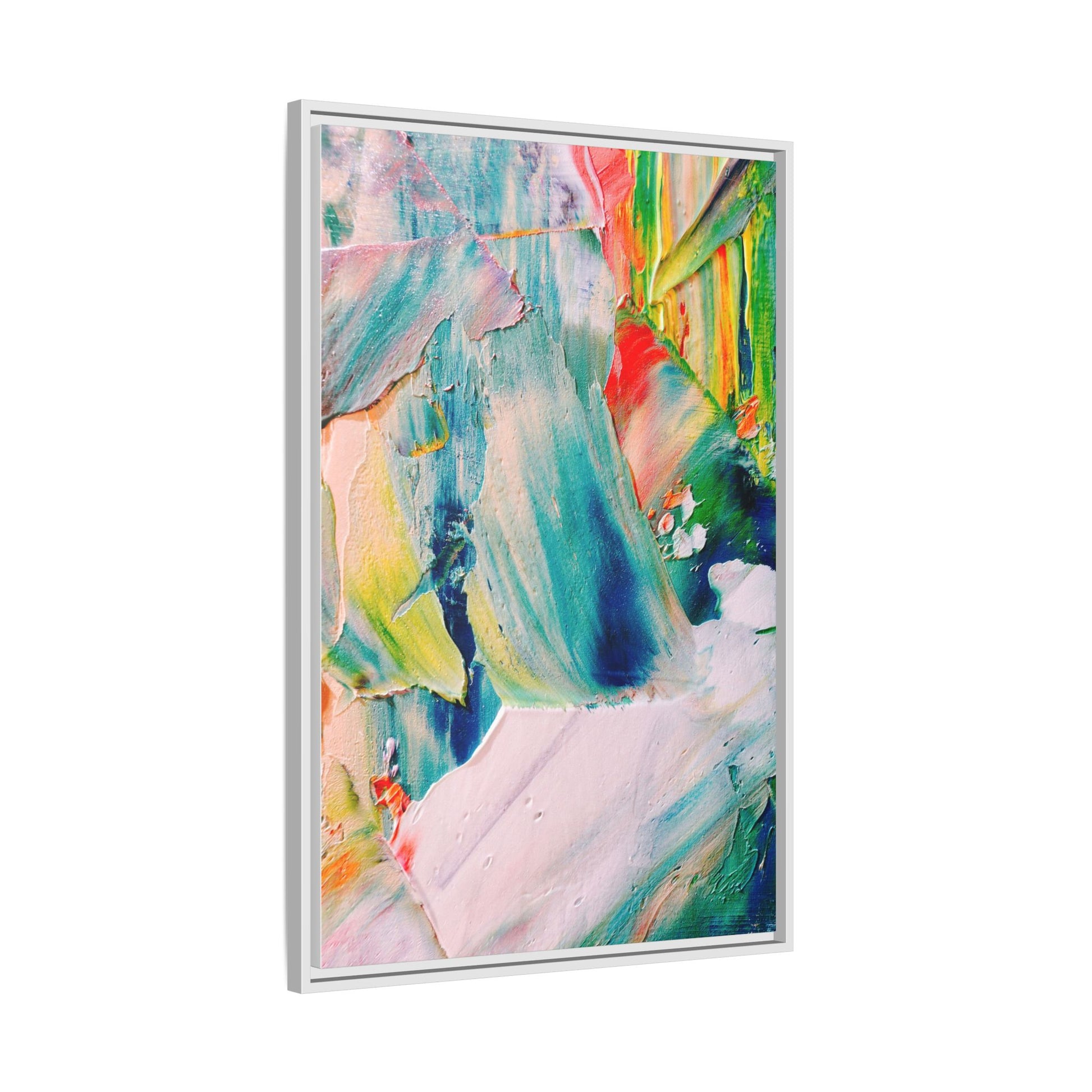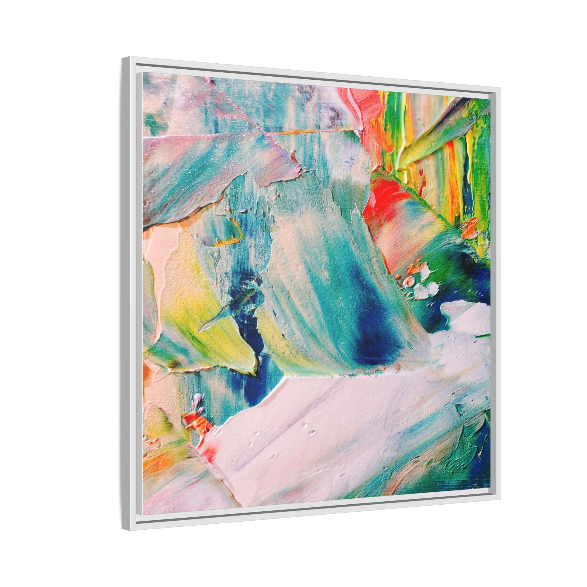 This vibrant abstract painting showcases a dynamic blend of colors and textures, creating a mesmerizing visual experience. The artwork features sweeping brushstrokes in a rich palette of blues, greens, reds, yellows, and soft pastels, with each color bleeding and blending into the next. Thick, layered paint creates a sense of depth and movement, with textured ridges and valleys that catch the light and add dimensionality to the piece. The composition appears fluid and organic, suggesting a sense of motion or a landscape viewed through a kaleidoscopic lens. The painting's impasto technique and bold color choices evoke an emotional, almost visceral response, inviting viewers to explore the intricate details and sweeping gestures of the artwork.