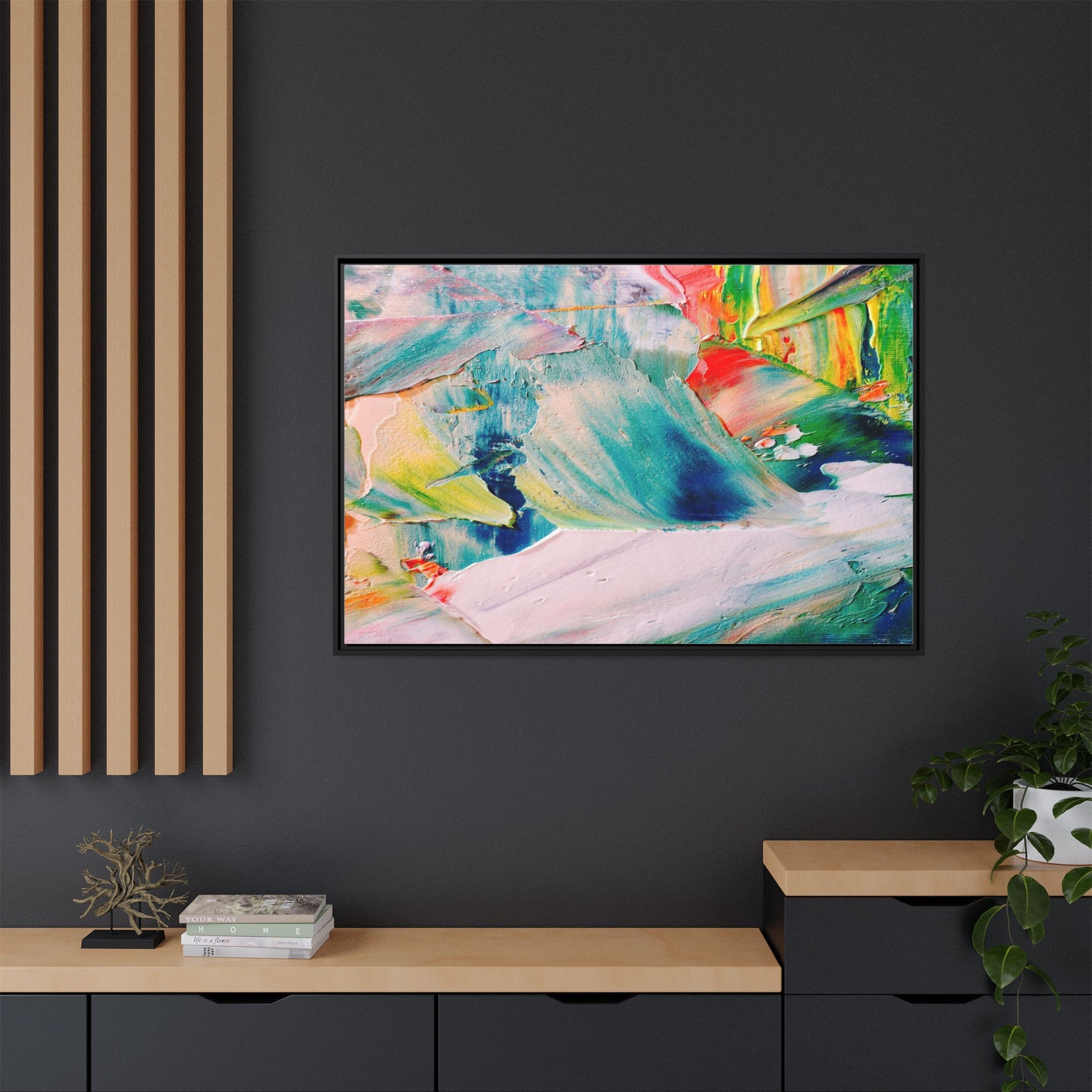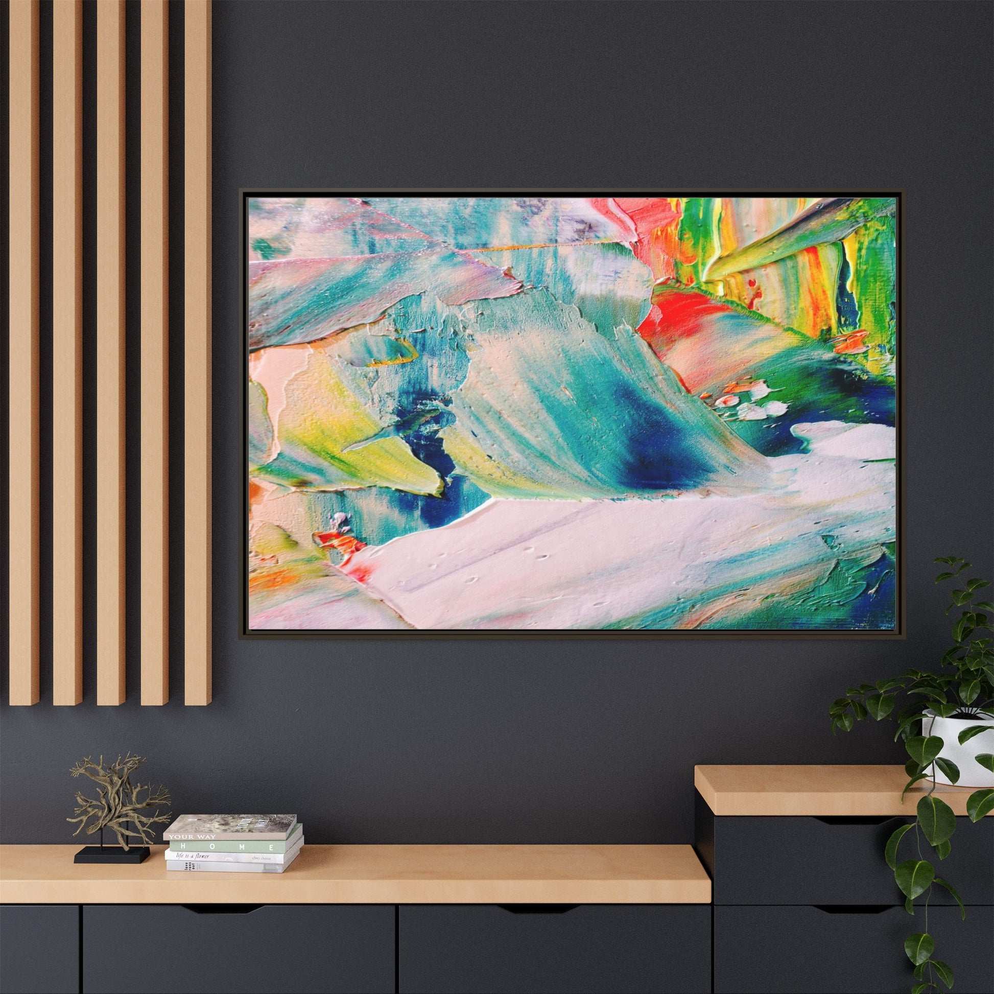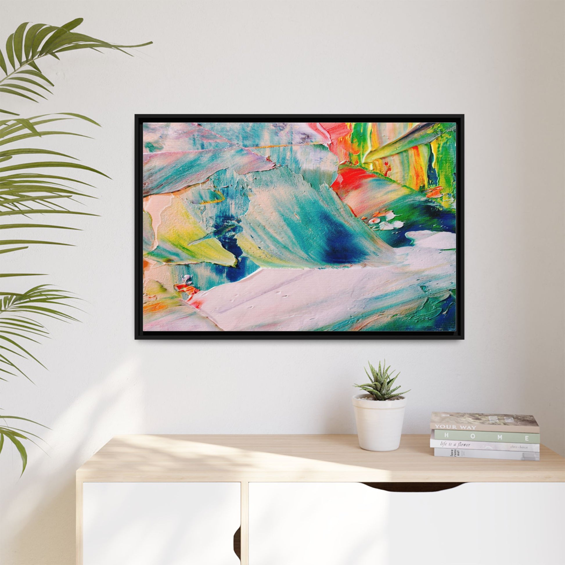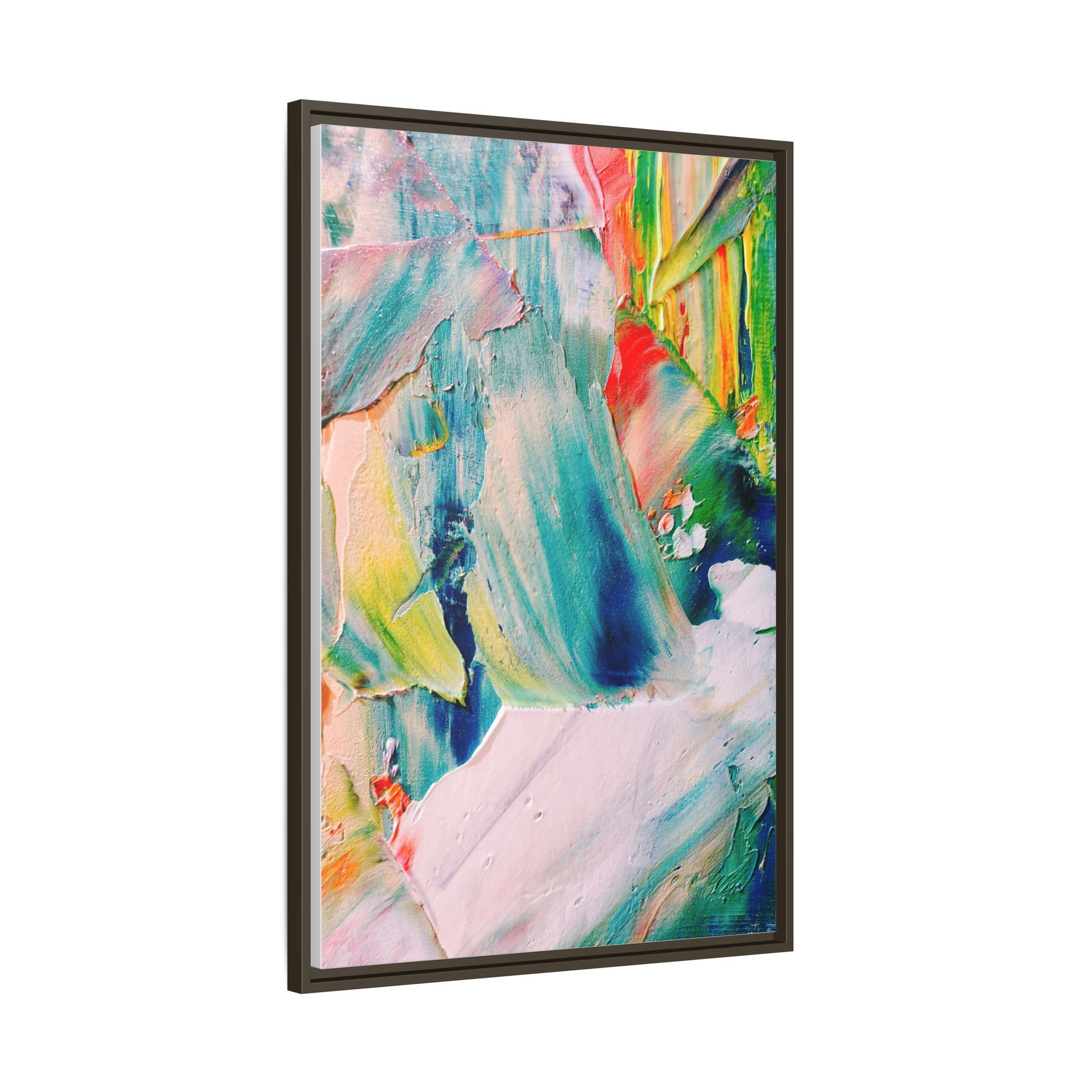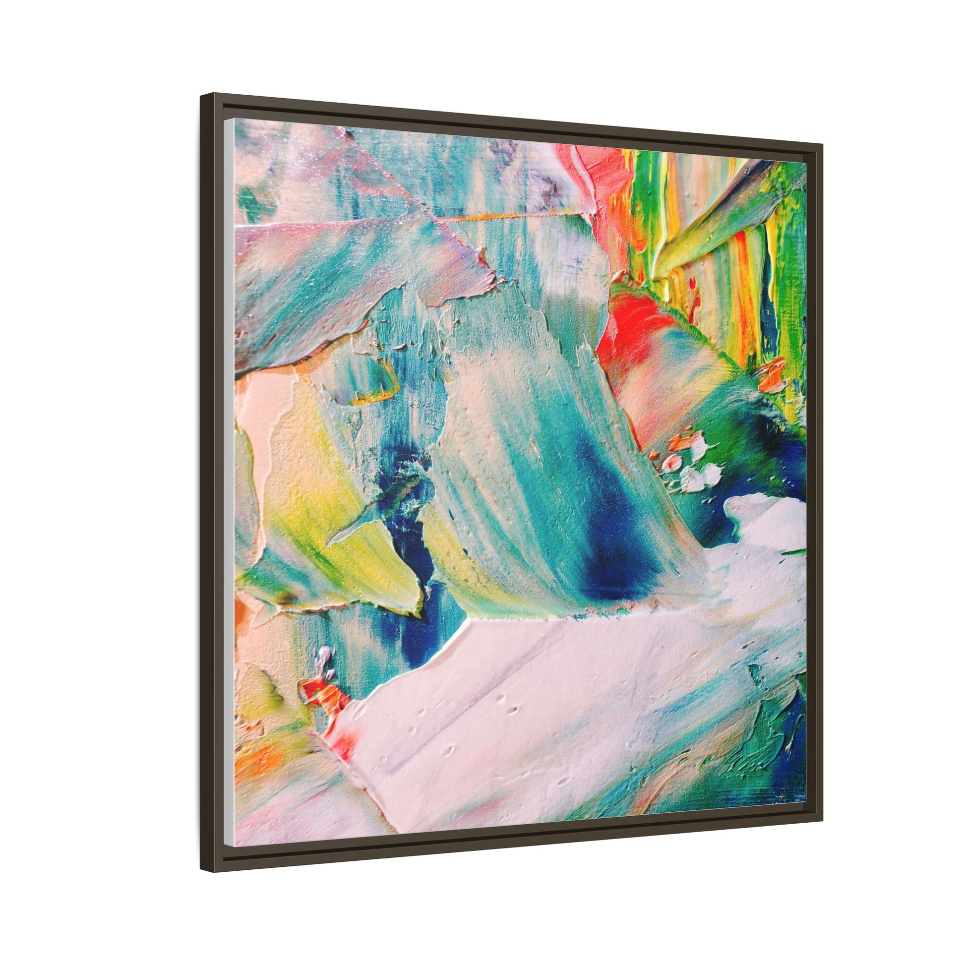 This vibrant abstract painting showcases a dynamic blend of colors and textures, creating a mesmerizing visual experience. The artwork features sweeping brushstrokes in a rich palette of blues, greens, reds, yellows, and soft pastels, with each color bleeding and blending into the next. Thick, layered paint creates a sense of depth and movement, with textured ridges and valleys that catch the light and add dimensionality to the piece. The composition appears fluid and organic, suggesting a sense of motion or a landscape viewed through a kaleidoscopic lens. The painting's impasto technique and bold color choices evoke an emotional, almost visceral response, inviting viewers to explore the intricate details and sweeping gestures of the artwork.