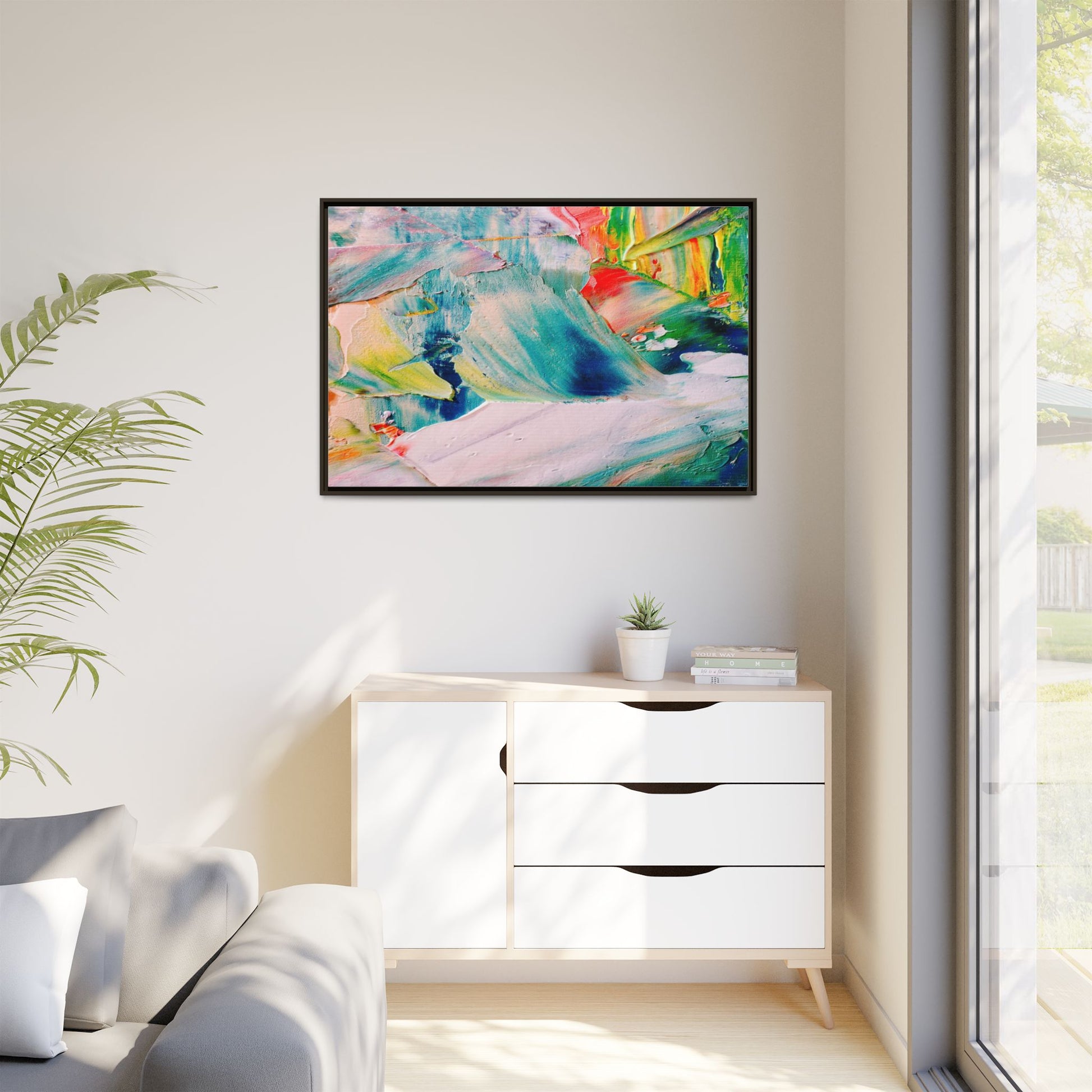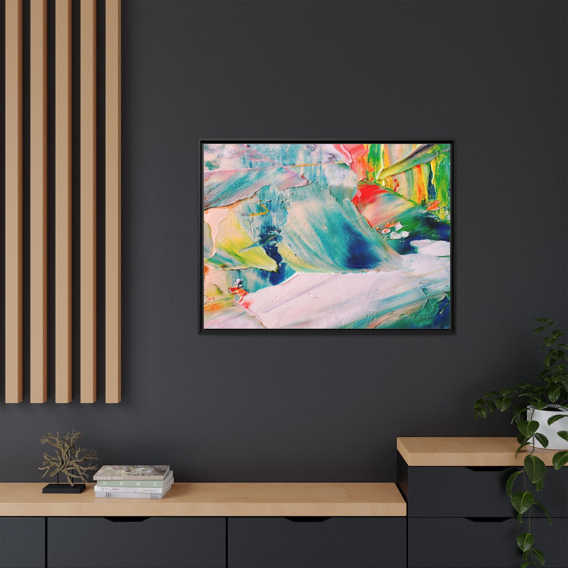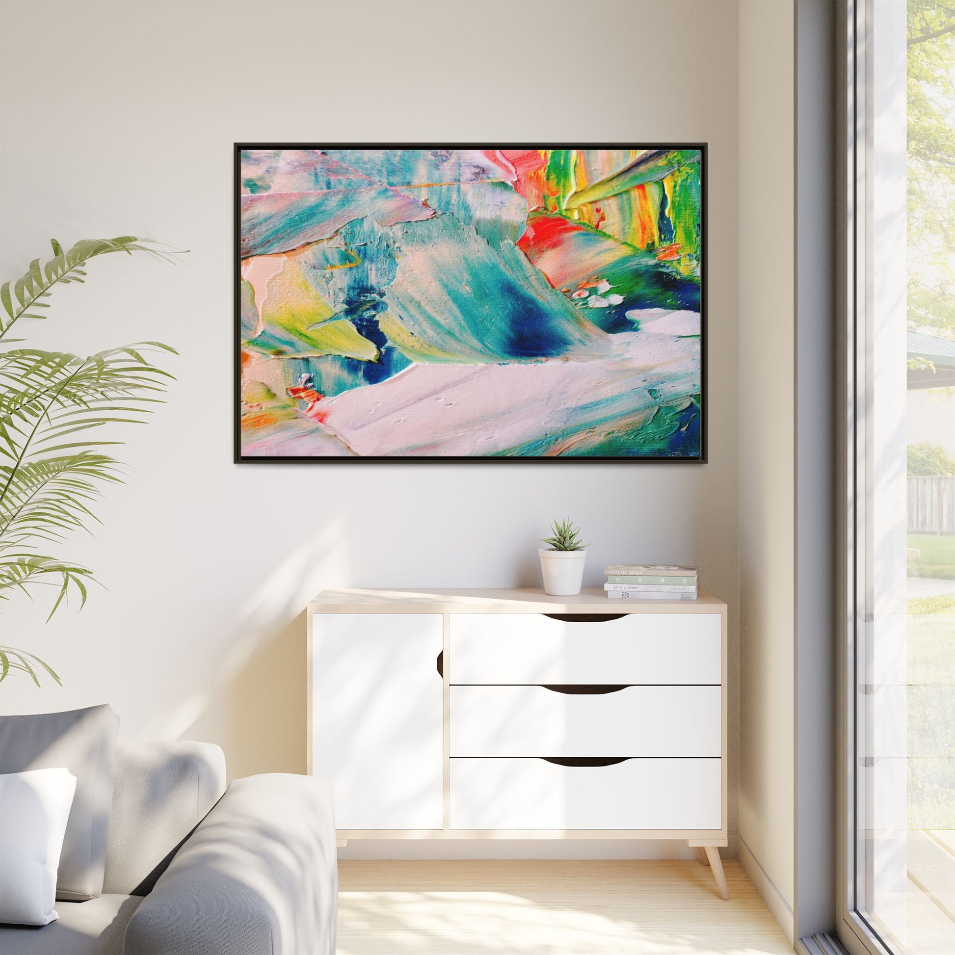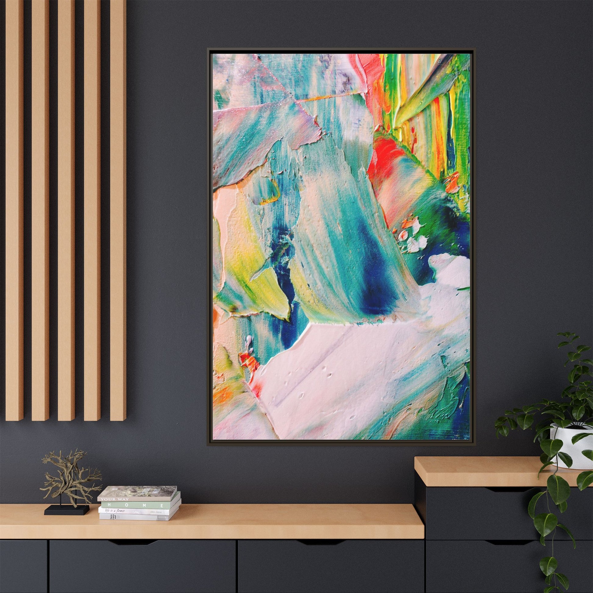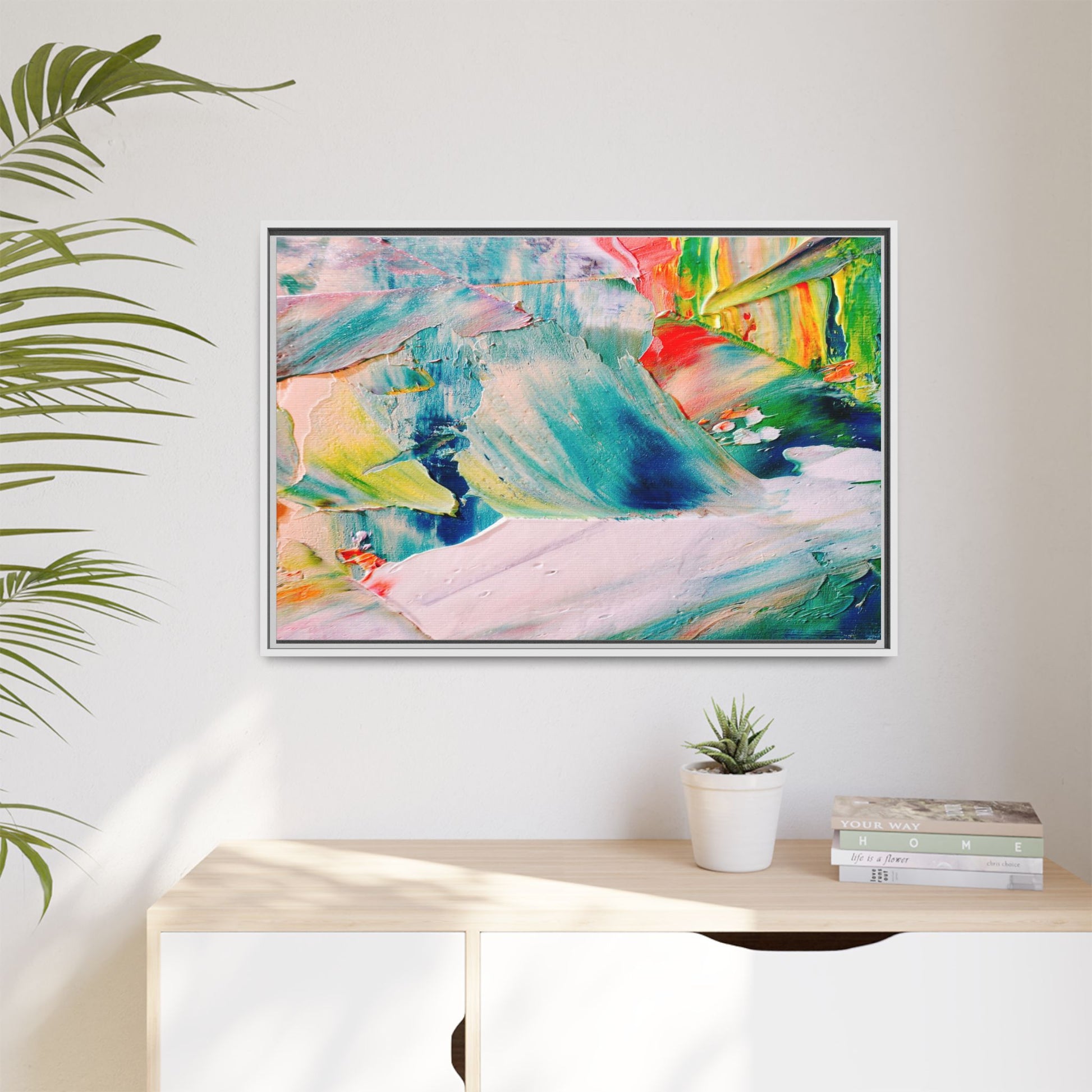 This vibrant abstract painting showcases a dynamic blend of colors and textures, creating a mesmerizing visual experience. The artwork features sweeping brushstrokes in a rich palette of blues, greens, reds, yellows, and soft pastels, with each color bleeding and blending into the next. Thick, layered paint creates a sense of depth and movement, with textured ridges and valleys that catch the light and add dimensionality to the piece. The composition appears fluid and organic, suggesting a sense of motion or a landscape viewed through a kaleidoscopic lens. The painting's impasto technique and bold color choices evoke an emotional, almost visceral response, inviting viewers to explore the intricate details and sweeping gestures of the artwork.