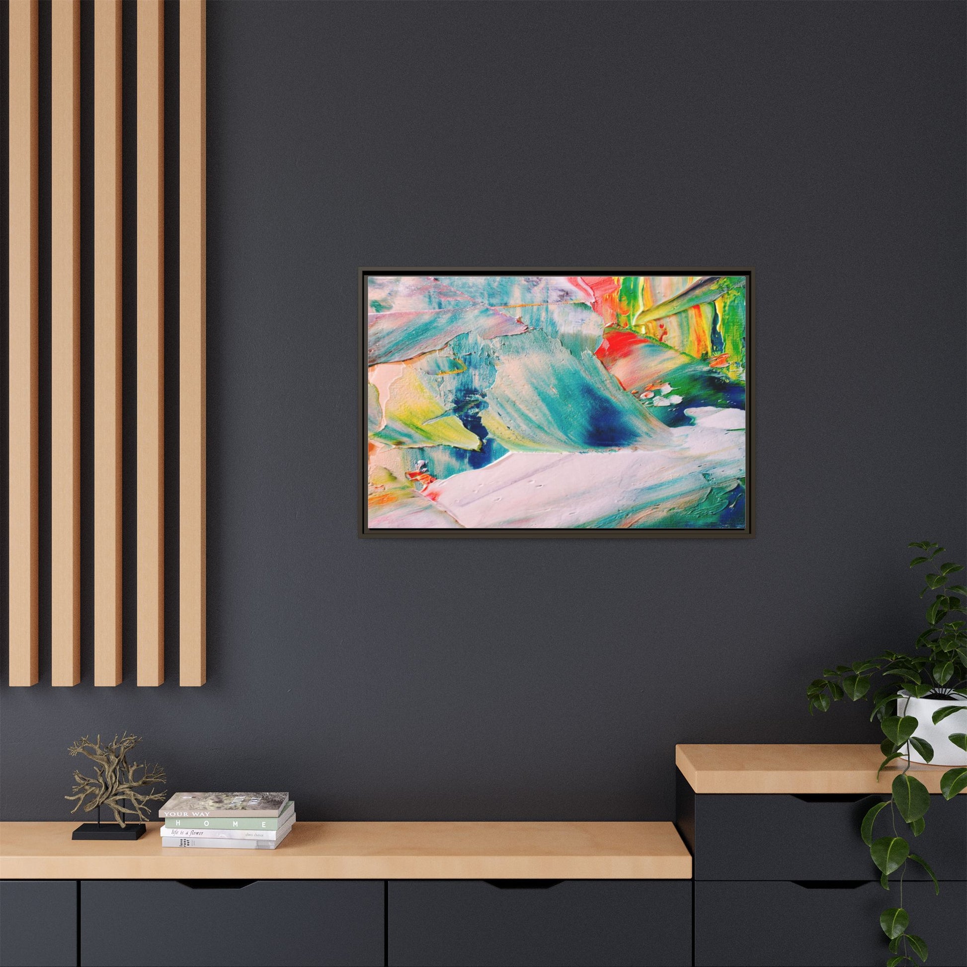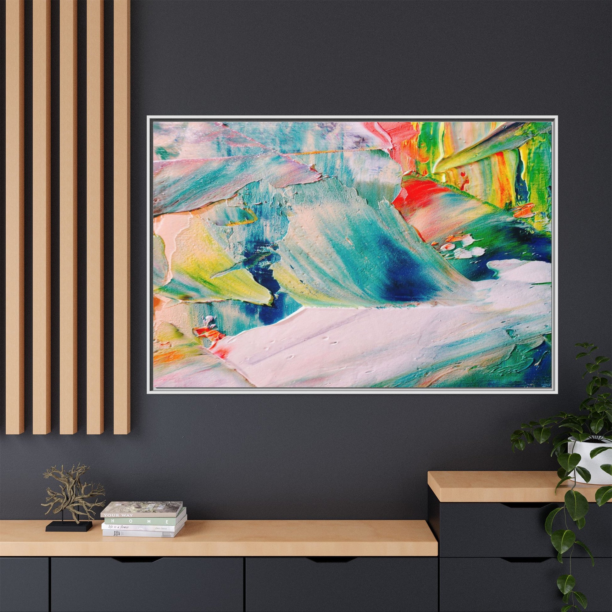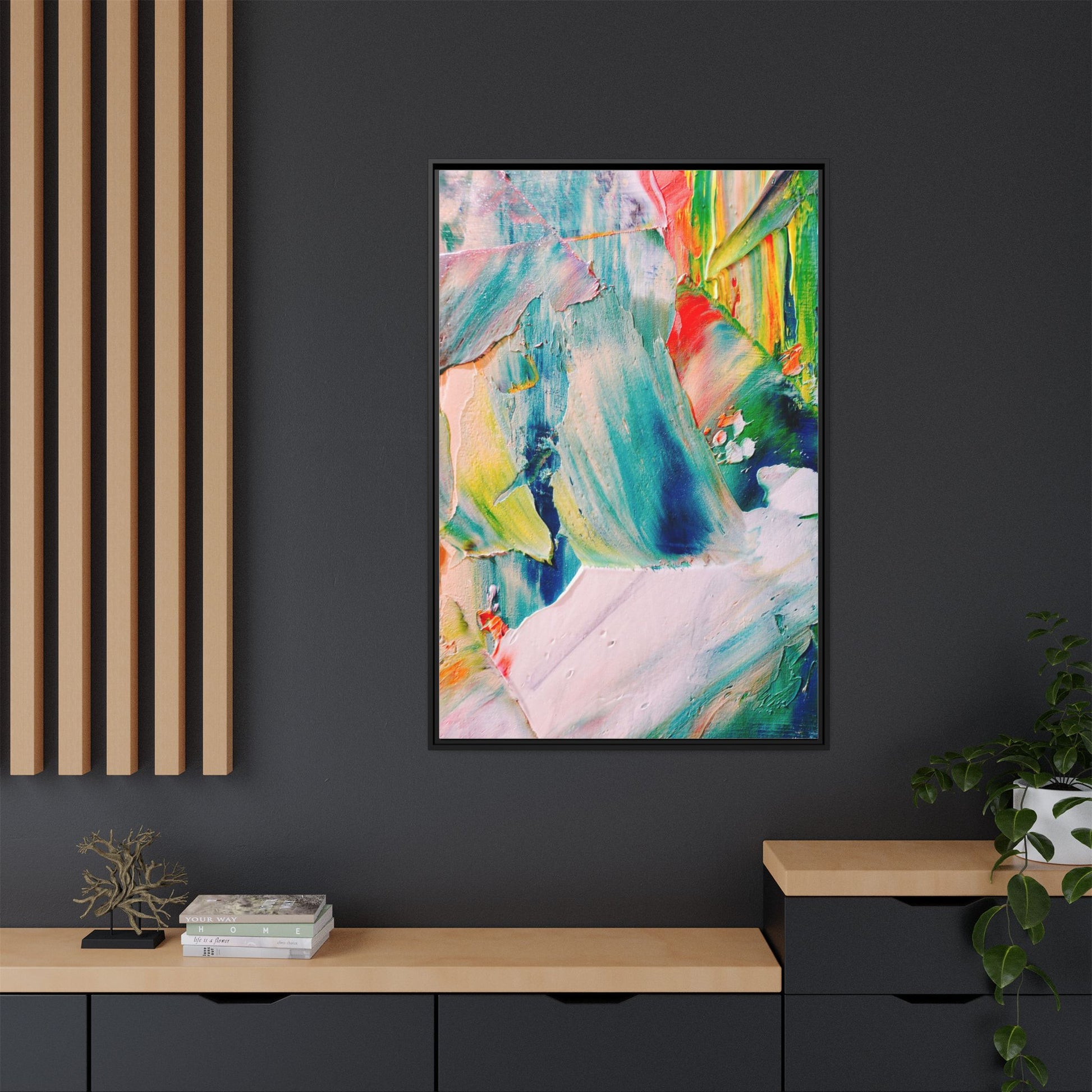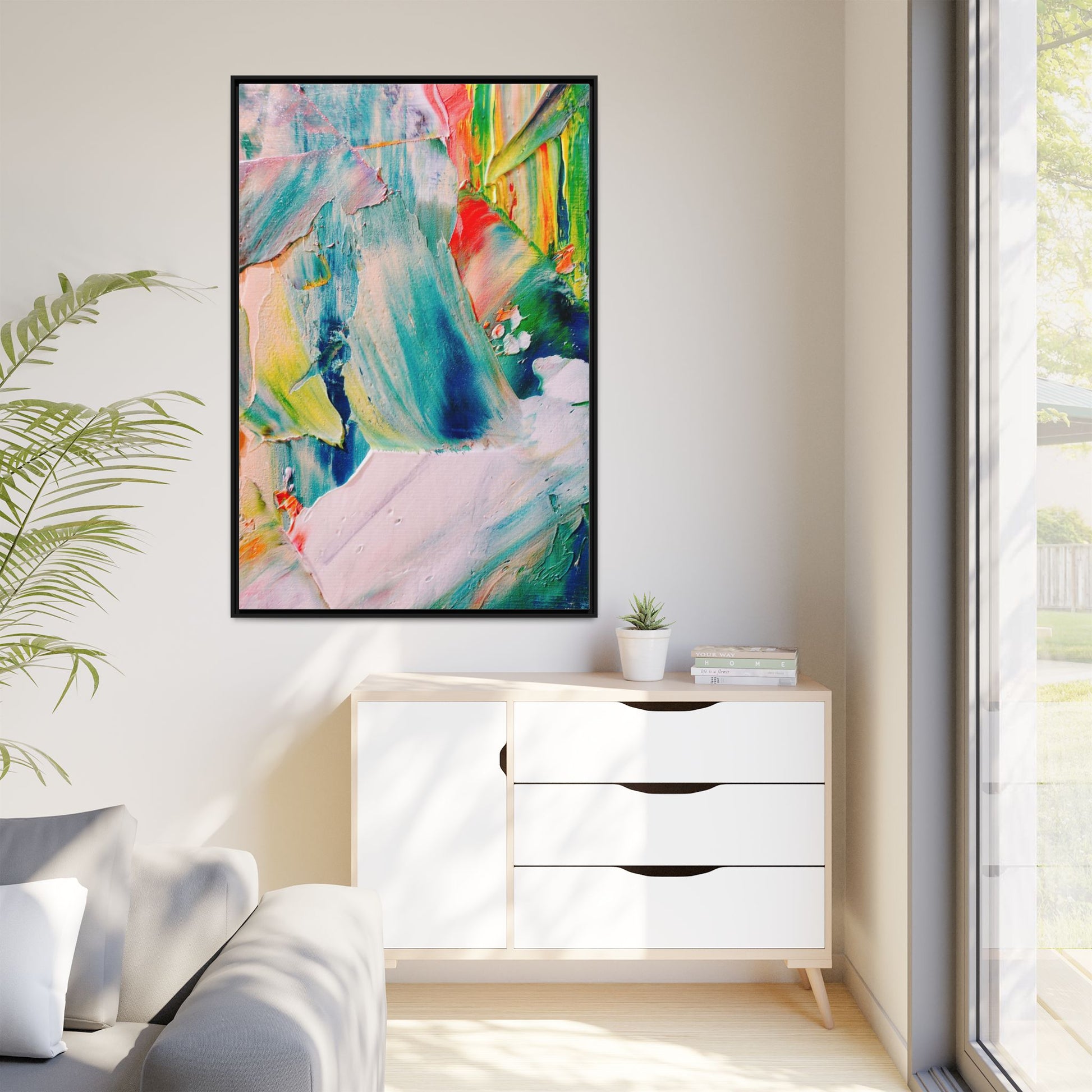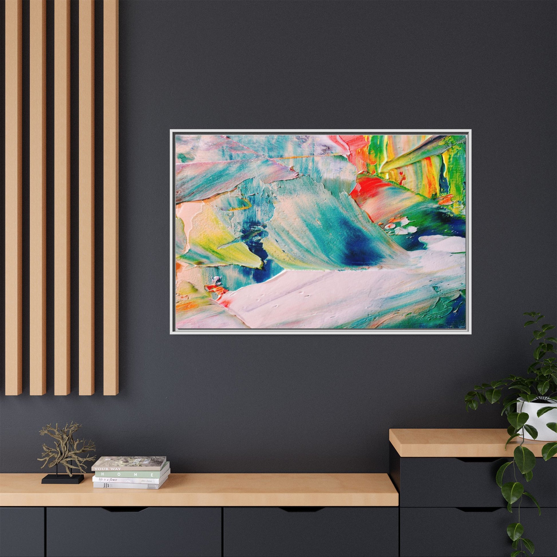 This vibrant abstract painting showcases a dynamic blend of colors and textures, creating a mesmerizing visual experience. The artwork features sweeping brushstrokes in a rich palette of blues, greens, reds, yellows, and soft pastels, with each color bleeding and blending into the next. Thick, layered paint creates a sense of depth and movement, with textured ridges and valleys that catch the light and add dimensionality to the piece. The composition appears fluid and organic, suggesting a sense of motion or a landscape viewed through a kaleidoscopic lens. The painting's impasto technique and bold color choices evoke an emotional, almost visceral response, inviting viewers to explore the intricate details and sweeping gestures of the artwork.