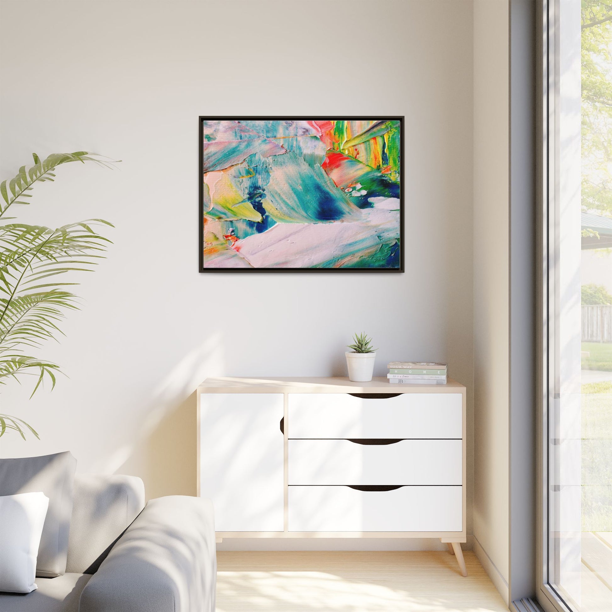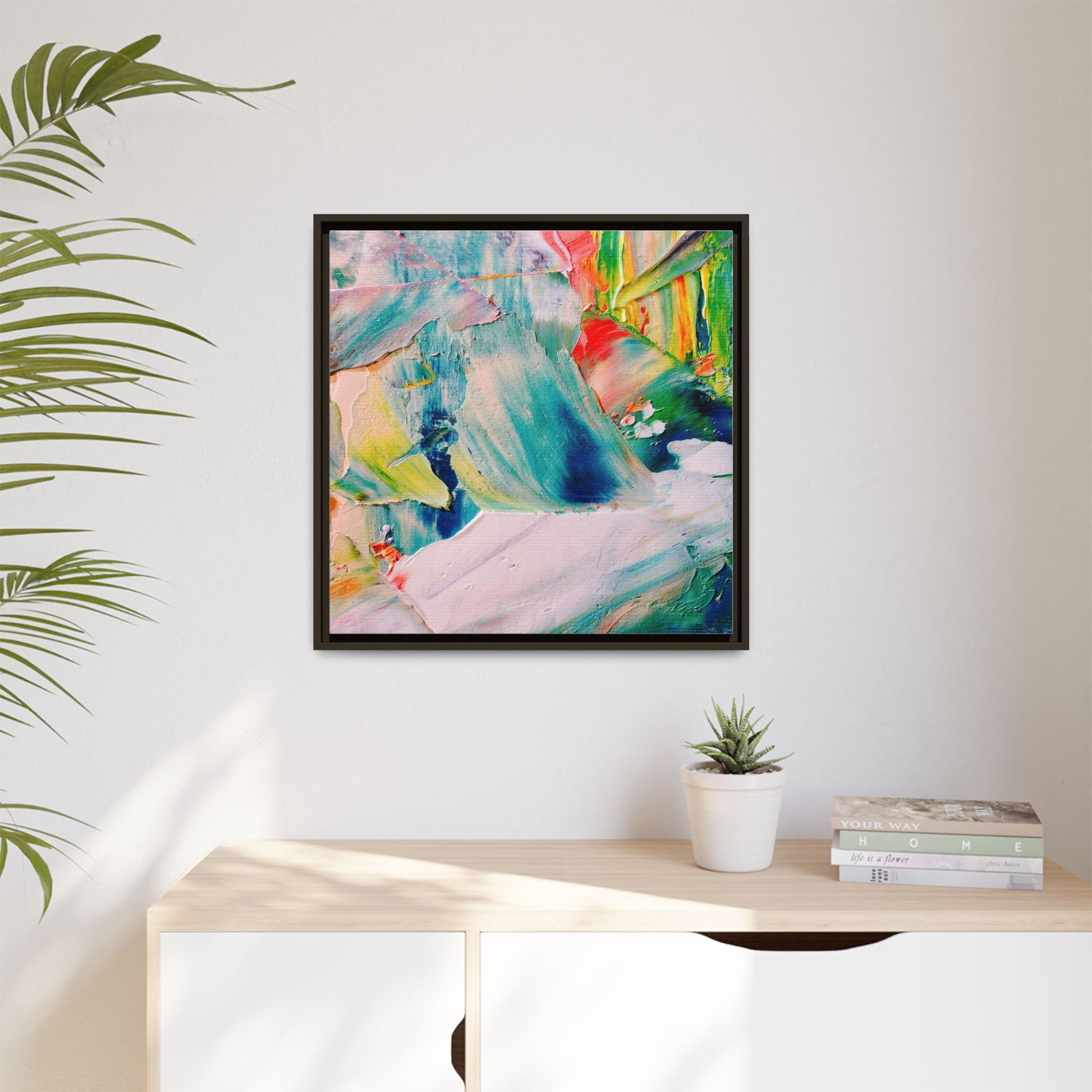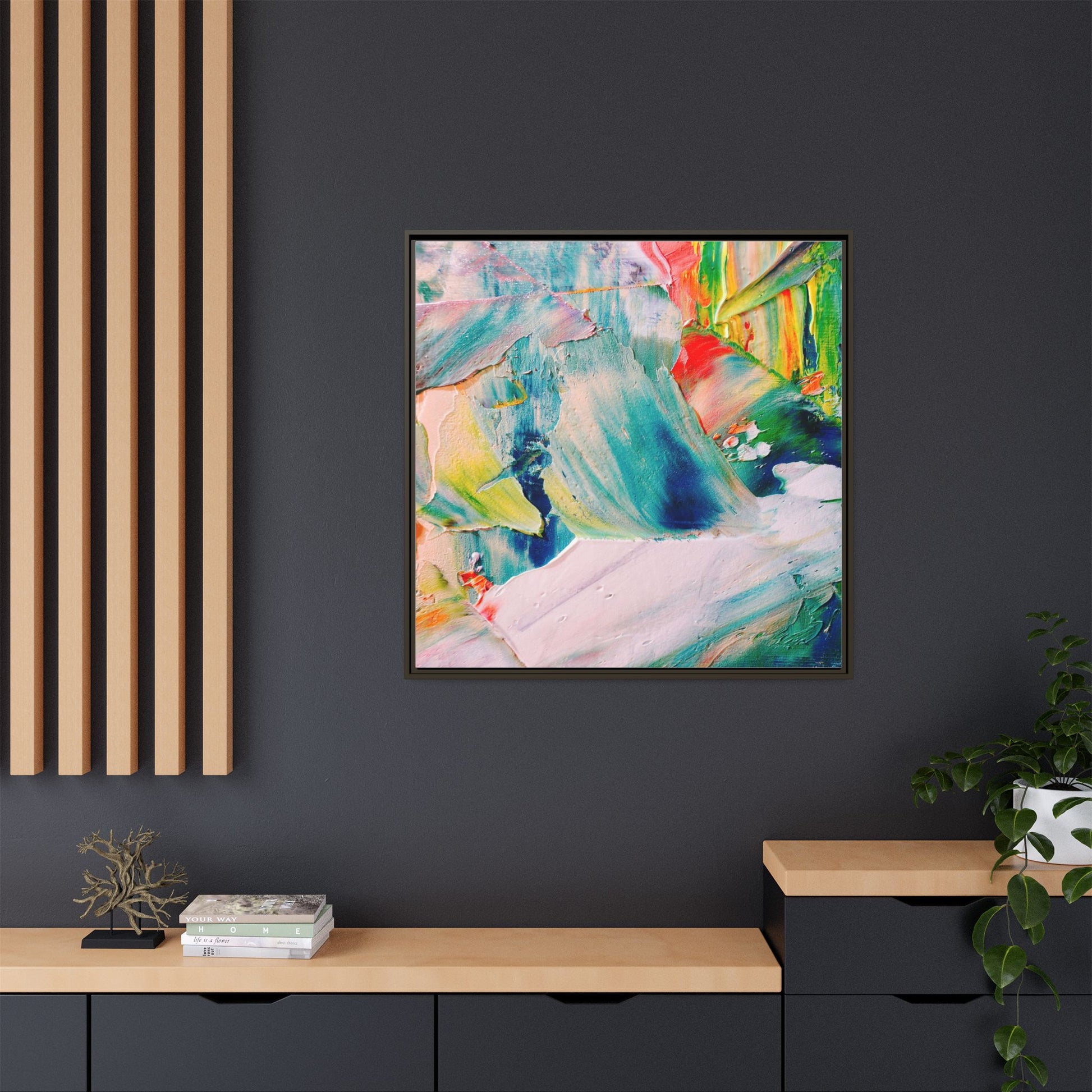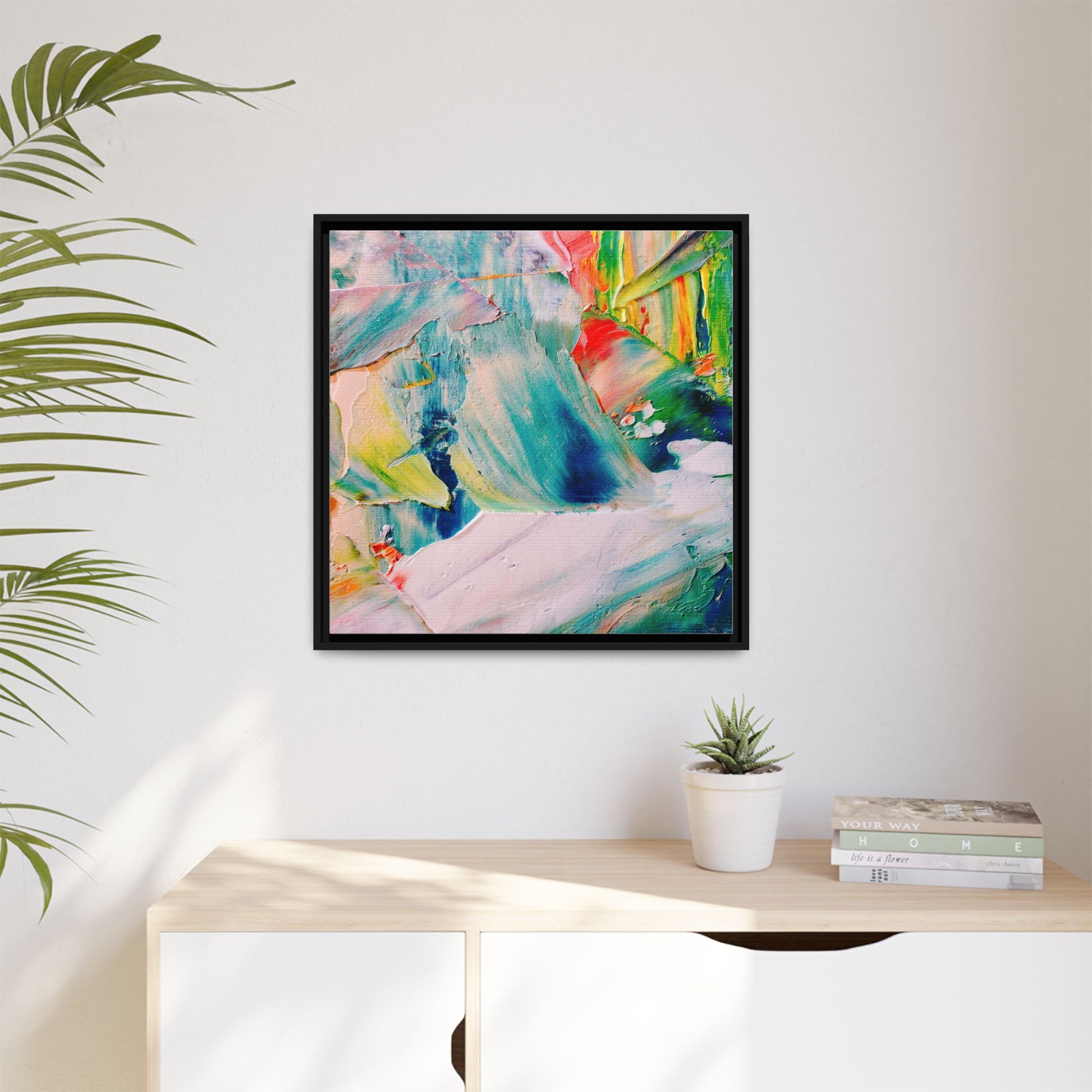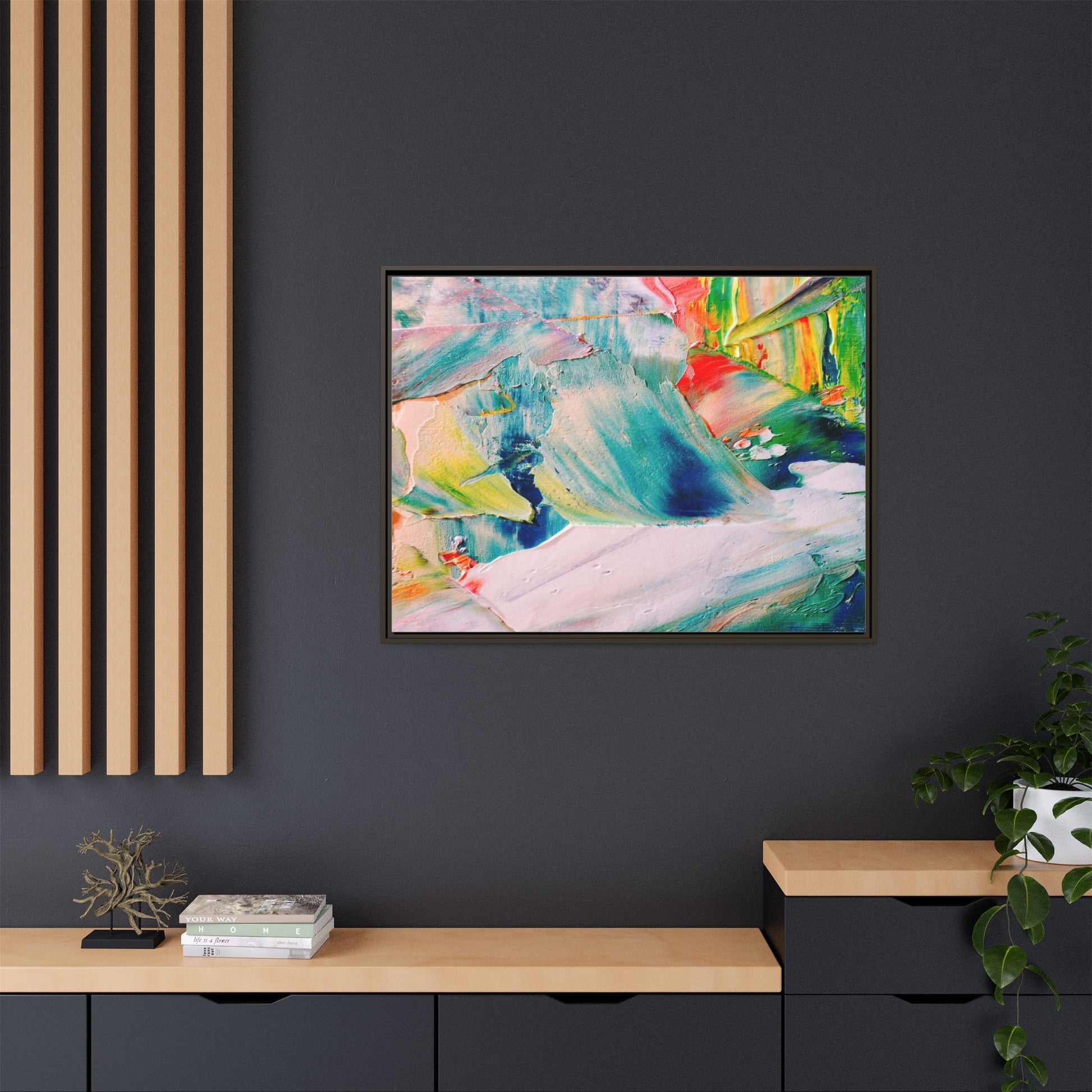 This vibrant abstract painting showcases a dynamic blend of colors and textures, creating a mesmerizing visual experience. The artwork features sweeping brushstrokes in a rich palette of blues, greens, reds, yellows, and soft pastels, with each color bleeding and blending into the next. Thick, layered paint creates a sense of depth and movement, with textured ridges and valleys that catch the light and add dimensionality to the piece. The composition appears fluid and organic, suggesting a sense of motion or a landscape viewed through a kaleidoscopic lens. The painting's impasto technique and bold color choices evoke an emotional, almost visceral response, inviting viewers to explore the intricate details and sweeping gestures of the artwork.