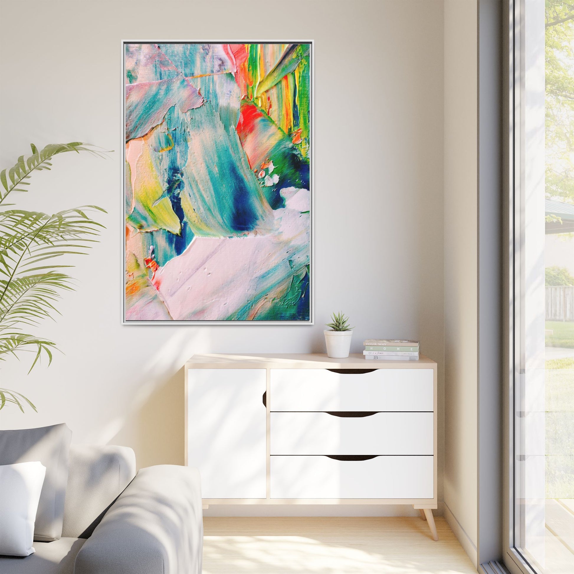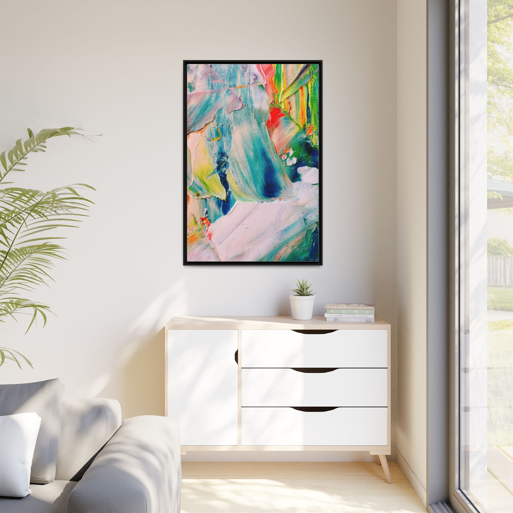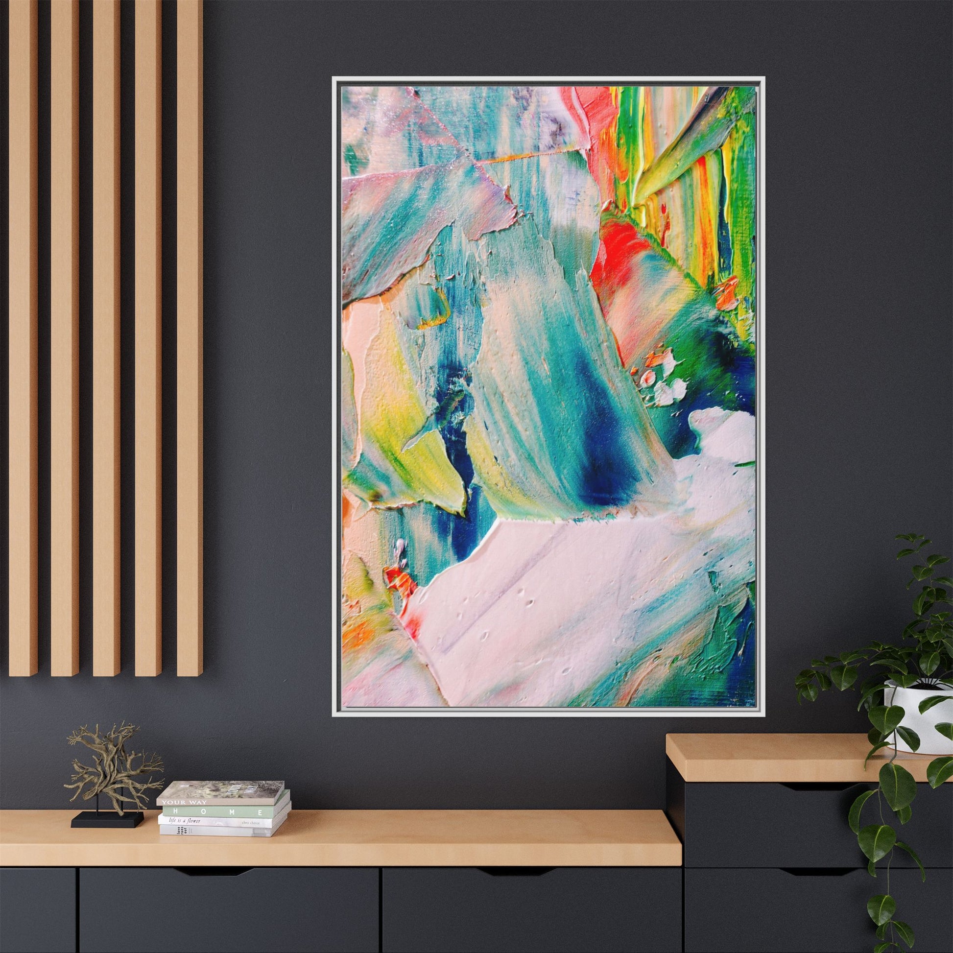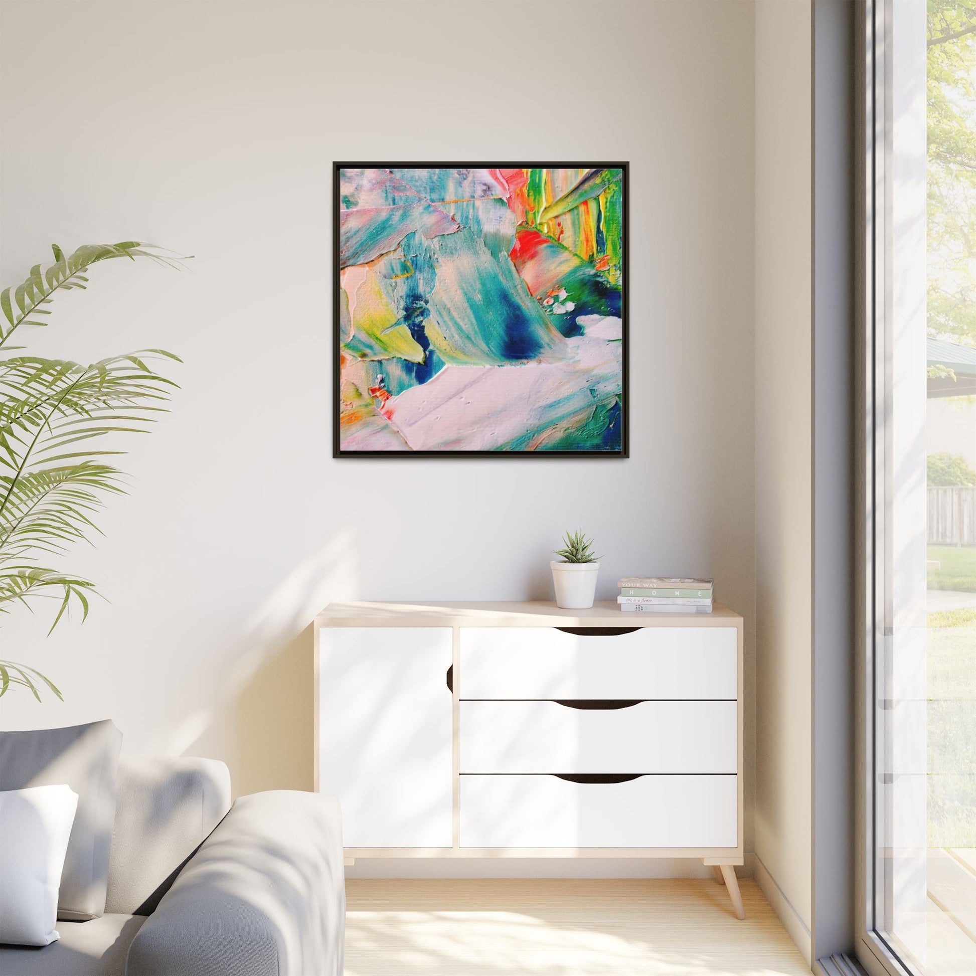 This vibrant abstract painting showcases a dynamic blend of colors and textures, creating a mesmerizing visual experience. The artwork features sweeping brushstrokes in a rich palette of blues, greens, reds, yellows, and soft pastels, with each color bleeding and blending into the next. Thick, layered paint creates a sense of depth and movement, with textured ridges and valleys that catch the light and add dimensionality to the piece. The composition appears fluid and organic, suggesting a sense of motion or a landscape viewed through a kaleidoscopic lens. The painting's impasto technique and bold color choices evoke an emotional, almost visceral response, inviting viewers to explore the intricate details and sweeping gestures of the artwork.
