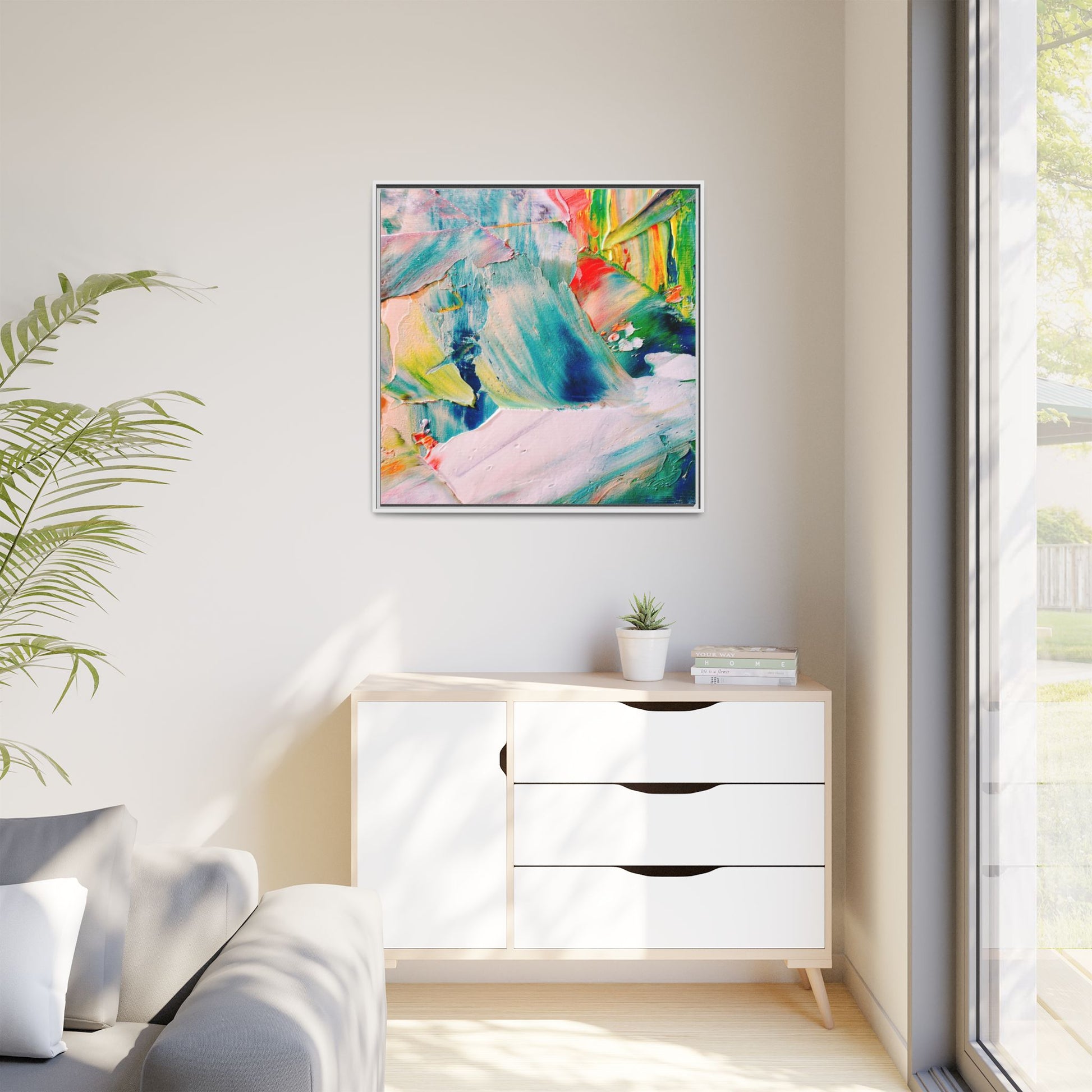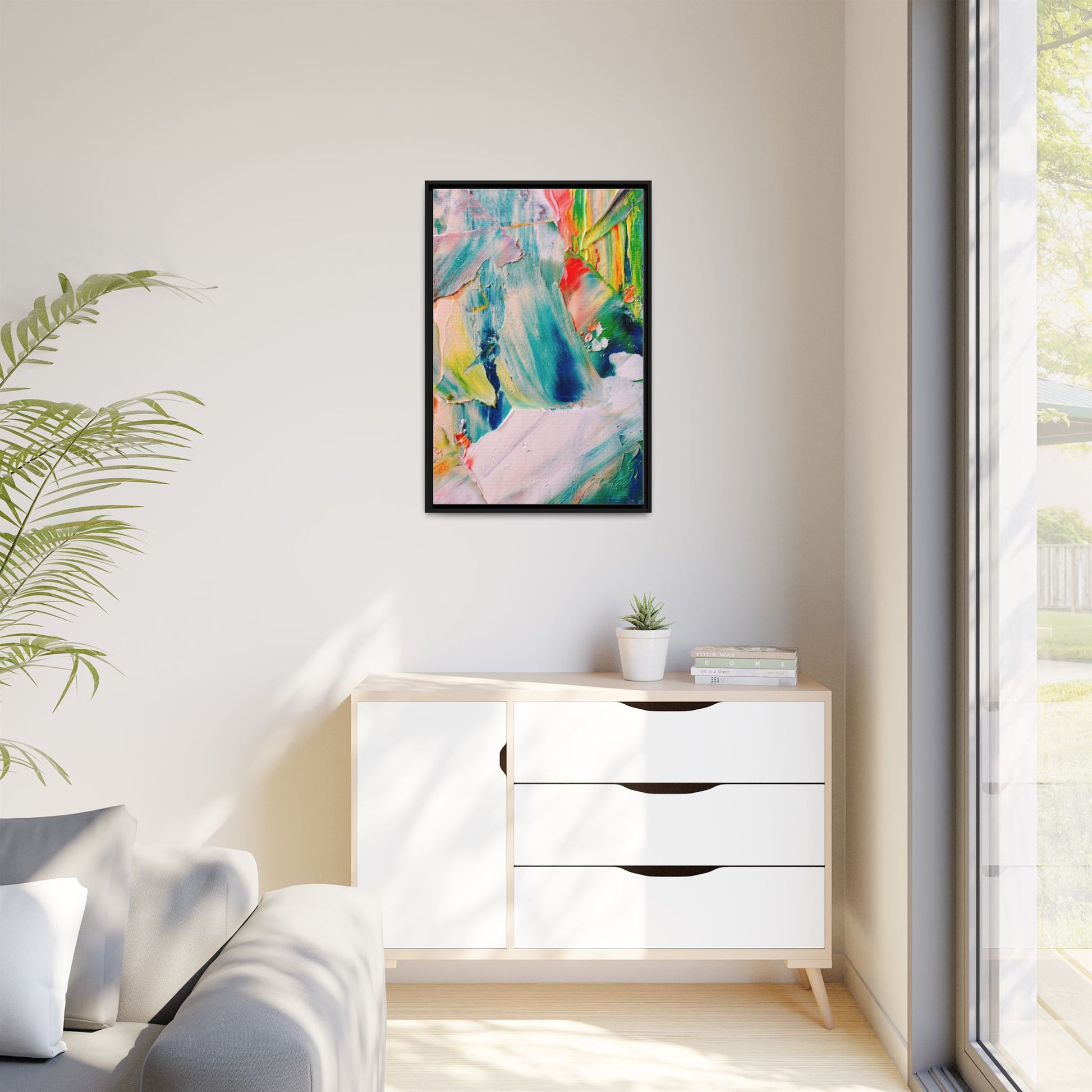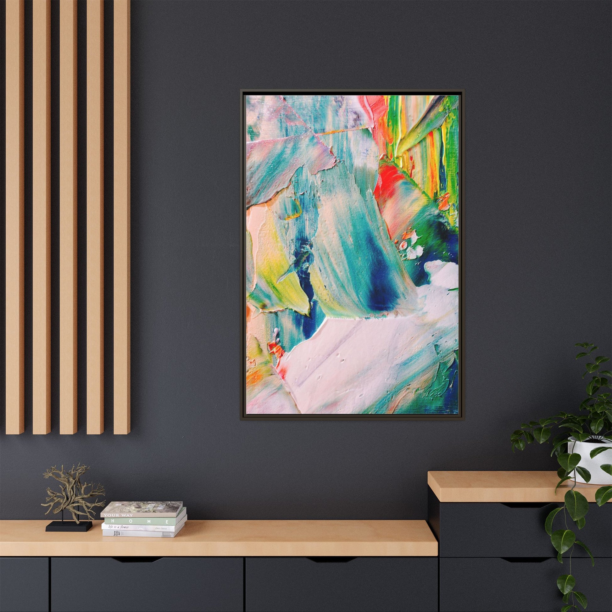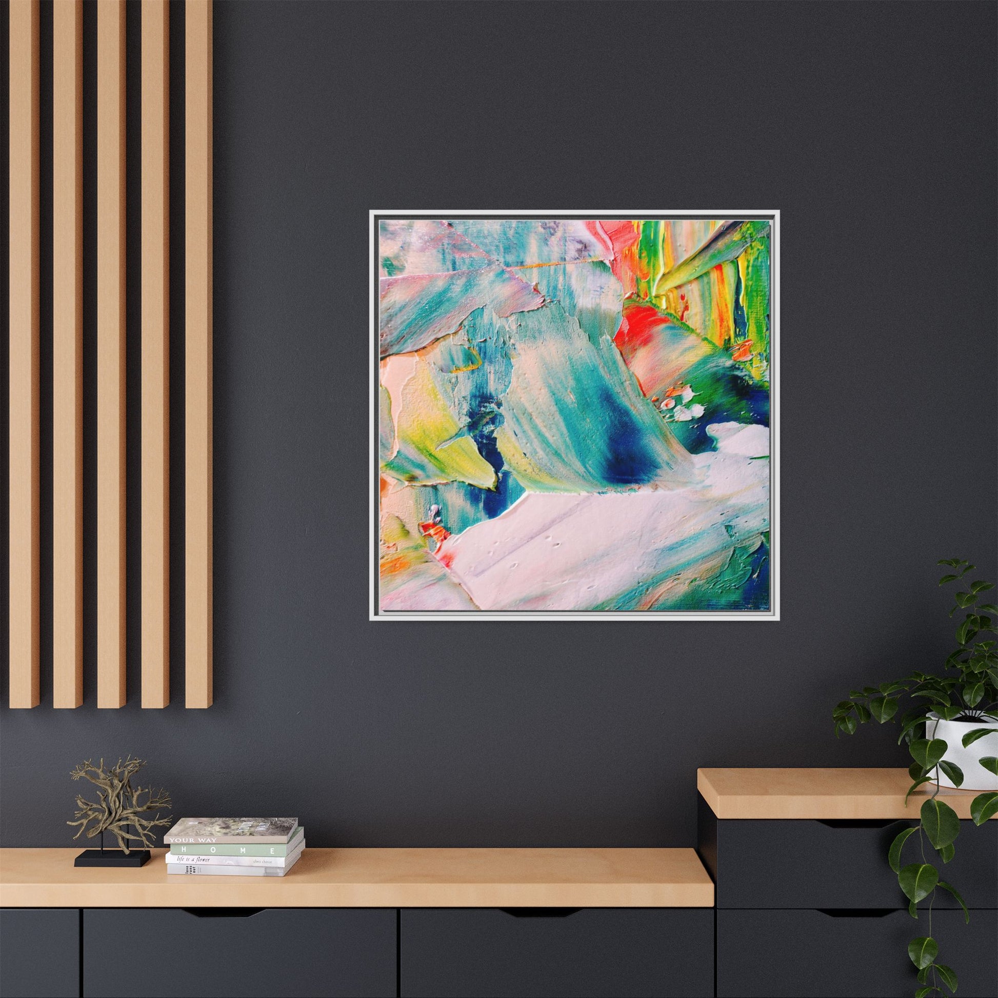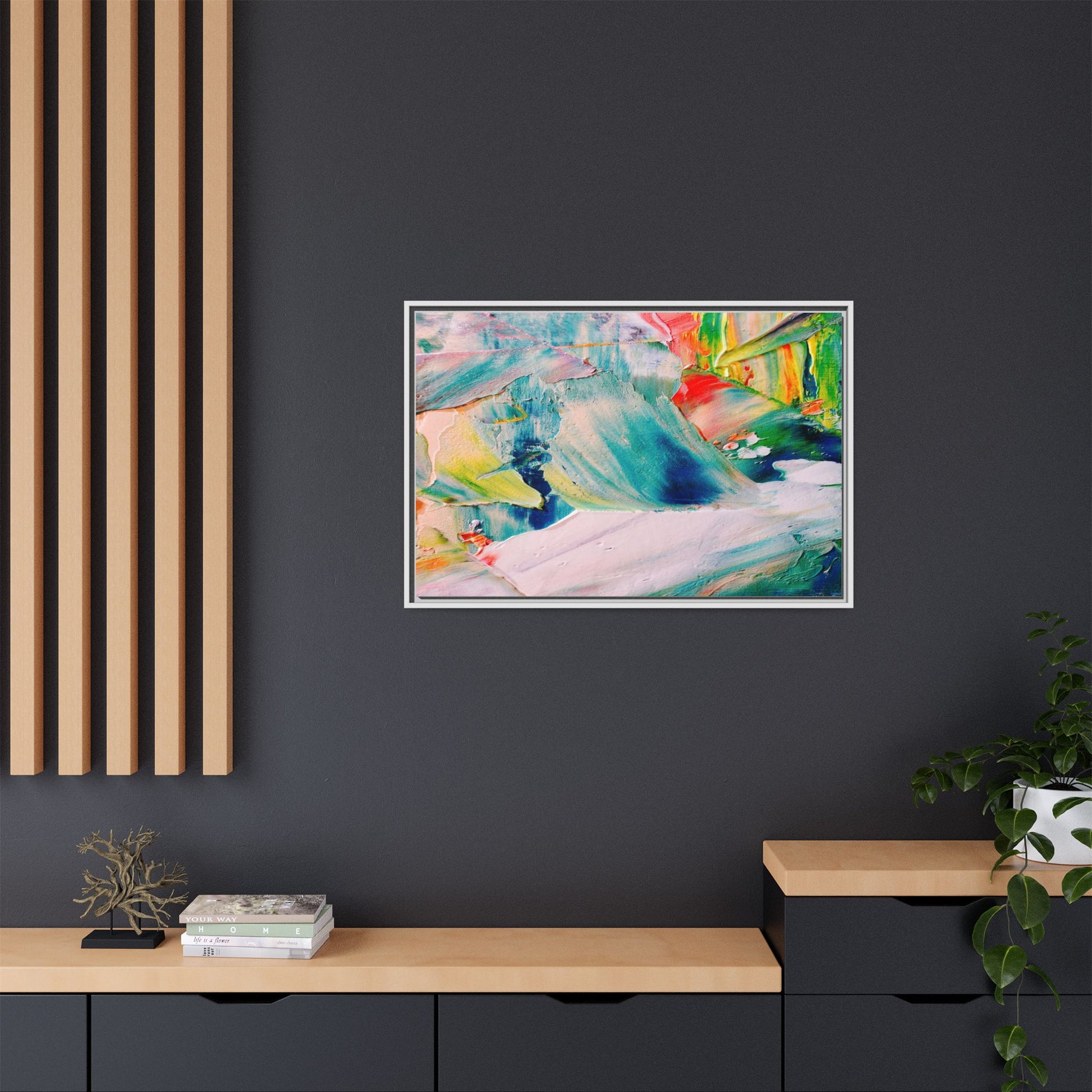 This vibrant abstract painting showcases a dynamic blend of colors and textures, creating a mesmerizing visual experience. The artwork features sweeping brushstrokes in a rich palette of blues, greens, reds, yellows, and soft pastels, with each color bleeding and blending into the next. Thick, layered paint creates a sense of depth and movement, with textured ridges and valleys that catch the light and add dimensionality to the piece. The composition appears fluid and organic, suggesting a sense of motion or a landscape viewed through a kaleidoscopic lens. The painting's impasto technique and bold color choices evoke an emotional, almost visceral response, inviting viewers to explore the intricate details and sweeping gestures of the artwork.
