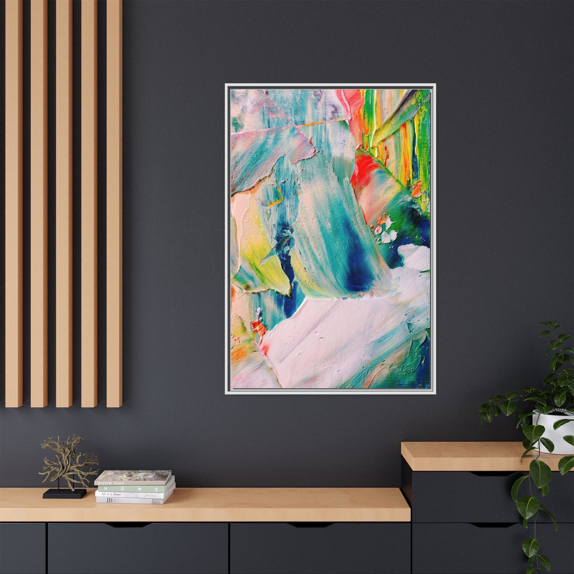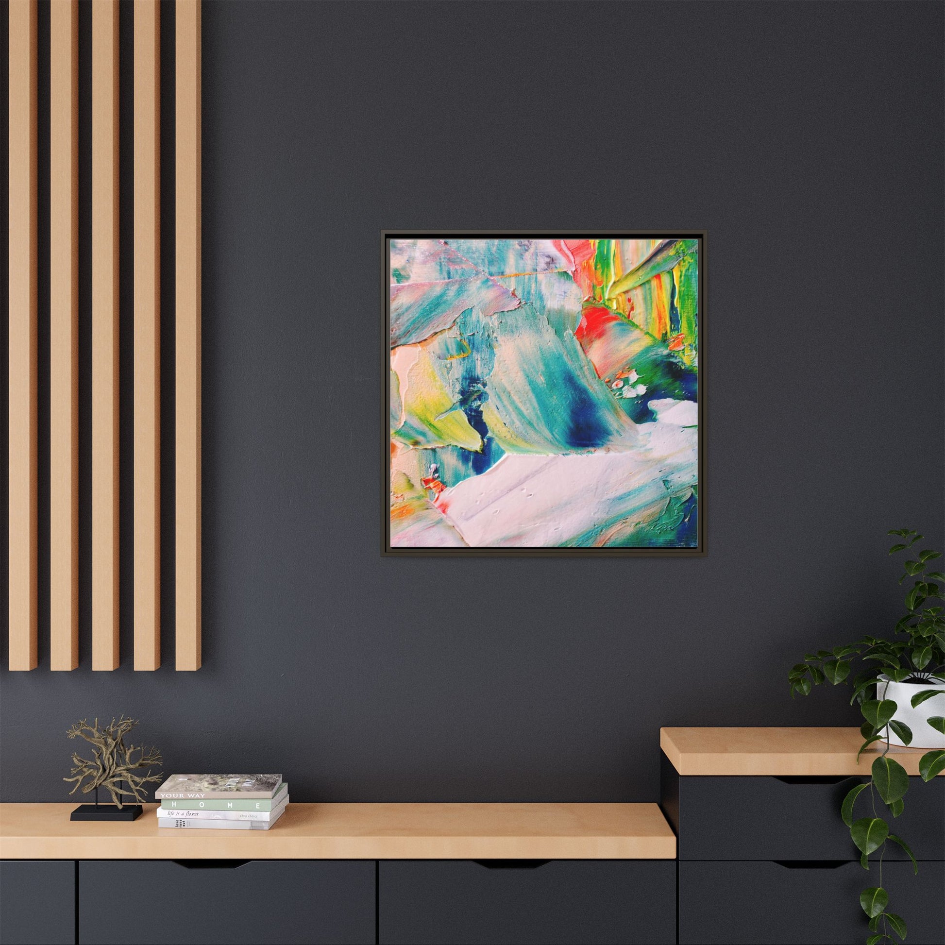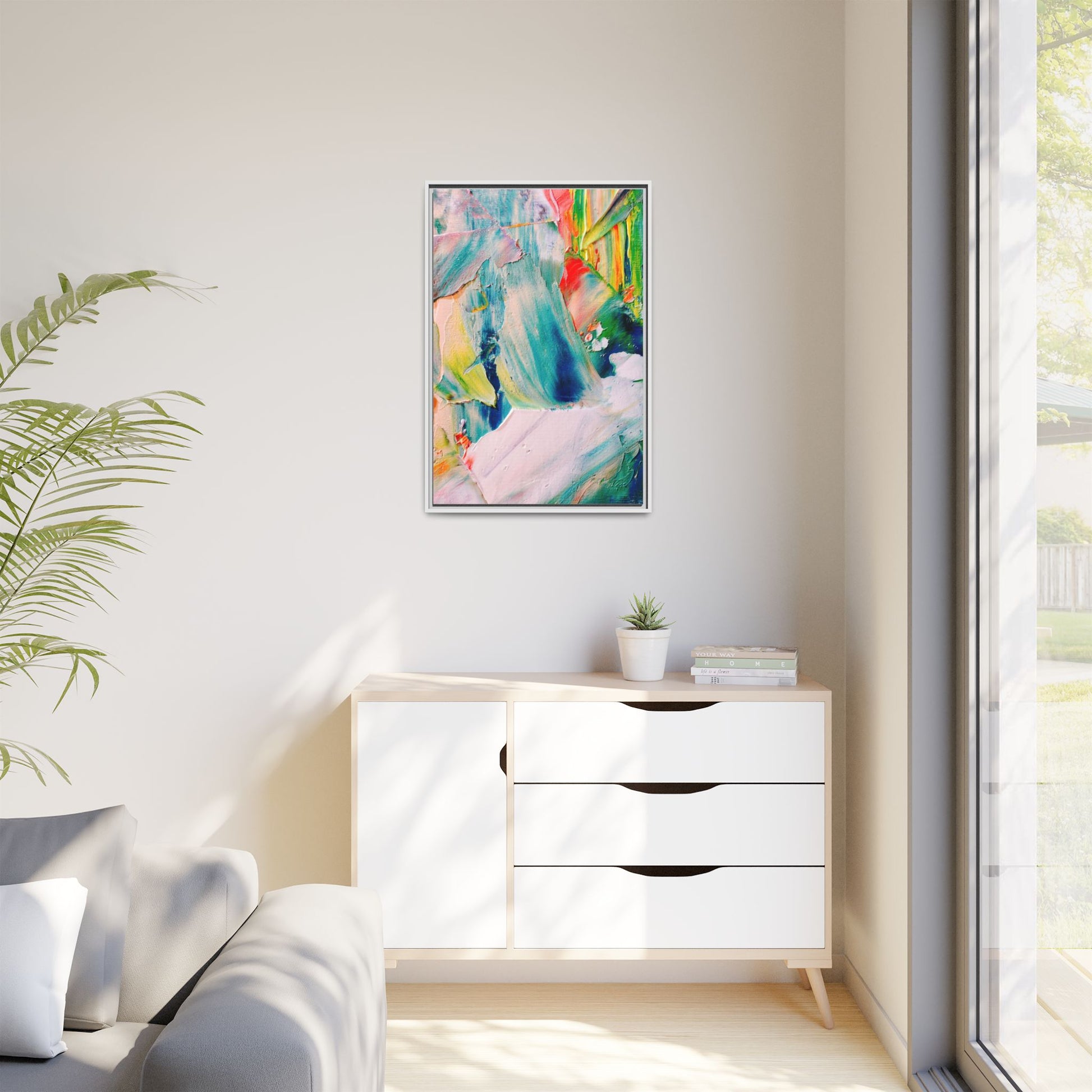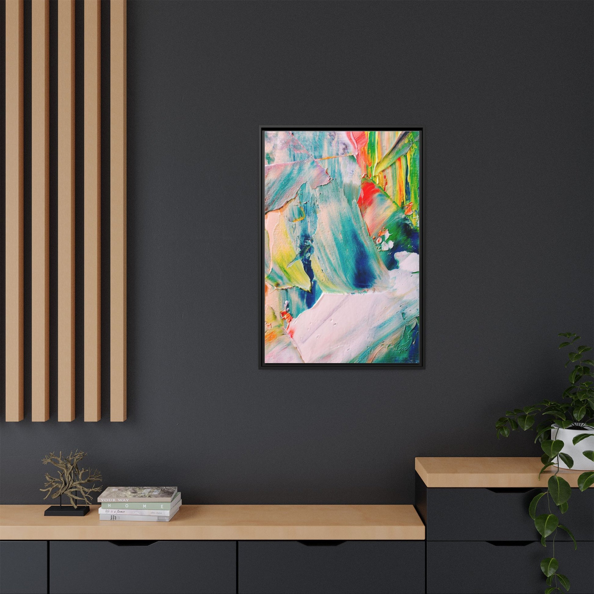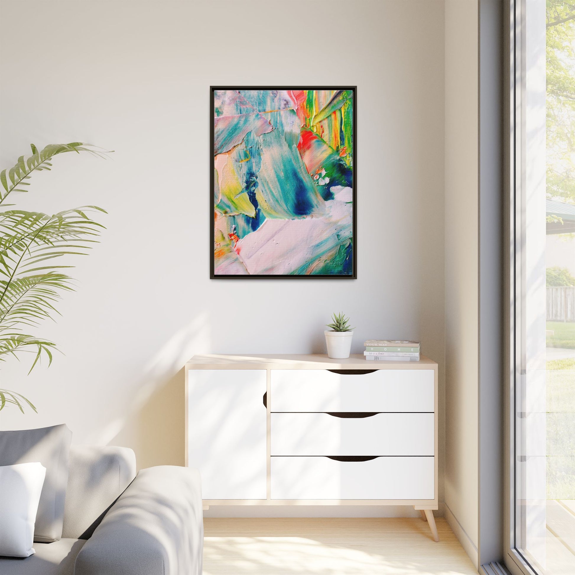 This vibrant abstract painting showcases a dynamic blend of colors and textures, creating a mesmerizing visual experience. The artwork features sweeping brushstrokes in a rich palette of blues, greens, reds, yellows, and soft pastels, with each color bleeding and blending into the next. Thick, layered paint creates a sense of depth and movement, with textured ridges and valleys that catch the light and add dimensionality to the piece. The composition appears fluid and organic, suggesting a sense of motion or a landscape viewed through a kaleidoscopic lens. The painting's impasto technique and bold color choices evoke an emotional, almost visceral response, inviting viewers to explore the intricate details and sweeping gestures of the artwork.