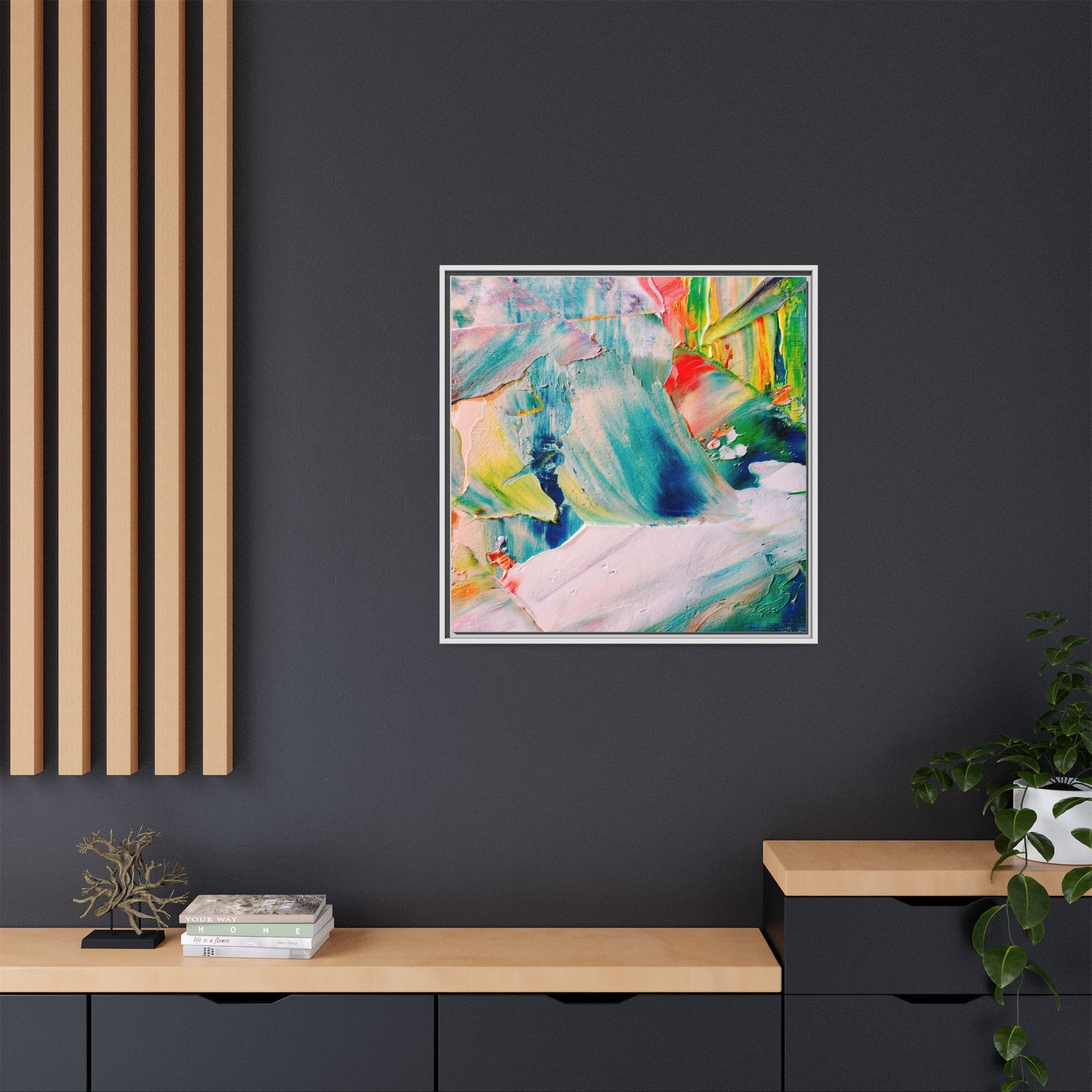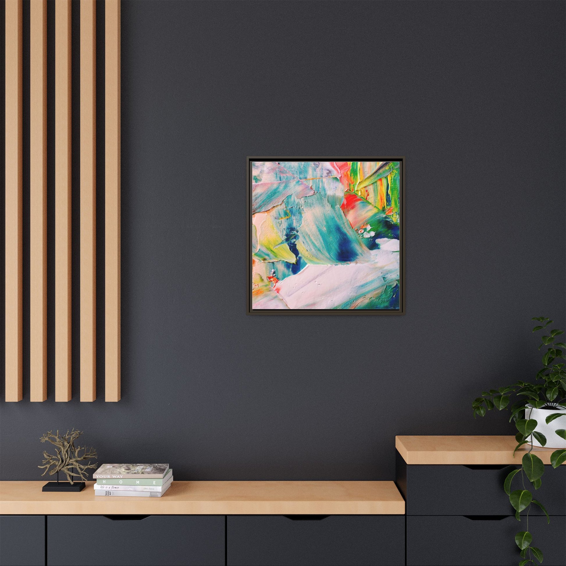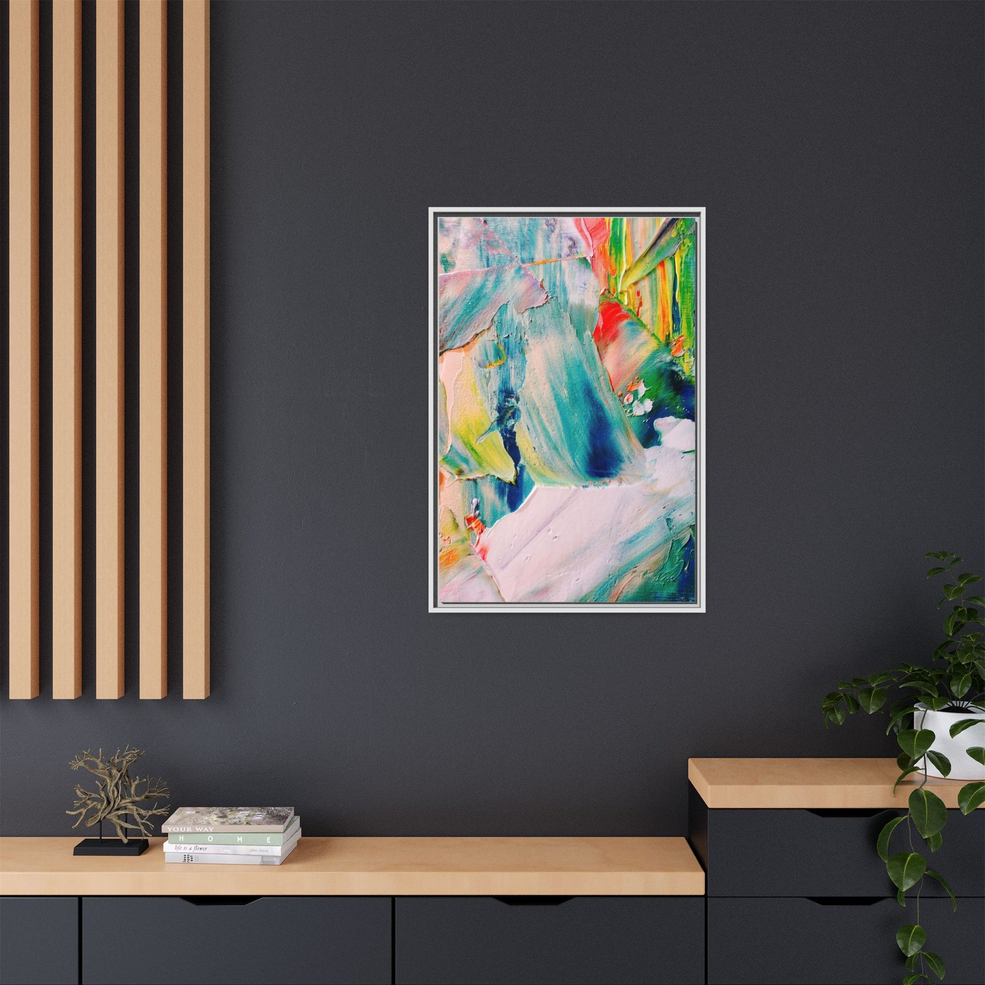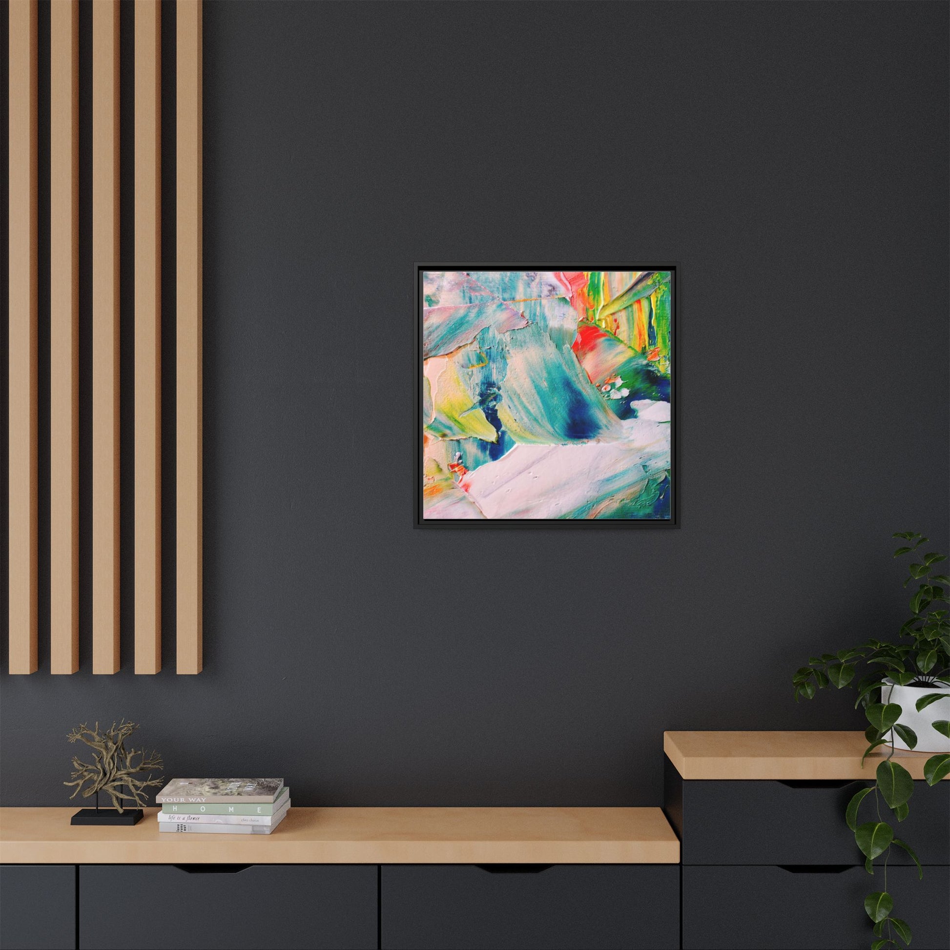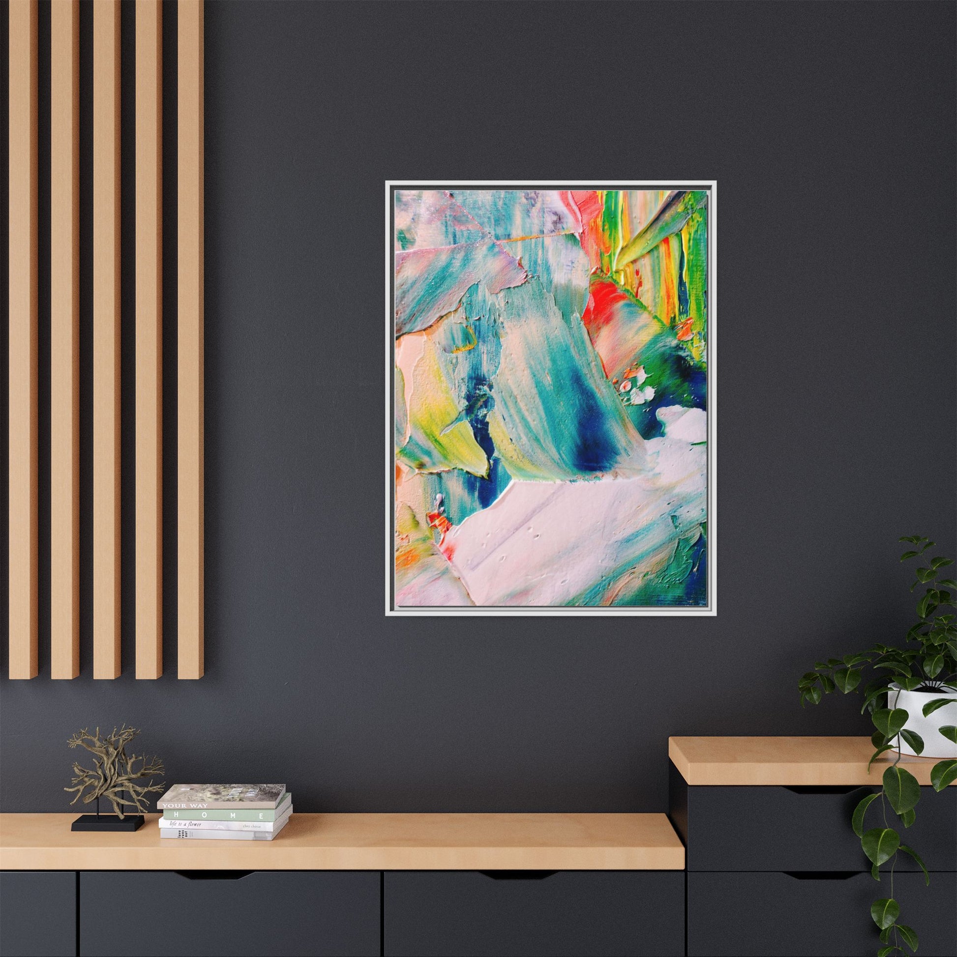 This vibrant abstract painting showcases a dynamic blend of colors and textures, creating a mesmerizing visual experience. The artwork features sweeping brushstrokes in a rich palette of blues, greens, reds, yellows, and soft pastels, with each color bleeding and blending into the next. Thick, layered paint creates a sense of depth and movement, with textured ridges and valleys that catch the light and add dimensionality to the piece. The composition appears fluid and organic, suggesting a sense of motion or a landscape viewed through a kaleidoscopic lens. The painting's impasto technique and bold color choices evoke an emotional, almost visceral response, inviting viewers to explore the intricate details and sweeping gestures of the artwork.