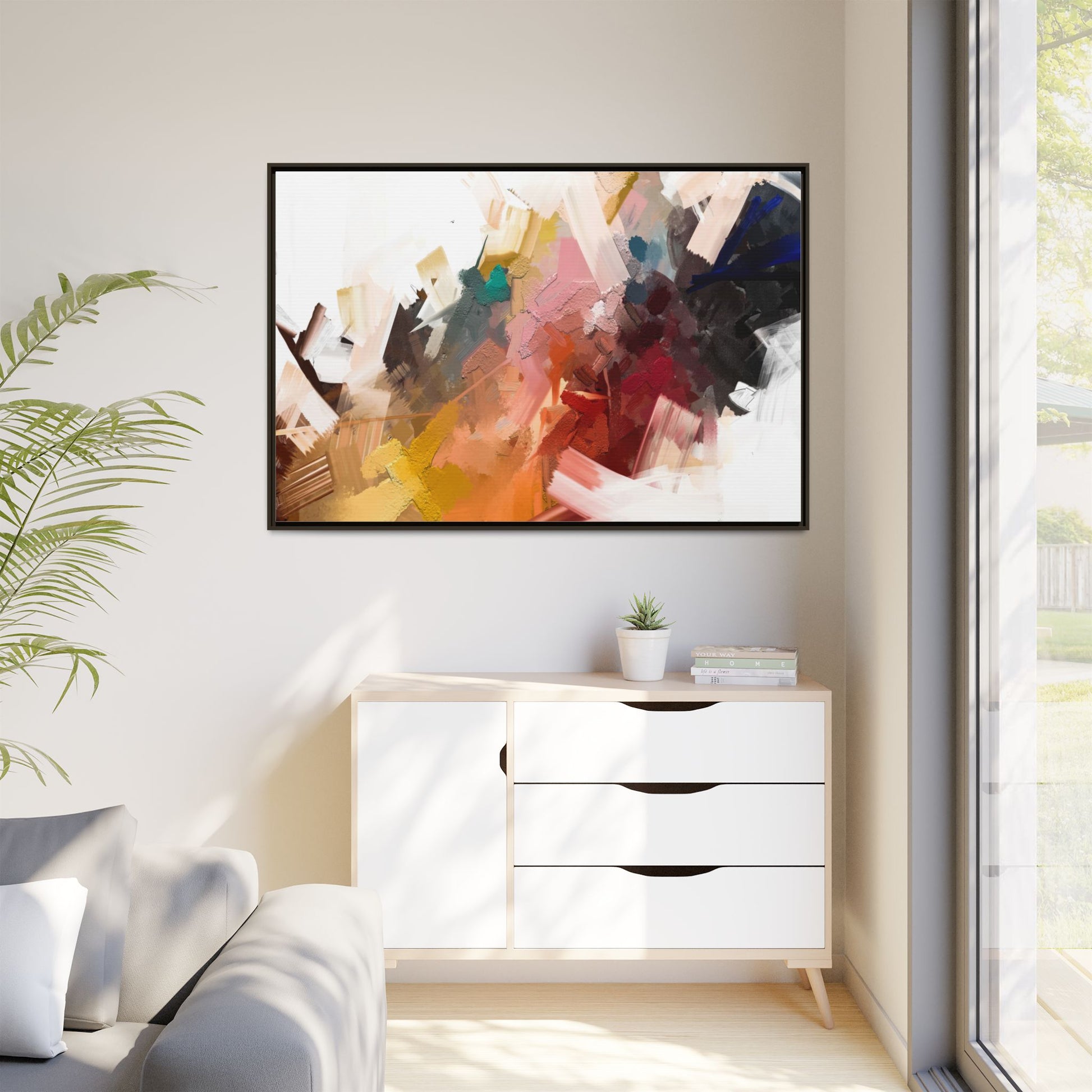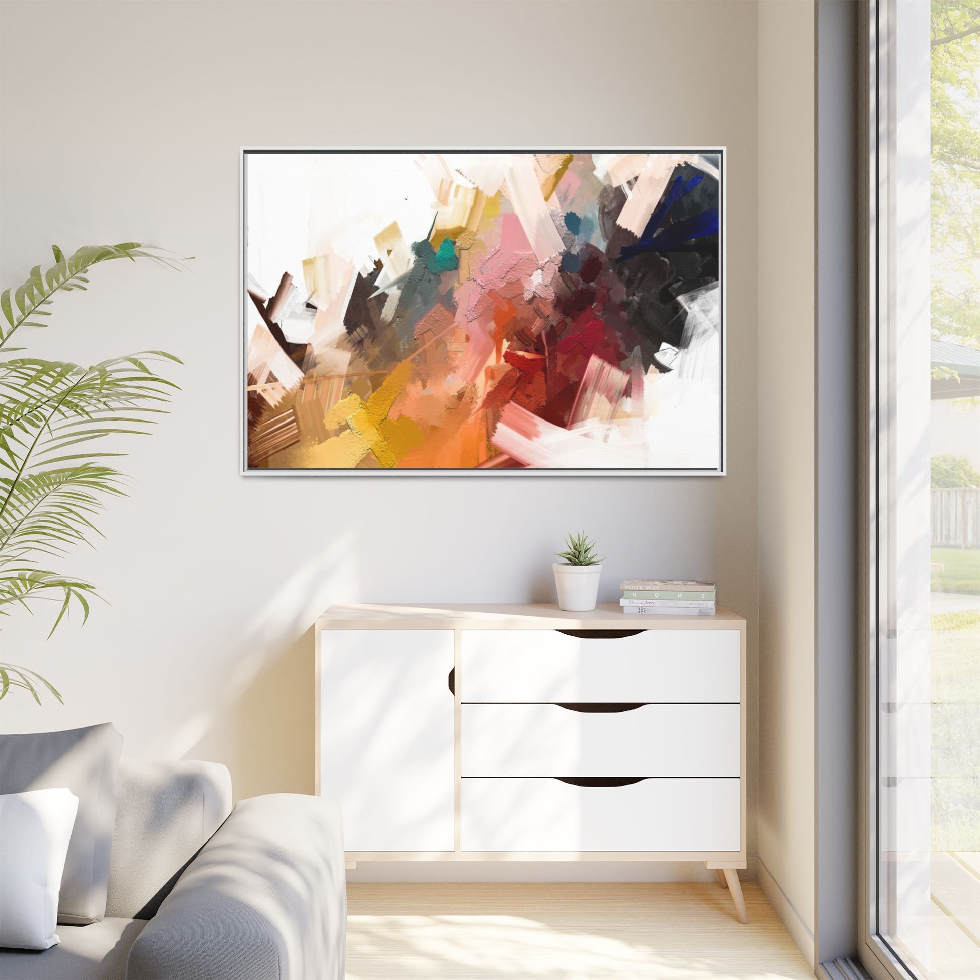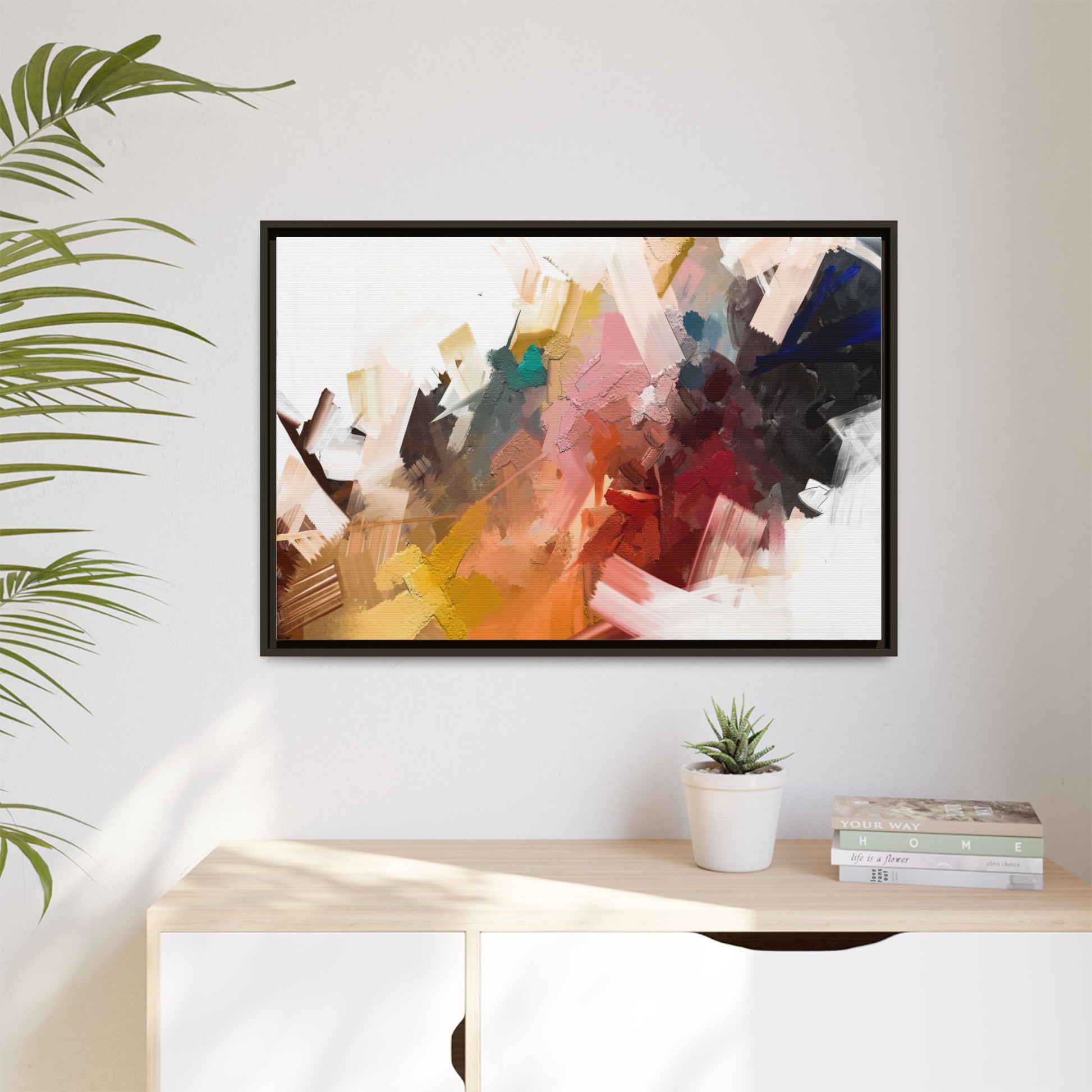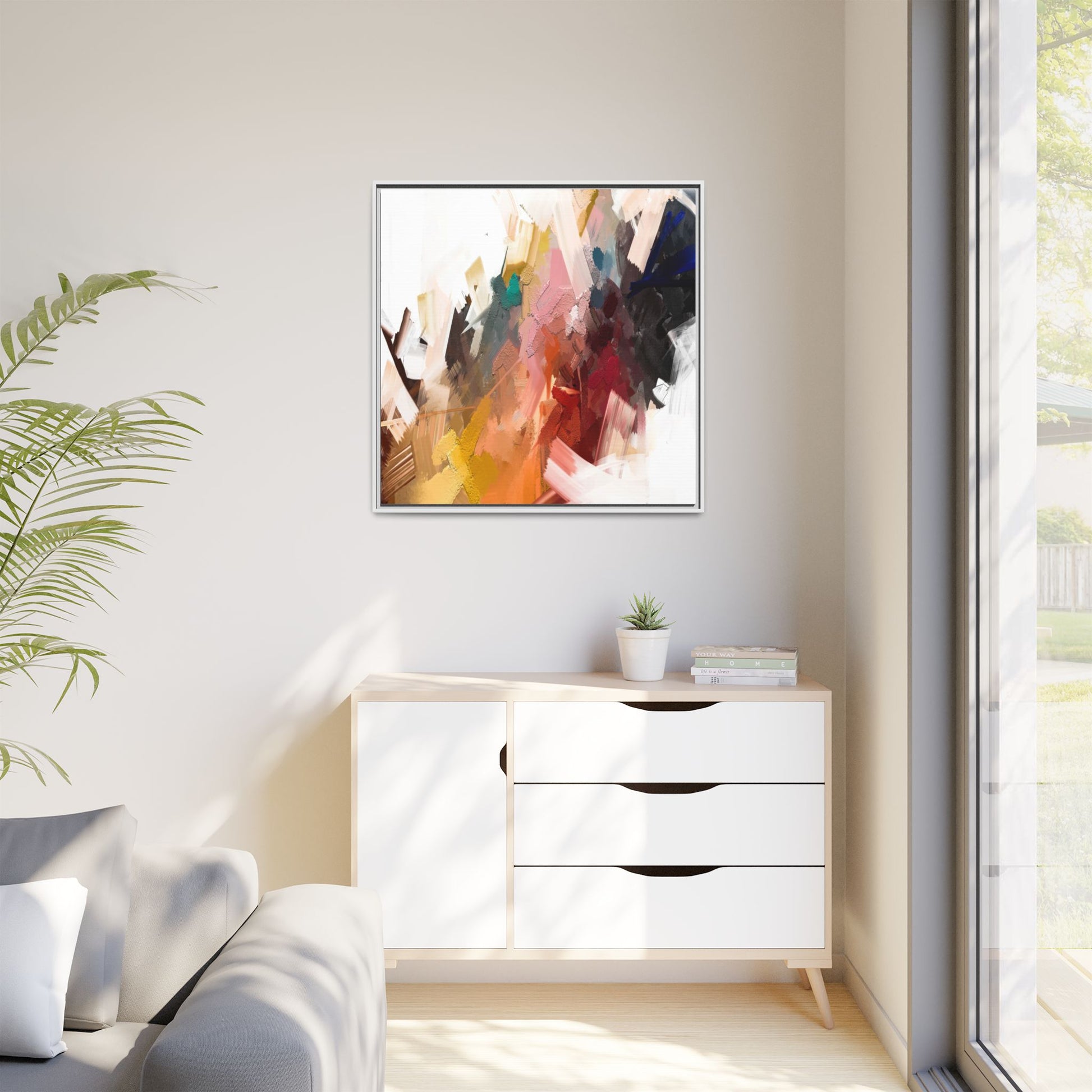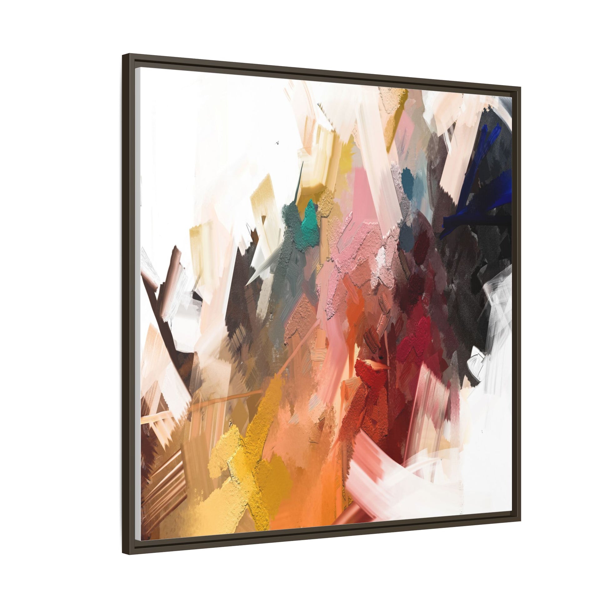 This vibrant abstract painting showcases a dynamic composition of intersecting color planes and textured brushstrokes. The artwork features a rich palette including soft whites, pale pinks, deep blues, bright yellows, emerald greens, and deep reds, creating a complex visual landscape. Layers of paint appear to have been applied with varying techniques, including thick impasto and more translucent washes, giving the piece a sense of depth and dimensionality. The painting's style suggests a contemporary abstract expressionist approach, with gestural marks and angular fragments that create a sense of movement and energy across the canvas. Subtle variations in texture—from smooth surfaces to raised, almost sculptural paint applications—add visual intrigue and complexity to the overall composition.