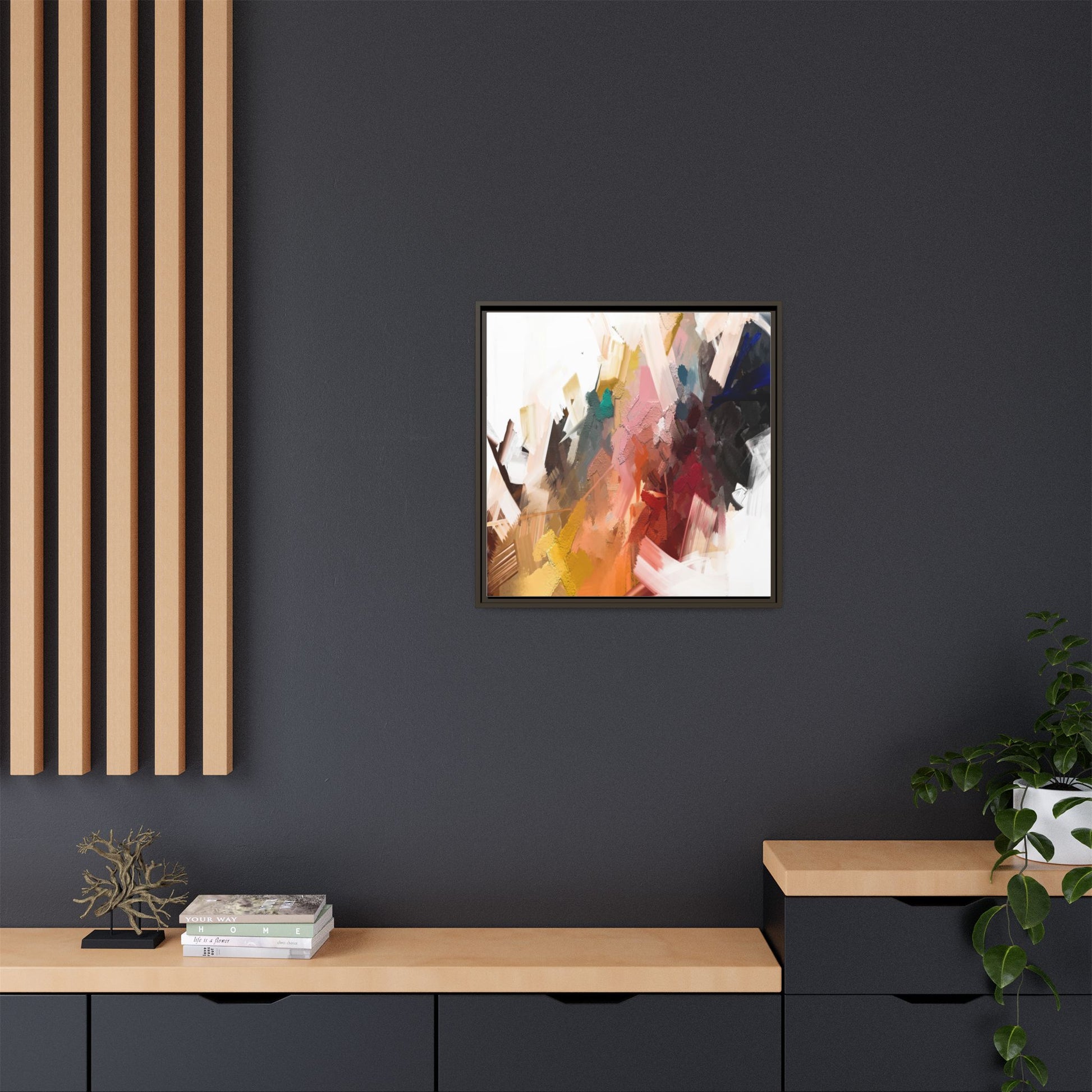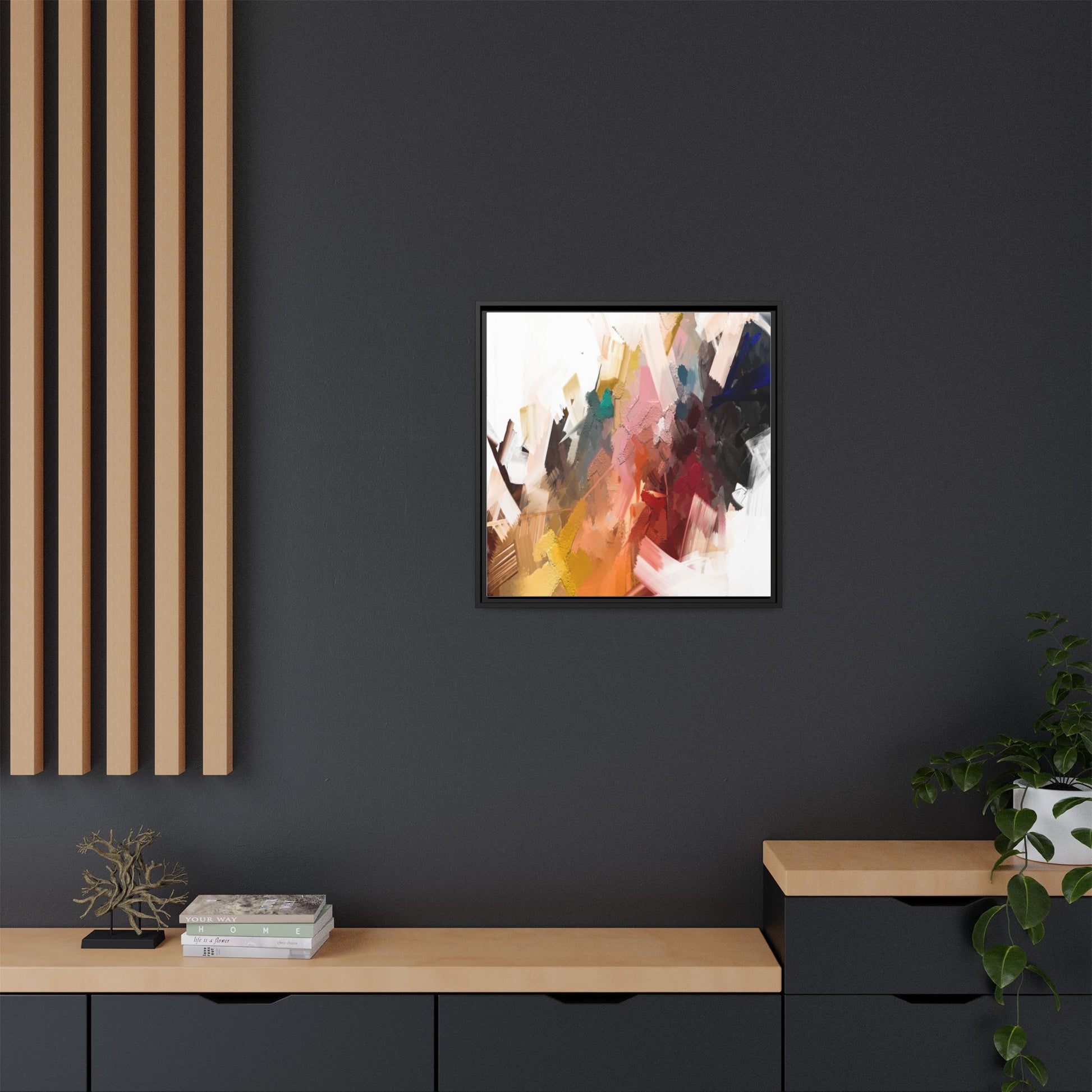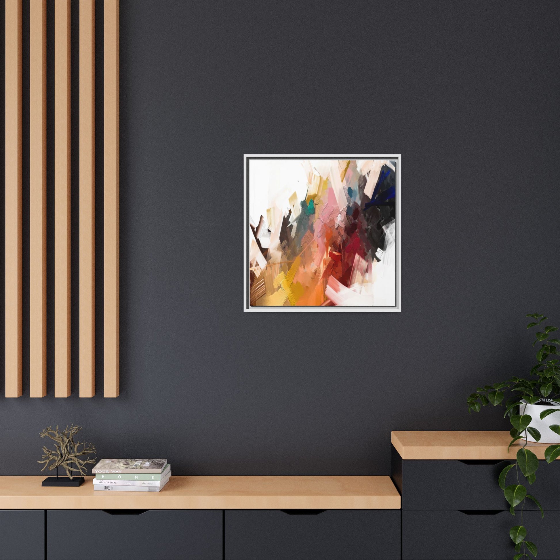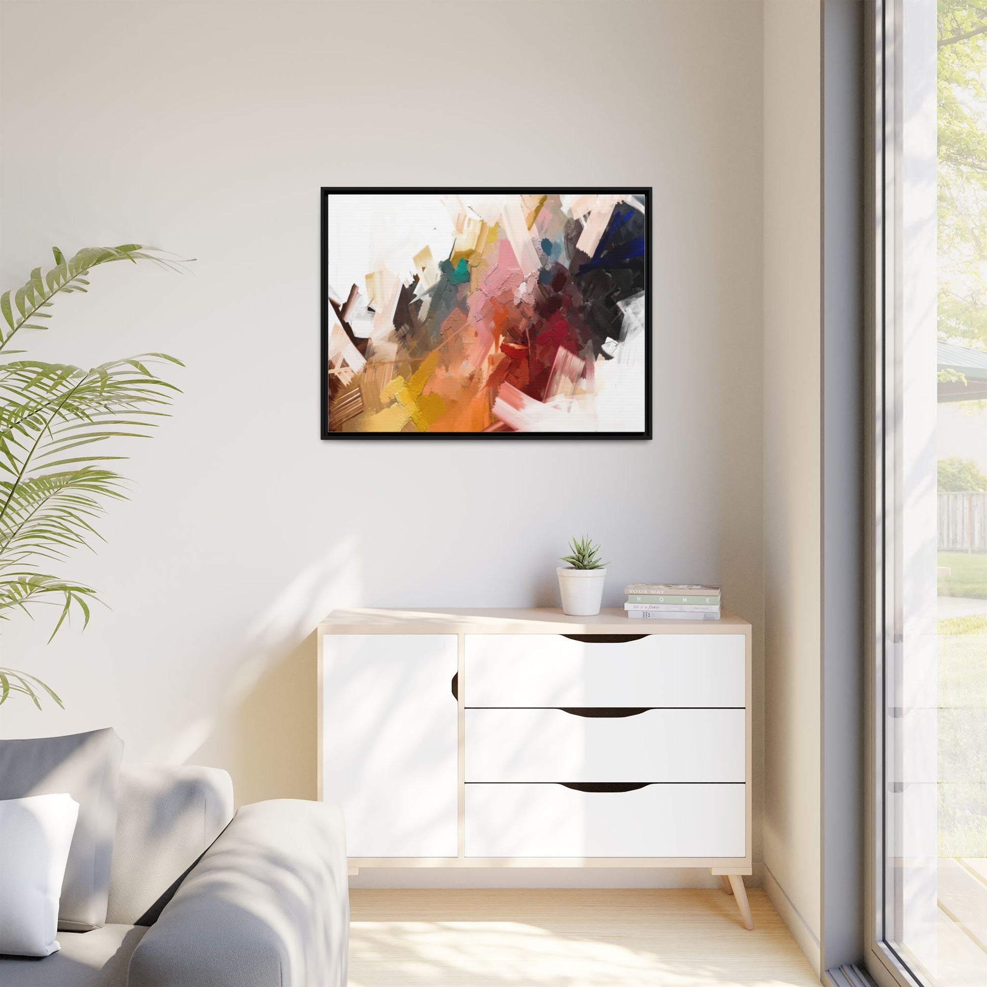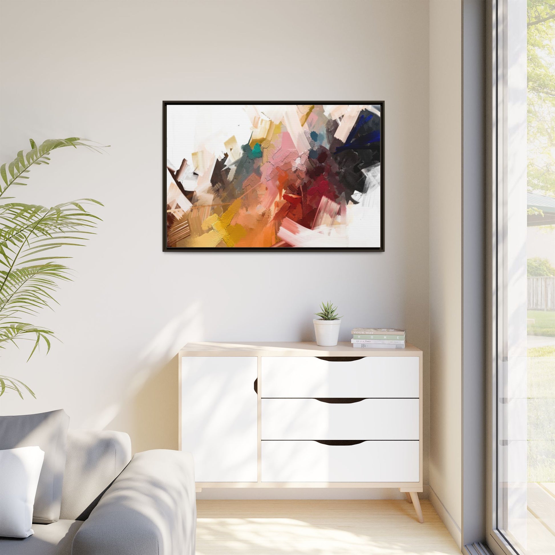 This vibrant abstract painting showcases a dynamic composition of intersecting color planes and textured brushstrokes. The artwork features a rich palette including soft whites, pale pinks, deep blues, bright yellows, emerald greens, and deep reds, creating a complex visual landscape. Layers of paint appear to have been applied with varying techniques, including thick impasto and more translucent washes, giving the piece a sense of depth and dimensionality. The painting's style suggests a contemporary abstract expressionist approach, with gestural marks and angular fragments that create a sense of movement and energy across the canvas. Subtle variations in texture—from smooth surfaces to raised, almost sculptural paint applications—add visual intrigue and complexity to the overall composition.