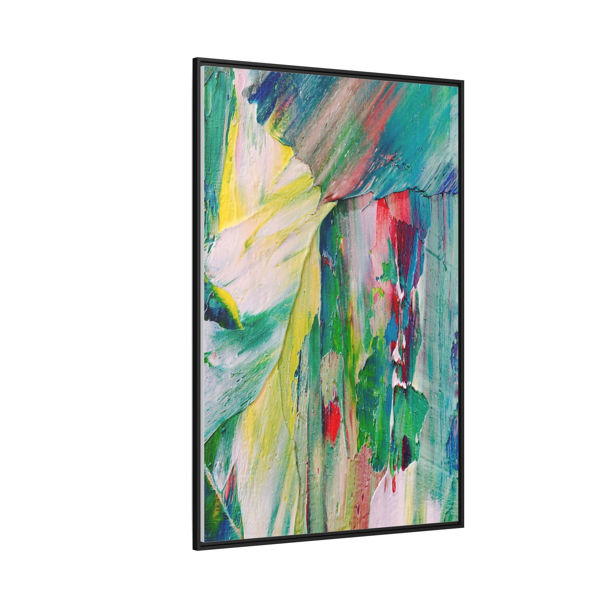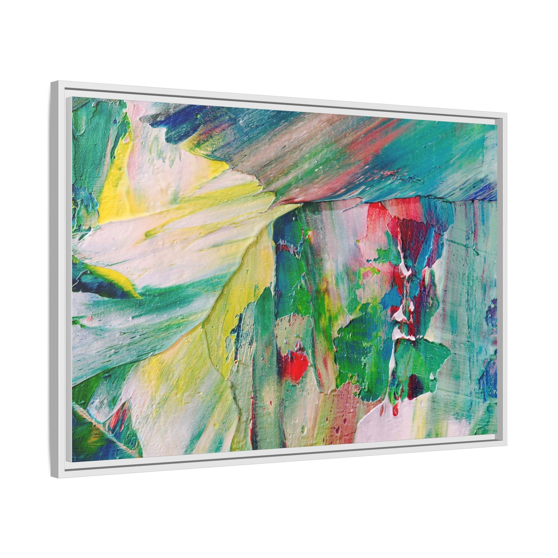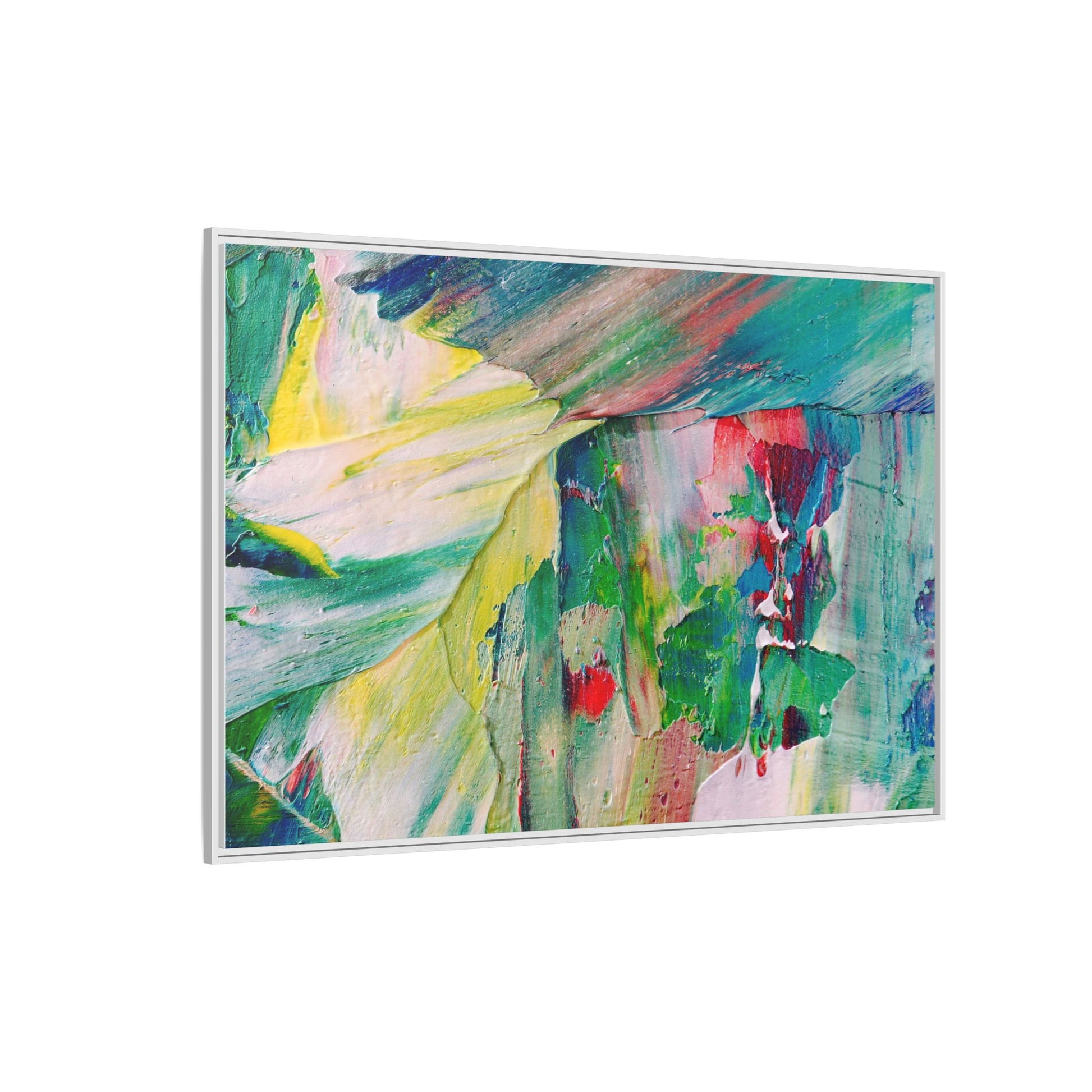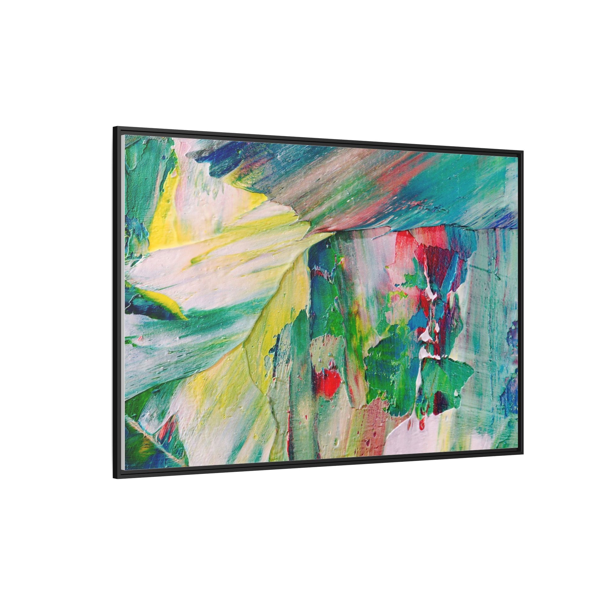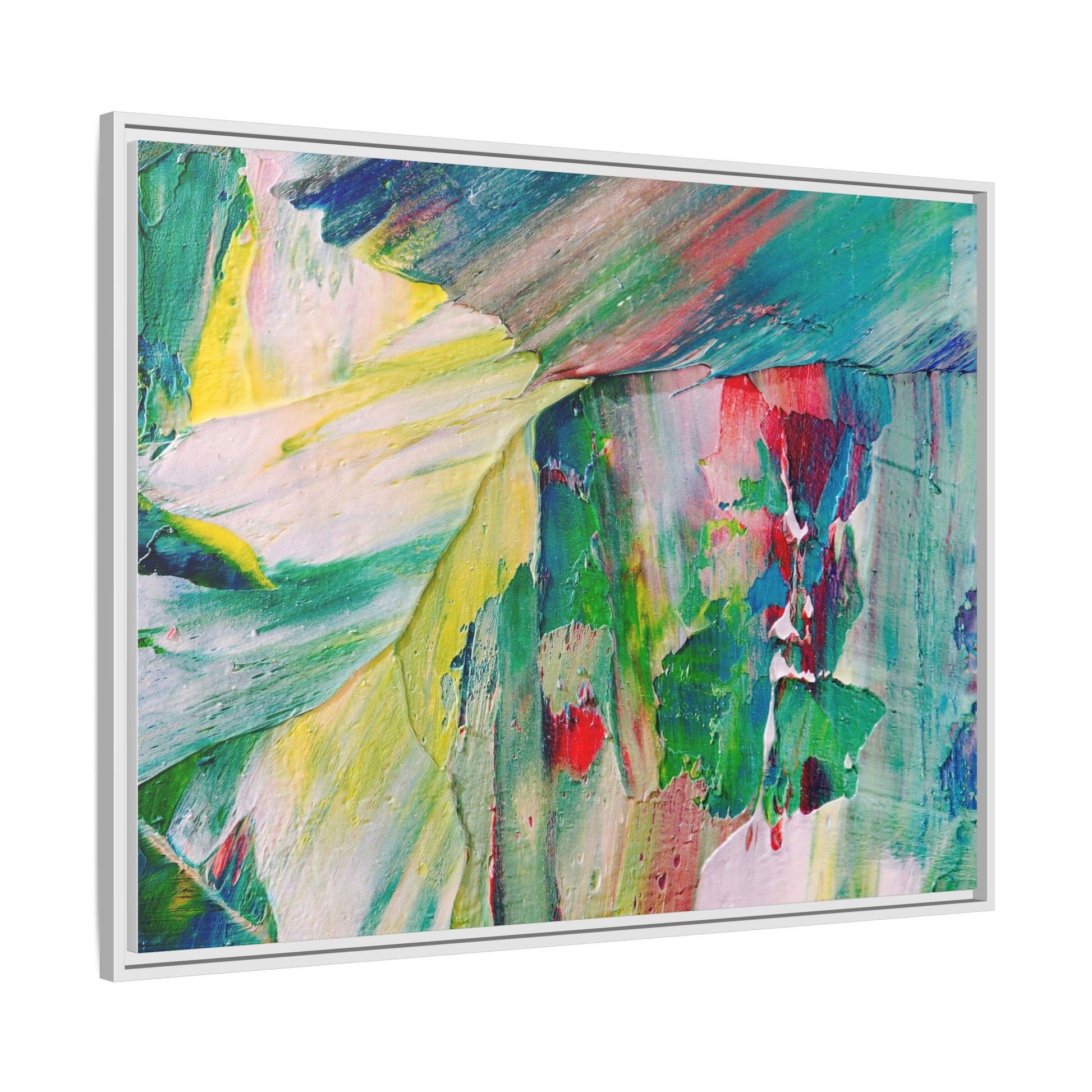 This vibrant abstract painting bursts with a dynamic array of colors, featuring sweeping brushstrokes and textured layers of paint. Soft yellows blend seamlessly with rich greens, deep blues, and passionate reds, creating a fluid and energetic composition. The artwork appears to be created using thick, expressive oil or acrylic paint, with visible texture and movement that suggests spontaneity and emotional depth. Diagonal and curved lines create a sense of motion, drawing the viewer's eye across the canvas and creating an immersive, almost landscape-like visual experience. The painting's abstract nature allows for multiple interpretations, with its bold color palette and gestural brushwork evoking a sense of natural movement and organic transformation.