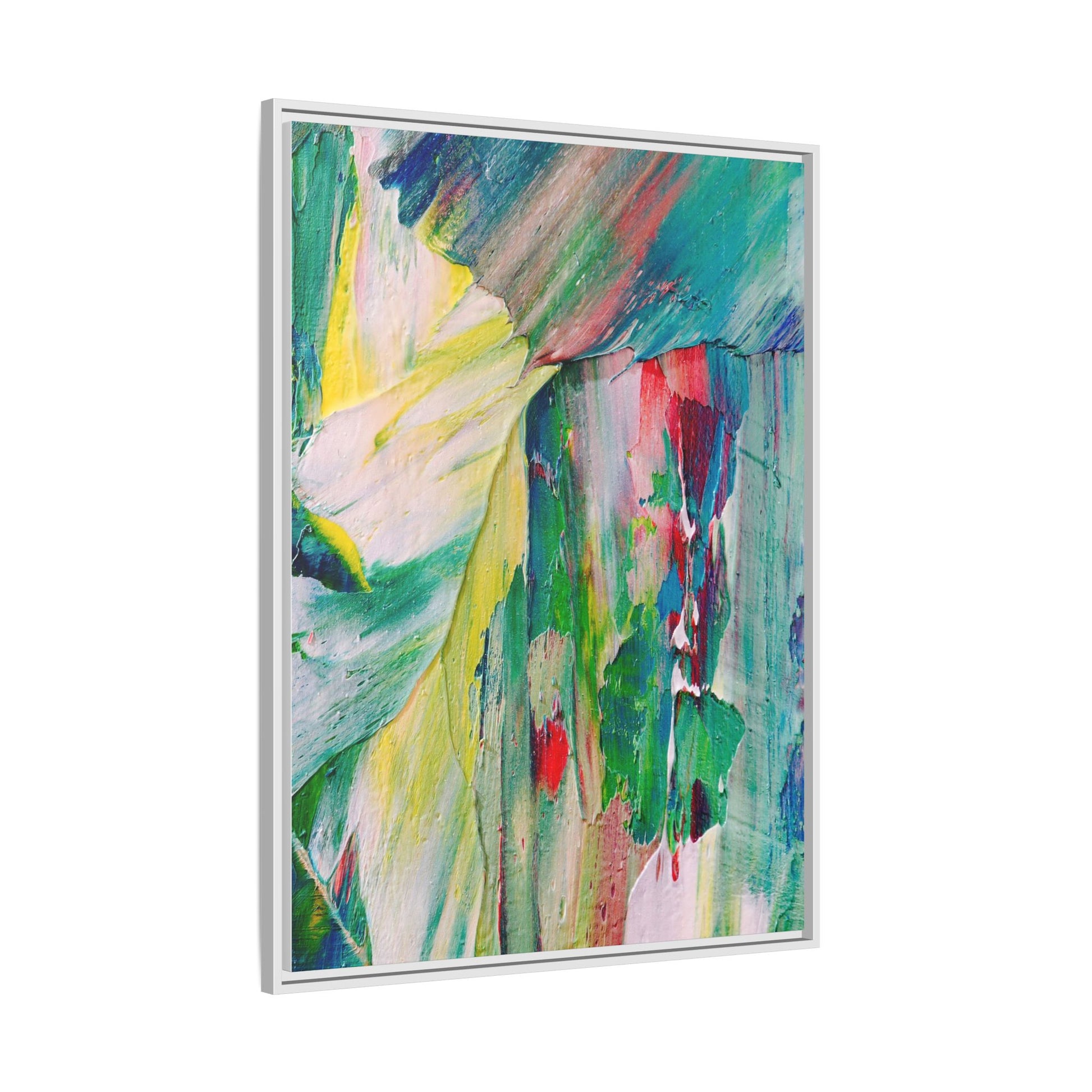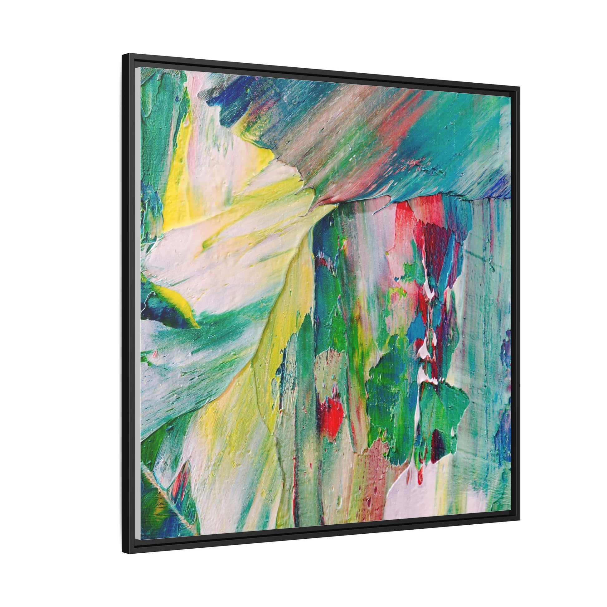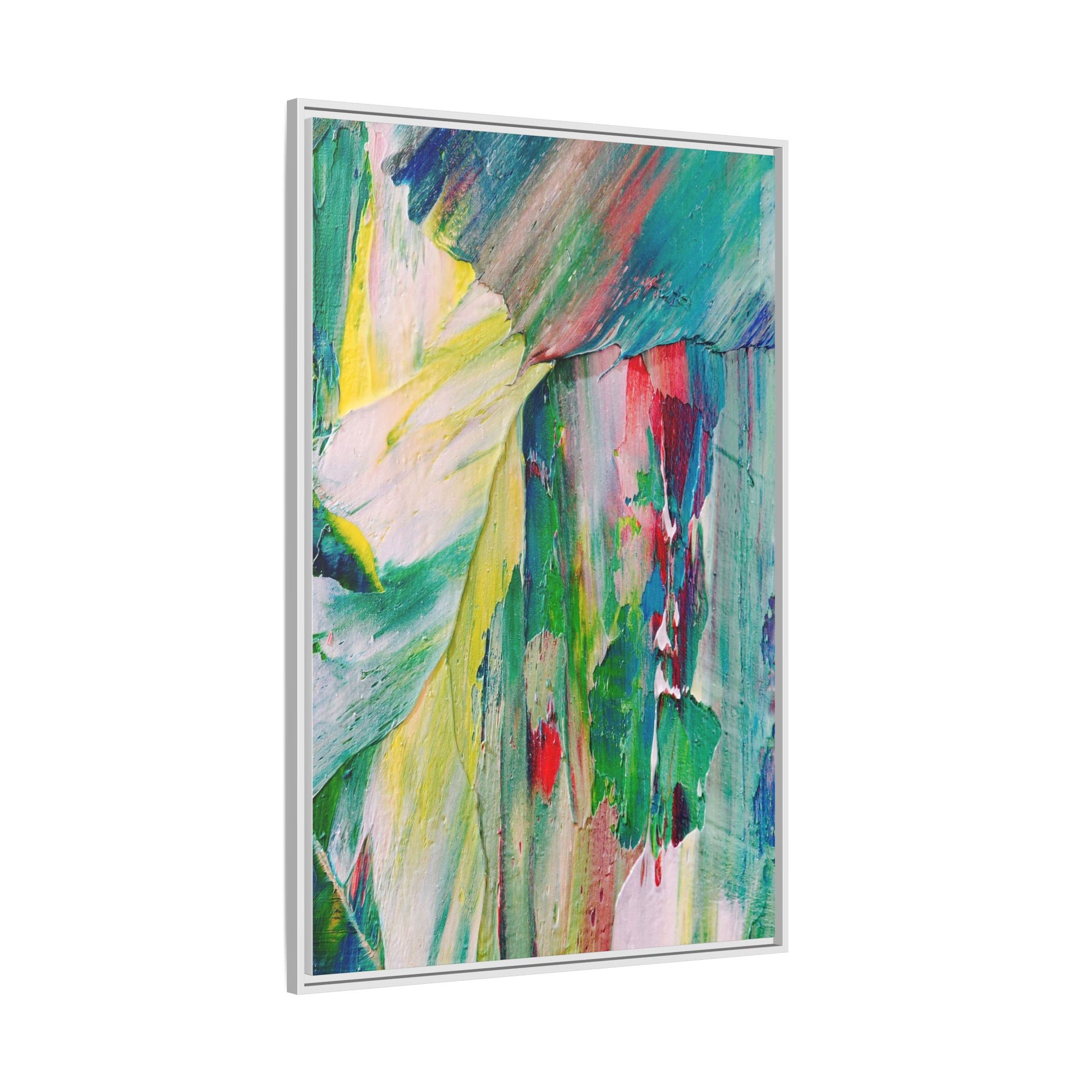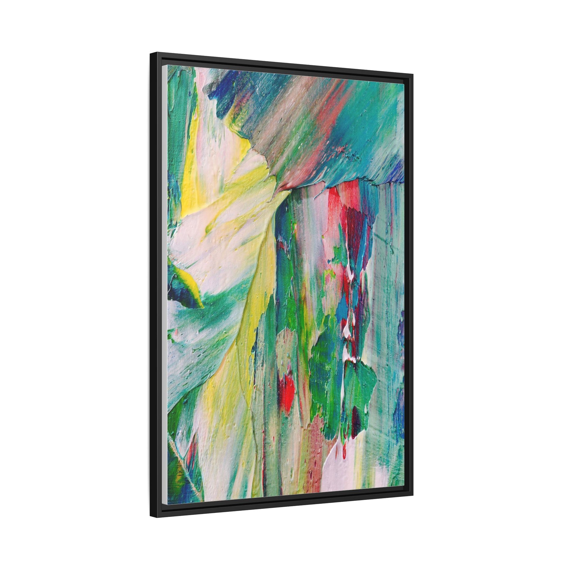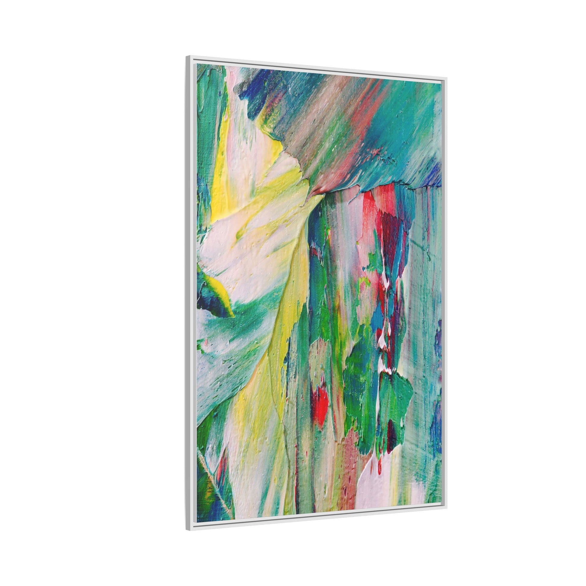 This vibrant abstract painting bursts with a dynamic array of colors, featuring sweeping brushstrokes and textured layers of paint. Soft yellows blend seamlessly with rich greens, deep blues, and passionate reds, creating a fluid and energetic composition. The artwork appears to be created using thick, expressive oil or acrylic paint, with visible texture and movement that suggests spontaneity and emotional depth. Diagonal and curved lines create a sense of motion, drawing the viewer's eye across the canvas and creating an immersive, almost landscape-like visual experience. The painting's abstract nature allows for multiple interpretations, with its bold color palette and gestural brushwork evoking a sense of natural movement and organic transformation.