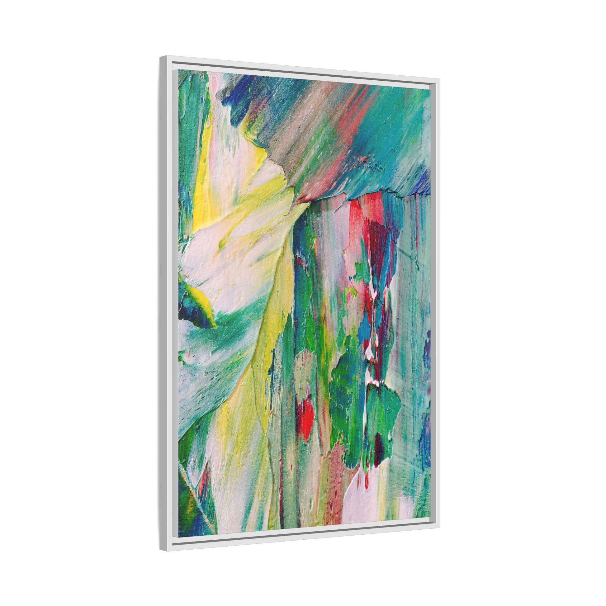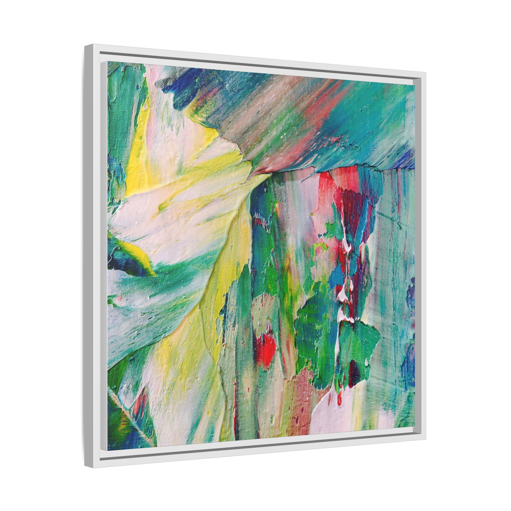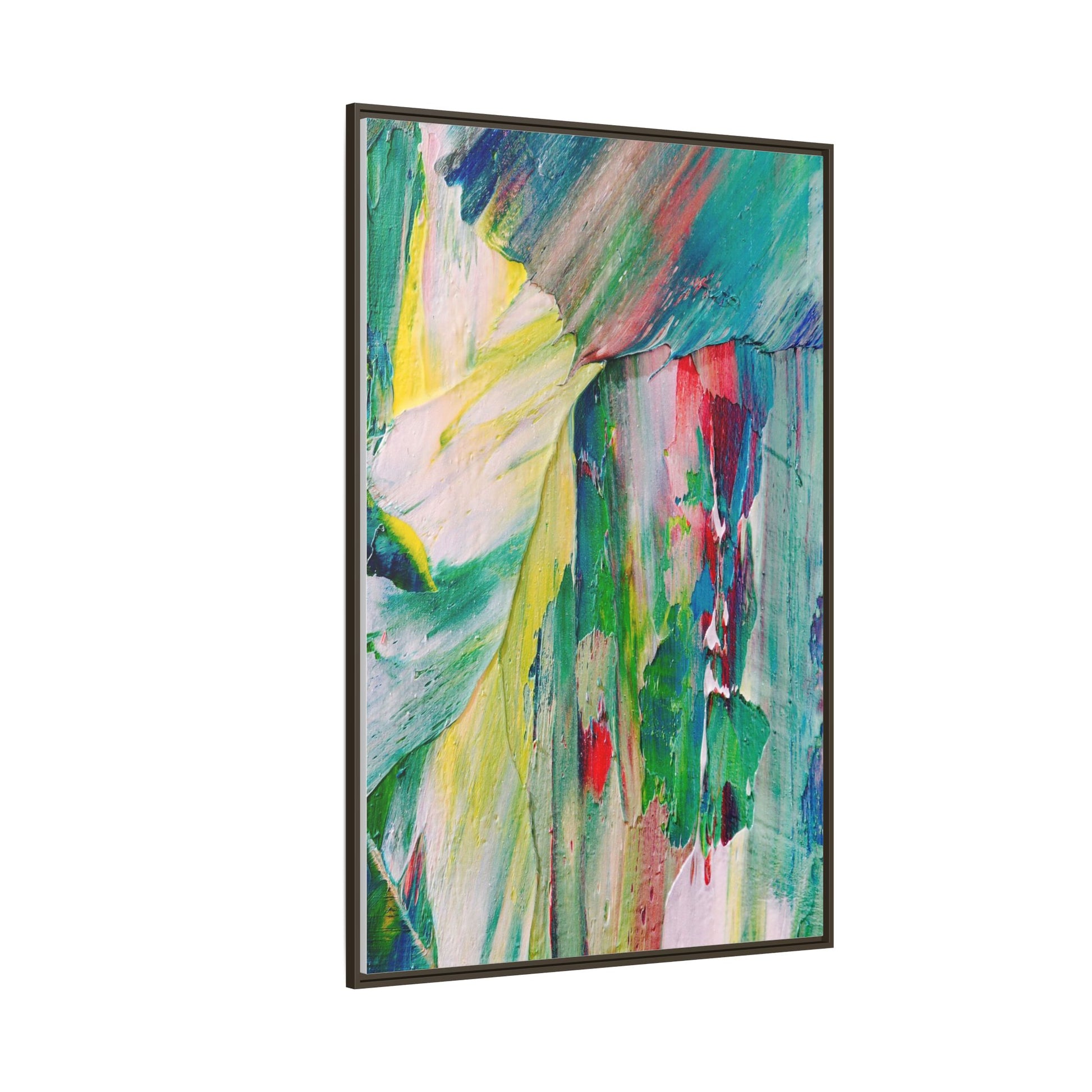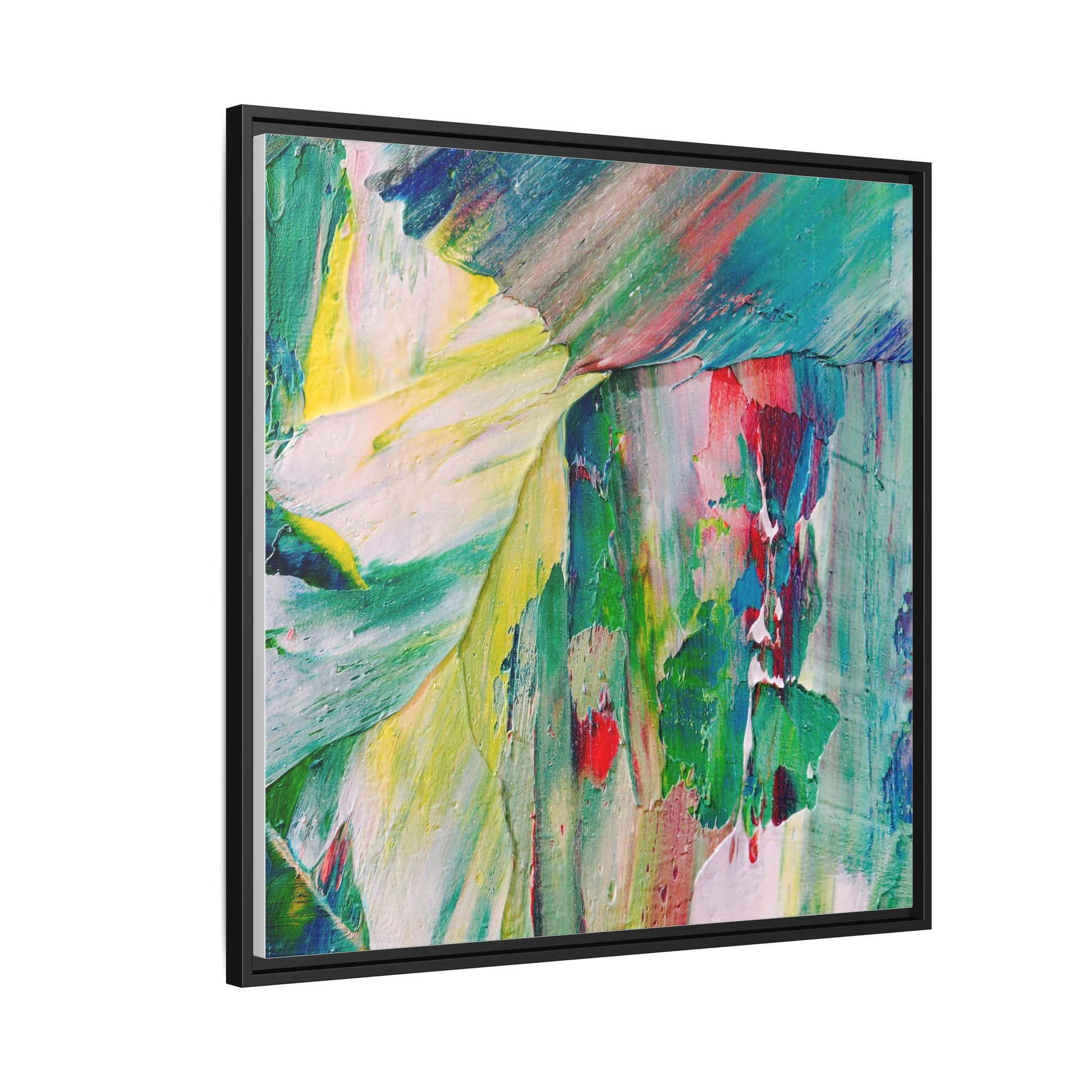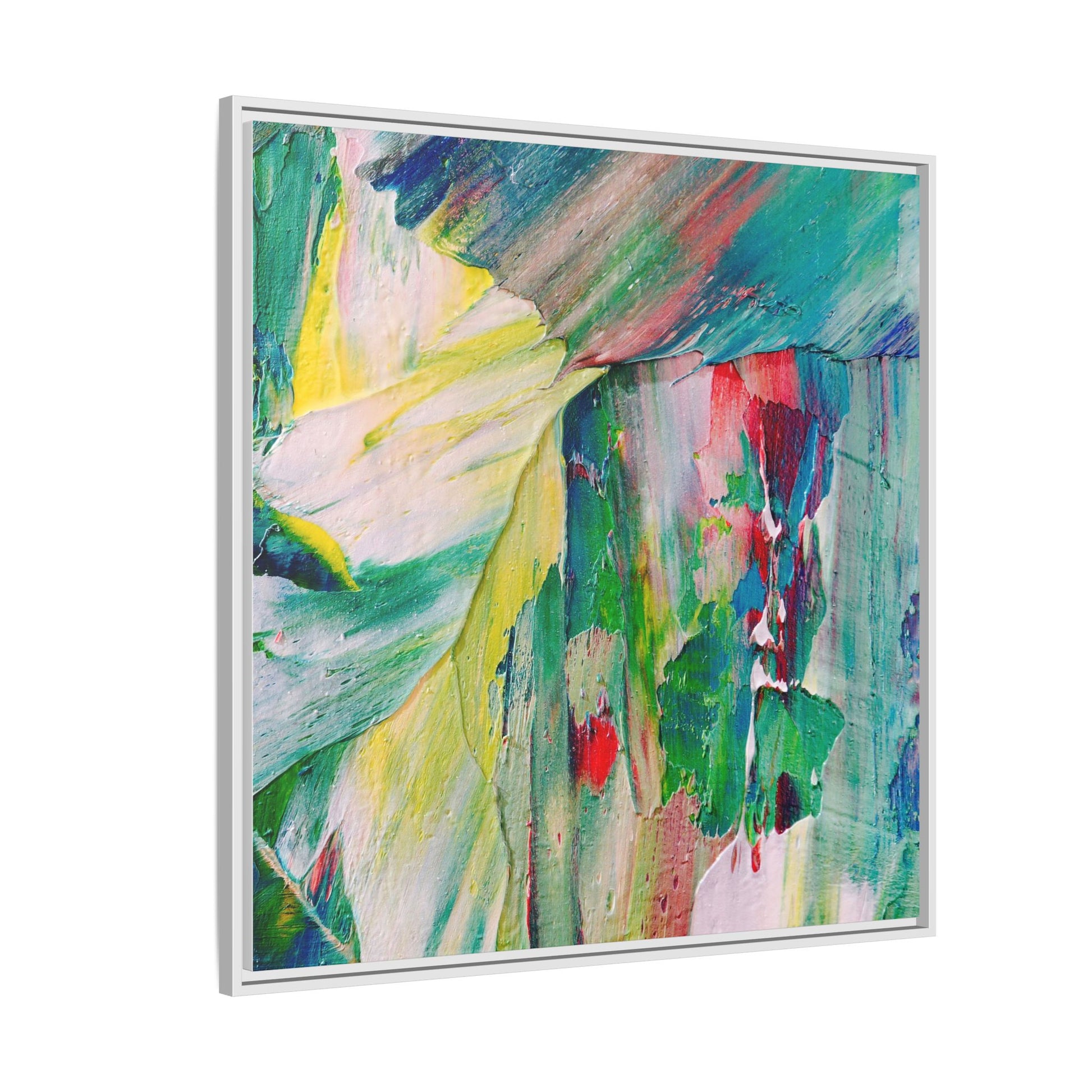 This vibrant abstract painting bursts with a dynamic array of colors, featuring sweeping brushstrokes and textured layers of paint. Soft yellows blend seamlessly with rich greens, deep blues, and passionate reds, creating a fluid and energetic composition. The artwork appears to be created using thick, expressive oil or acrylic paint, with visible texture and movement that suggests spontaneity and emotional depth. Diagonal and curved lines create a sense of motion, drawing the viewer's eye across the canvas and creating an immersive, almost landscape-like visual experience. The painting's abstract nature allows for multiple interpretations, with its bold color palette and gestural brushwork evoking a sense of natural movement and organic transformation.