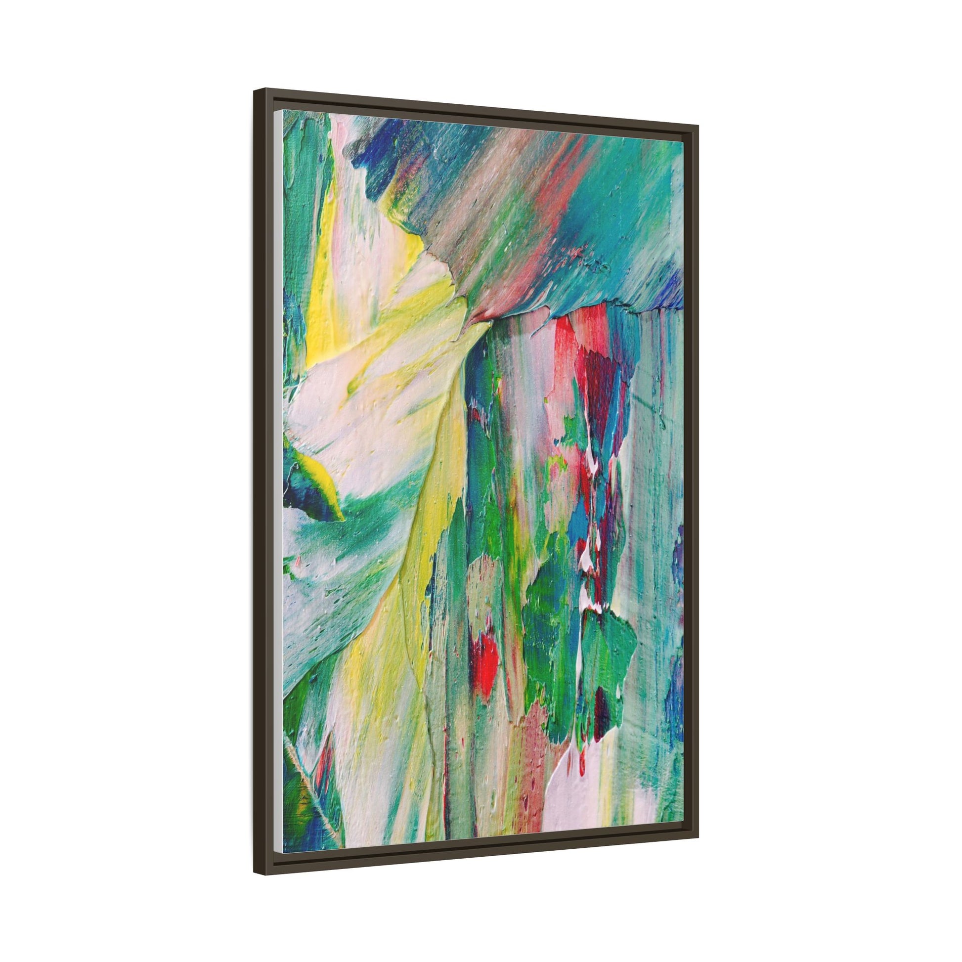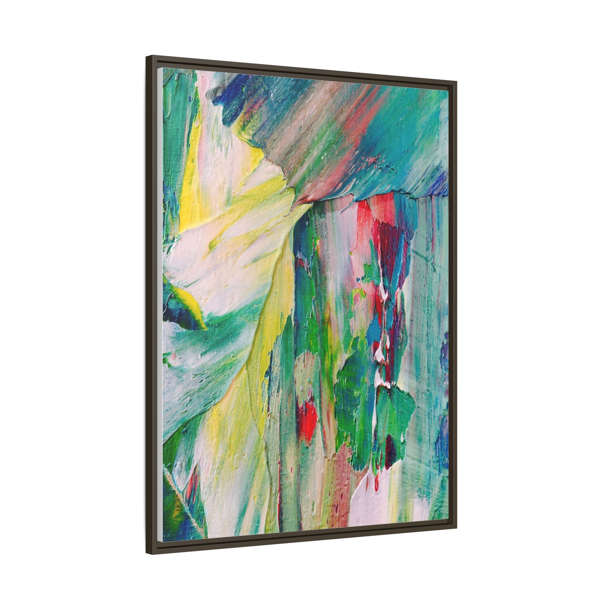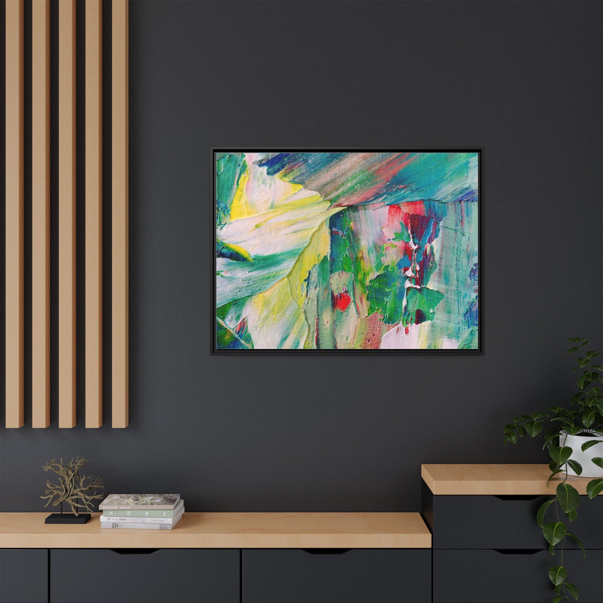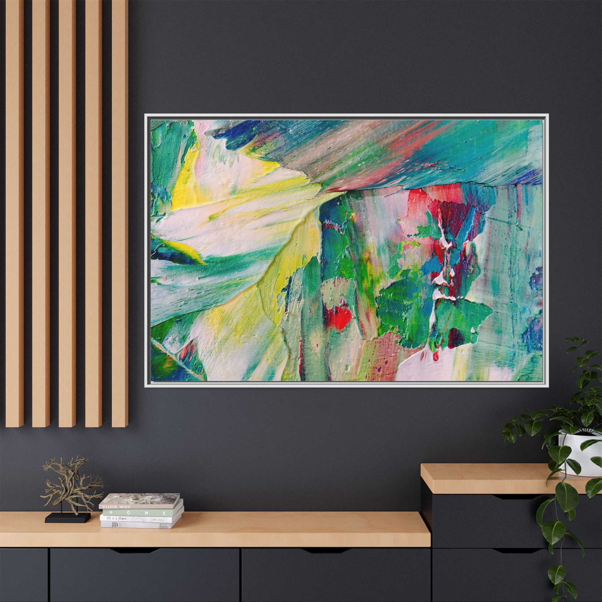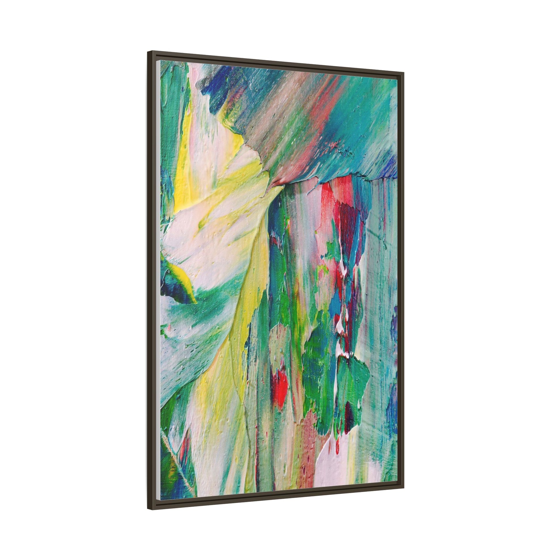 This vibrant abstract painting bursts with a dynamic array of colors, featuring sweeping brushstrokes and textured layers of paint. Soft yellows blend seamlessly with rich greens, deep blues, and passionate reds, creating a fluid and energetic composition. The artwork appears to be created using thick, expressive oil or acrylic paint, with visible texture and movement that suggests spontaneity and emotional depth. Diagonal and curved lines create a sense of motion, drawing the viewer's eye across the canvas and creating an immersive, almost landscape-like visual experience. The painting's abstract nature allows for multiple interpretations, with its bold color palette and gestural brushwork evoking a sense of natural movement and organic transformation.