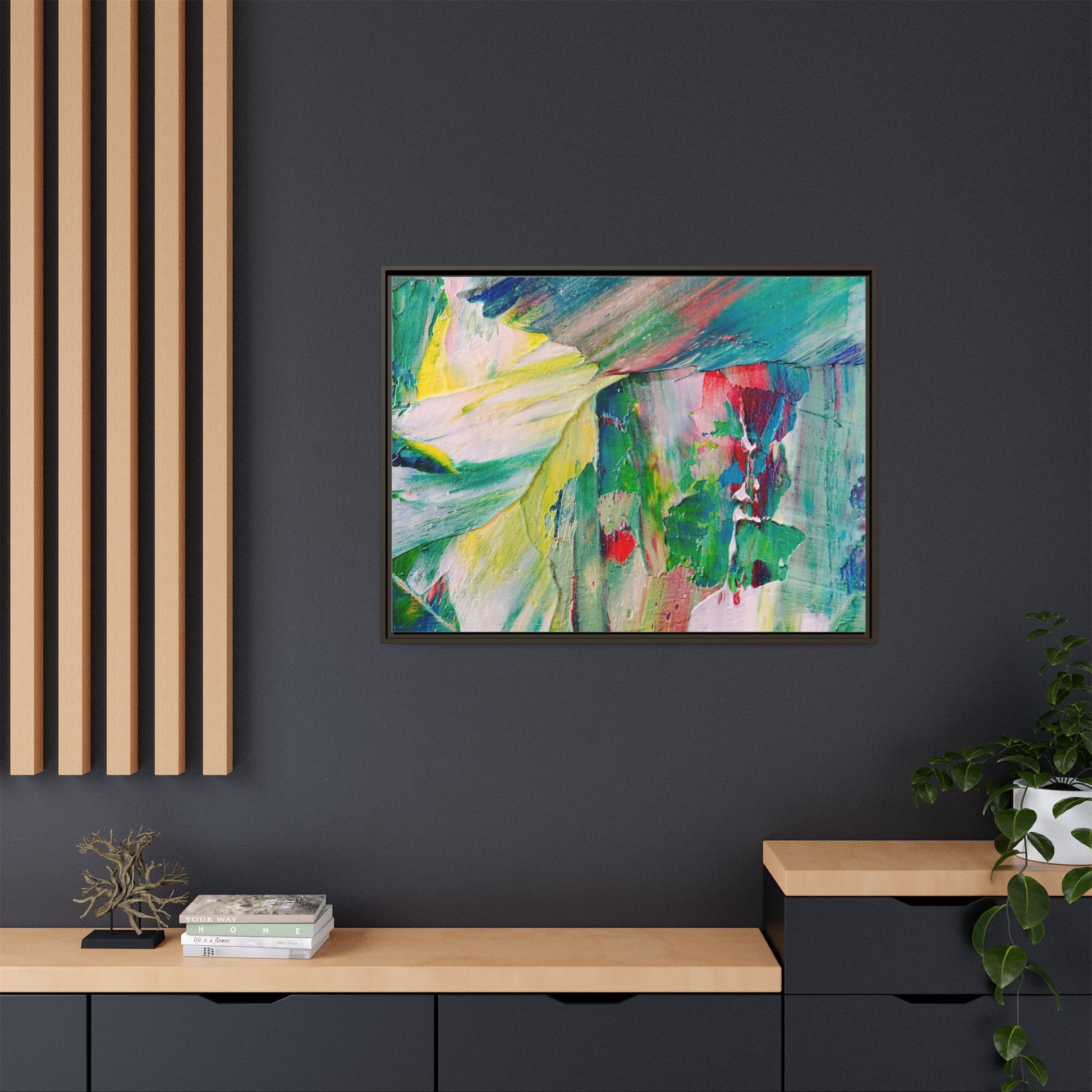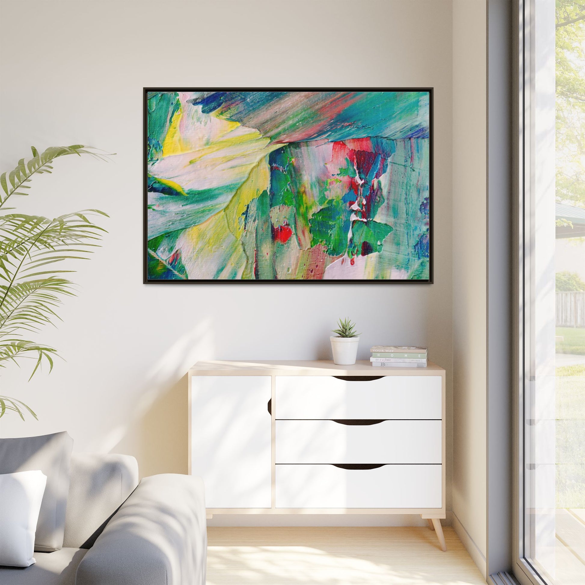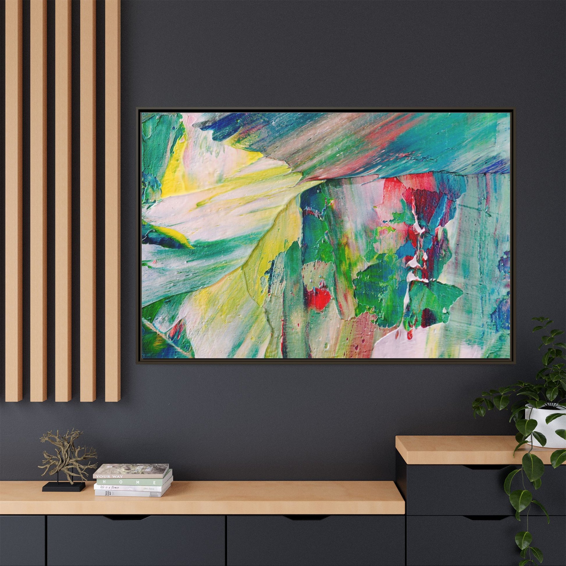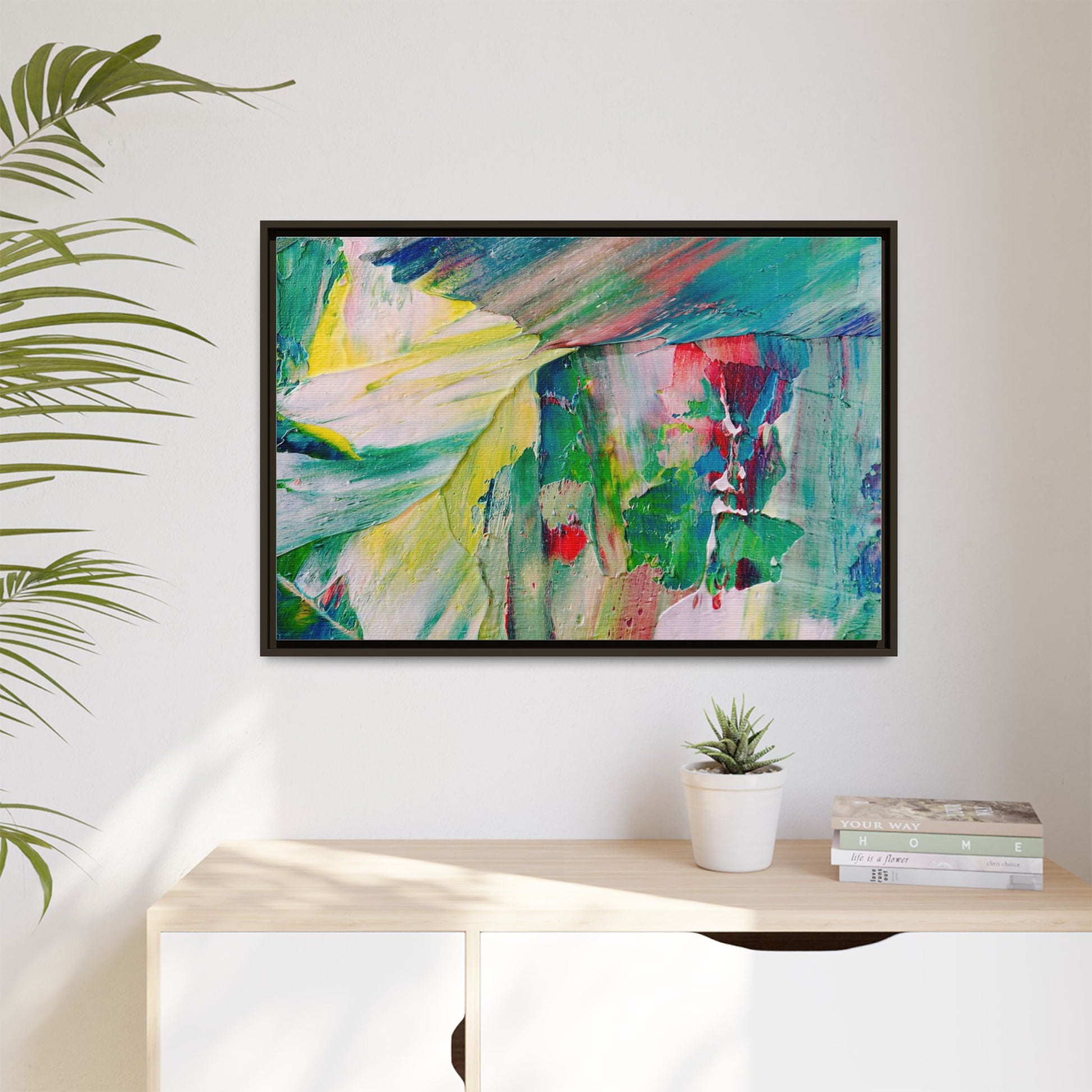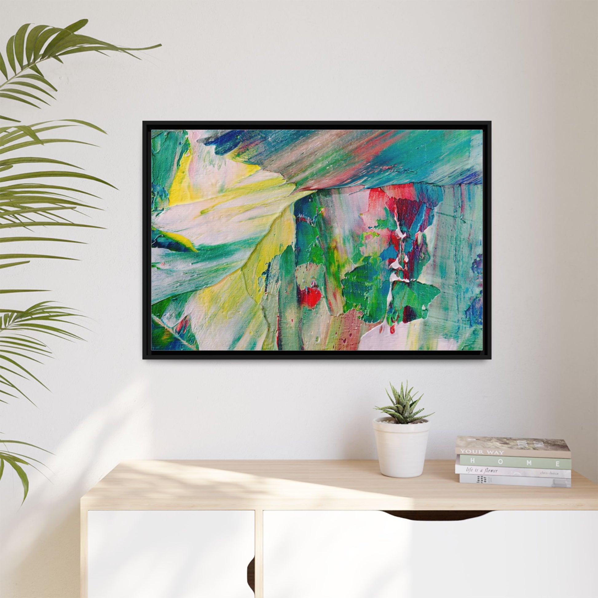 This vibrant abstract painting bursts with a dynamic array of colors, featuring sweeping brushstrokes and textured layers of paint. Soft yellows blend seamlessly with rich greens, deep blues, and passionate reds, creating a fluid and energetic composition. The artwork appears to be created using thick, expressive oil or acrylic paint, with visible texture and movement that suggests spontaneity and emotional depth. Diagonal and curved lines create a sense of motion, drawing the viewer's eye across the canvas and creating an immersive, almost landscape-like visual experience. The painting's abstract nature allows for multiple interpretations, with its bold color palette and gestural brushwork evoking a sense of natural movement and organic transformation.