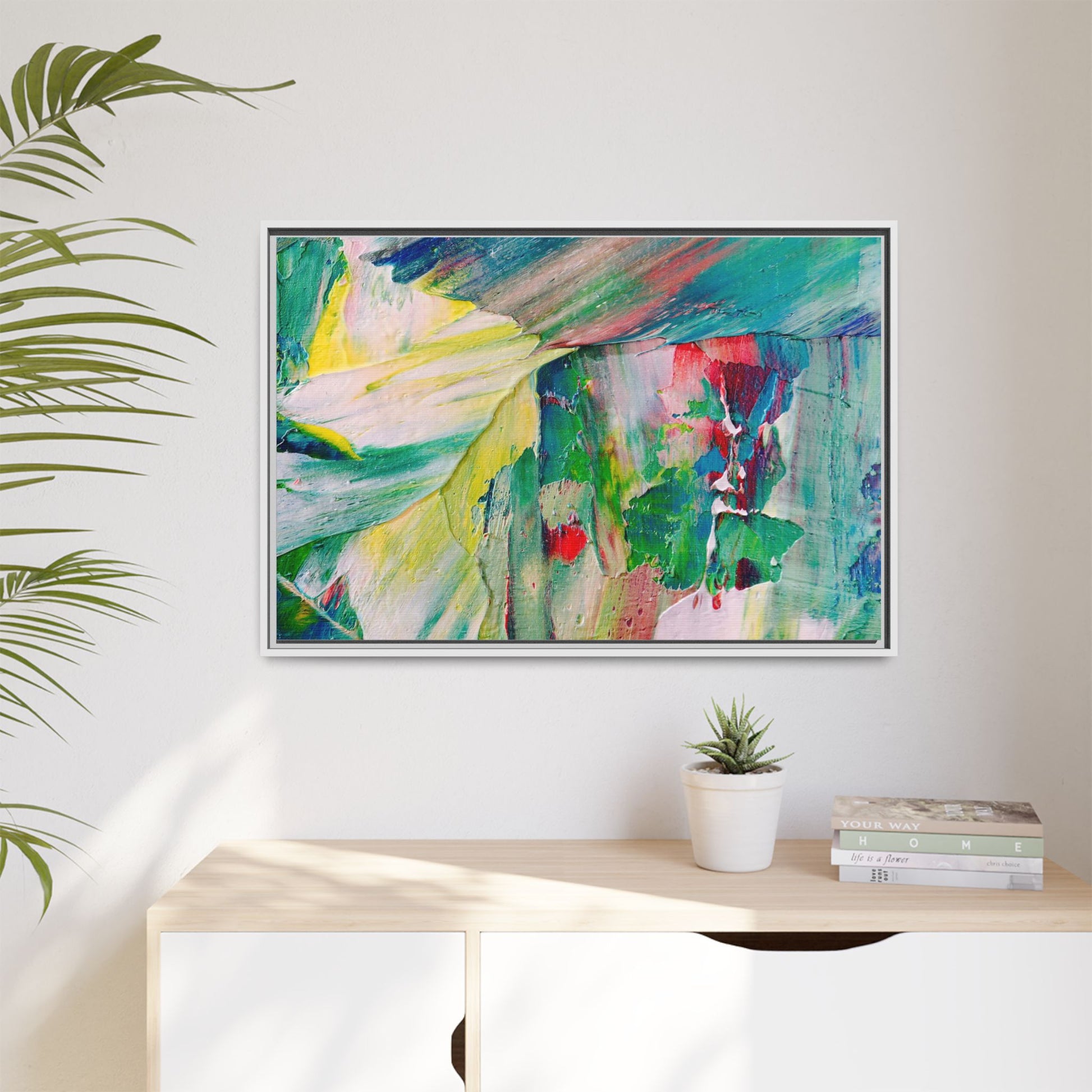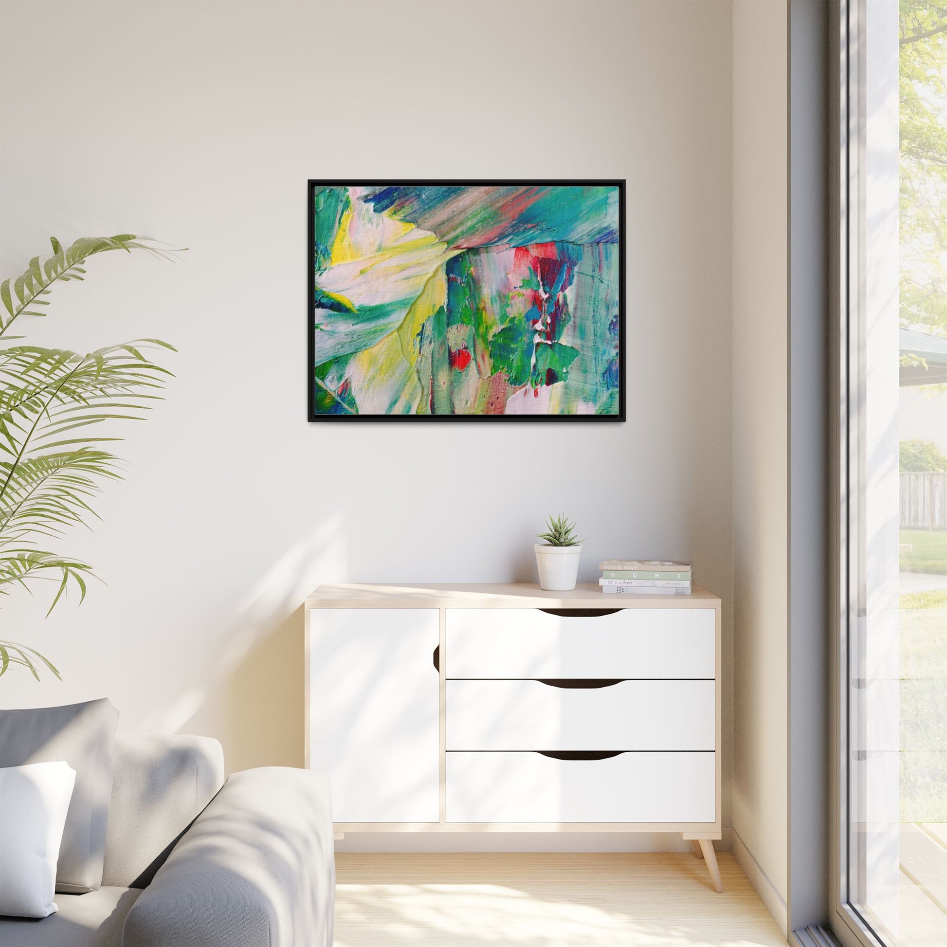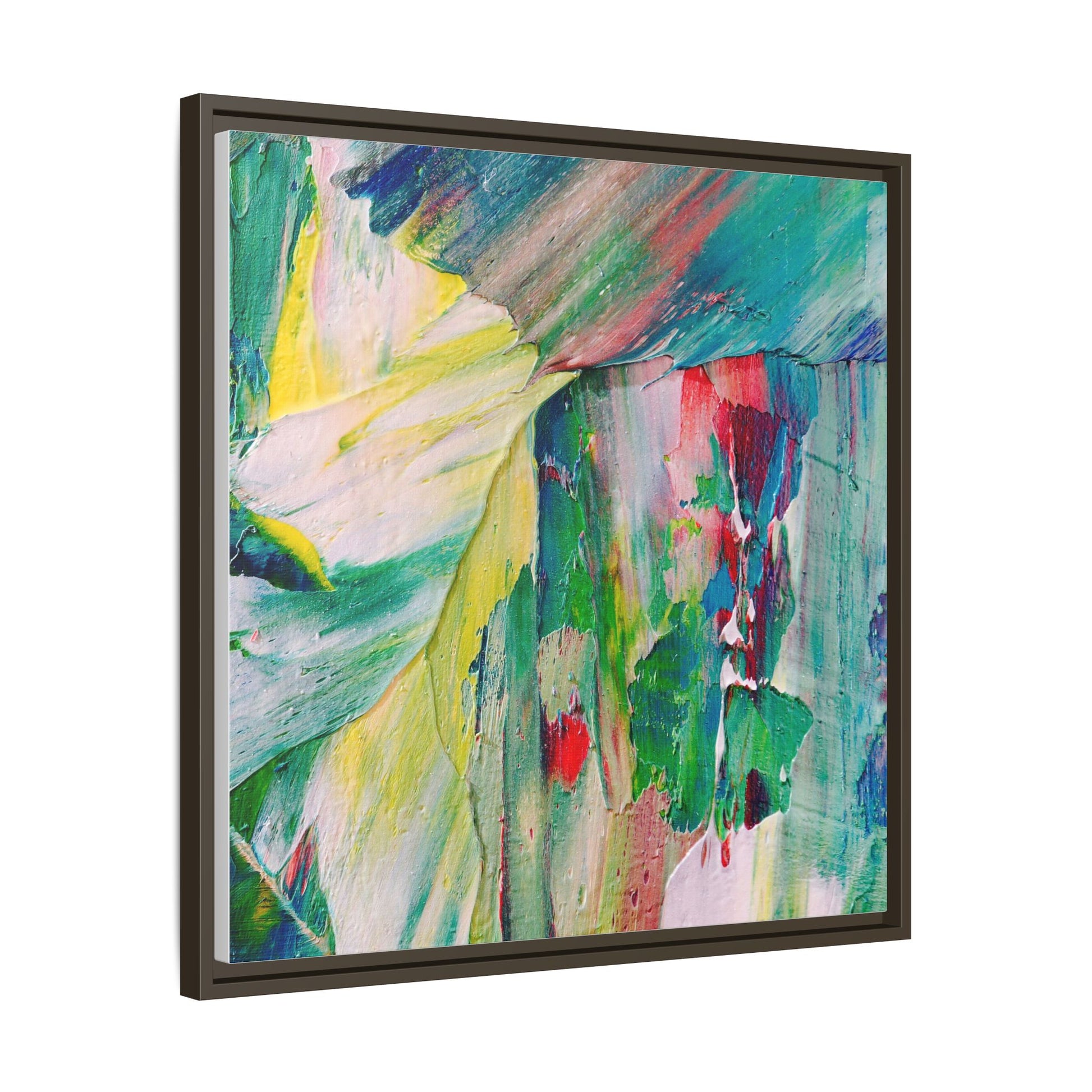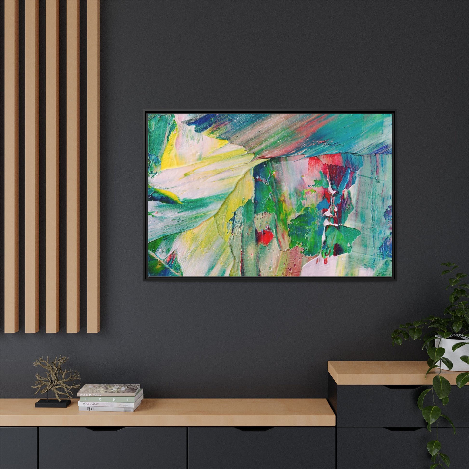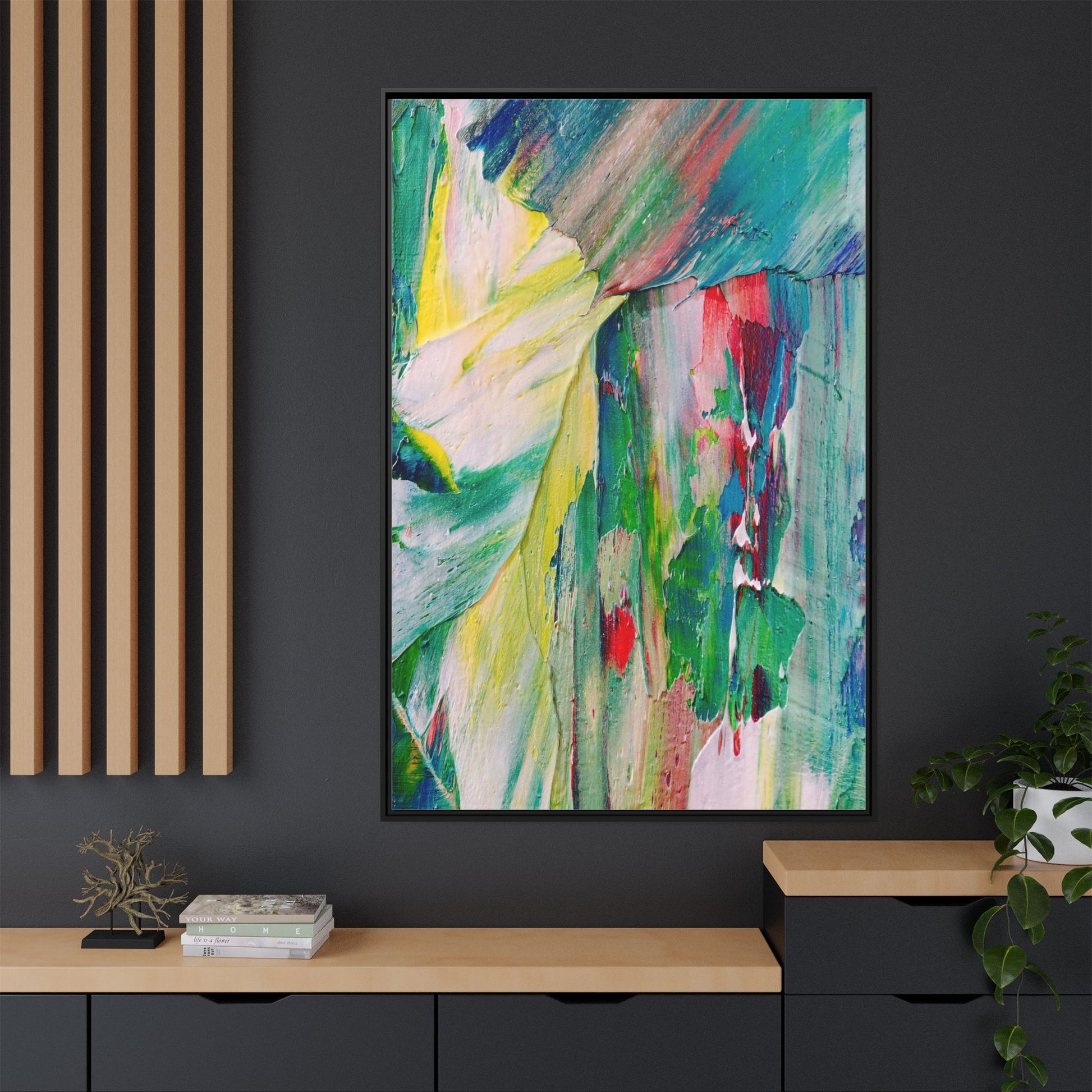 This vibrant abstract painting bursts with a dynamic array of colors, featuring sweeping brushstrokes and textured layers of paint. Soft yellows blend seamlessly with rich greens, deep blues, and passionate reds, creating a fluid and energetic composition. The artwork appears to be created using thick, expressive oil or acrylic paint, with visible texture and movement that suggests spontaneity and emotional depth. Diagonal and curved lines create a sense of motion, drawing the viewer's eye across the canvas and creating an immersive, almost landscape-like visual experience. The painting's abstract nature allows for multiple interpretations, with its bold color palette and gestural brushwork evoking a sense of natural movement and organic transformation.