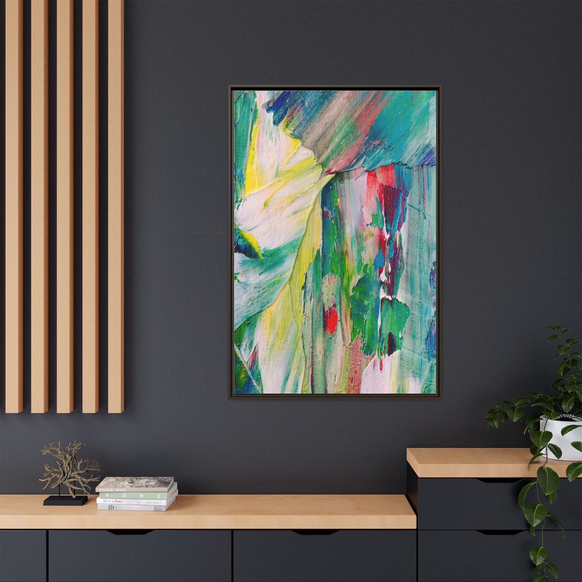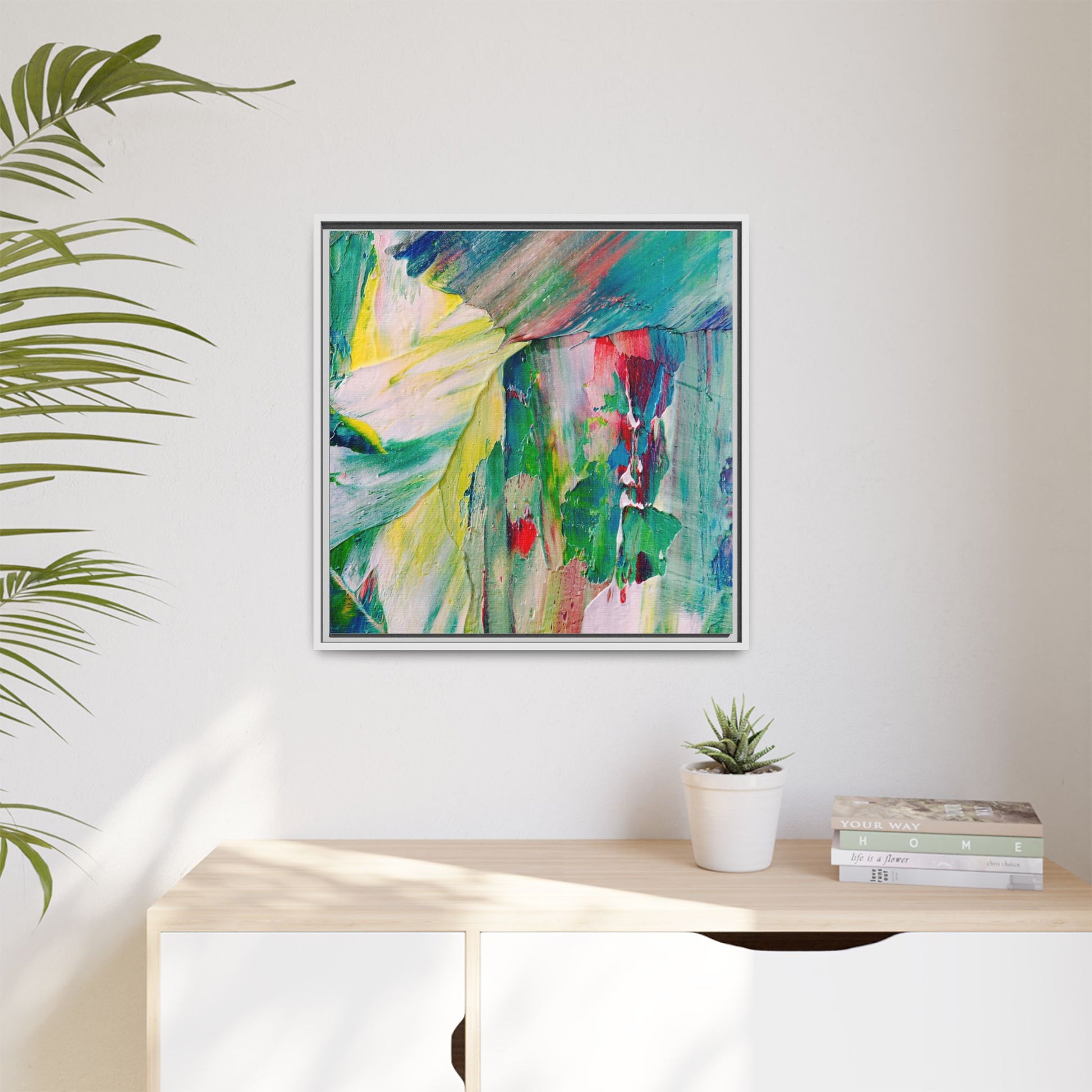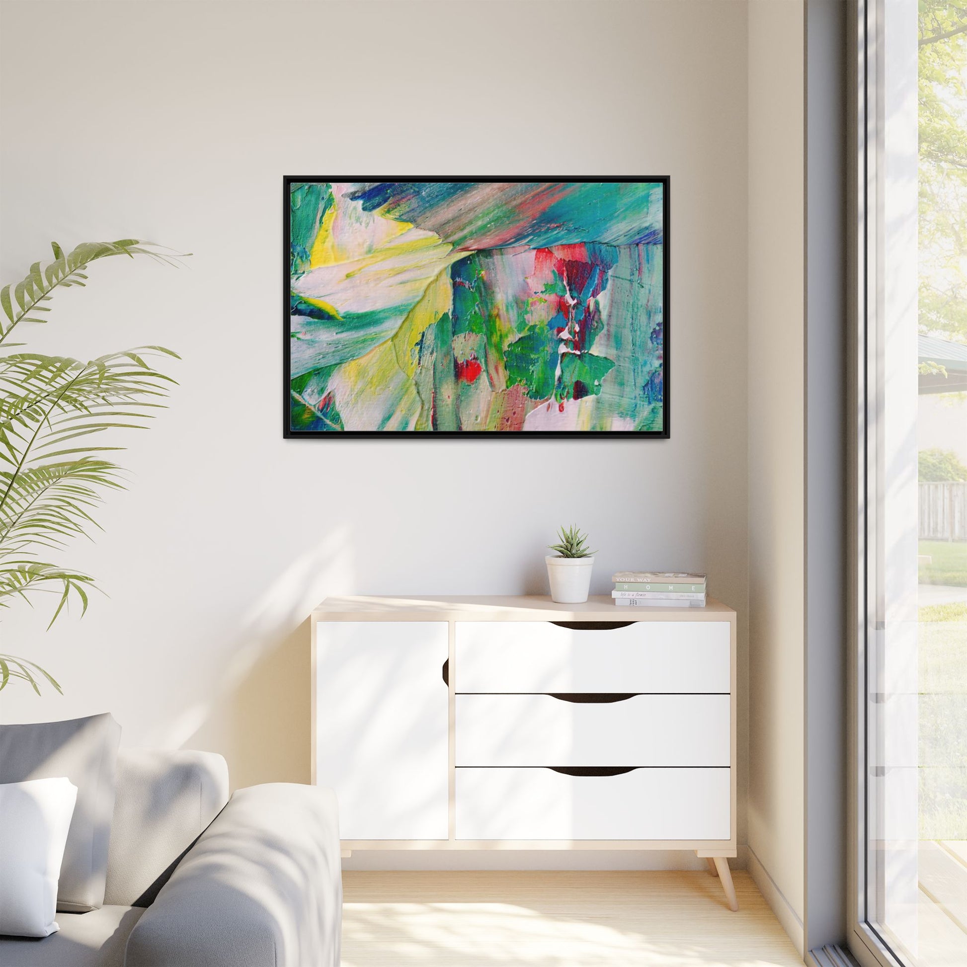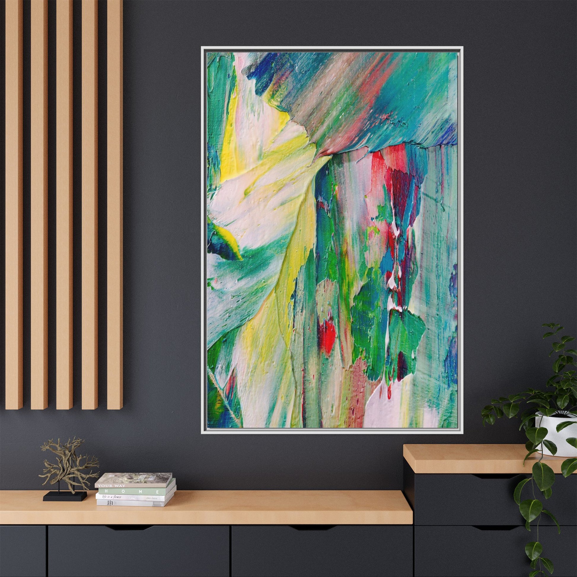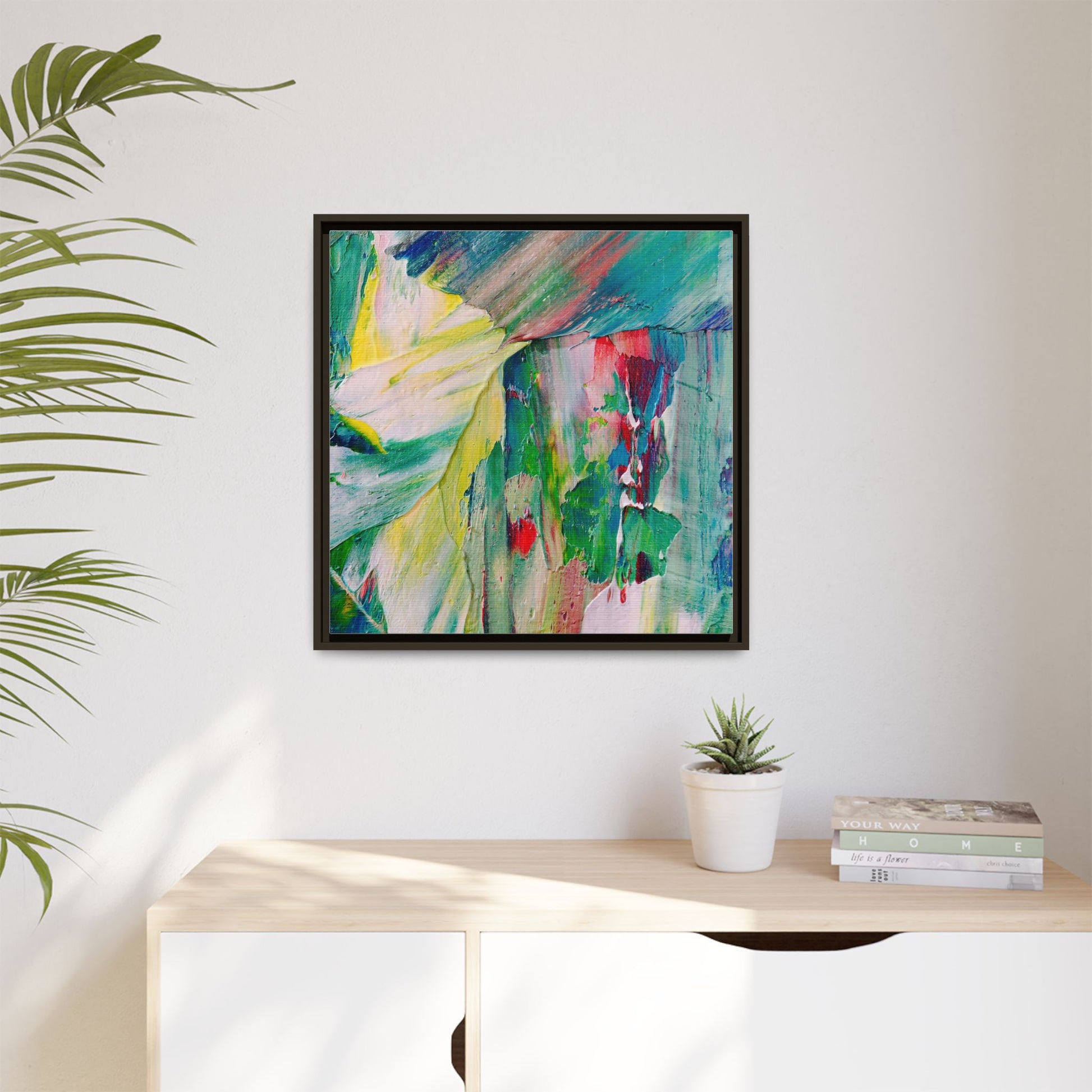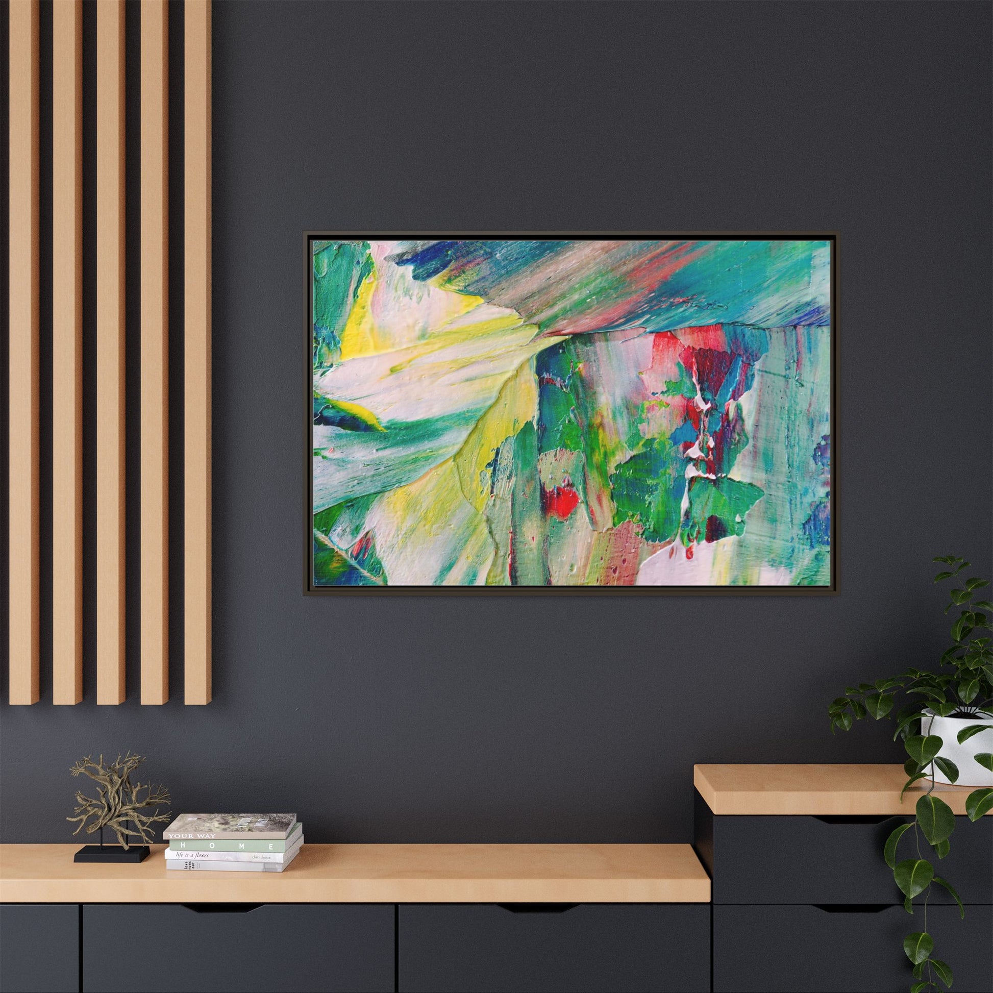 This vibrant abstract painting bursts with a dynamic array of colors, featuring sweeping brushstrokes and textured layers of paint. Soft yellows blend seamlessly with rich greens, deep blues, and passionate reds, creating a fluid and energetic composition. The artwork appears to be created using thick, expressive oil or acrylic paint, with visible texture and movement that suggests spontaneity and emotional depth. Diagonal and curved lines create a sense of motion, drawing the viewer's eye across the canvas and creating an immersive, almost landscape-like visual experience. The painting's abstract nature allows for multiple interpretations, with its bold color palette and gestural brushwork evoking a sense of natural movement and organic transformation.