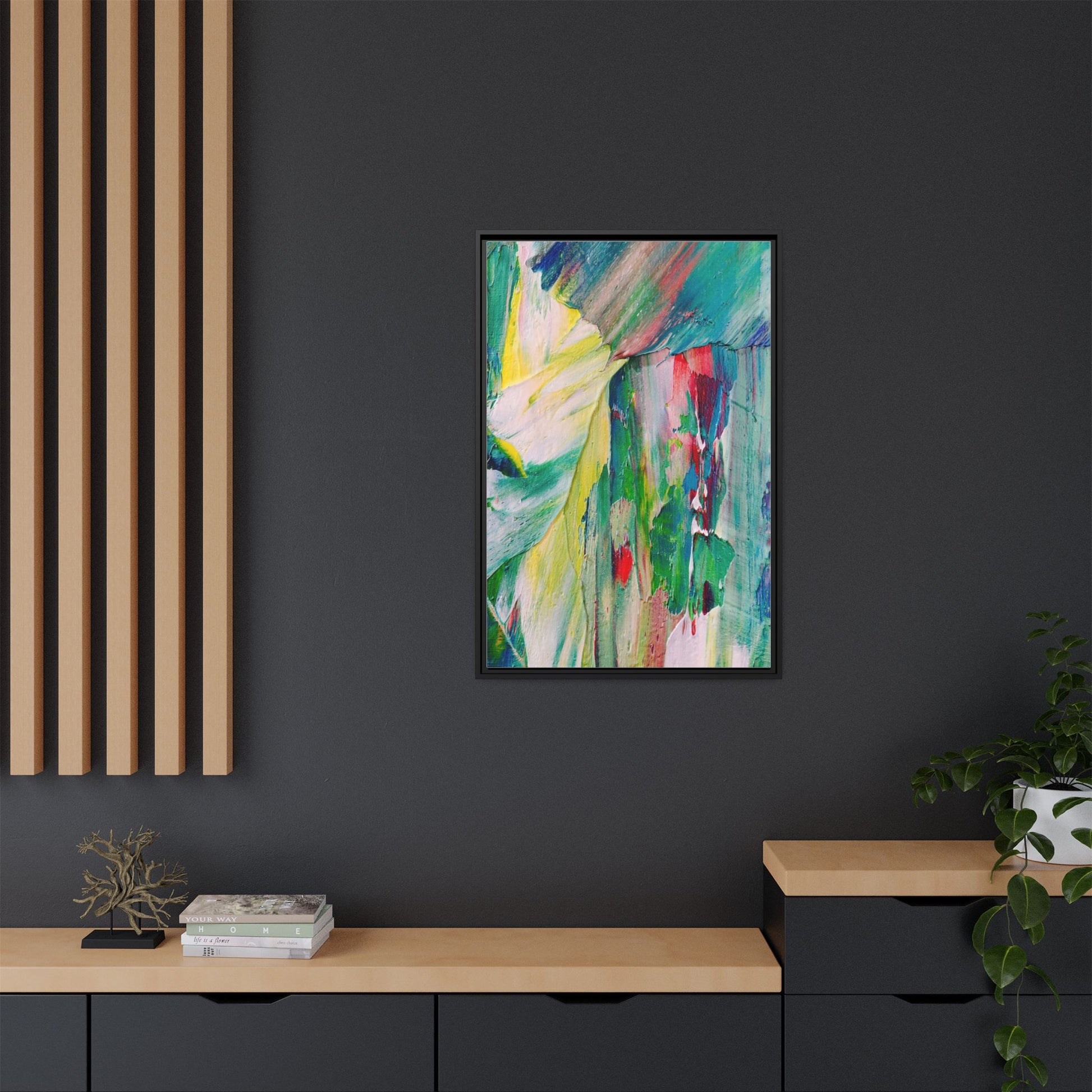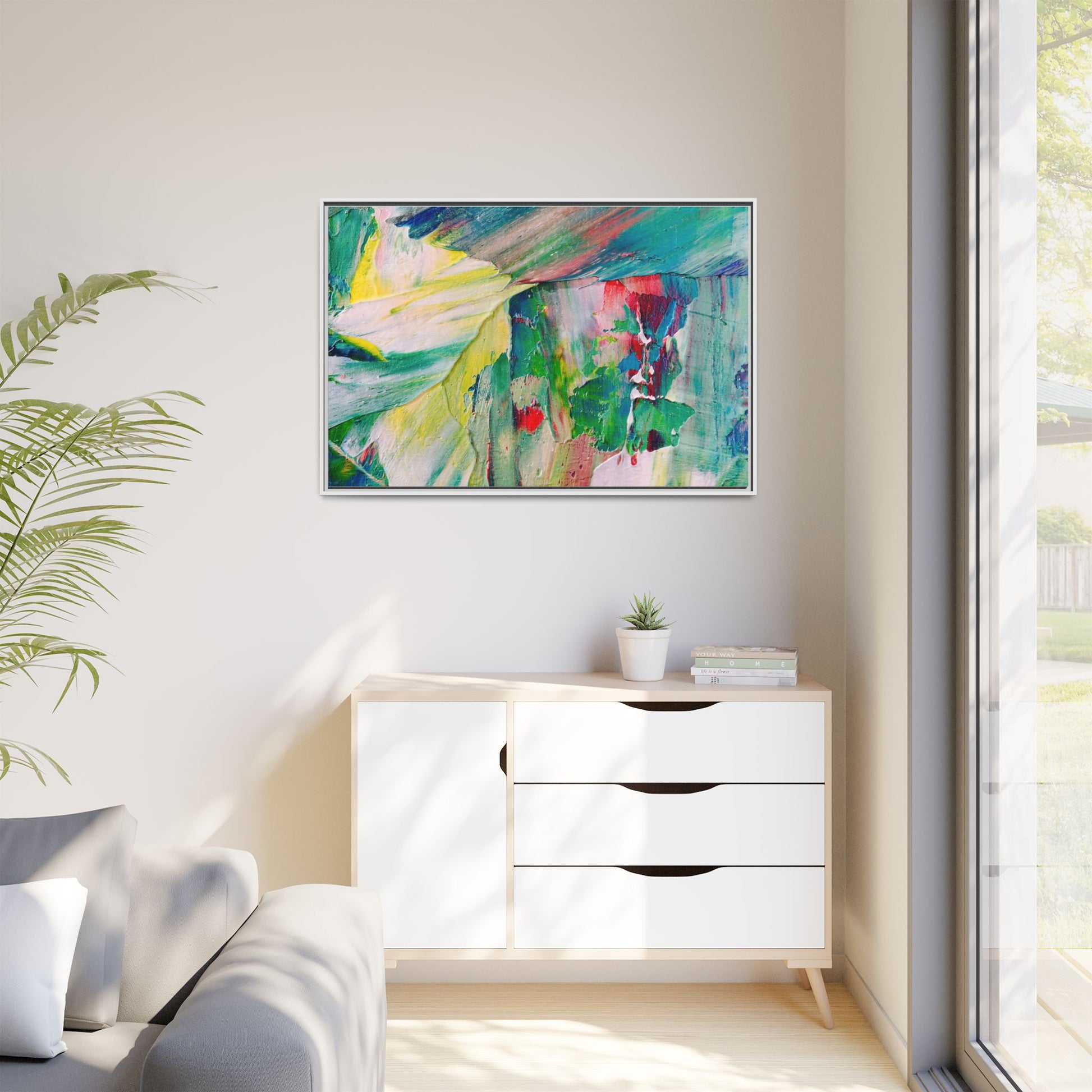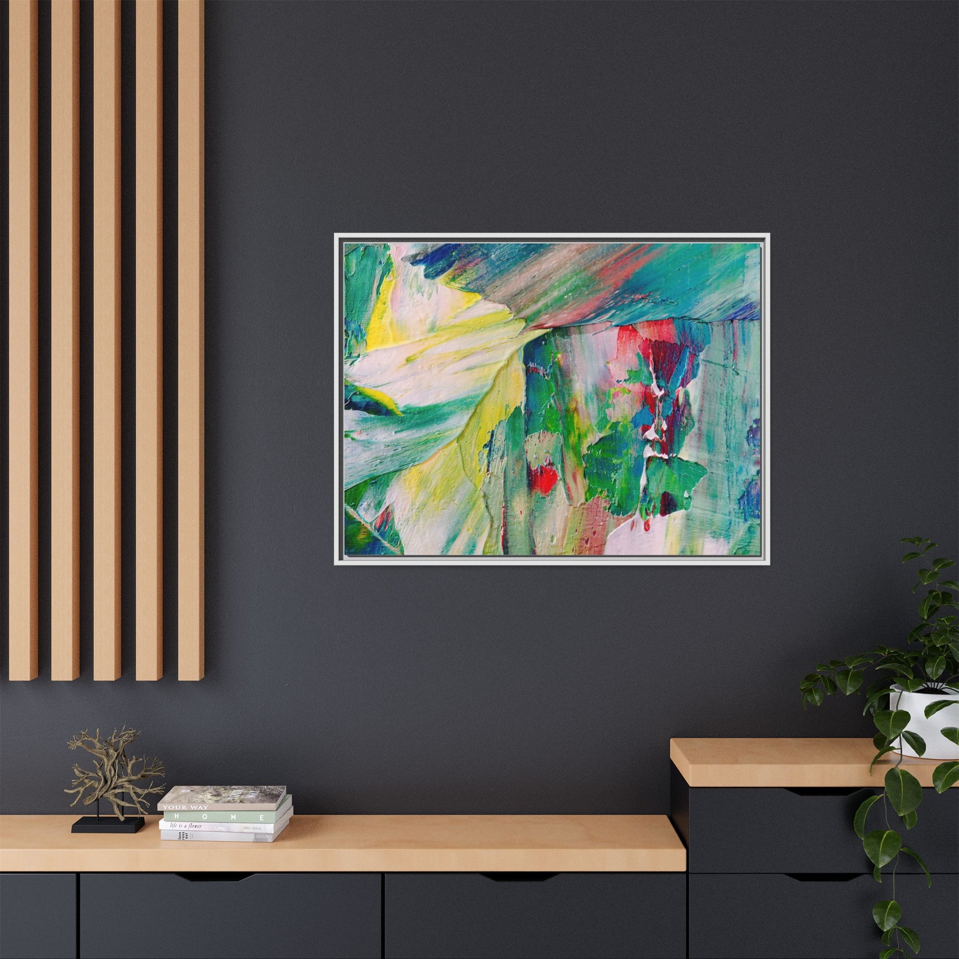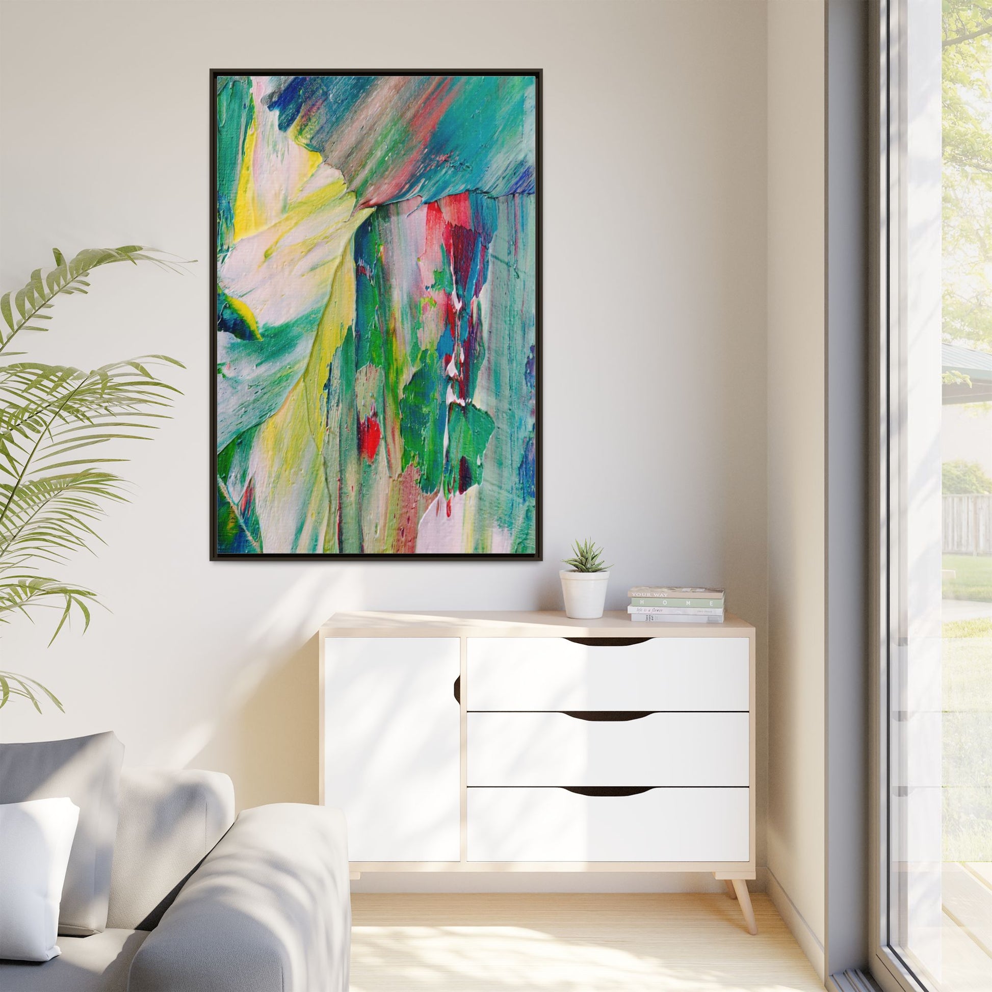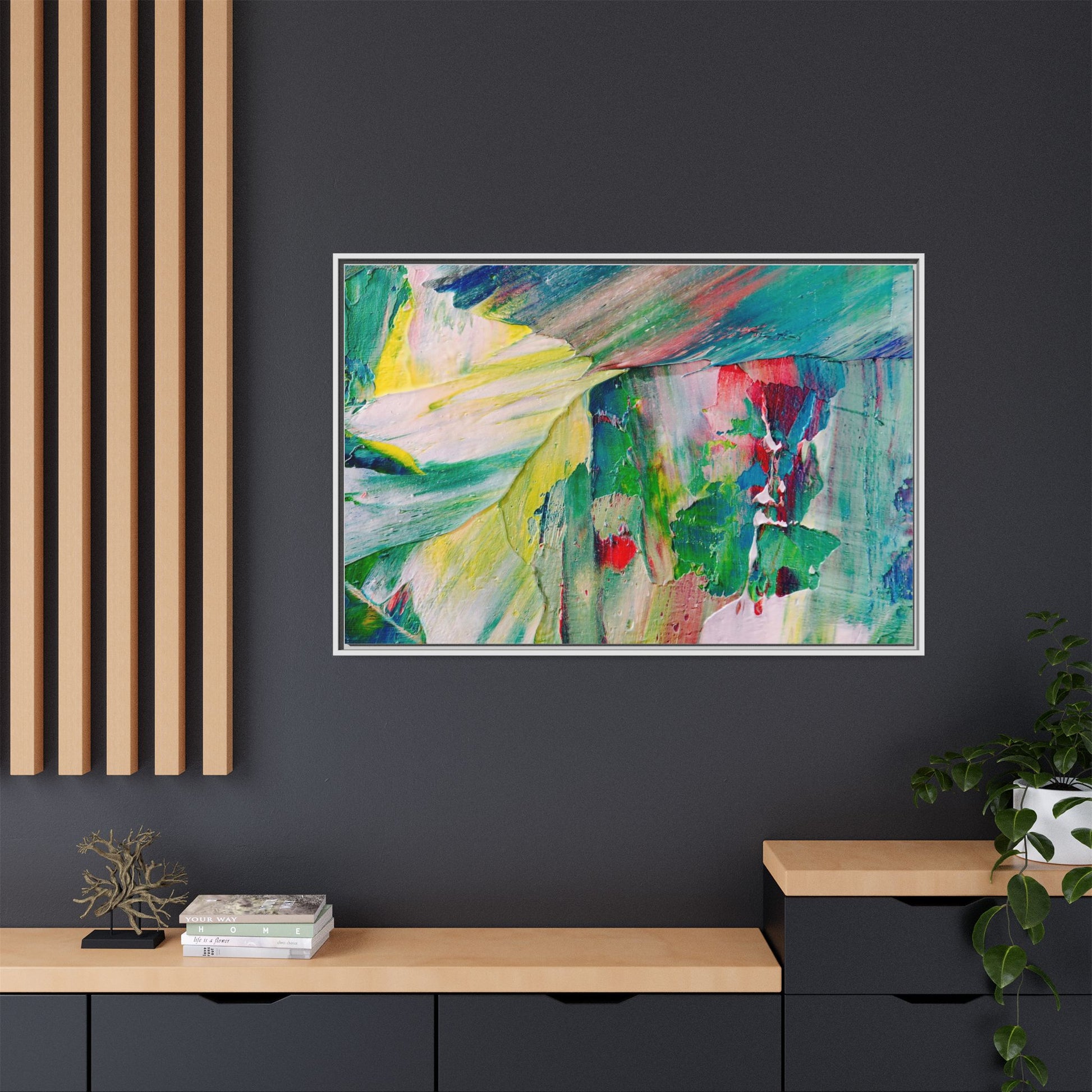 This vibrant abstract painting bursts with a dynamic array of colors, featuring sweeping brushstrokes and textured layers of paint. Soft yellows blend seamlessly with rich greens, deep blues, and passionate reds, creating a fluid and energetic composition. The artwork appears to be created using thick, expressive oil or acrylic paint, with visible texture and movement that suggests spontaneity and emotional depth. Diagonal and curved lines create a sense of motion, drawing the viewer's eye across the canvas and creating an immersive, almost landscape-like visual experience. The painting's abstract nature allows for multiple interpretations, with its bold color palette and gestural brushwork evoking a sense of natural movement and organic transformation.
