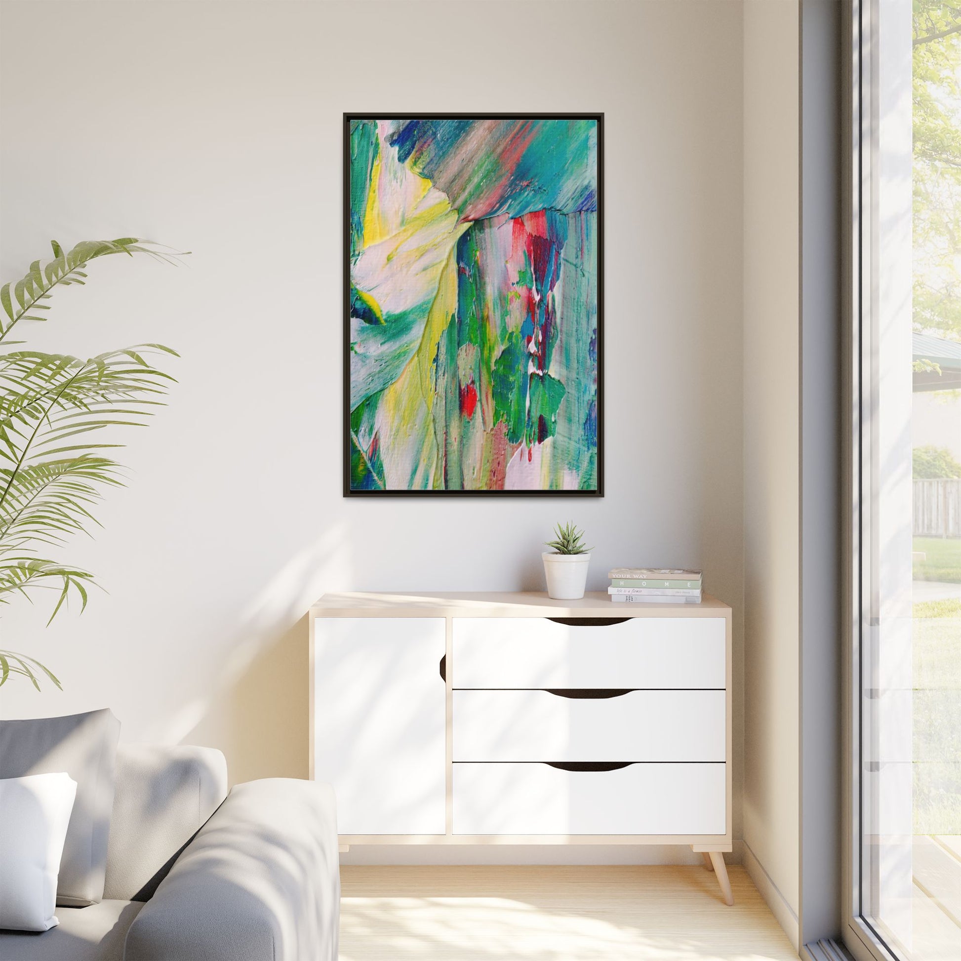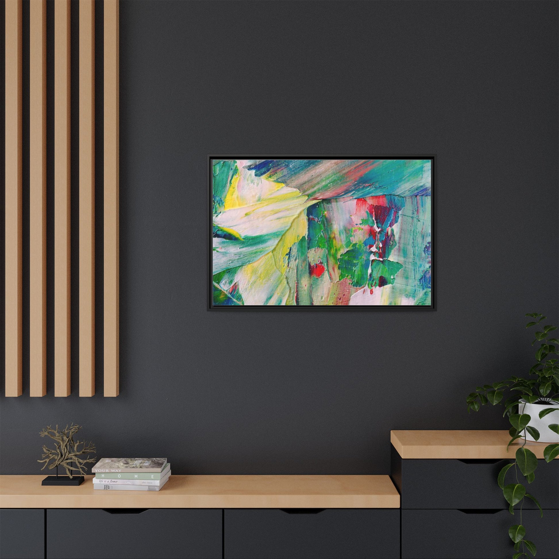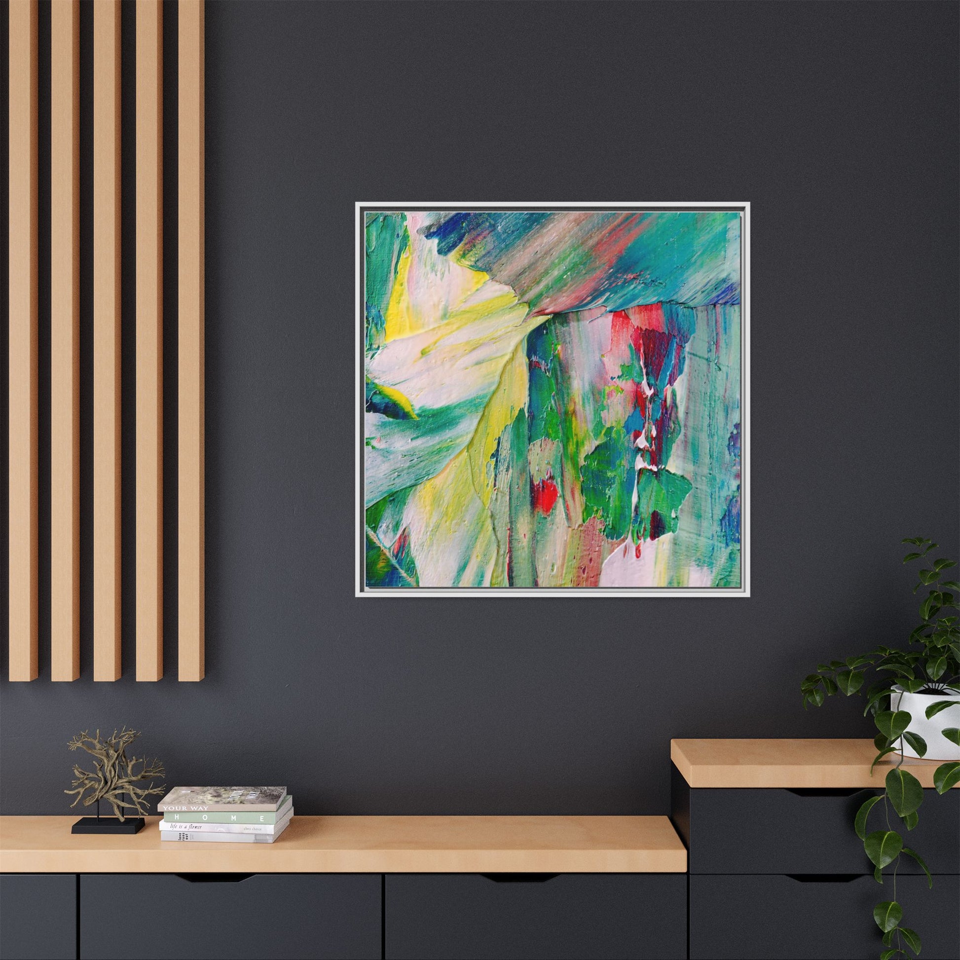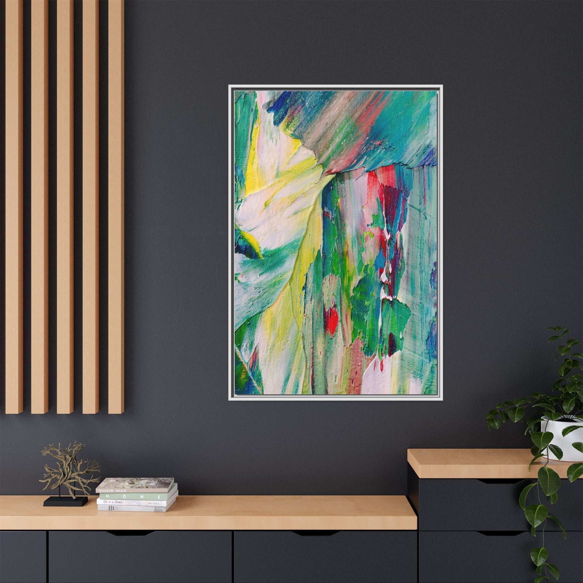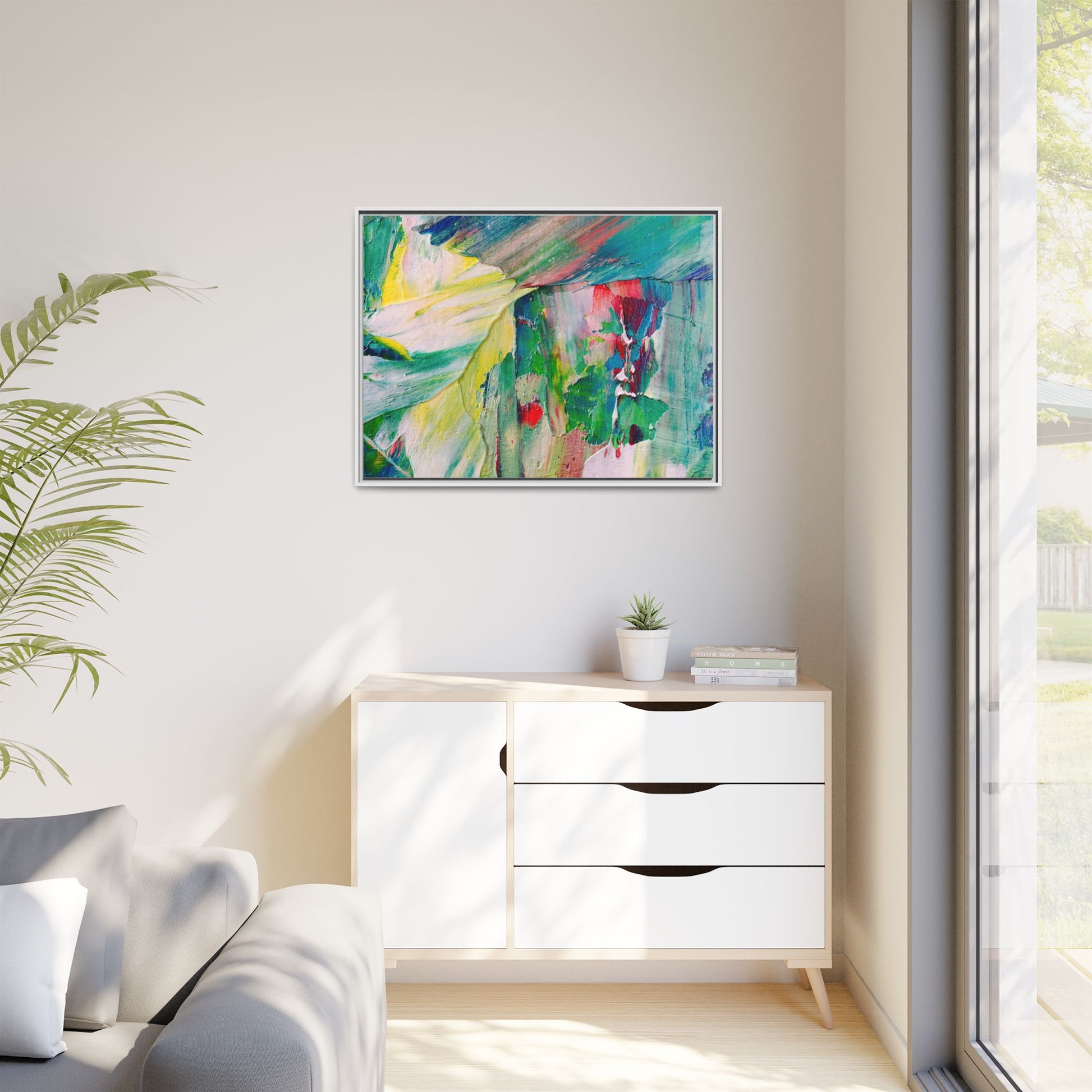 This vibrant abstract painting bursts with a dynamic array of colors, featuring sweeping brushstrokes and textured layers of paint. Soft yellows blend seamlessly with rich greens, deep blues, and passionate reds, creating a fluid and energetic composition. The artwork appears to be created using thick, expressive oil or acrylic paint, with visible texture and movement that suggests spontaneity and emotional depth. Diagonal and curved lines create a sense of motion, drawing the viewer's eye across the canvas and creating an immersive, almost landscape-like visual experience. The painting's abstract nature allows for multiple interpretations, with its bold color palette and gestural brushwork evoking a sense of natural movement and organic transformation.