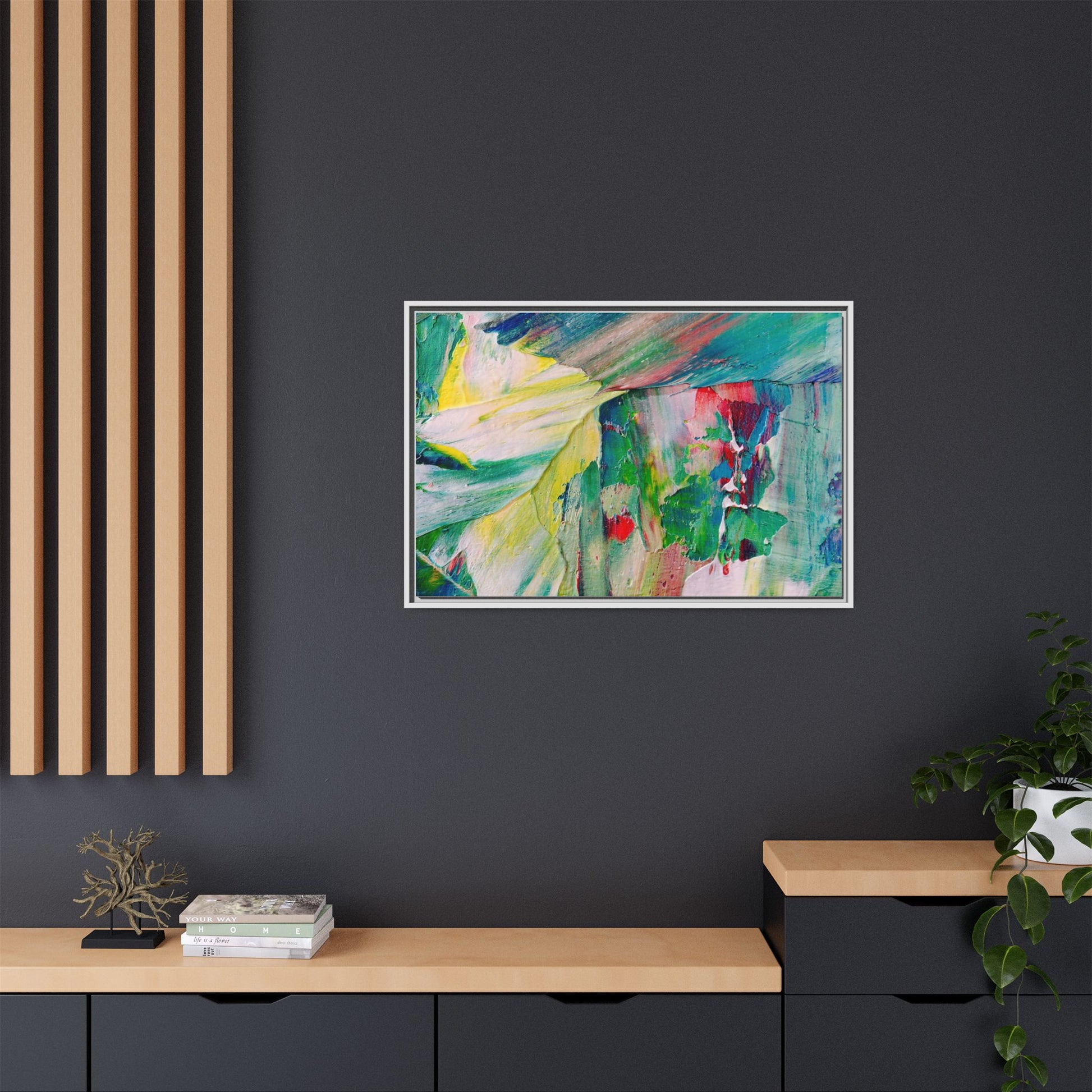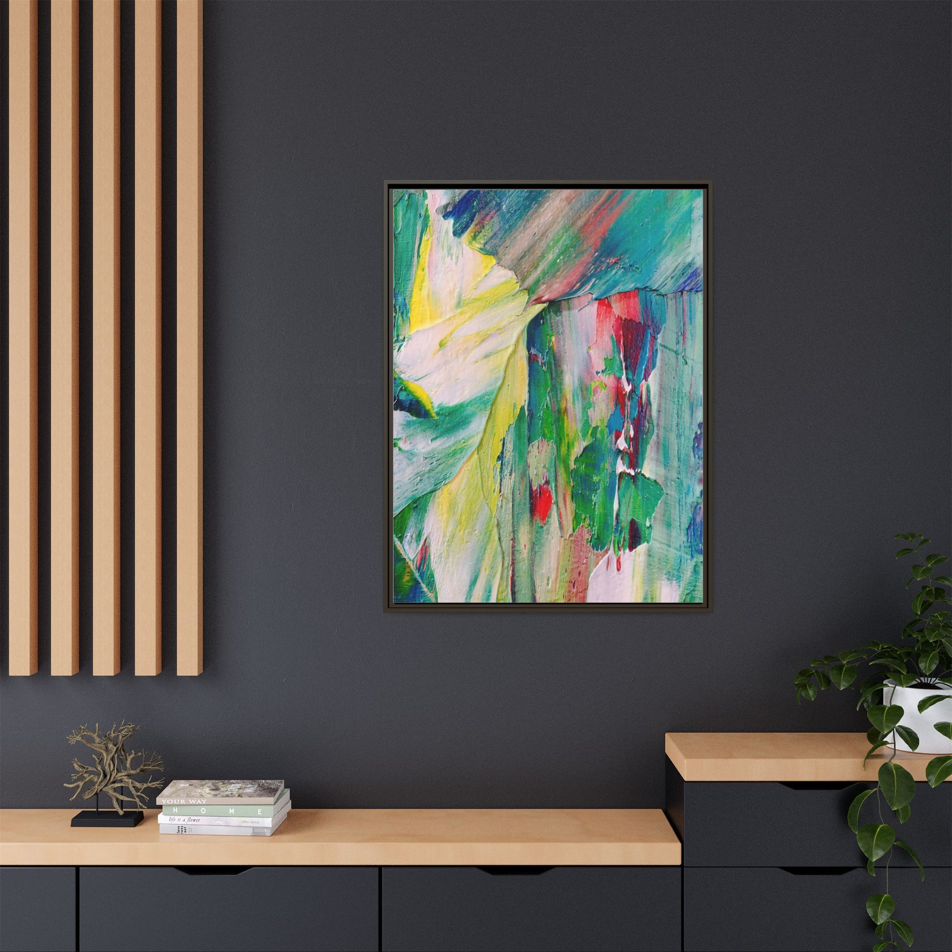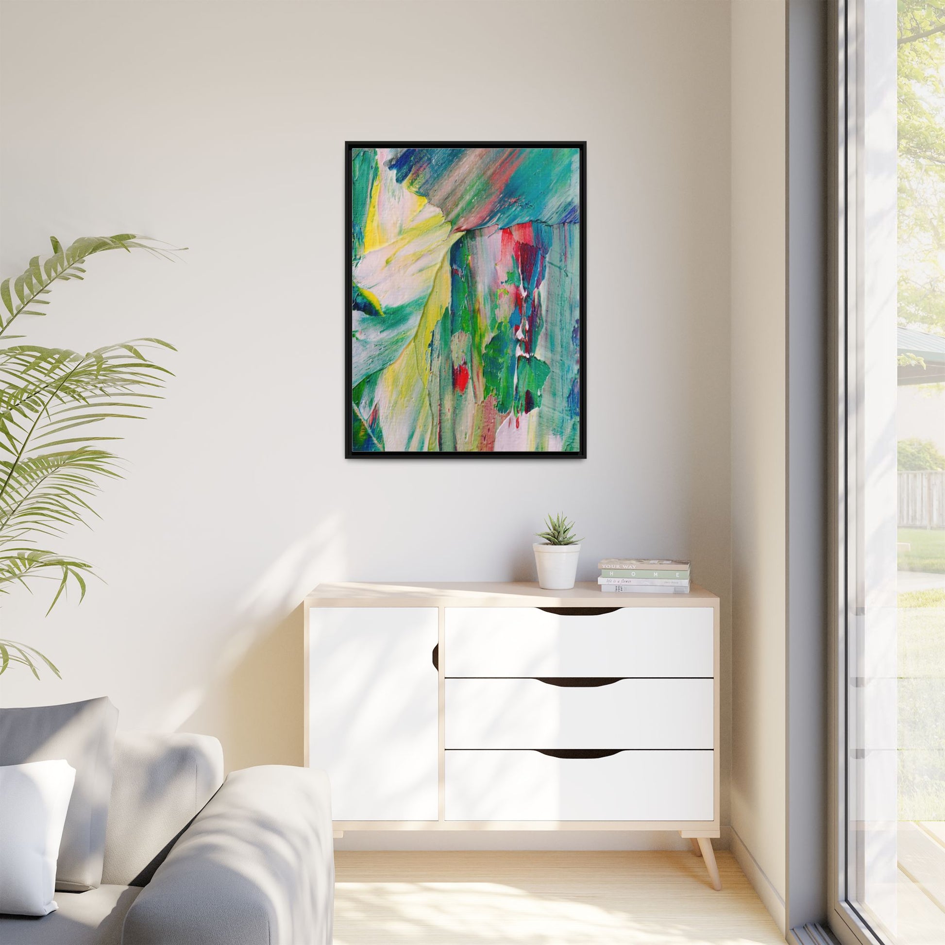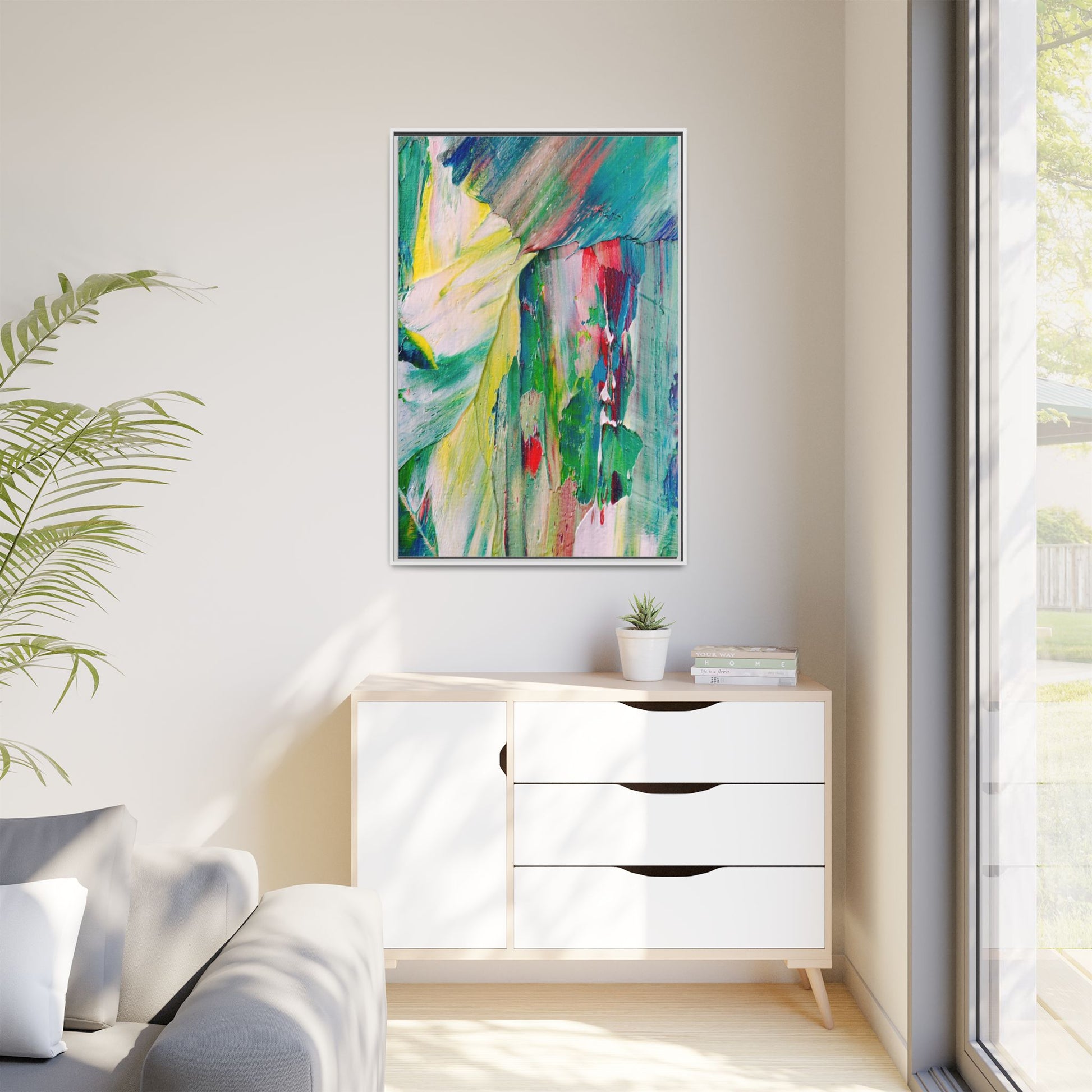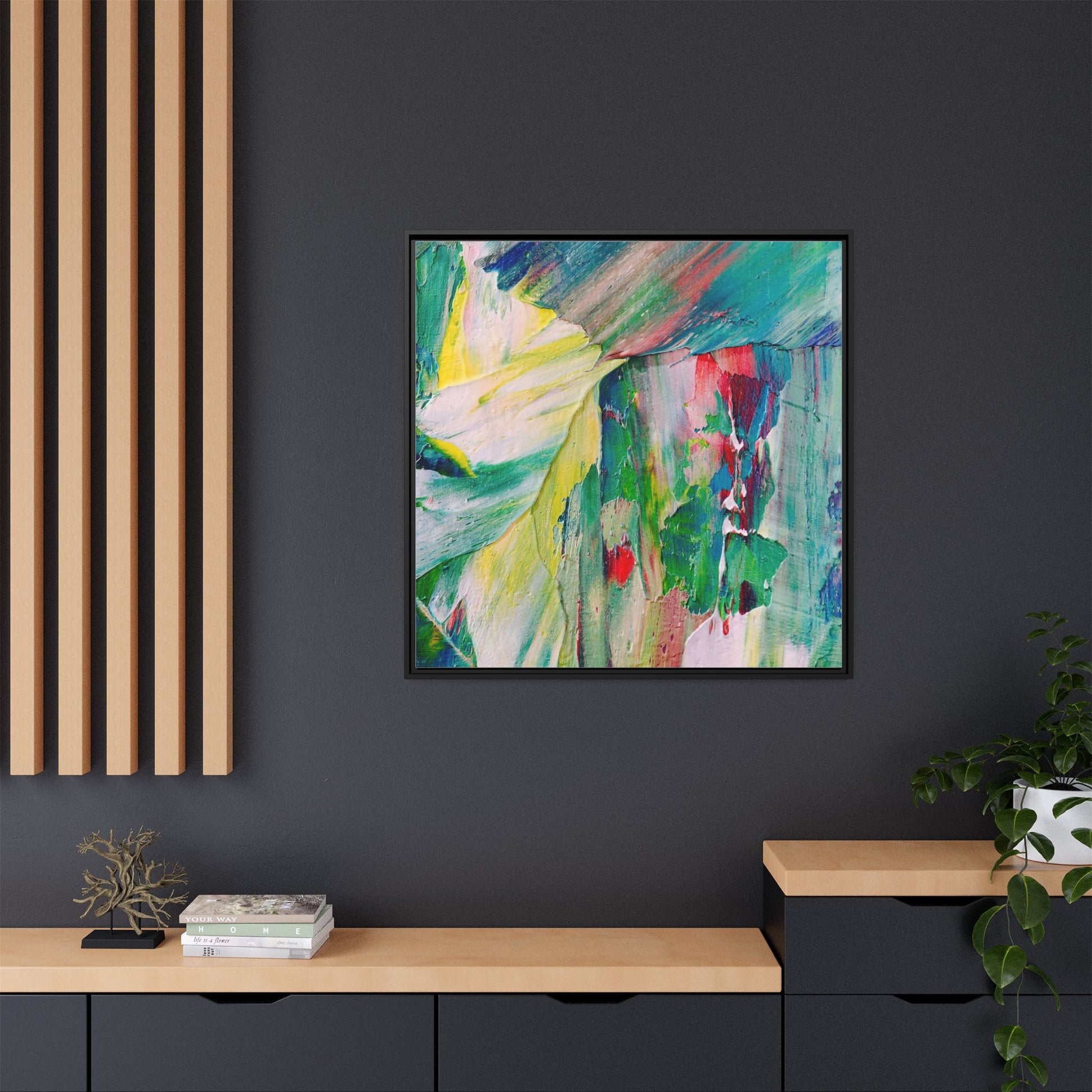 This vibrant abstract painting bursts with a dynamic array of colors, featuring sweeping brushstrokes and textured layers of paint. Soft yellows blend seamlessly with rich greens, deep blues, and passionate reds, creating a fluid and energetic composition. The artwork appears to be created using thick, expressive oil or acrylic paint, with visible texture and movement that suggests spontaneity and emotional depth. Diagonal and curved lines create a sense of motion, drawing the viewer's eye across the canvas and creating an immersive, almost landscape-like visual experience. The painting's abstract nature allows for multiple interpretations, with its bold color palette and gestural brushwork evoking a sense of natural movement and organic transformation.
