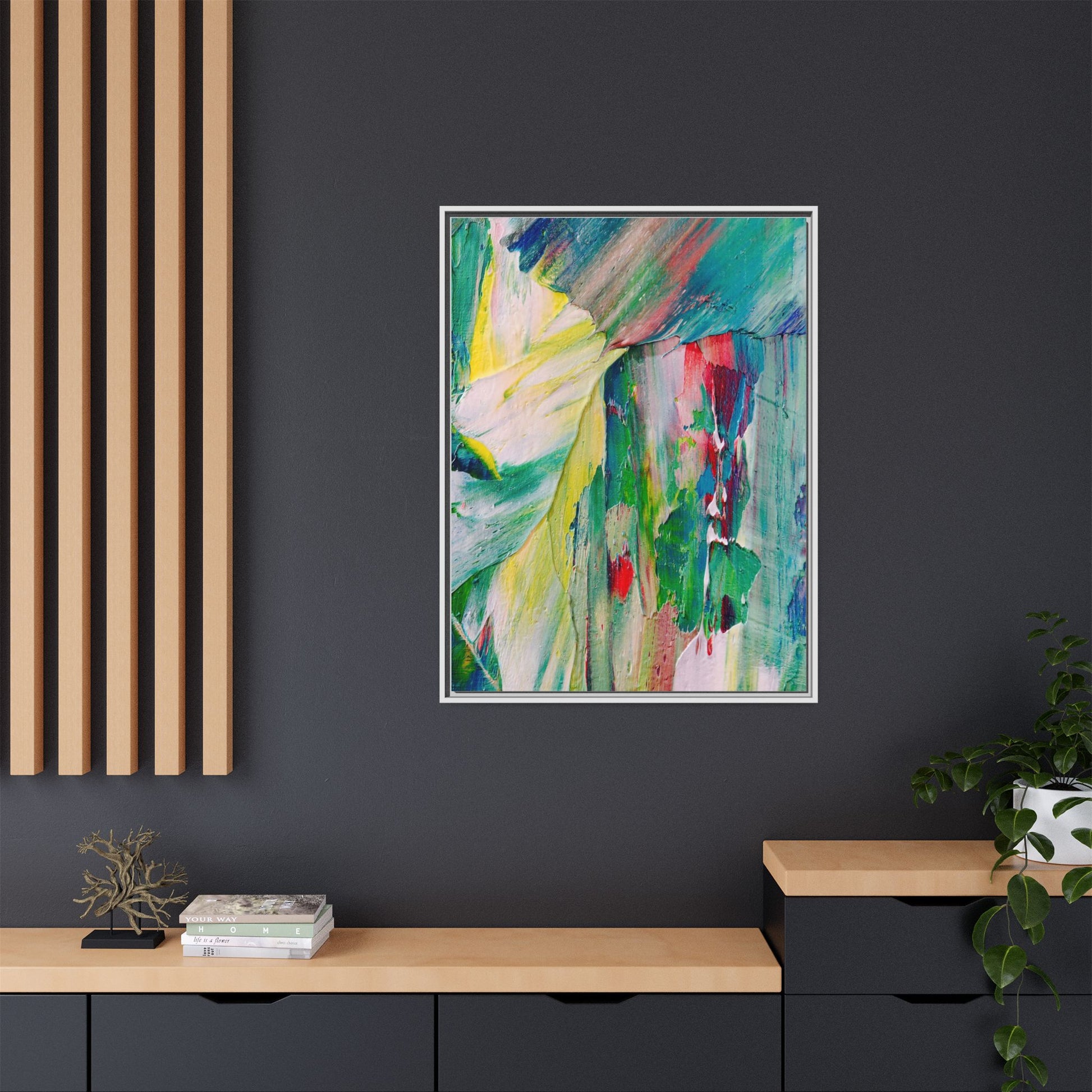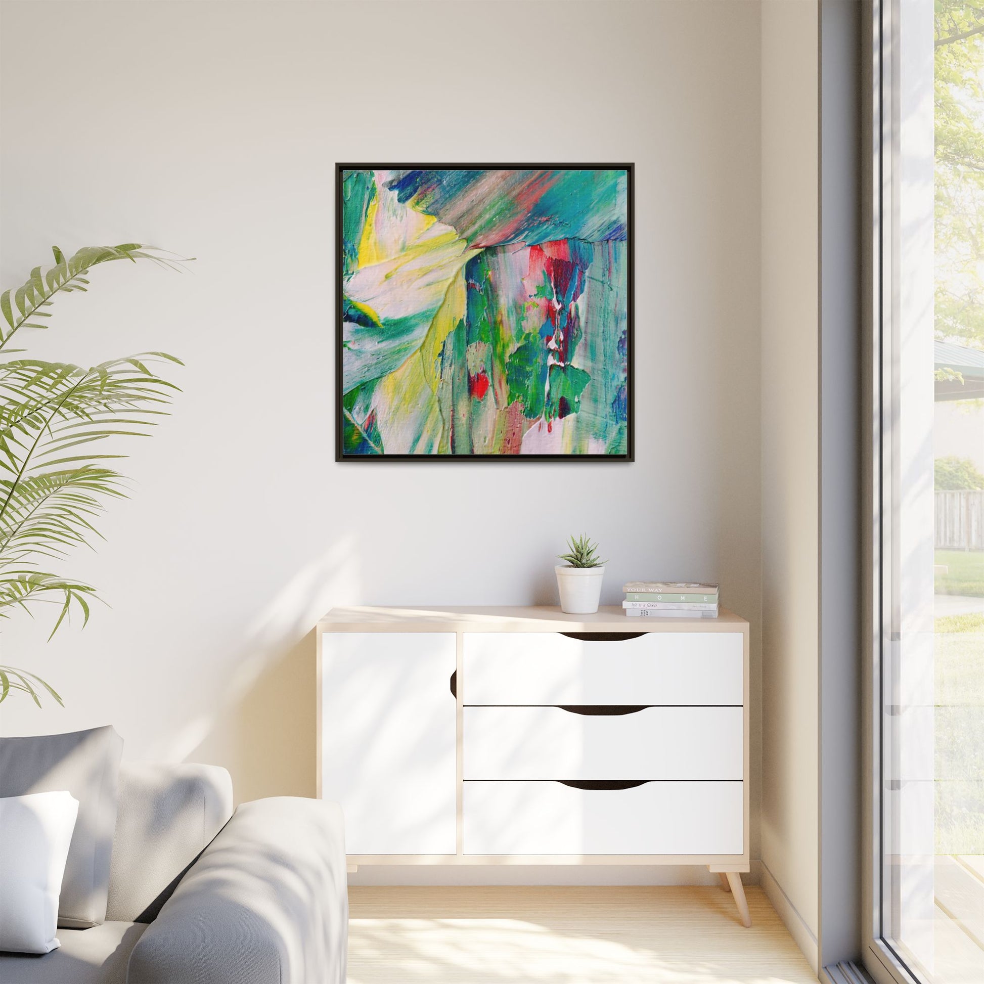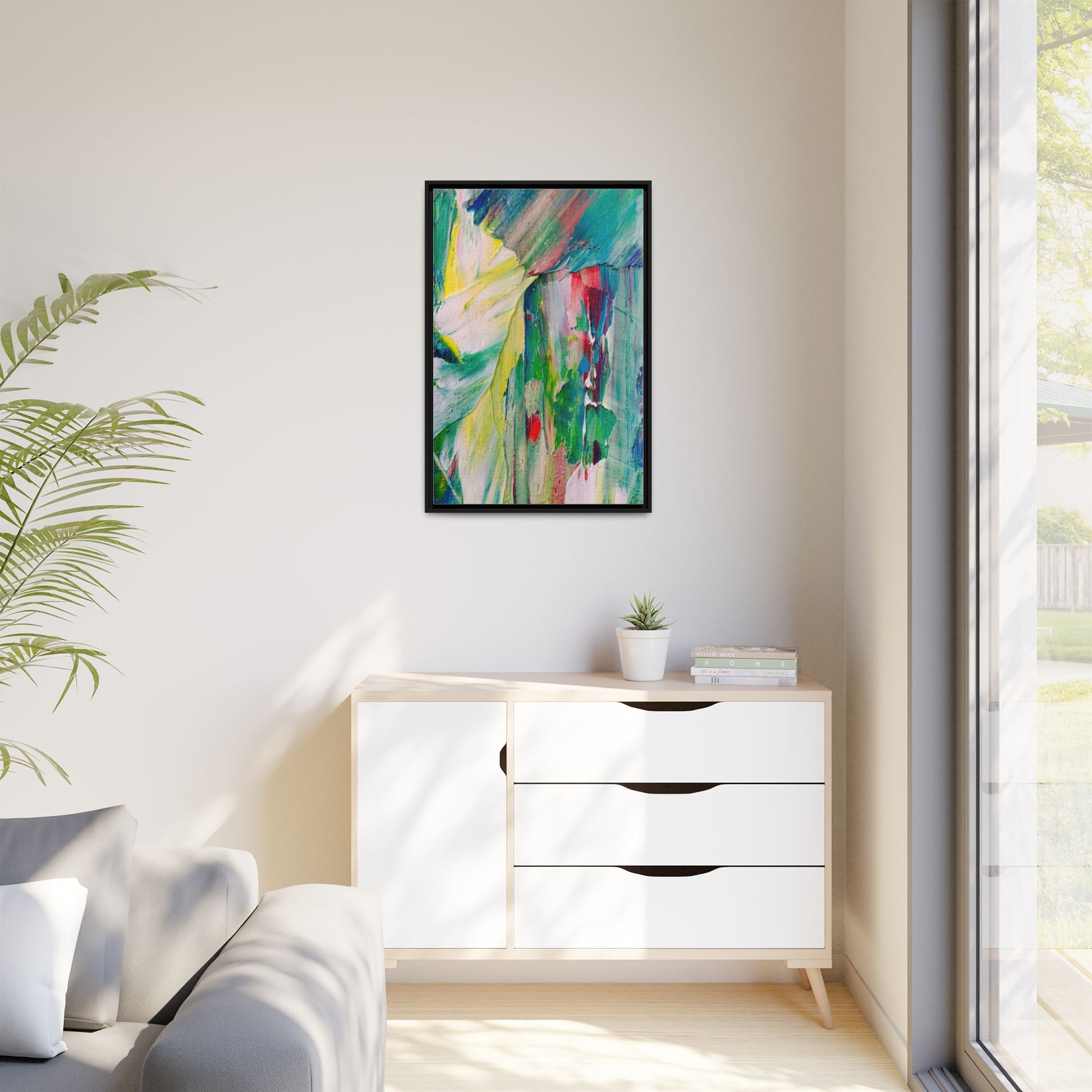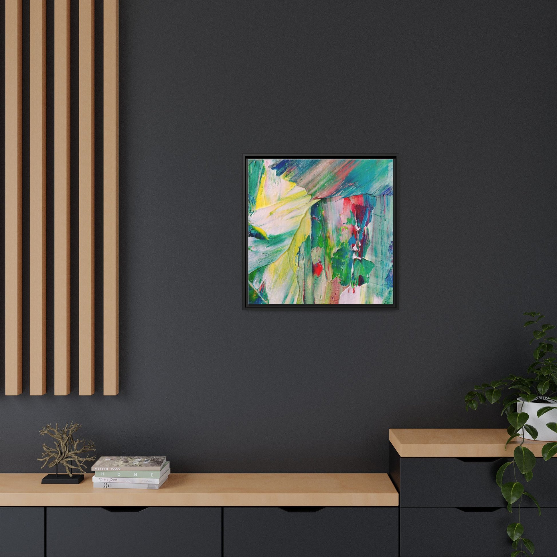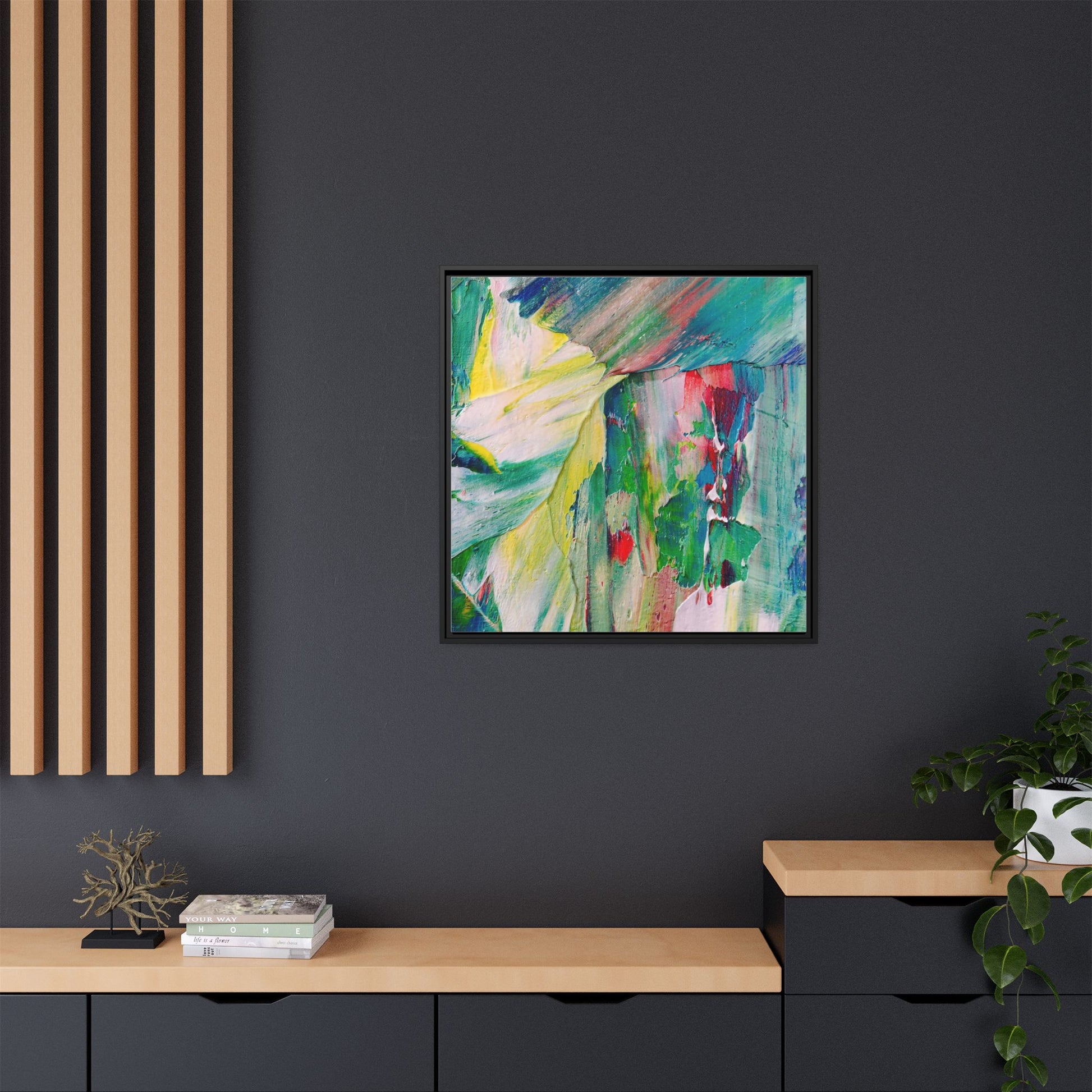 This vibrant abstract painting bursts with a dynamic array of colors, featuring sweeping brushstrokes and textured layers of paint. Soft yellows blend seamlessly with rich greens, deep blues, and passionate reds, creating a fluid and energetic composition. The artwork appears to be created using thick, expressive oil or acrylic paint, with visible texture and movement that suggests spontaneity and emotional depth. Diagonal and curved lines create a sense of motion, drawing the viewer's eye across the canvas and creating an immersive, almost landscape-like visual experience. The painting's abstract nature allows for multiple interpretations, with its bold color palette and gestural brushwork evoking a sense of natural movement and organic transformation.