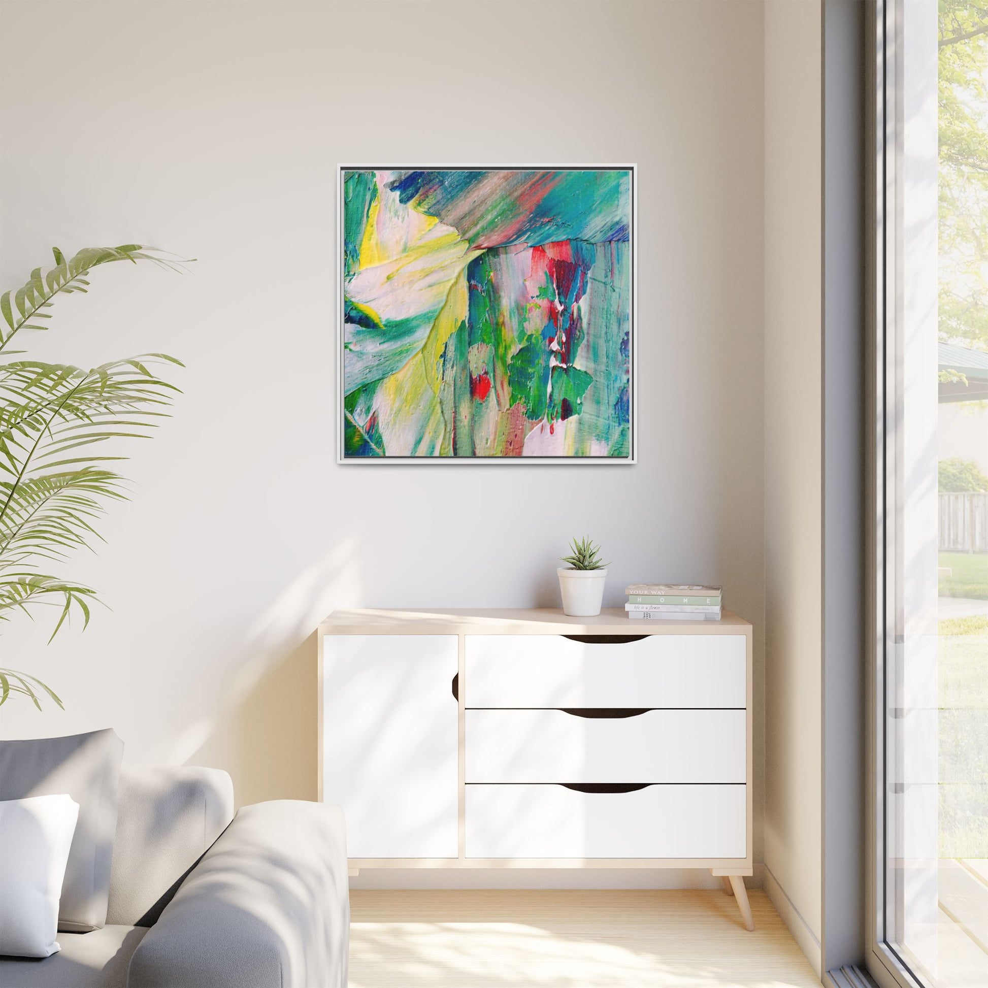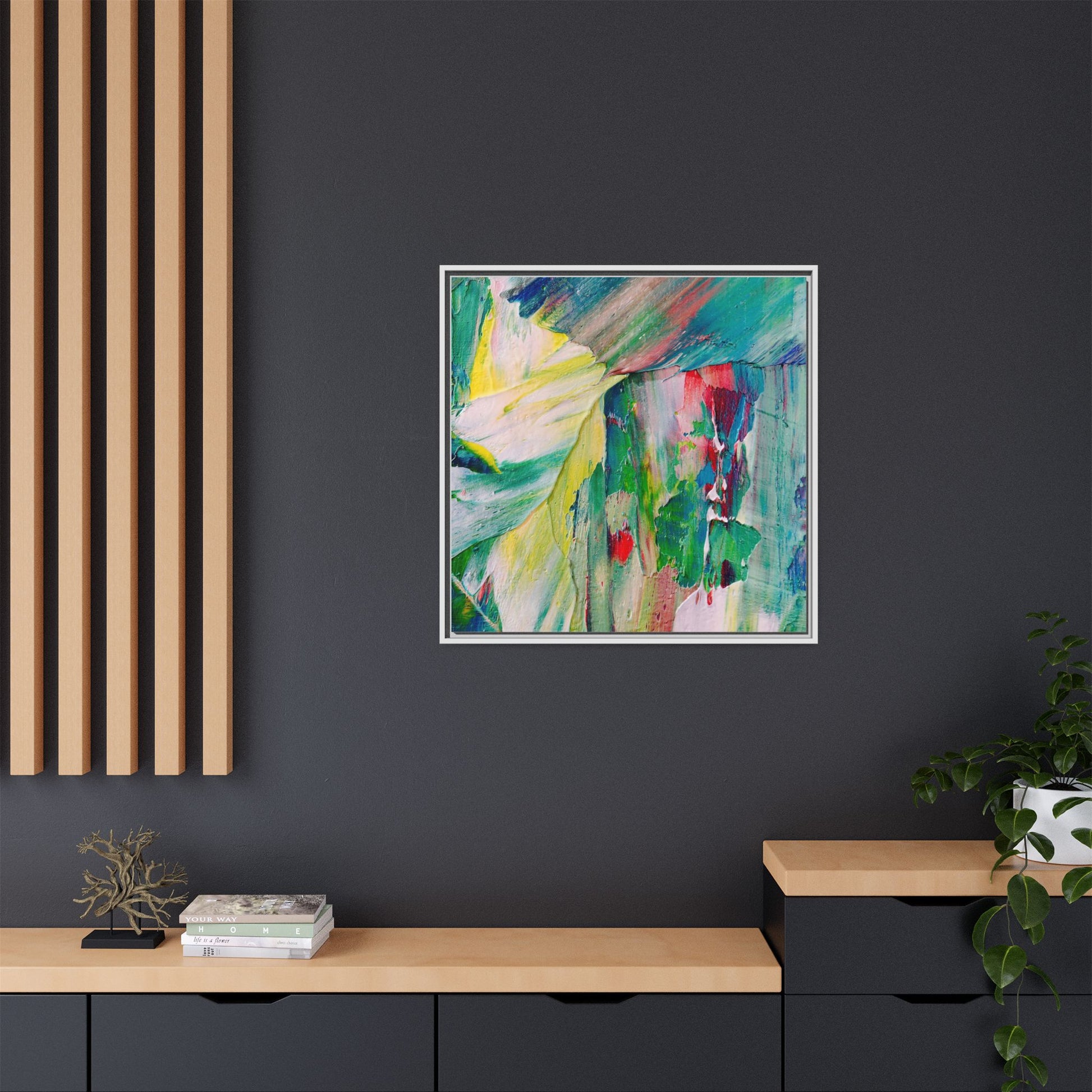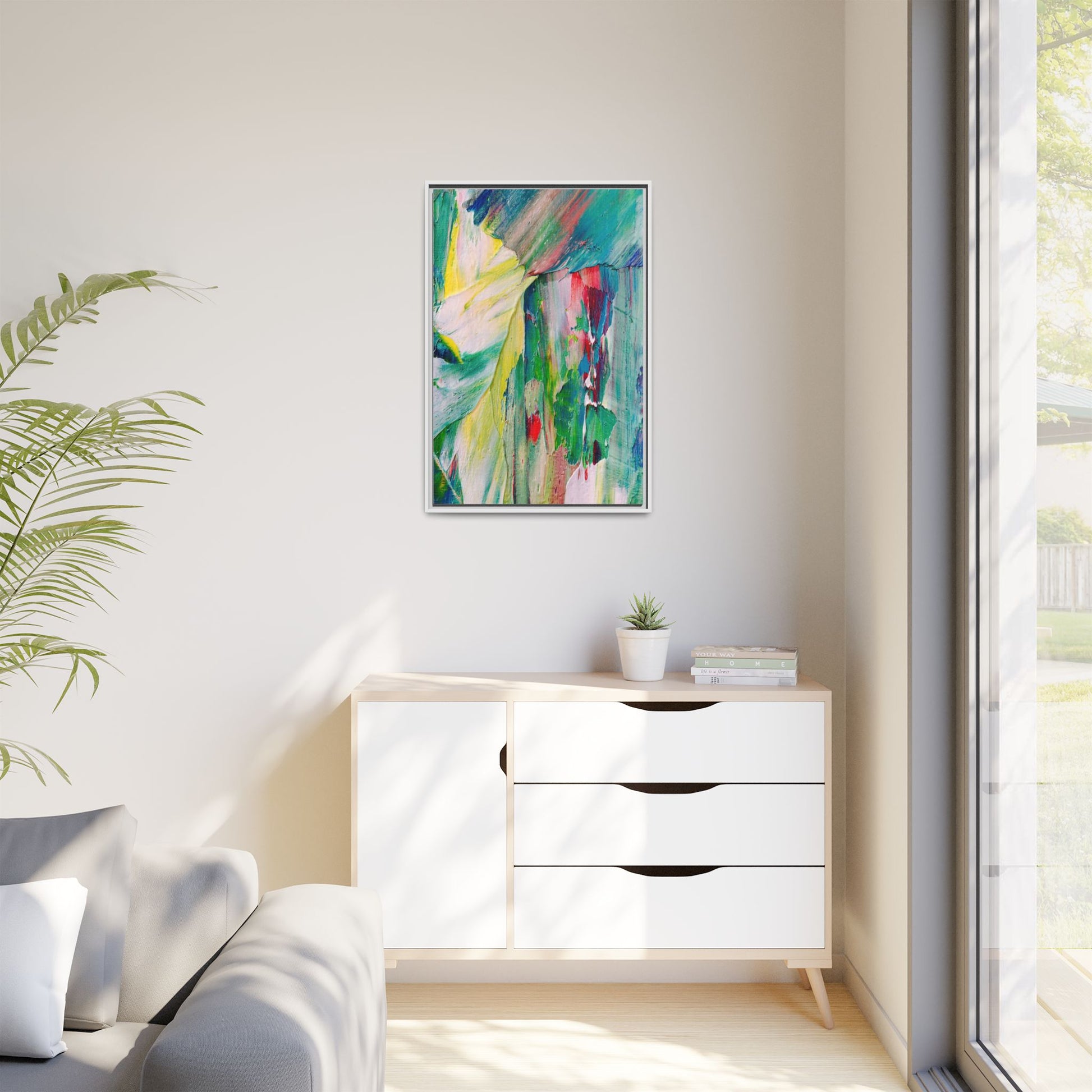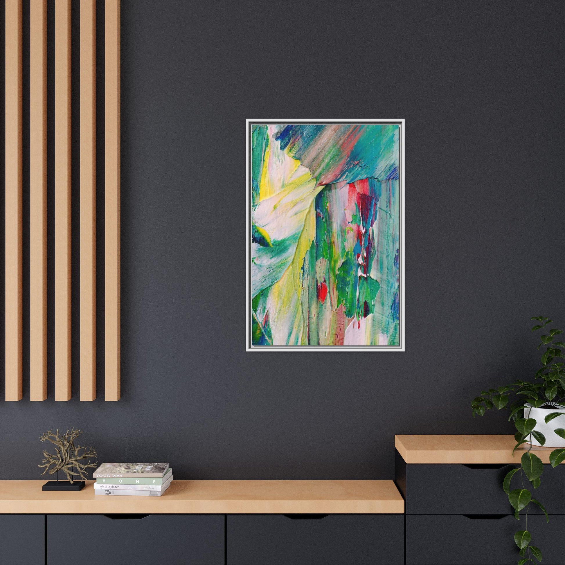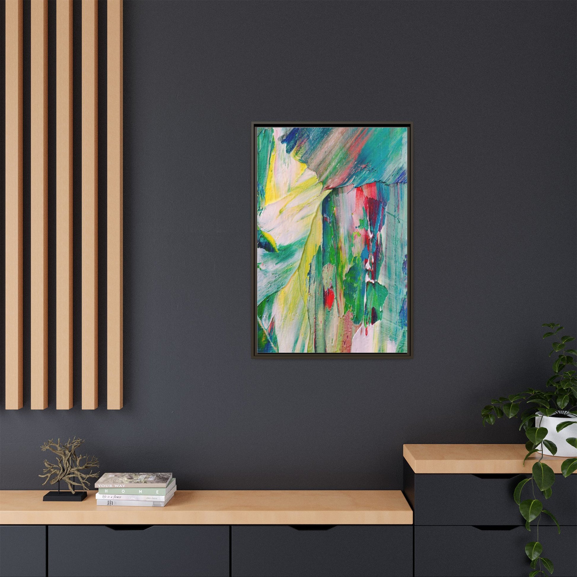This vibrant abstract painting bursts with a dynamic array of colors, featuring sweeping brushstrokes and textured layers of paint. Soft yellows blend seamlessly with rich greens, deep blues, and passionate reds, creating a fluid and energetic composition. The artwork appears to be created using thick, expressive oil or acrylic paint, with visible texture and movement that suggests spontaneity and emotional depth. Diagonal and curved lines create a sense of motion, drawing the viewer's eye across the canvas and creating an immersive, almost landscape-like visual experience. The painting's abstract nature allows for multiple interpretations, with its bold color palette and gestural brushwork evoking a sense of natural movement and organic transformation.