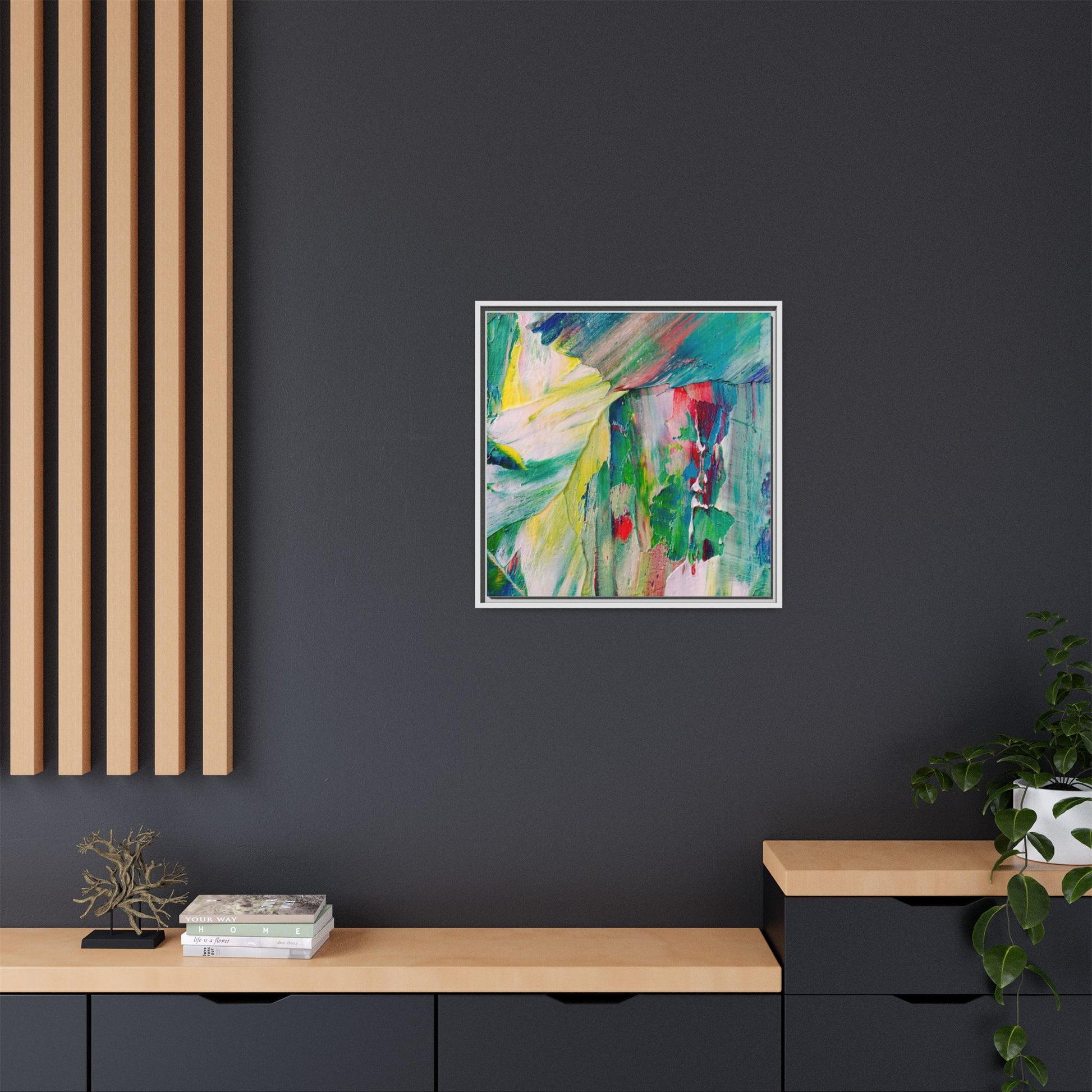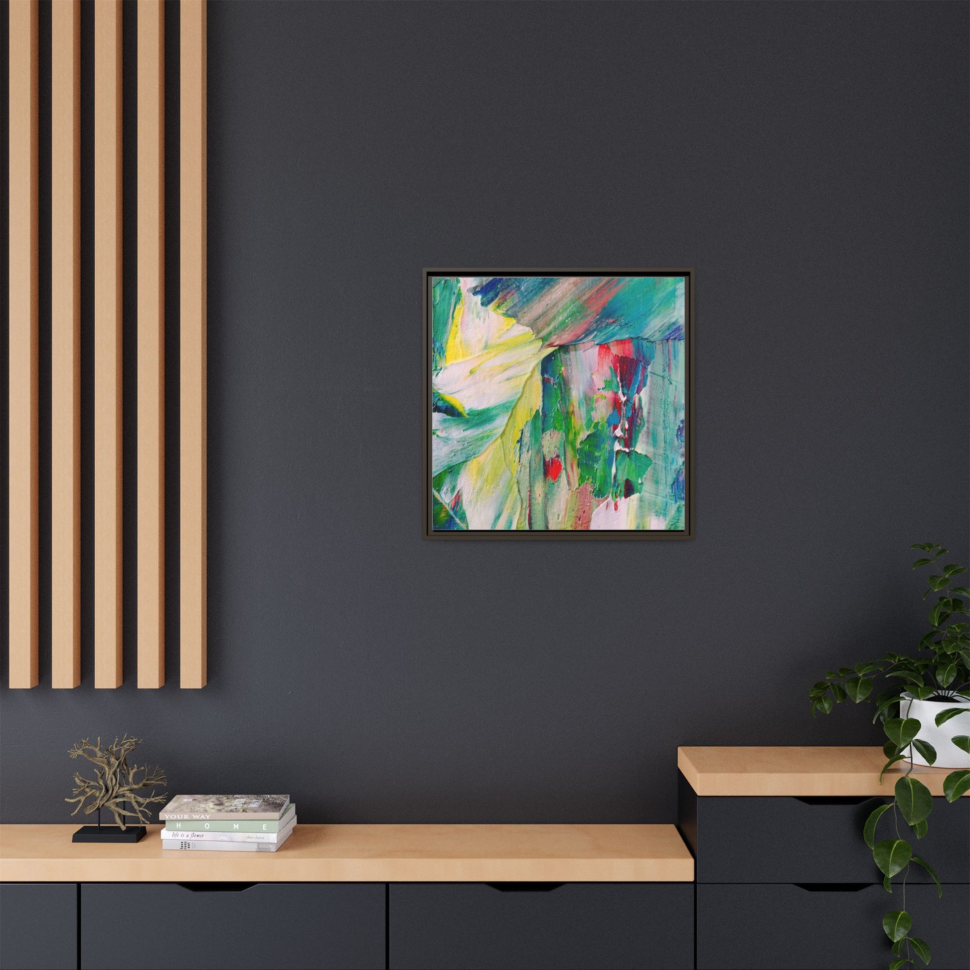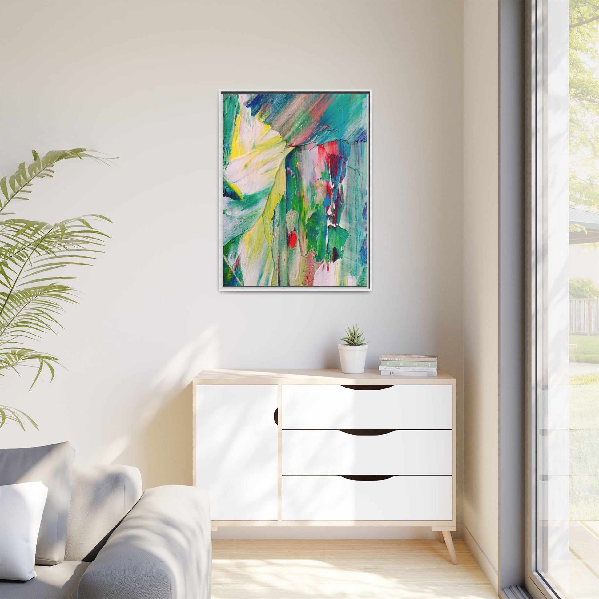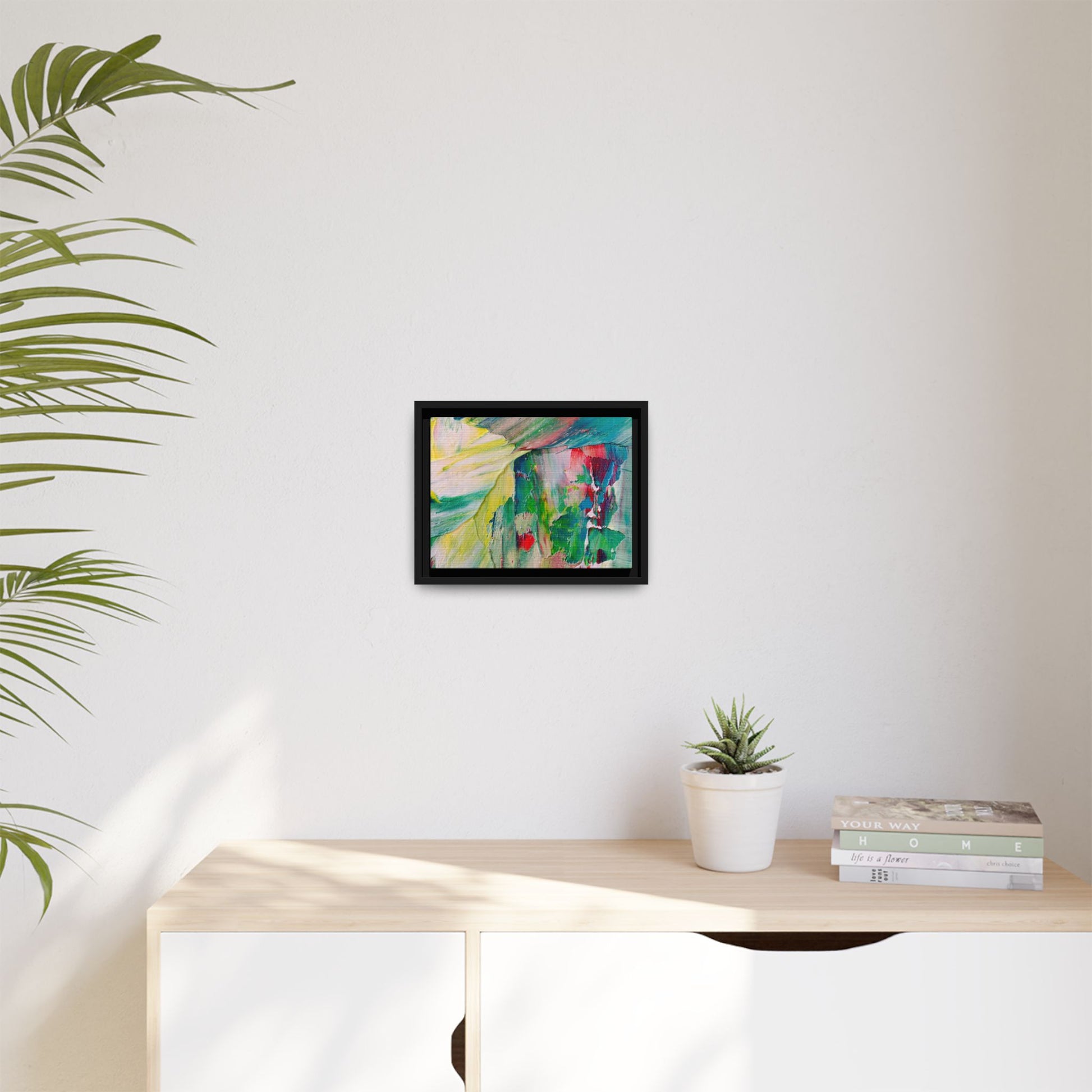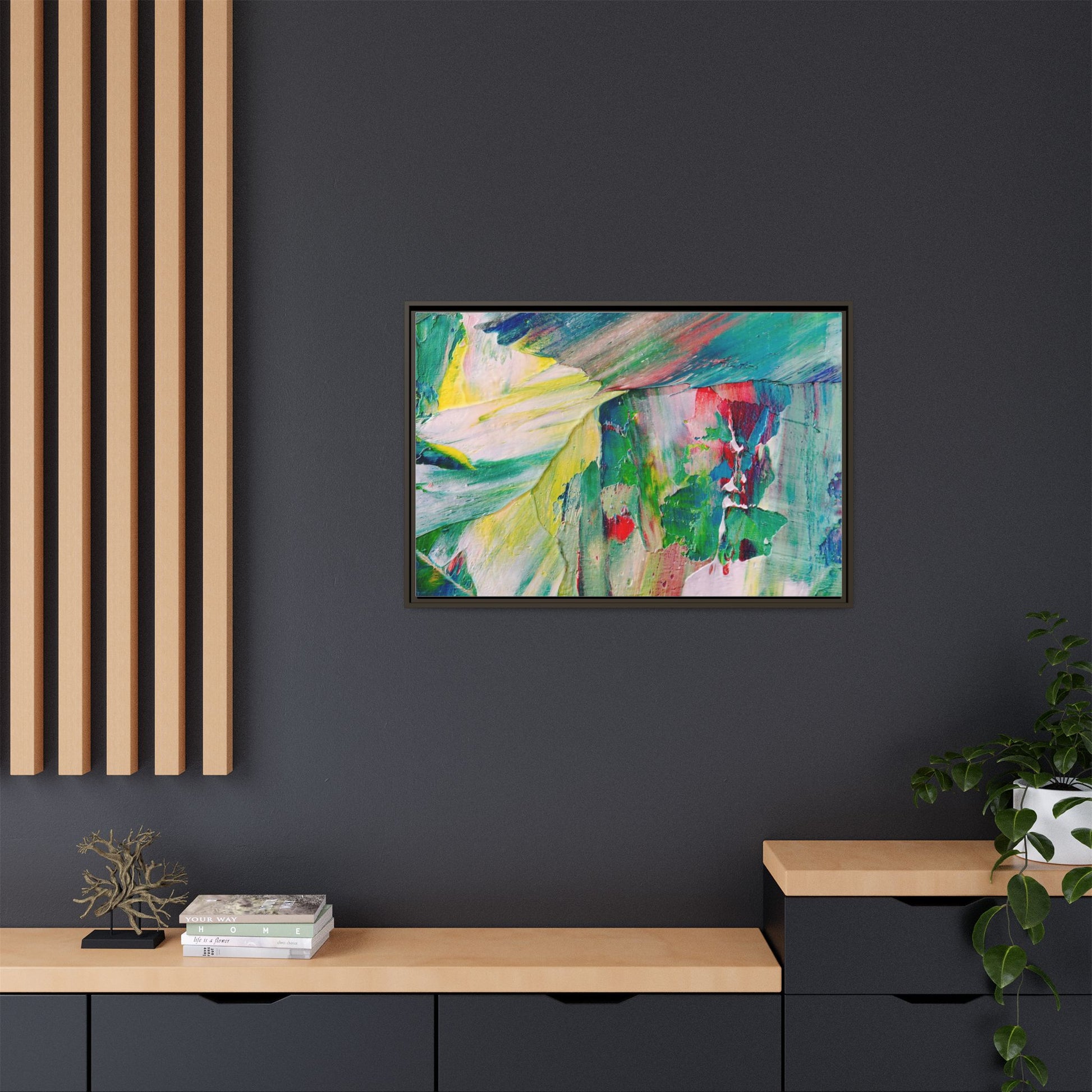This vibrant abstract painting bursts with a dynamic array of colors, featuring sweeping brushstrokes and textured layers of paint. Soft yellows blend seamlessly with rich greens, deep blues, and passionate reds, creating a fluid and energetic composition. The artwork appears to be created using thick, expressive oil or acrylic paint, with visible texture and movement that suggests spontaneity and emotional depth. Diagonal and curved lines create a sense of motion, drawing the viewer's eye across the canvas and creating an immersive, almost landscape-like visual experience. The painting's abstract nature allows for multiple interpretations, with its bold color palette and gestural brushwork evoking a sense of natural movement and organic transformation.