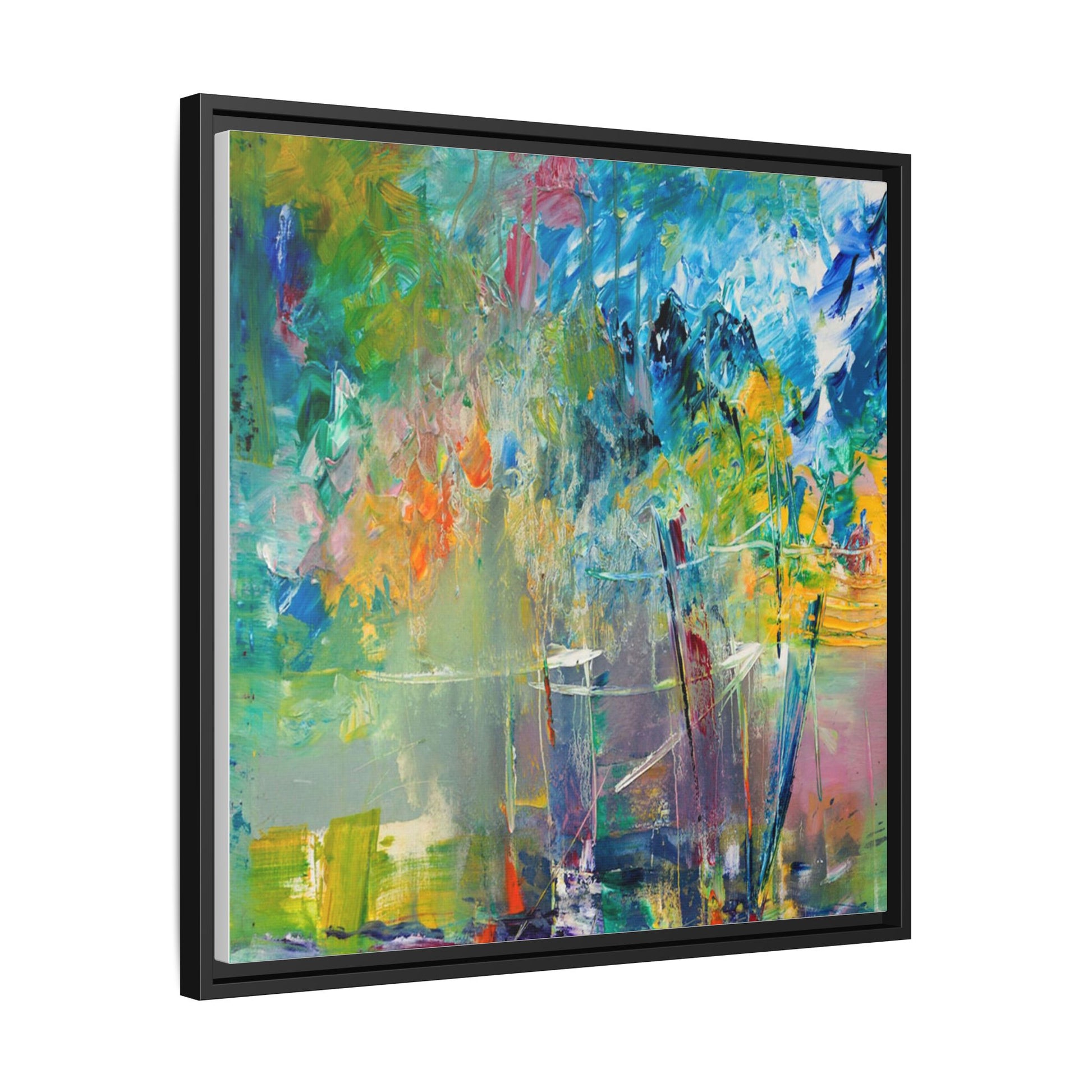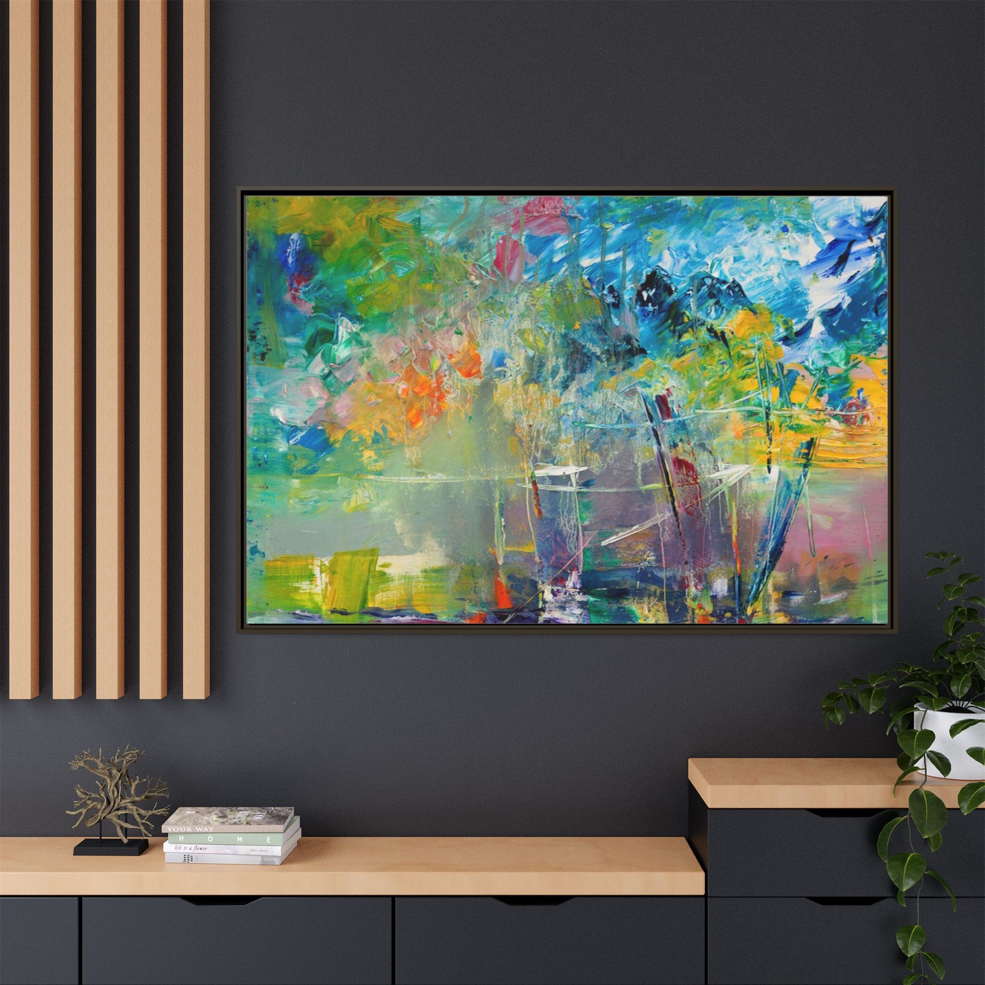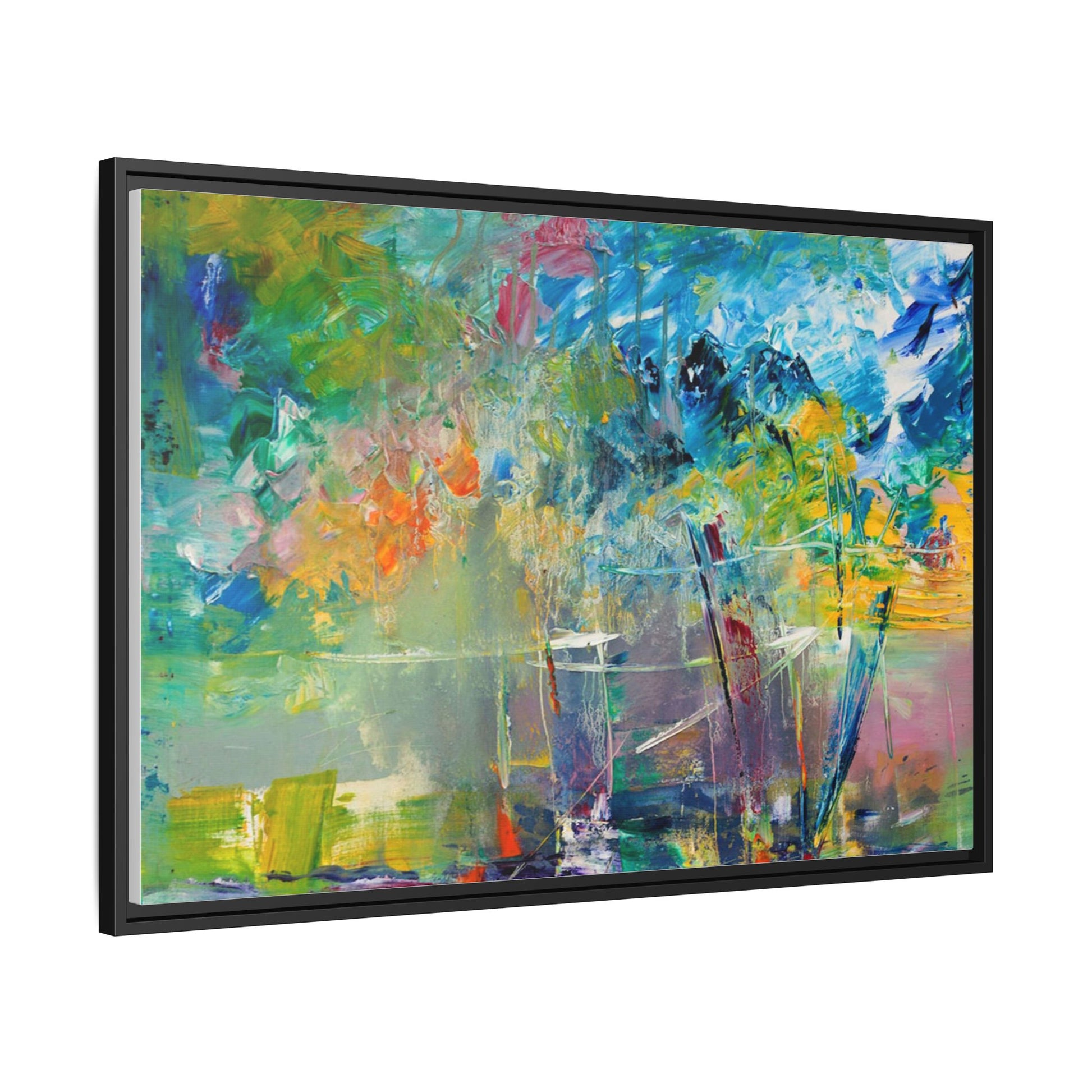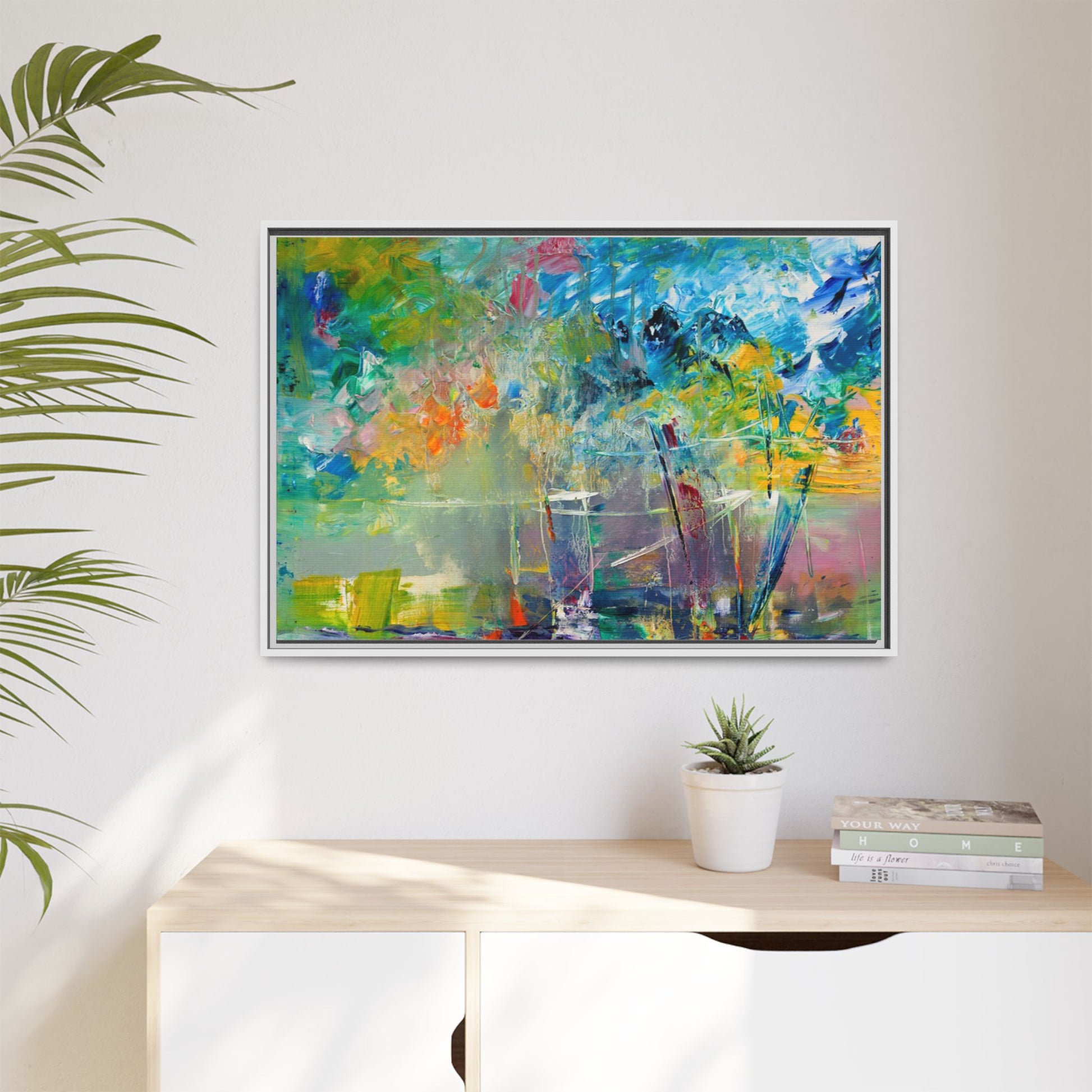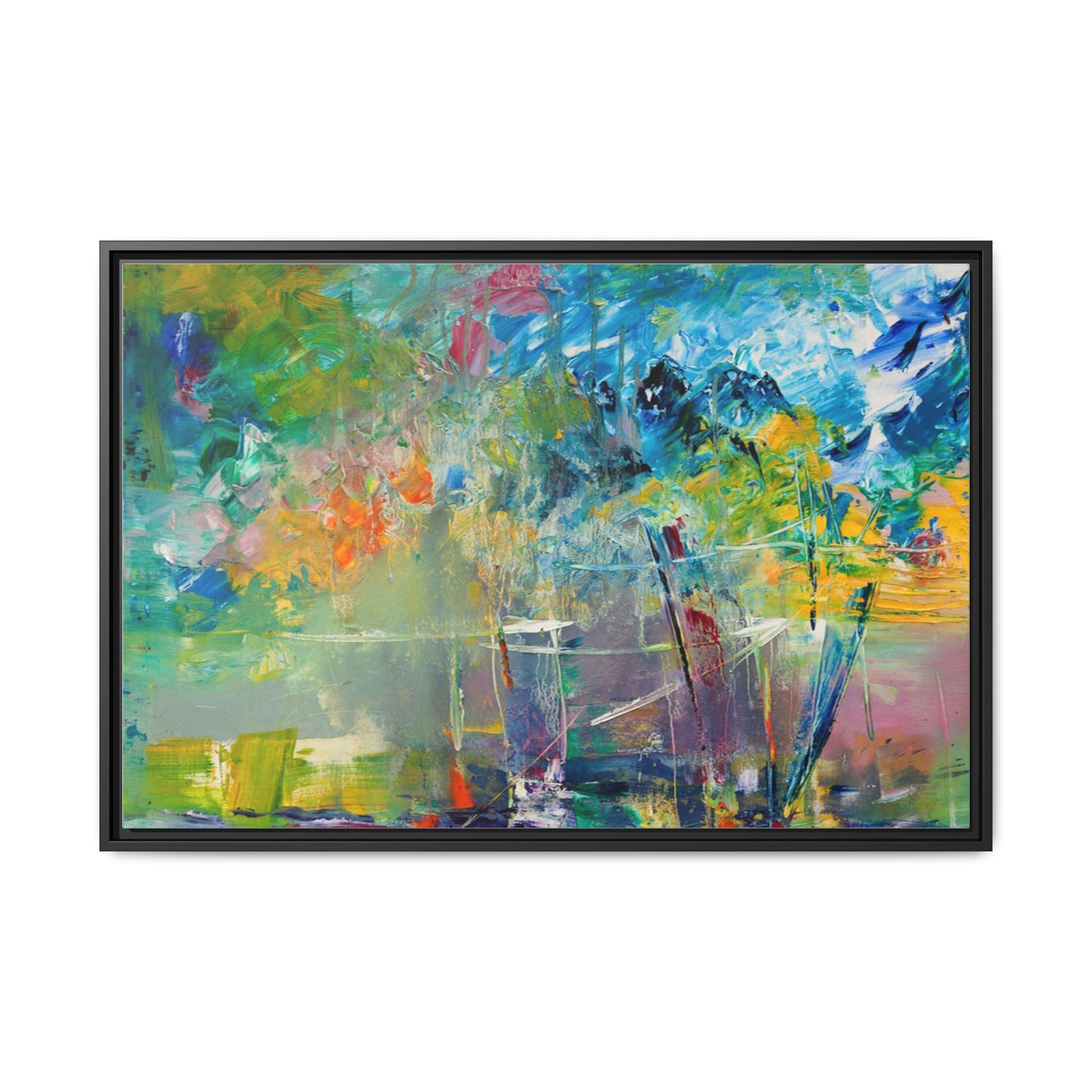 This vibrant abstract painting bursts with a kaleidoscope of colors, featuring dynamic brushstrokes that create a sense of movement and energy. The artwork predominantly showcases a rich palette of blues, greens, yellows, and touches of orange and pink, blending and layering in a fluid, impressionistic style. Geometric and organic shapes emerge and dissolve throughout the composition, suggesting a landscape or seascape that has been deconstructed and reimagined through an emotional lens. Textured paint application reveals intricate details and depth, with sweeping strokes and delicate lines creating a complex visual narrative. The painting exudes a sense of spontaneity and freedom, inviting viewers to explore its intricate details and emotional resonance.