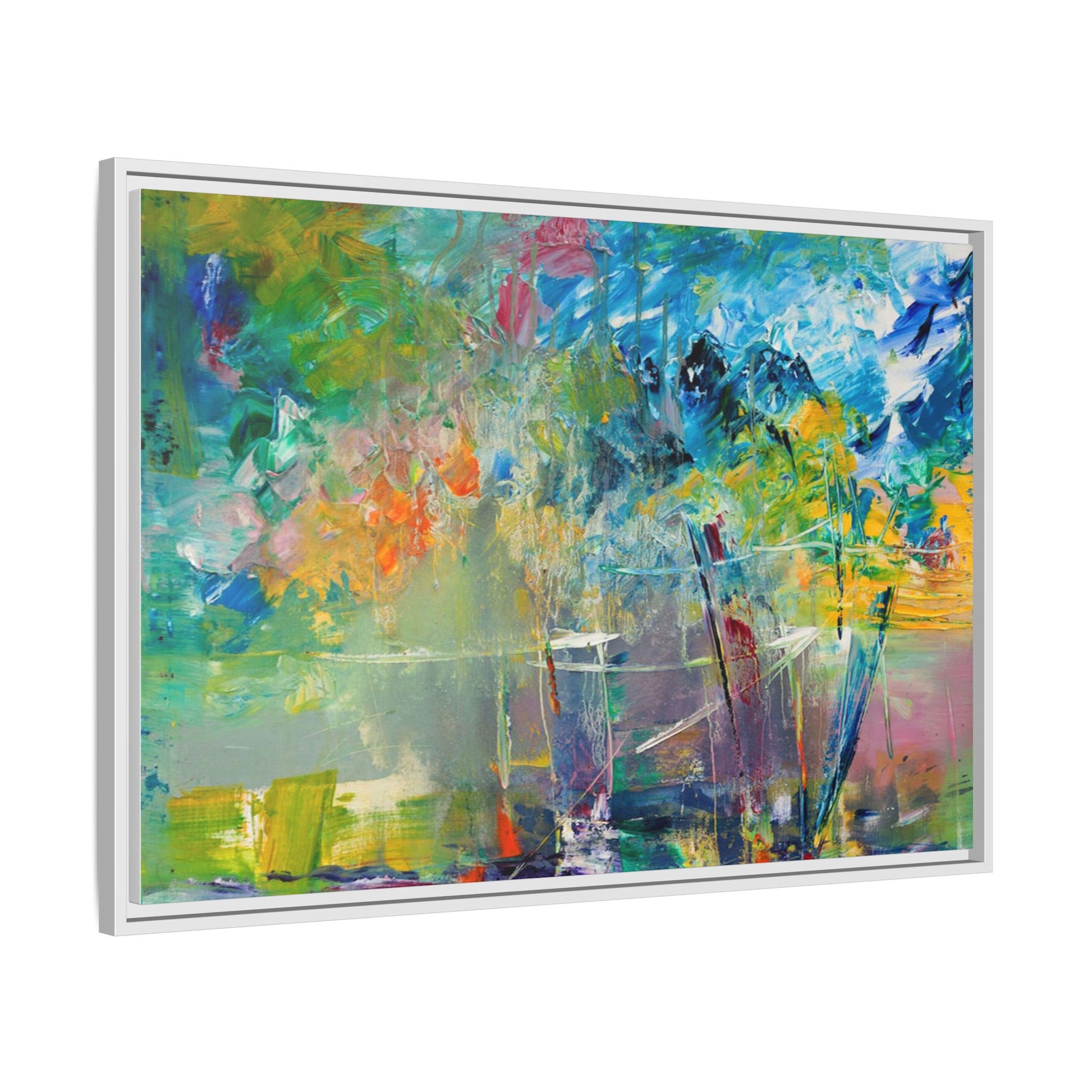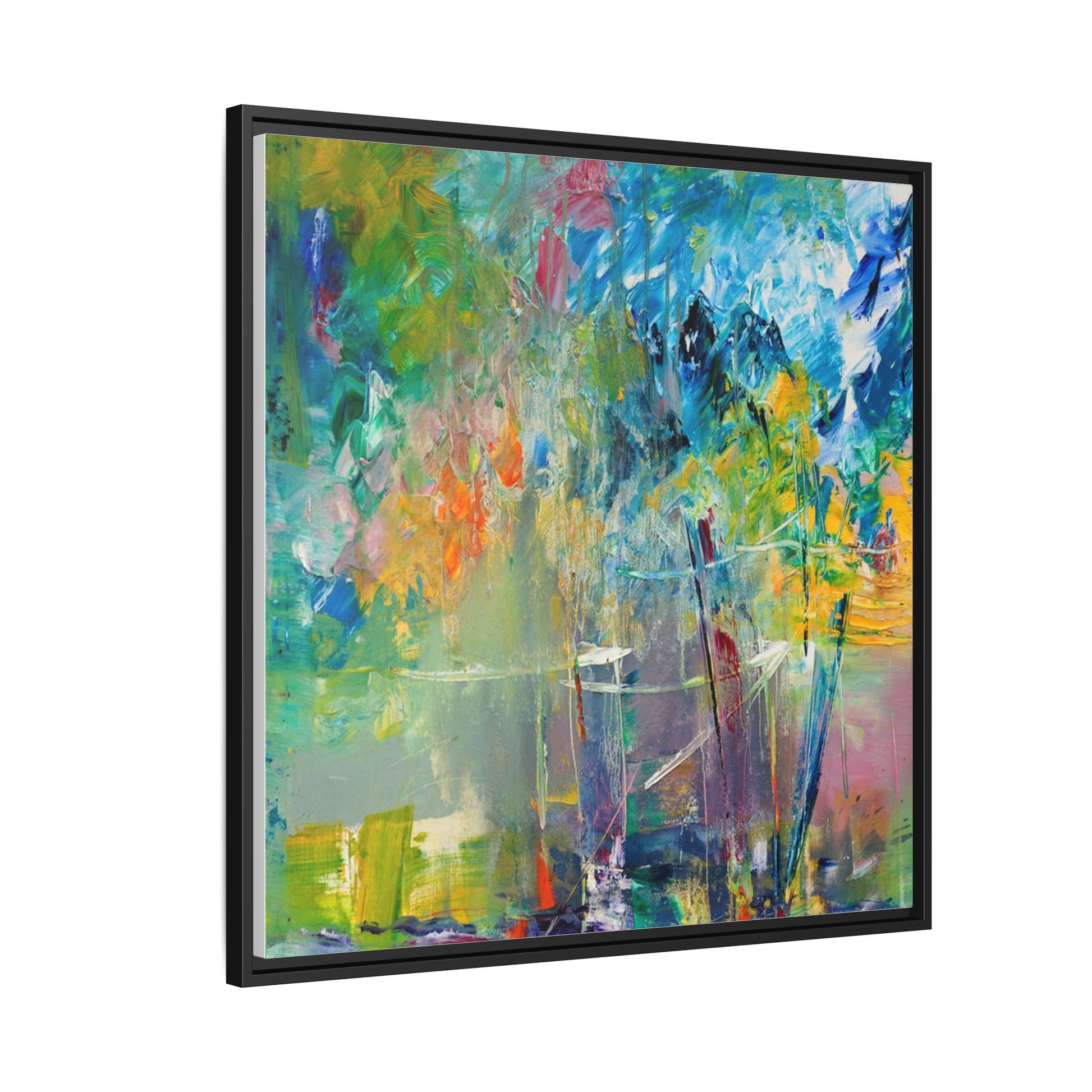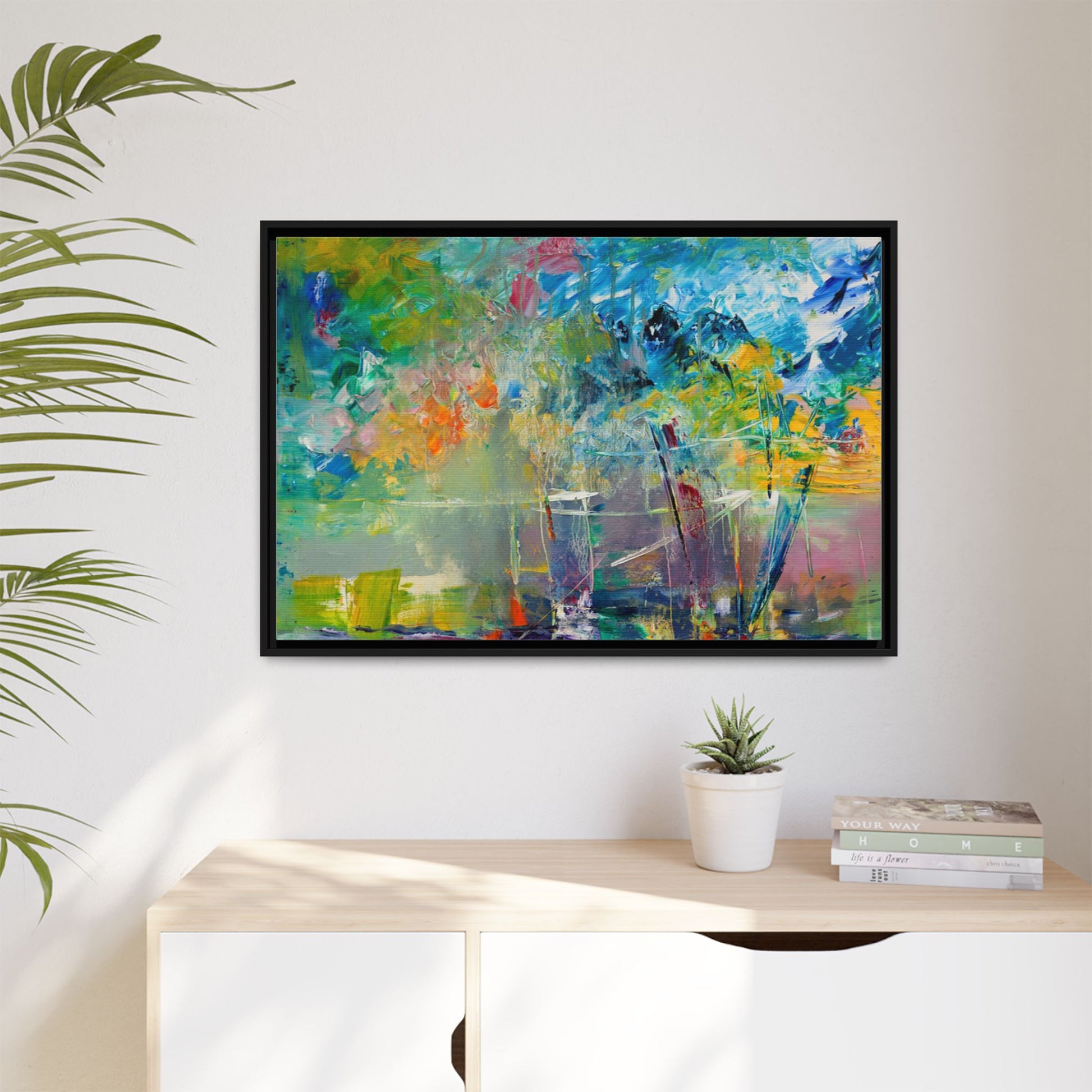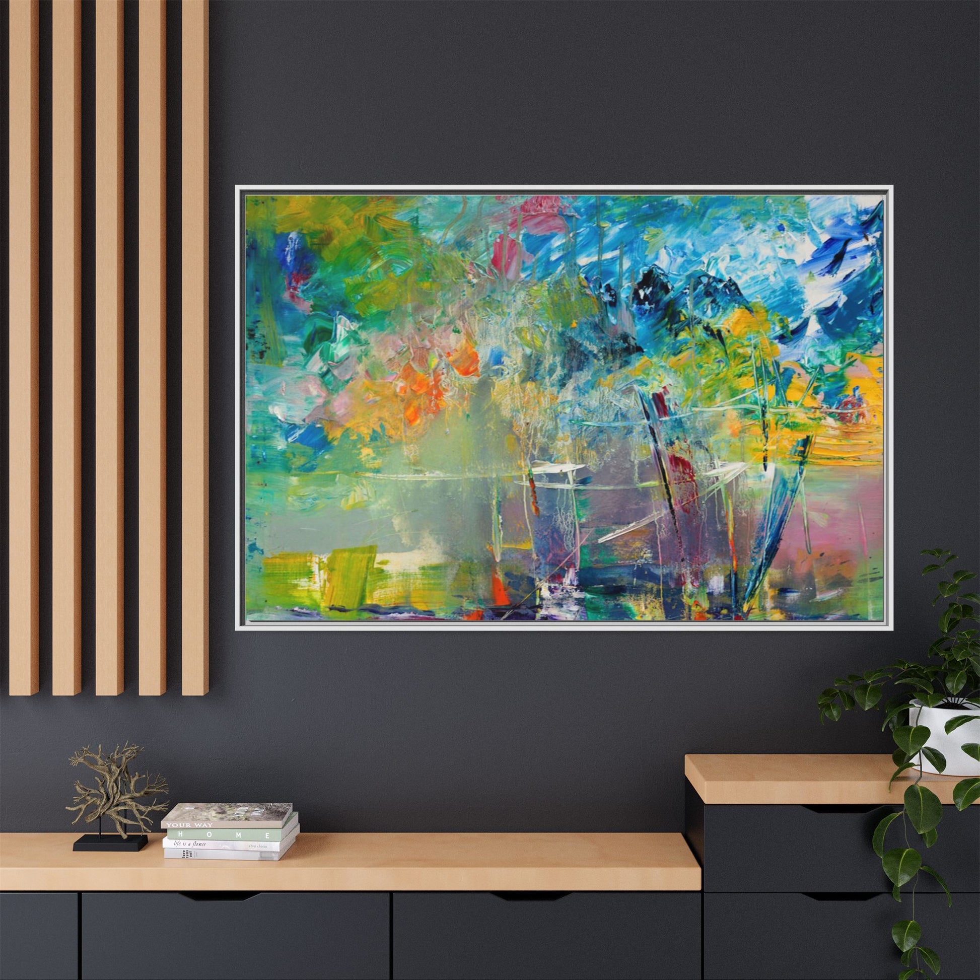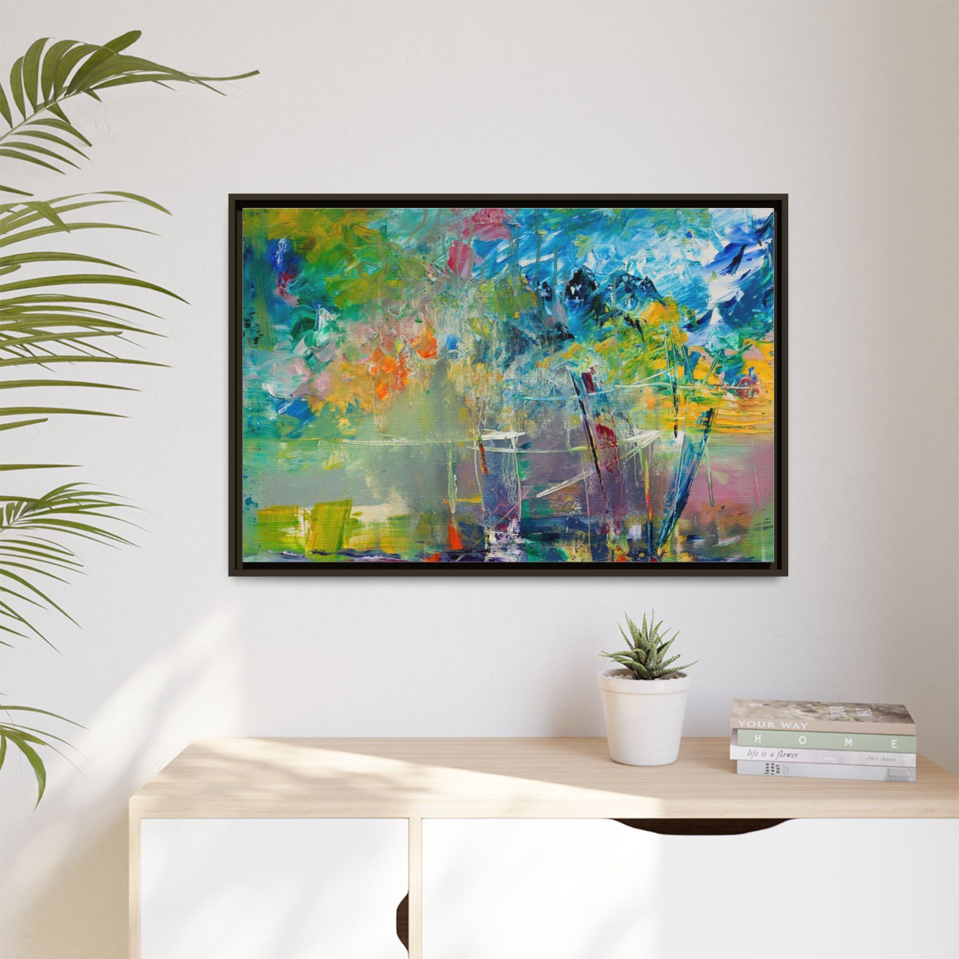 This vibrant abstract painting bursts with a kaleidoscope of colors, featuring dynamic brushstrokes that create a sense of movement and energy. The artwork predominantly showcases a rich palette of blues, greens, yellows, and touches of orange and pink, blending and layering in a fluid, impressionistic style. Geometric and organic shapes emerge and dissolve throughout the composition, suggesting a landscape or seascape that has been deconstructed and reimagined through an emotional lens. Textured paint application reveals intricate details and depth, with sweeping strokes and delicate lines creating a complex visual narrative. The painting exudes a sense of spontaneity and freedom, inviting viewers to explore its intricate details and emotional resonance.