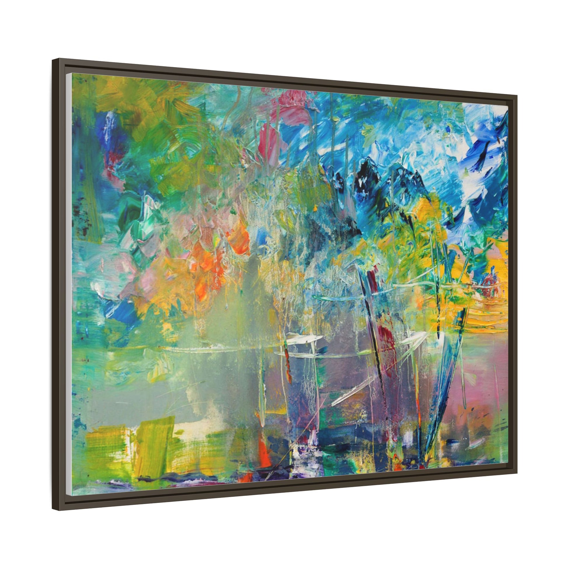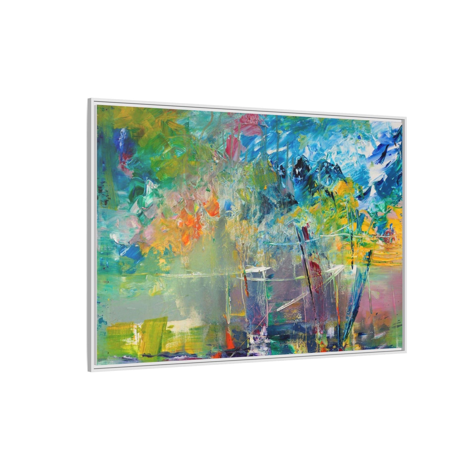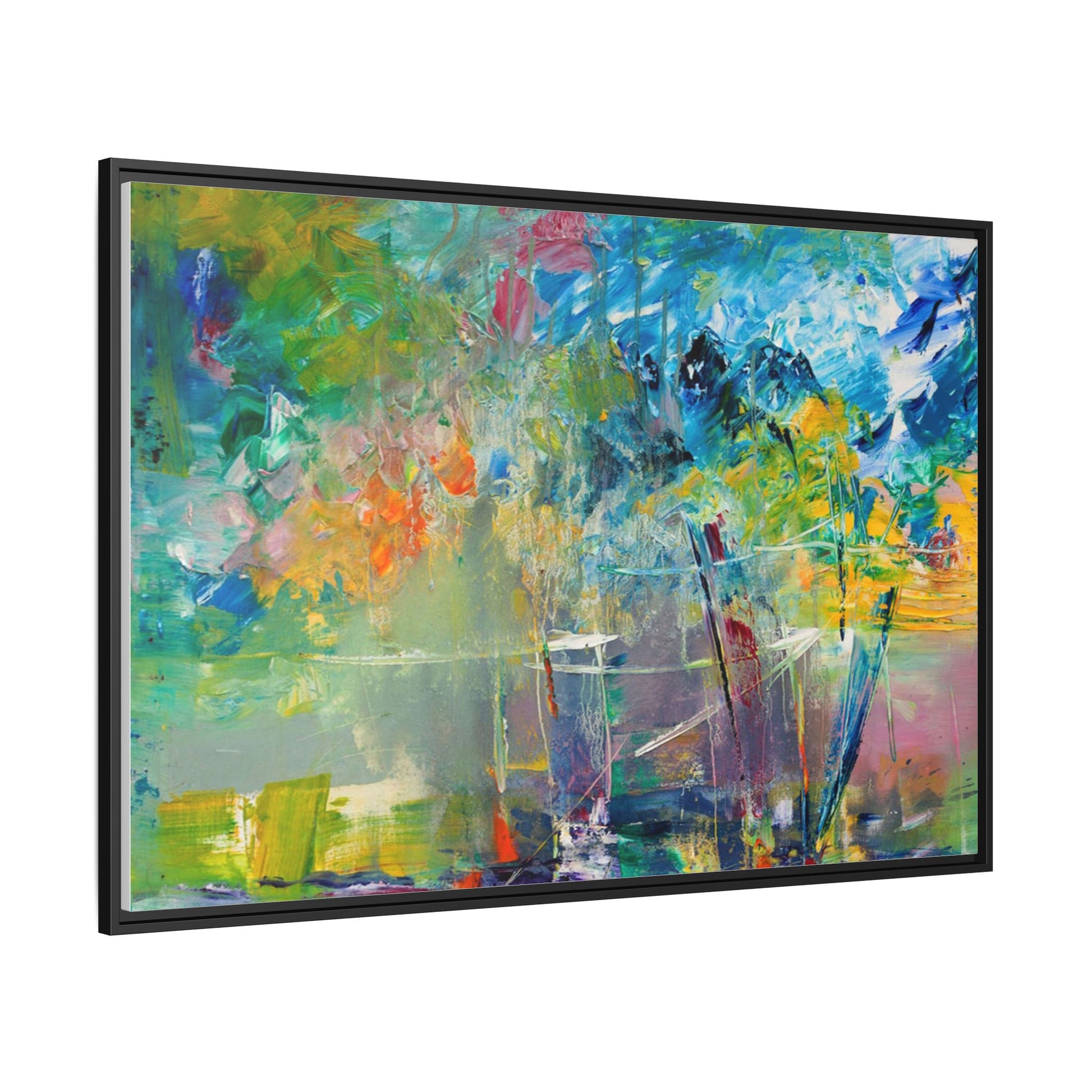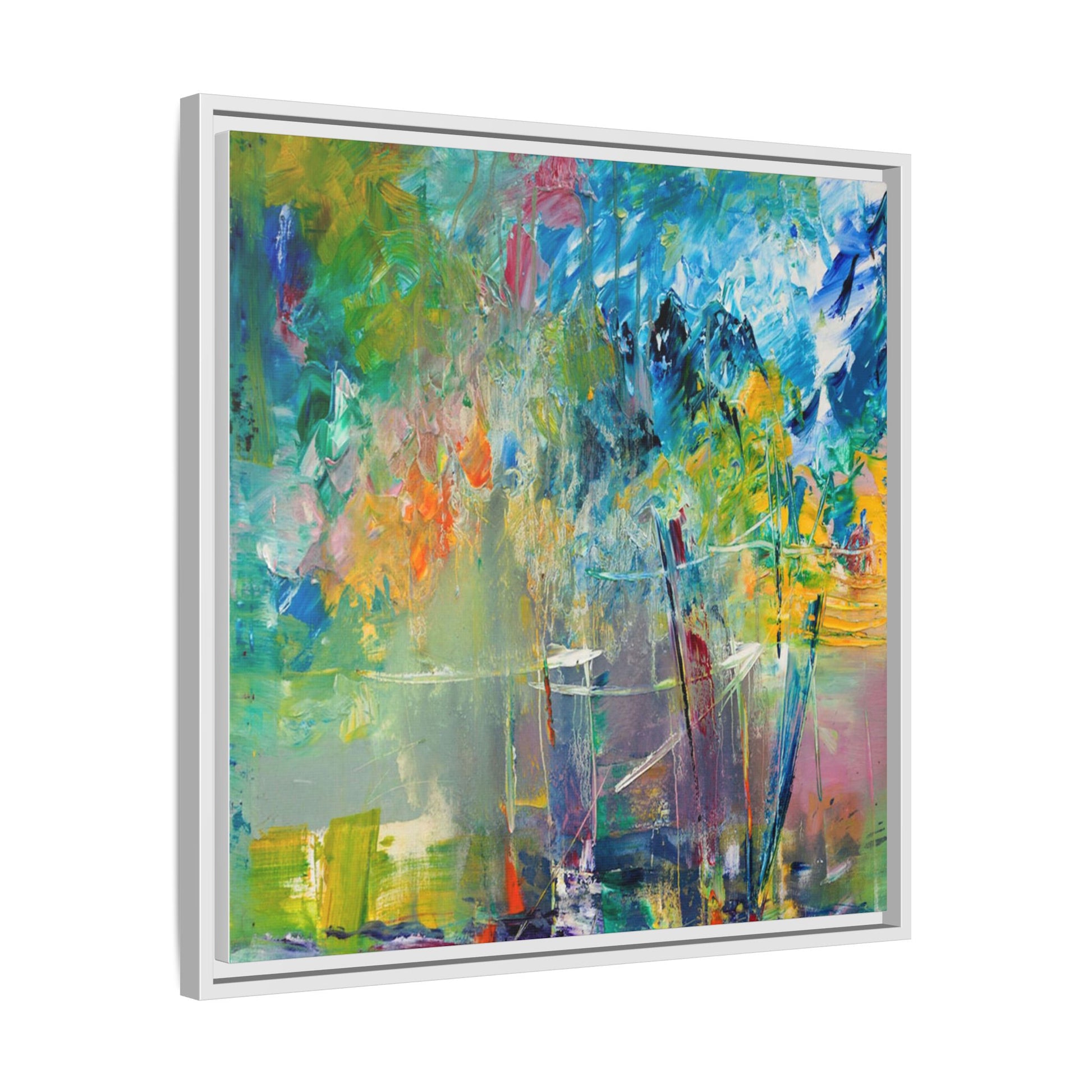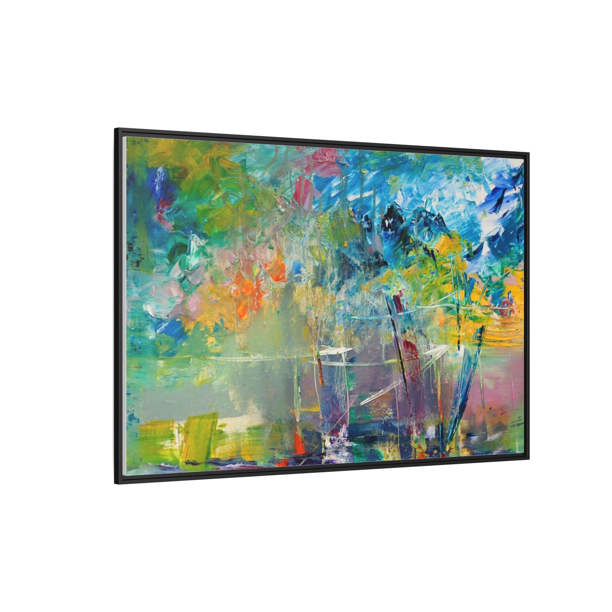 This vibrant abstract painting bursts with a kaleidoscope of colors, featuring dynamic brushstrokes that create a sense of movement and energy. The artwork predominantly showcases a rich palette of blues, greens, yellows, and touches of orange and pink, blending and layering in a fluid, impressionistic style. Geometric and organic shapes emerge and dissolve throughout the composition, suggesting a landscape or seascape that has been deconstructed and reimagined through an emotional lens. Textured paint application reveals intricate details and depth, with sweeping strokes and delicate lines creating a complex visual narrative. The painting exudes a sense of spontaneity and freedom, inviting viewers to explore its intricate details and emotional resonance.