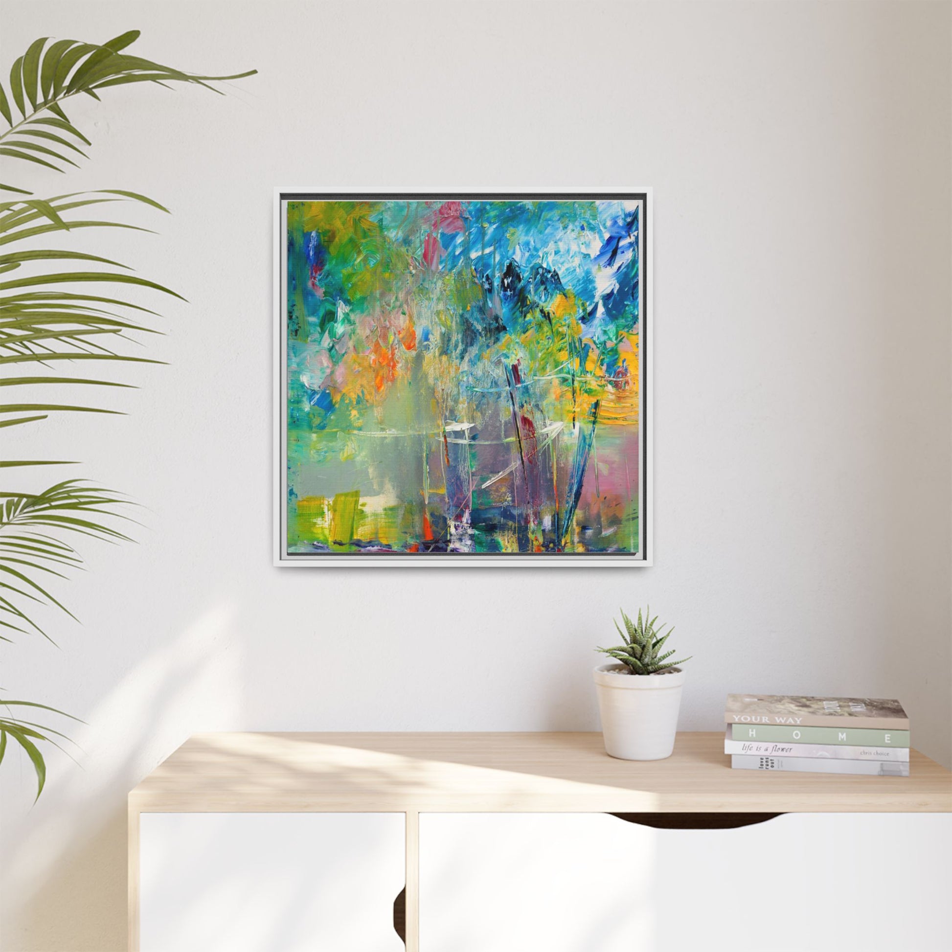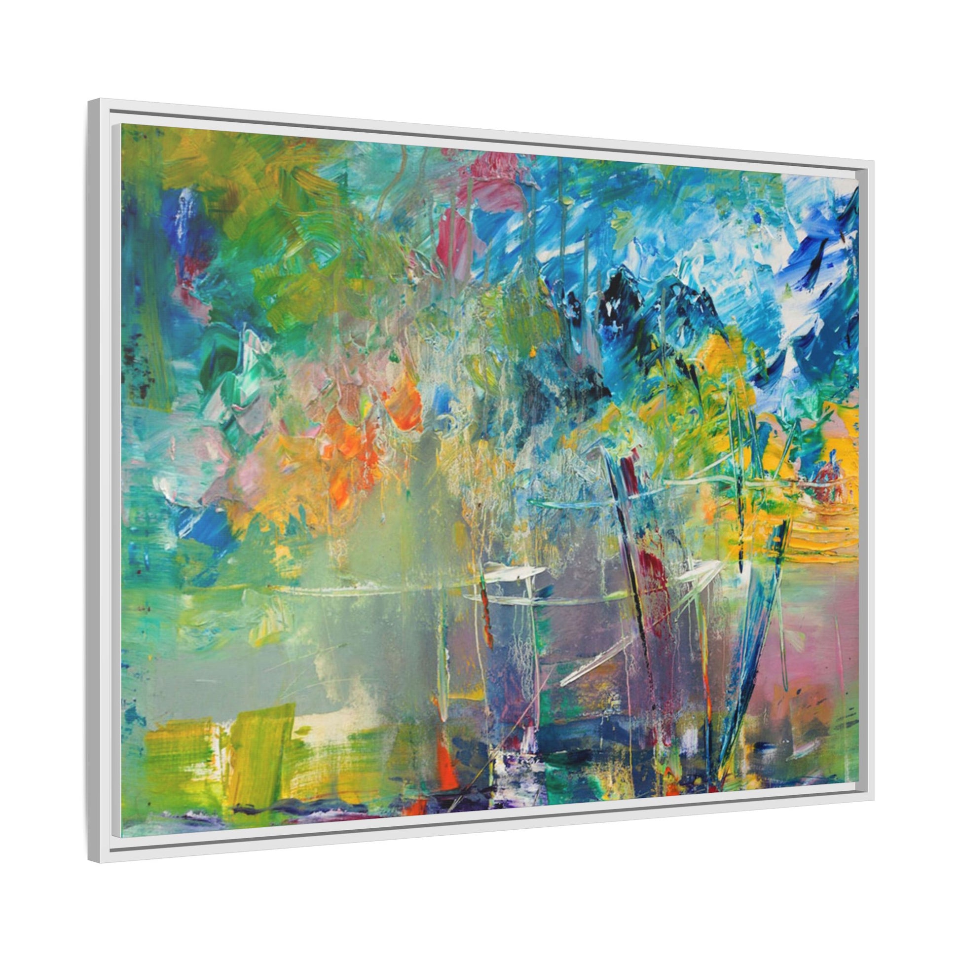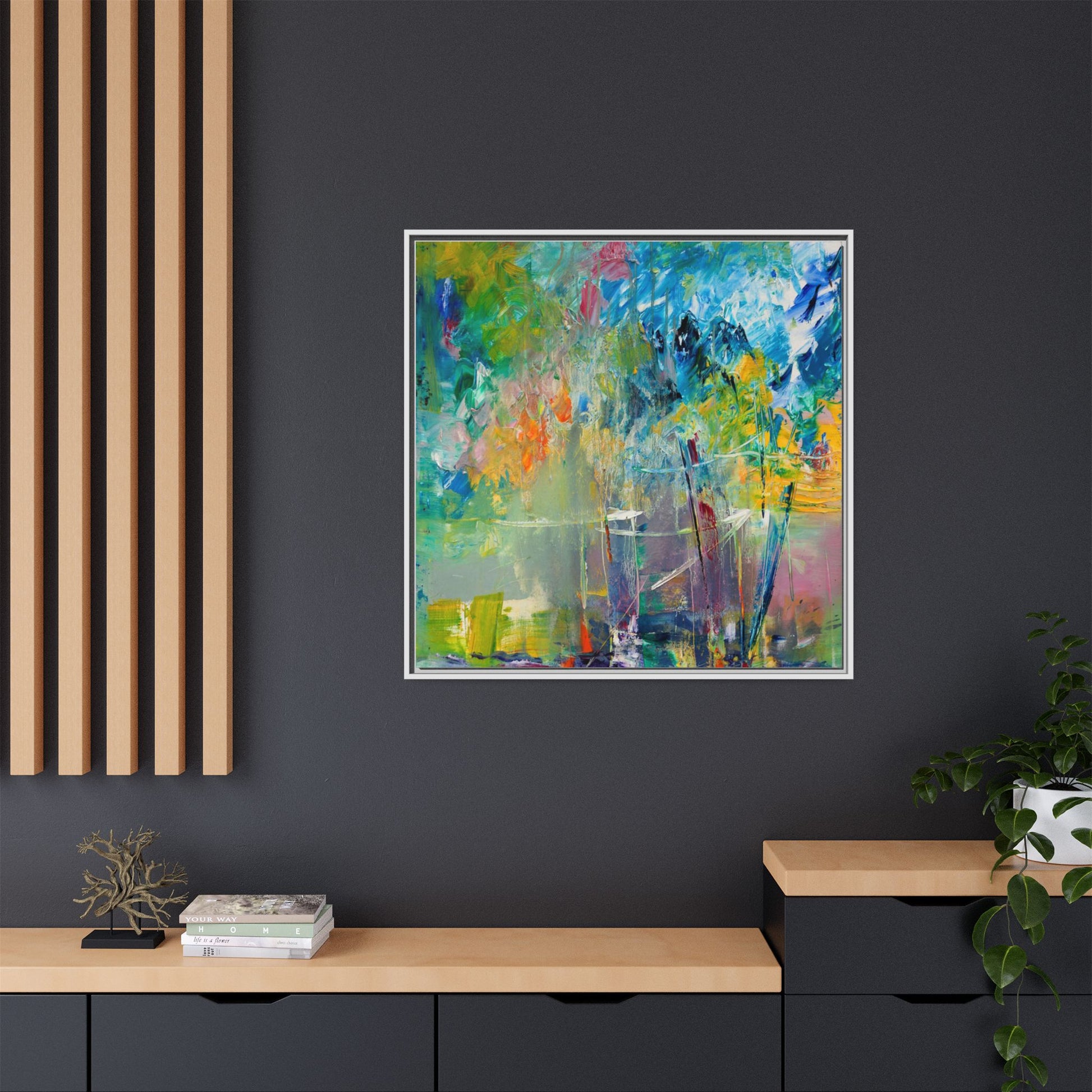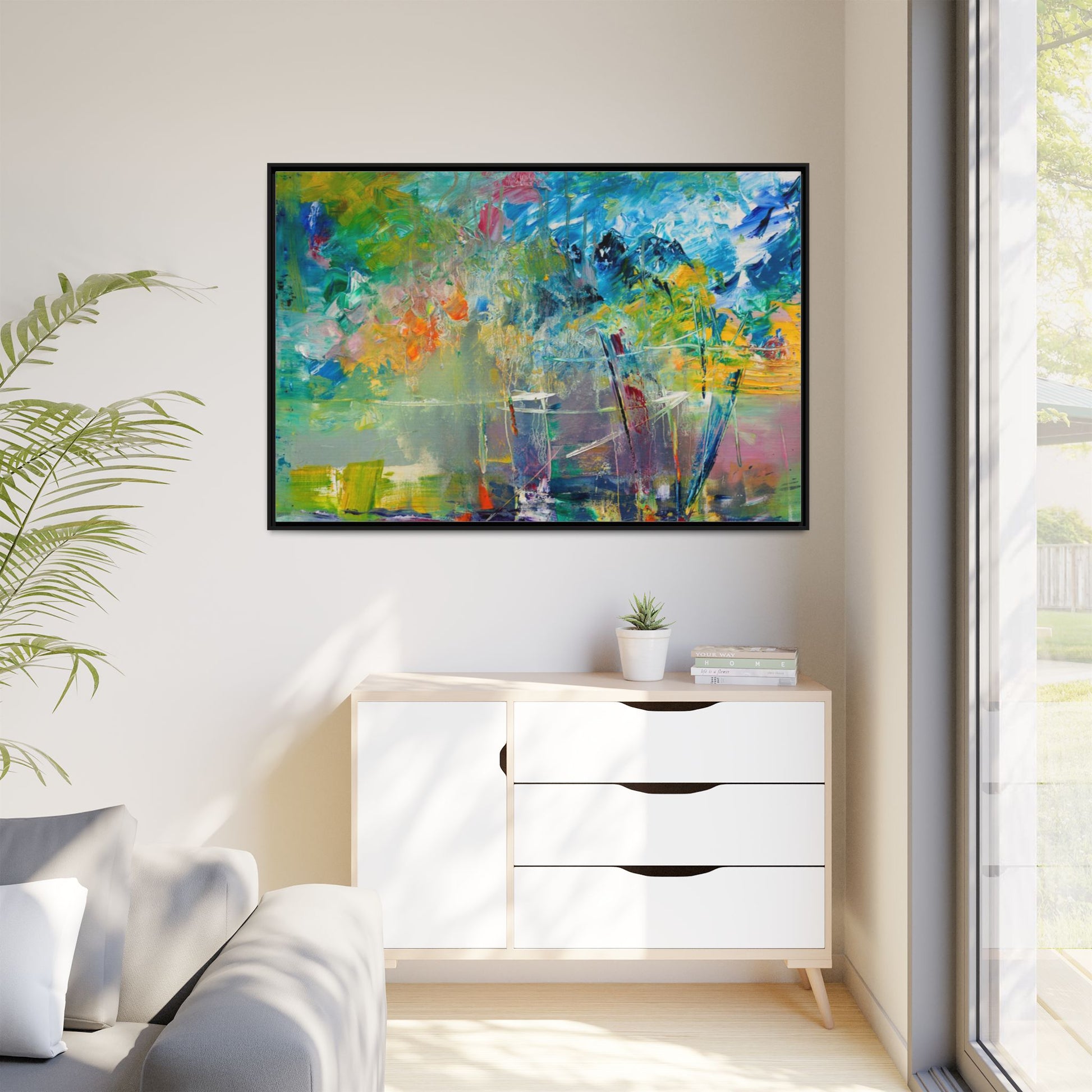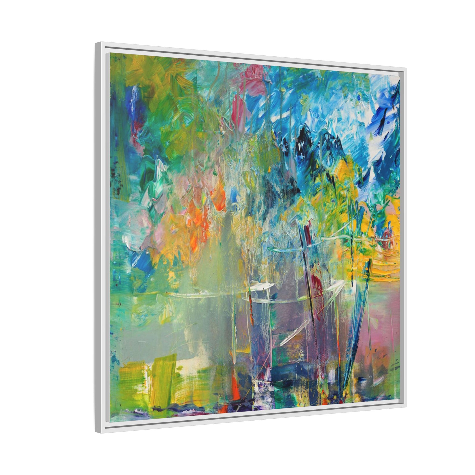 This vibrant abstract painting bursts with a kaleidoscope of colors, featuring dynamic brushstrokes that create a sense of movement and energy. The artwork predominantly showcases a rich palette of blues, greens, yellows, and touches of orange and pink, blending and layering in a fluid, impressionistic style. Geometric and organic shapes emerge and dissolve throughout the composition, suggesting a landscape or seascape that has been deconstructed and reimagined through an emotional lens. Textured paint application reveals intricate details and depth, with sweeping strokes and delicate lines creating a complex visual narrative. The painting exudes a sense of spontaneity and freedom, inviting viewers to explore its intricate details and emotional resonance.