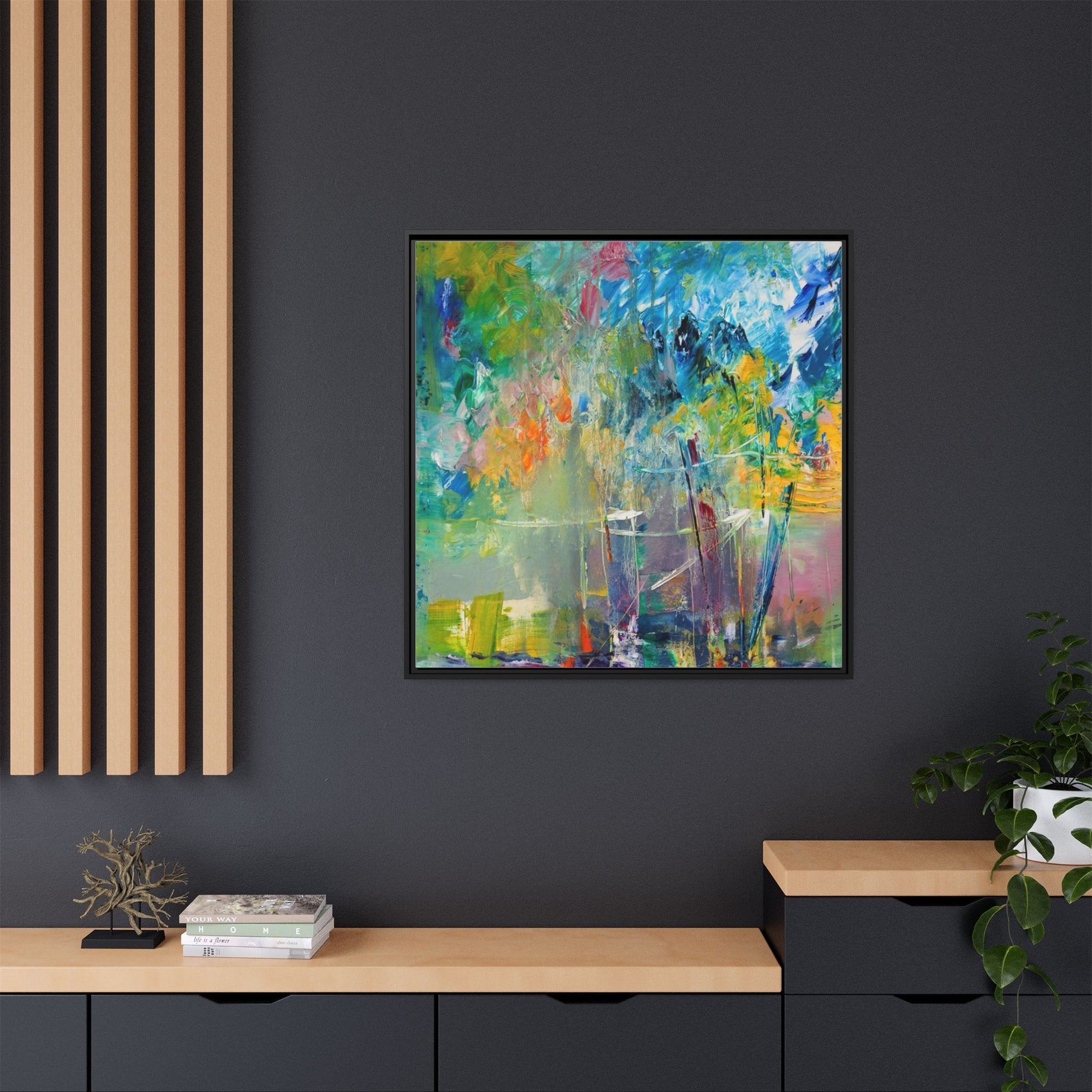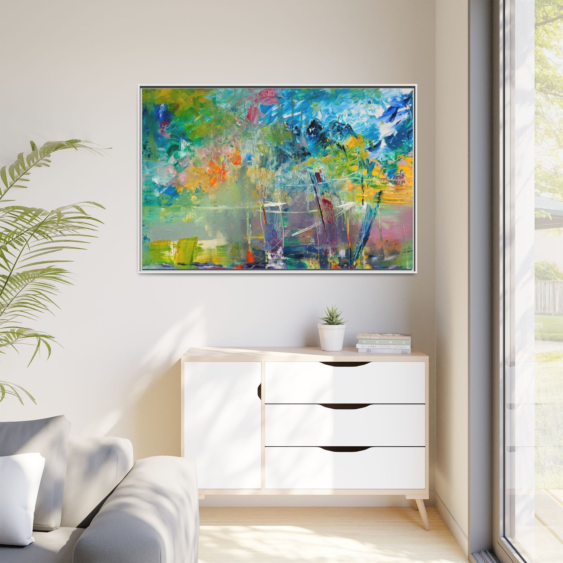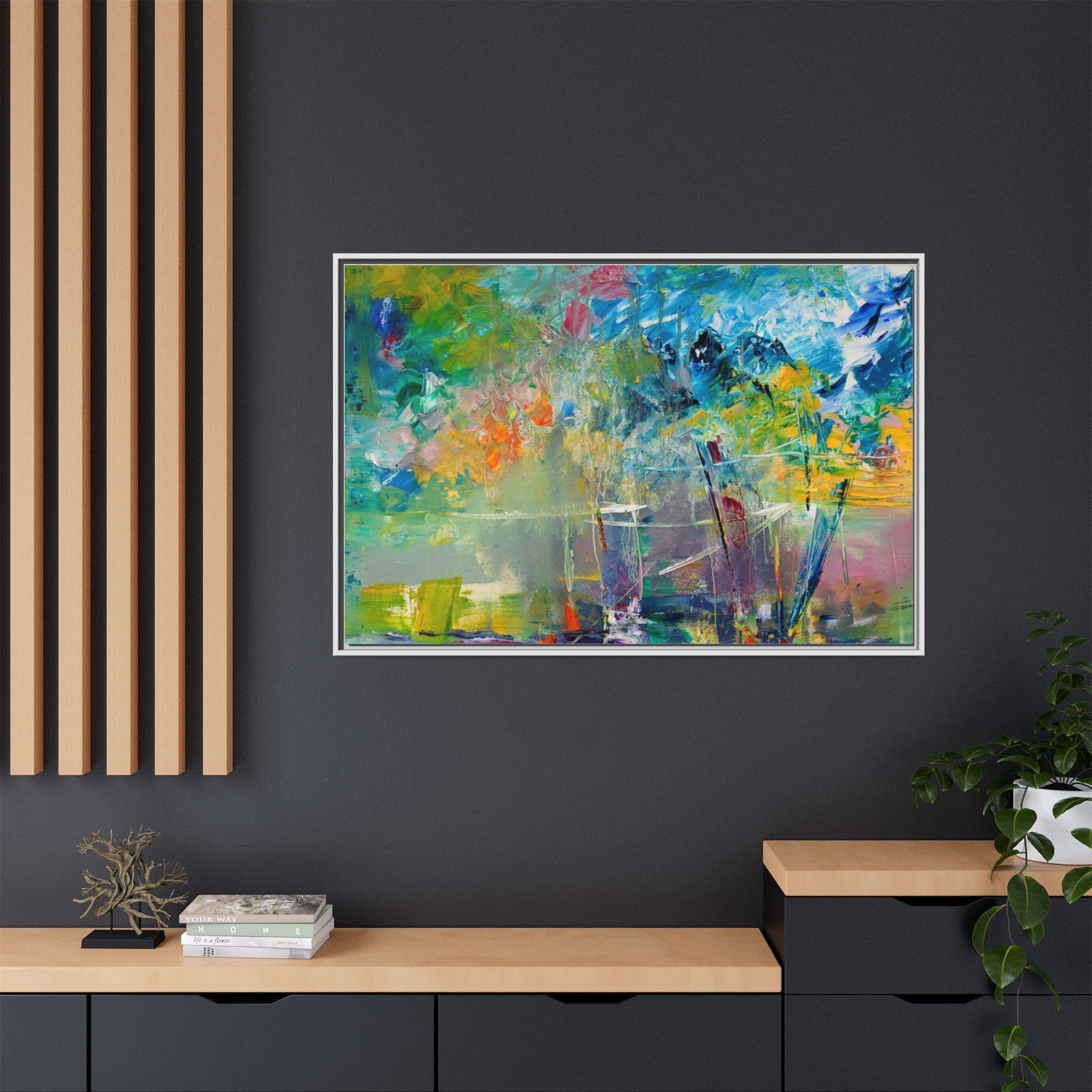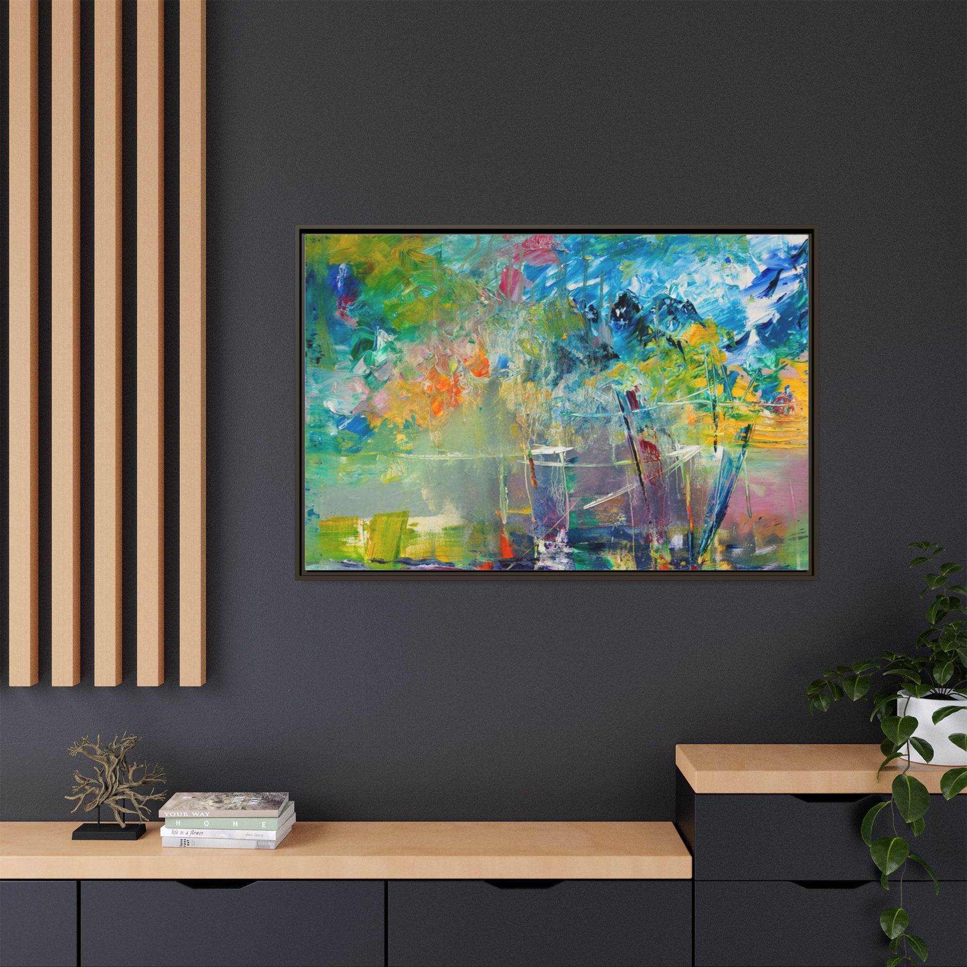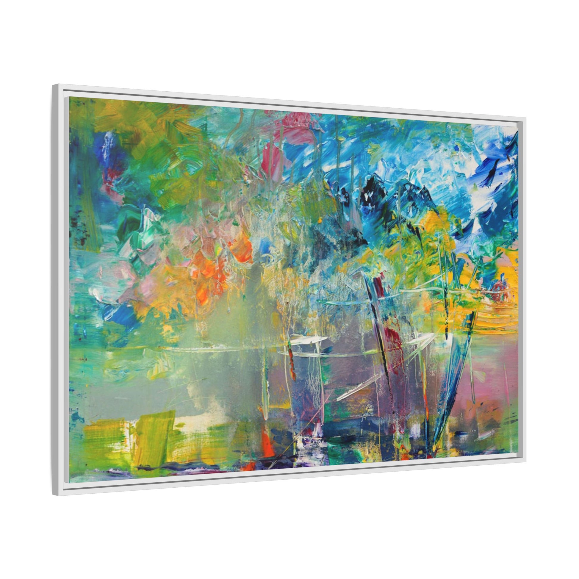 This vibrant abstract painting bursts with a kaleidoscope of colors, featuring dynamic brushstrokes that create a sense of movement and energy. The artwork predominantly showcases a rich palette of blues, greens, yellows, and touches of orange and pink, blending and layering in a fluid, impressionistic style. Geometric and organic shapes emerge and dissolve throughout the composition, suggesting a landscape or seascape that has been deconstructed and reimagined through an emotional lens. Textured paint application reveals intricate details and depth, with sweeping strokes and delicate lines creating a complex visual narrative. The painting exudes a sense of spontaneity and freedom, inviting viewers to explore its intricate details and emotional resonance.