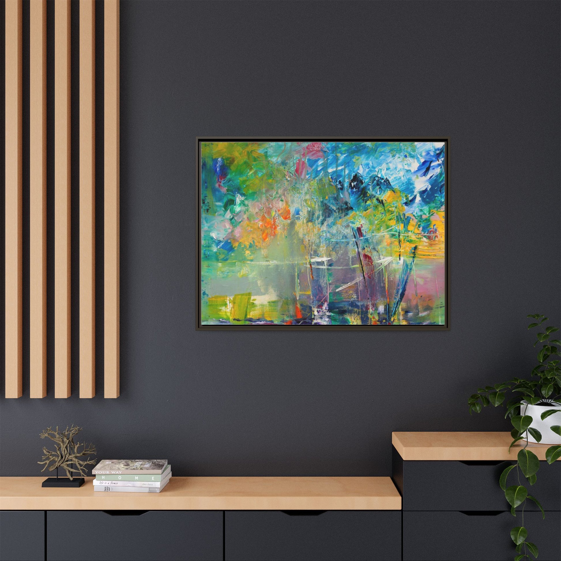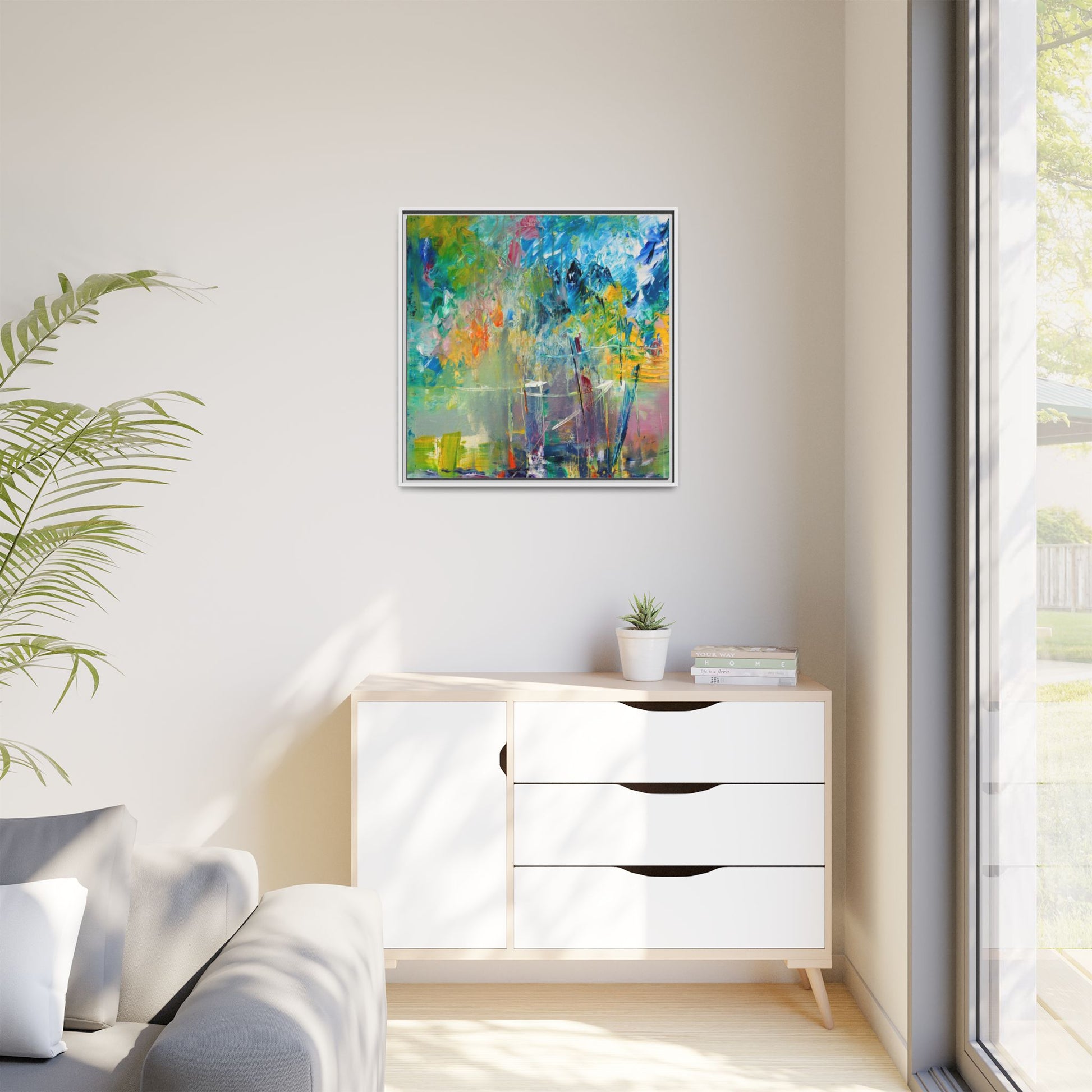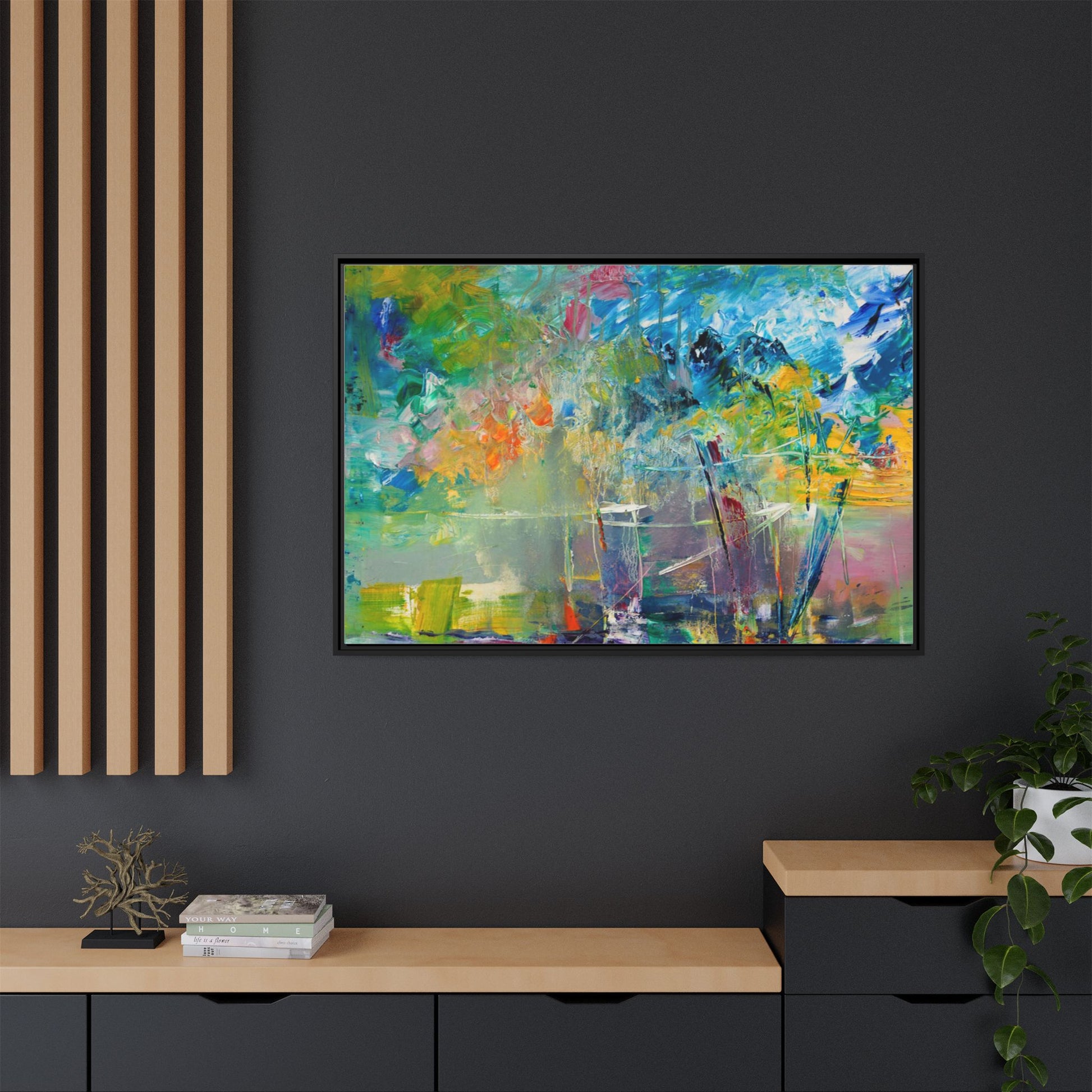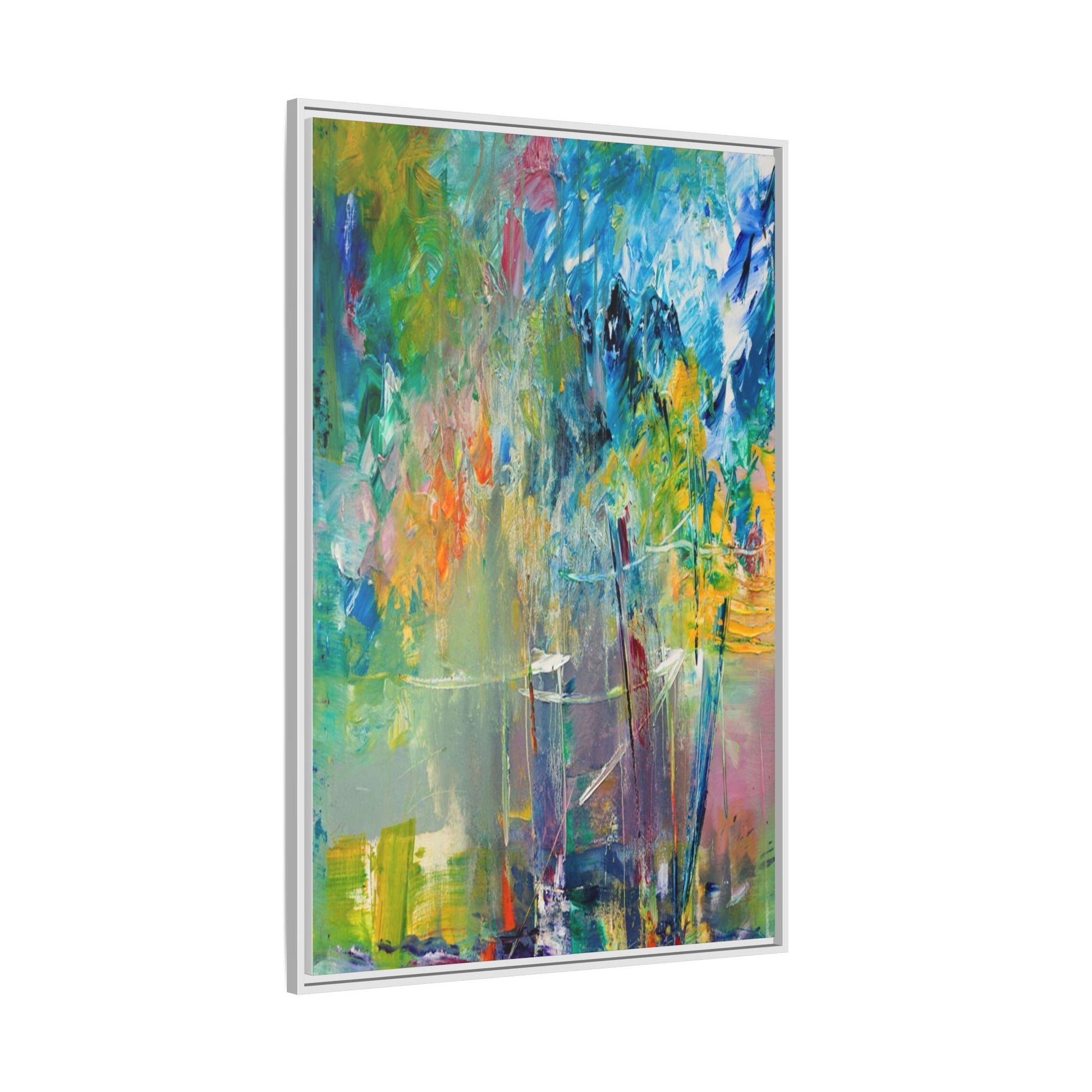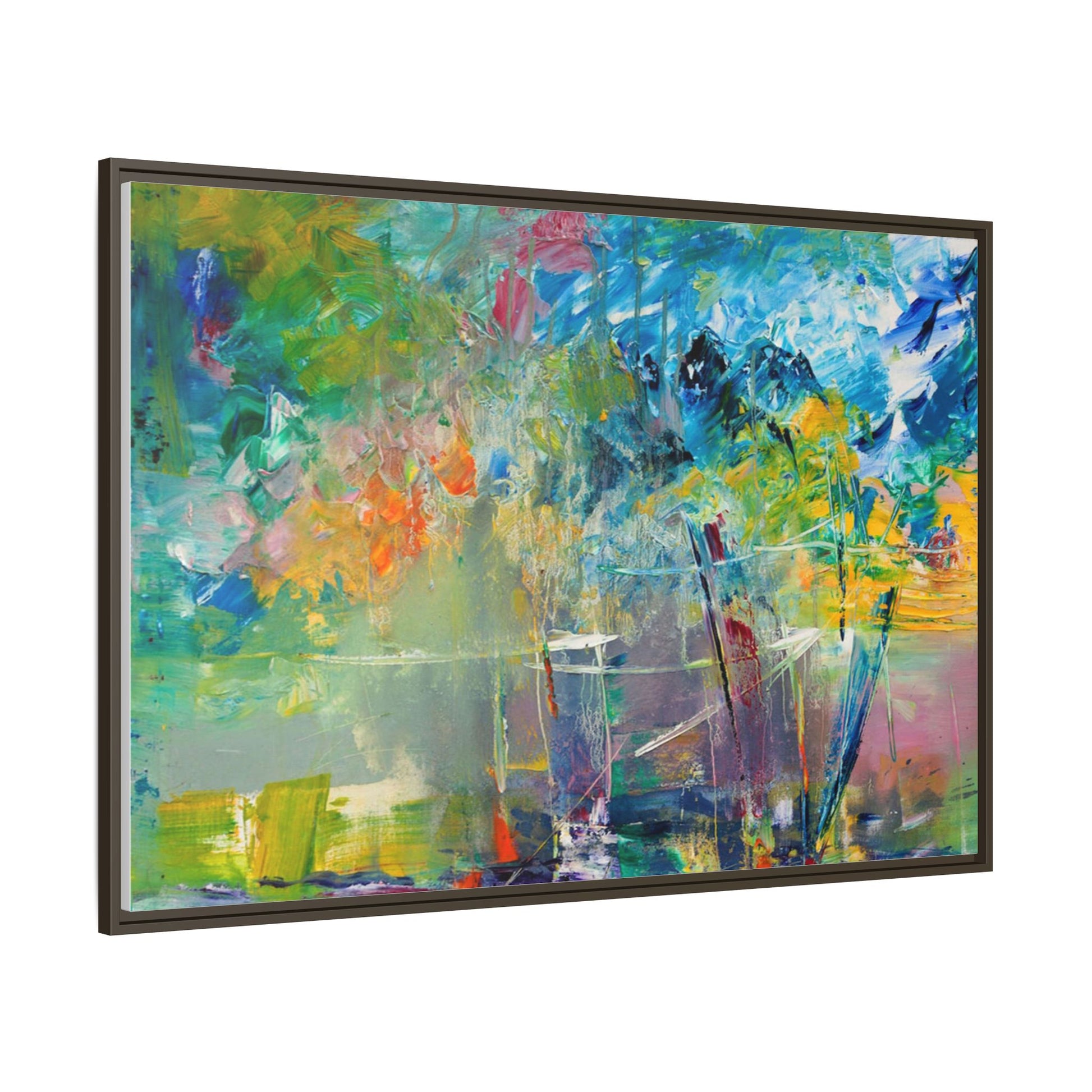 This vibrant abstract painting bursts with a kaleidoscope of colors, featuring dynamic brushstrokes that create a sense of movement and energy. The artwork predominantly showcases a rich palette of blues, greens, yellows, and touches of orange and pink, blending and layering in a fluid, impressionistic style. Geometric and organic shapes emerge and dissolve throughout the composition, suggesting a landscape or seascape that has been deconstructed and reimagined through an emotional lens. Textured paint application reveals intricate details and depth, with sweeping strokes and delicate lines creating a complex visual narrative. The painting exudes a sense of spontaneity and freedom, inviting viewers to explore its intricate details and emotional resonance.