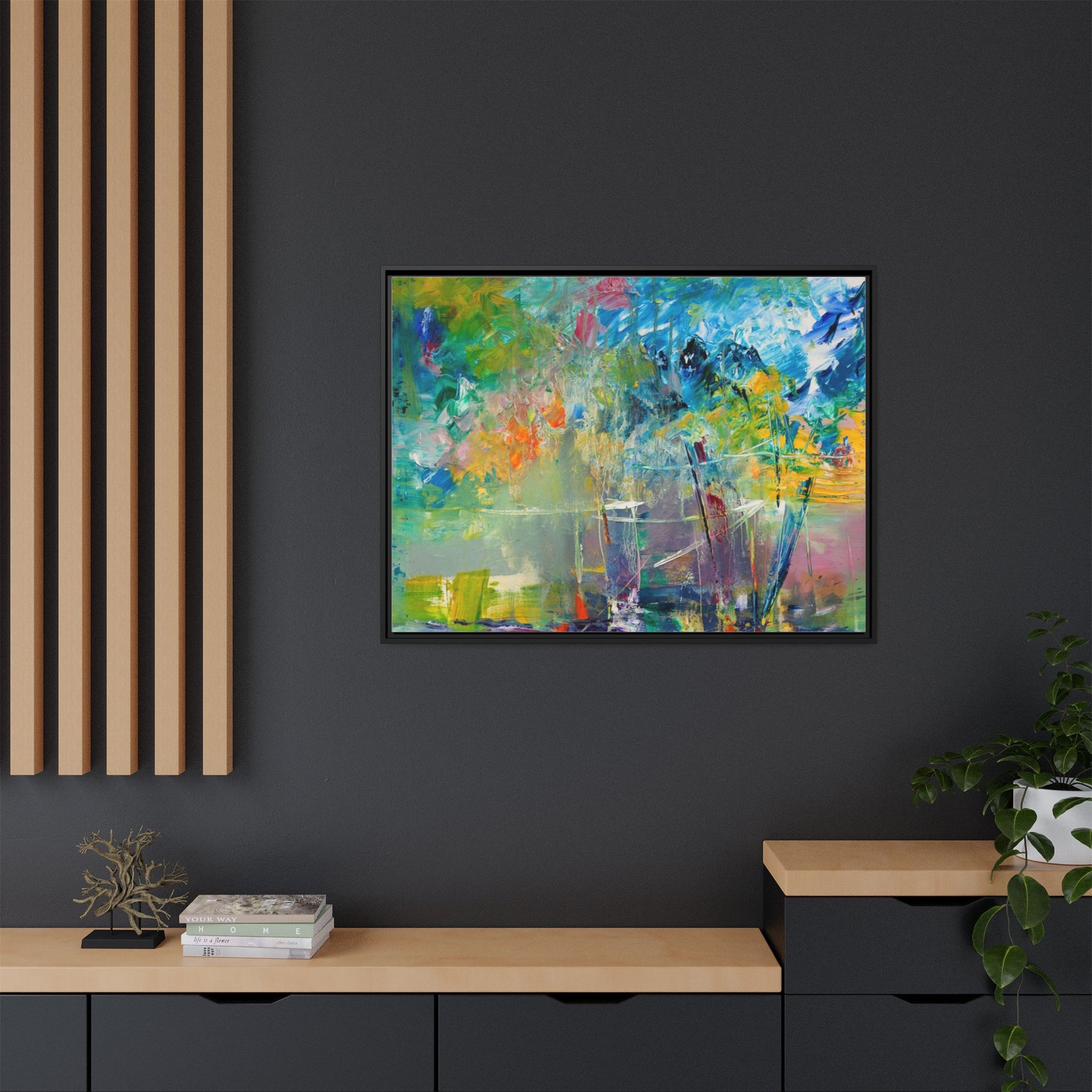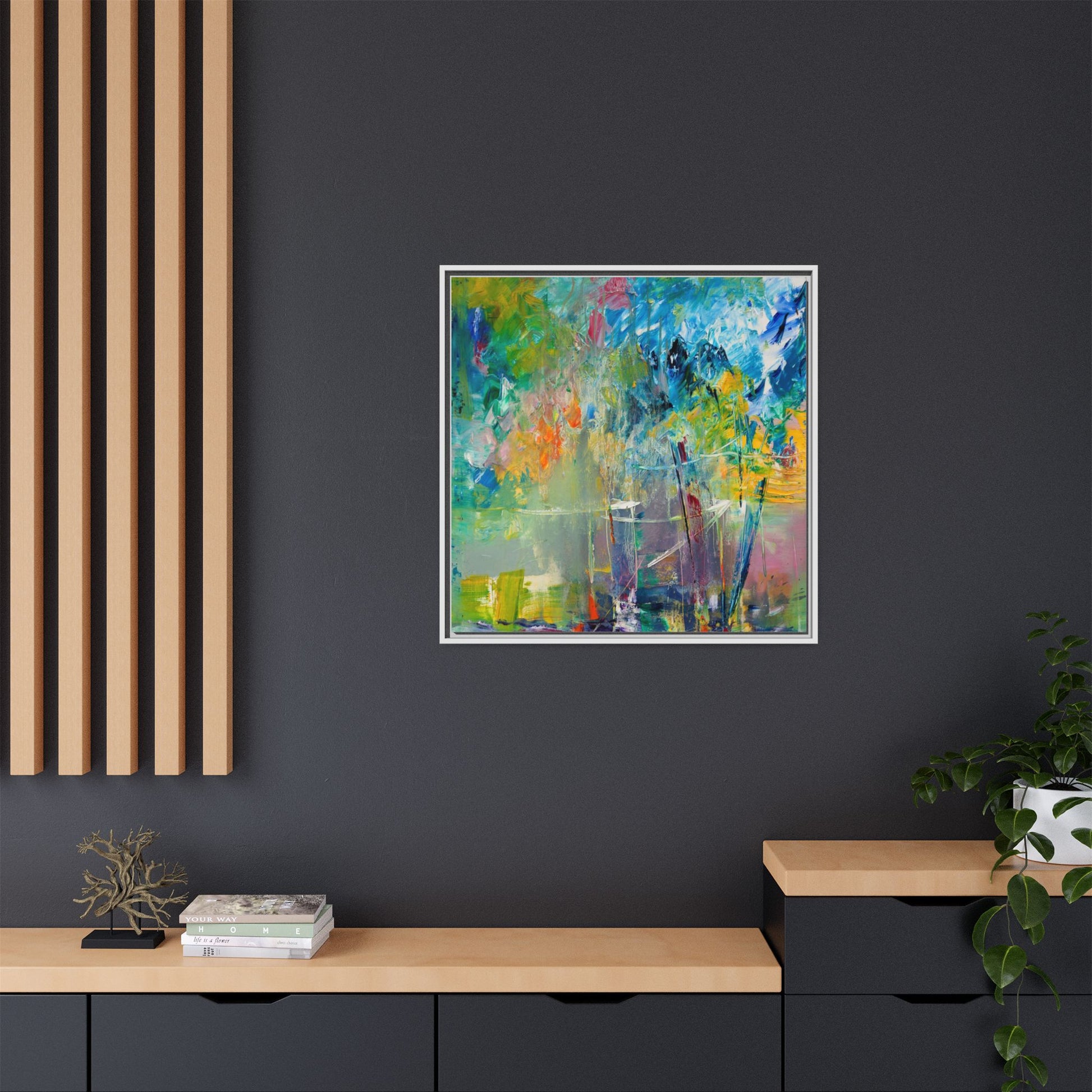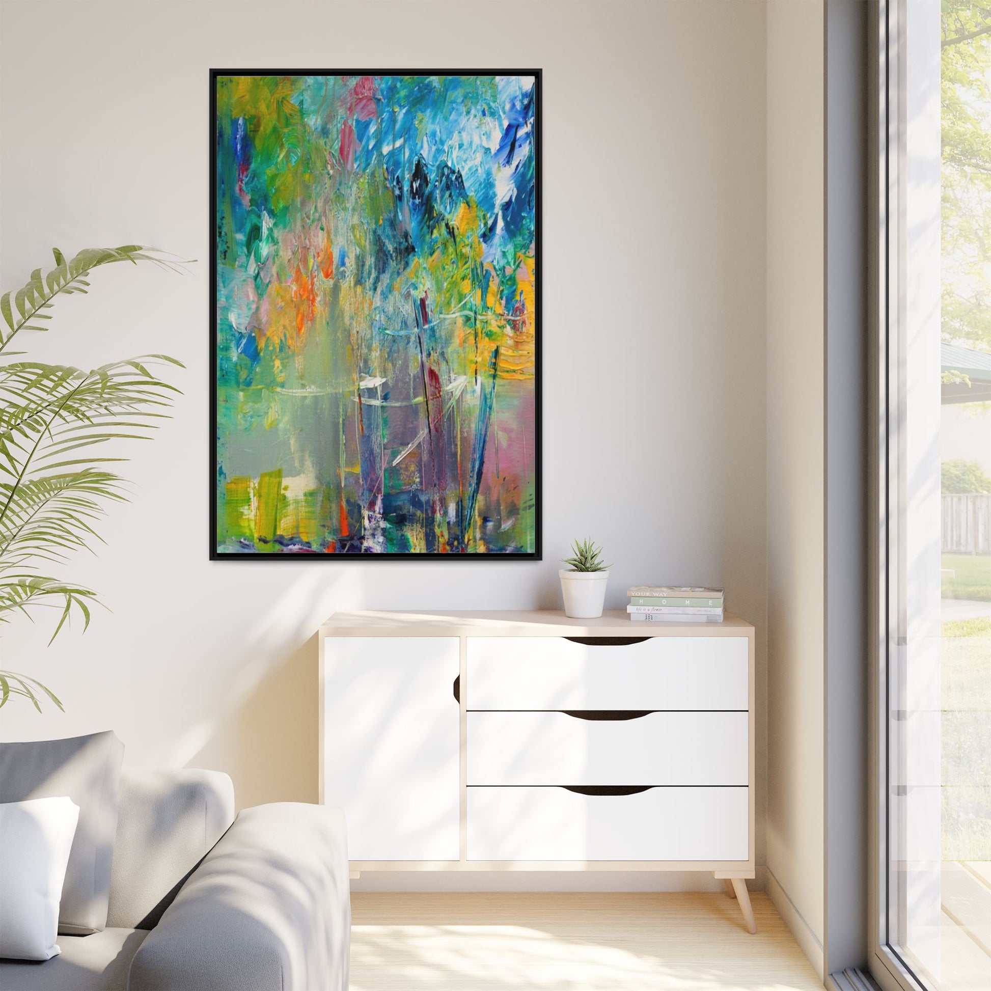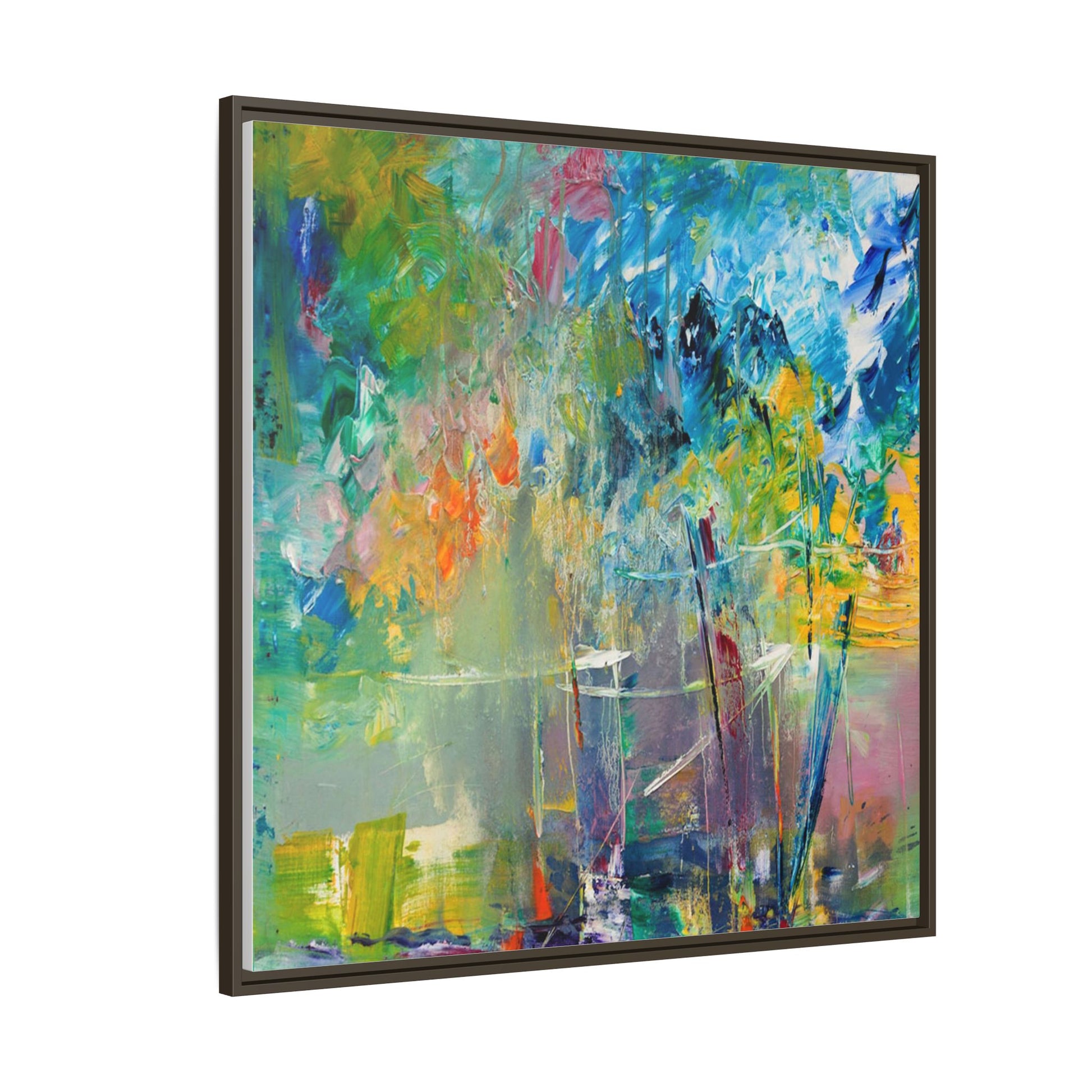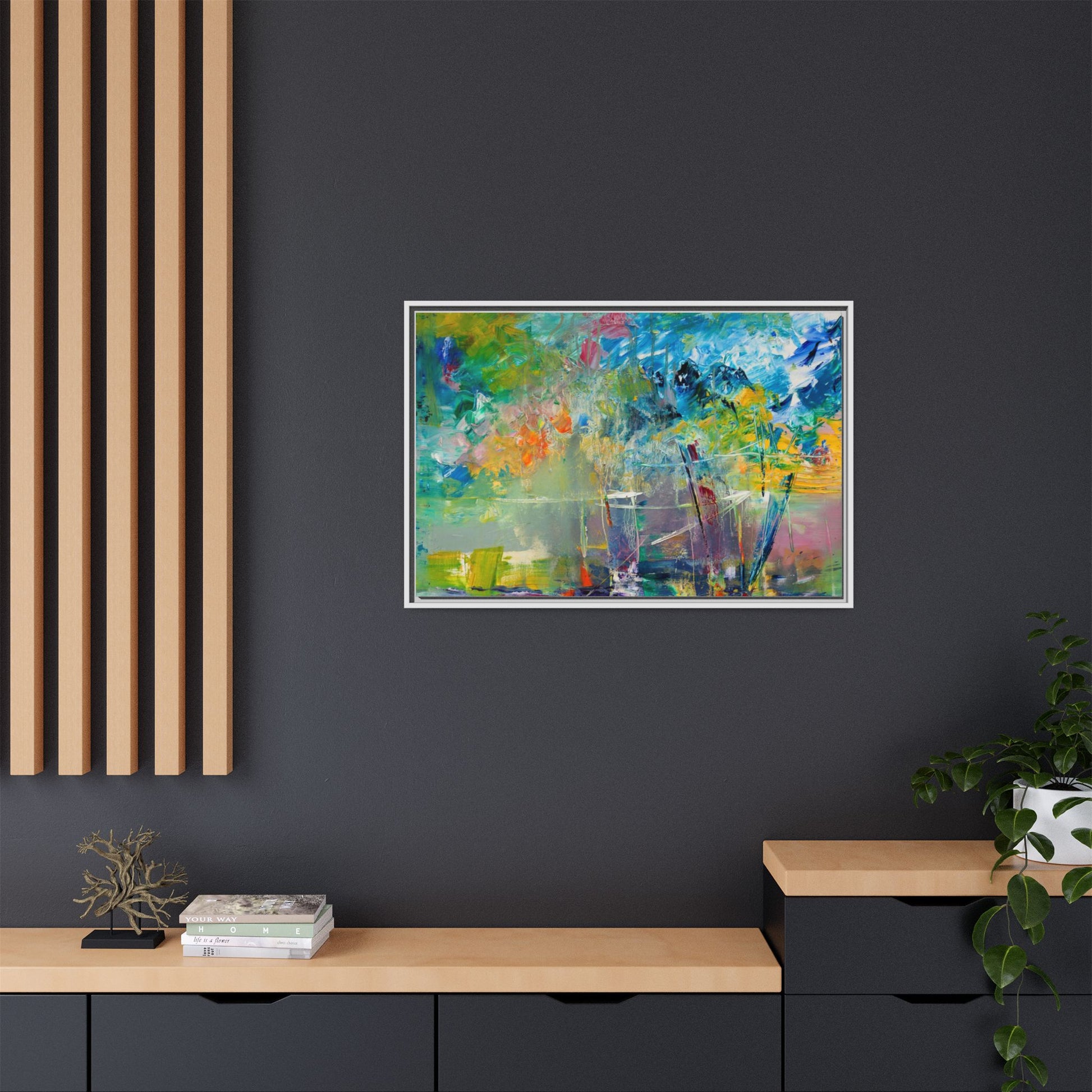This vibrant abstract painting bursts with a kaleidoscope of colors, featuring dynamic brushstrokes that create a sense of movement and energy. The artwork predominantly showcases a rich palette of blues, greens, yellows, and touches of orange and pink, blending and layering in a fluid, impressionistic style. Geometric and organic shapes emerge and dissolve throughout the composition, suggesting a landscape or seascape that has been deconstructed and reimagined through an emotional lens. Textured paint application reveals intricate details and depth, with sweeping strokes and delicate lines creating a complex visual narrative. The painting exudes a sense of spontaneity and freedom, inviting viewers to explore its intricate details and emotional resonance.