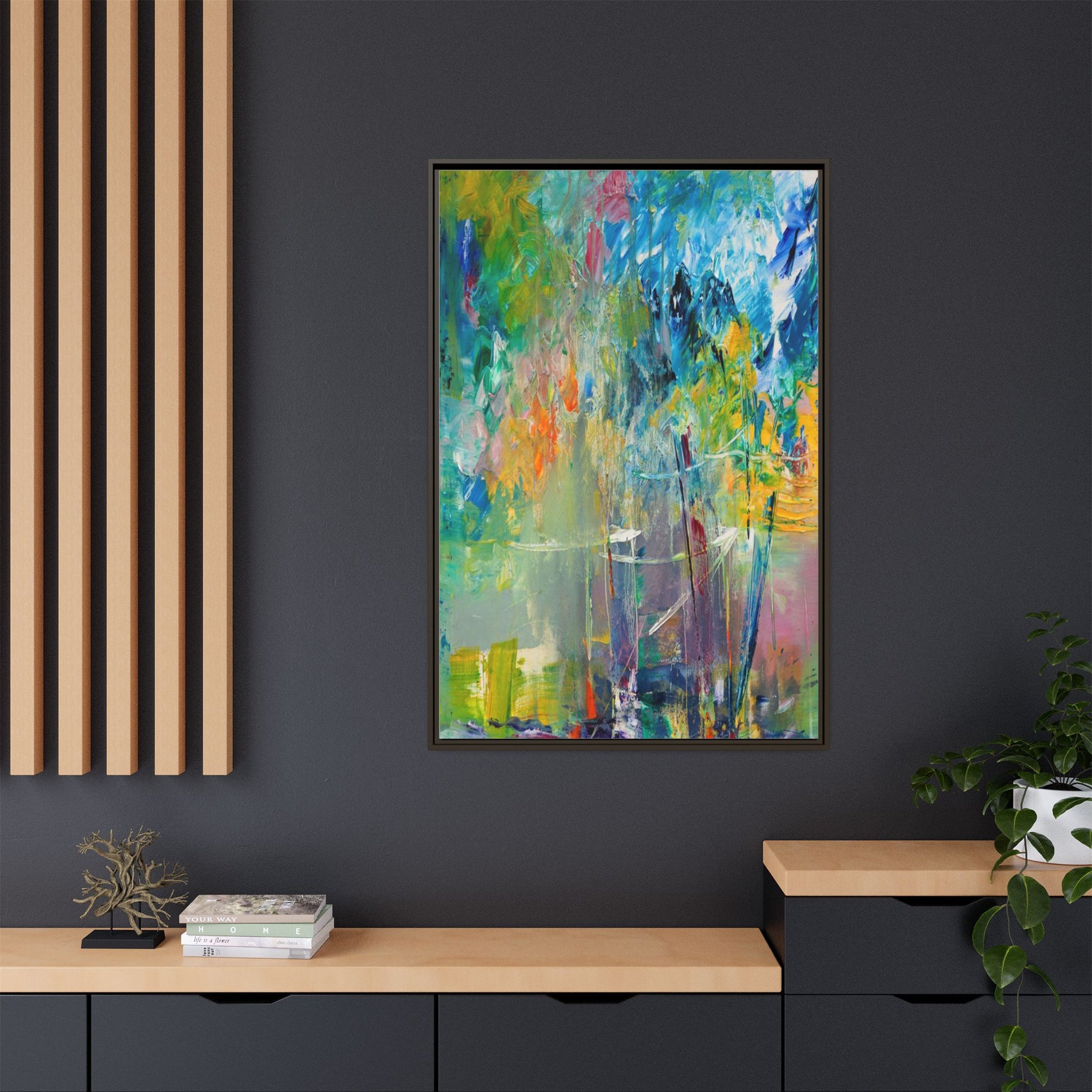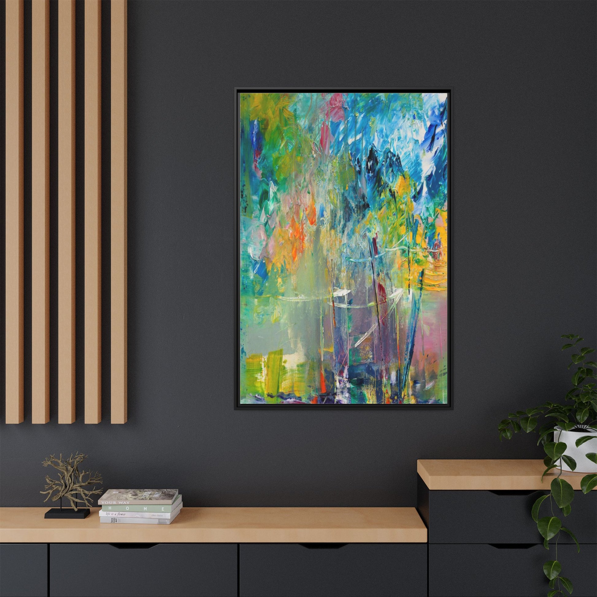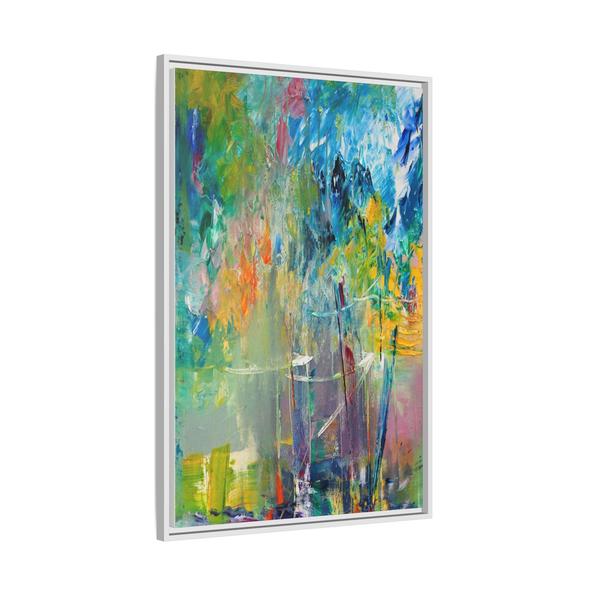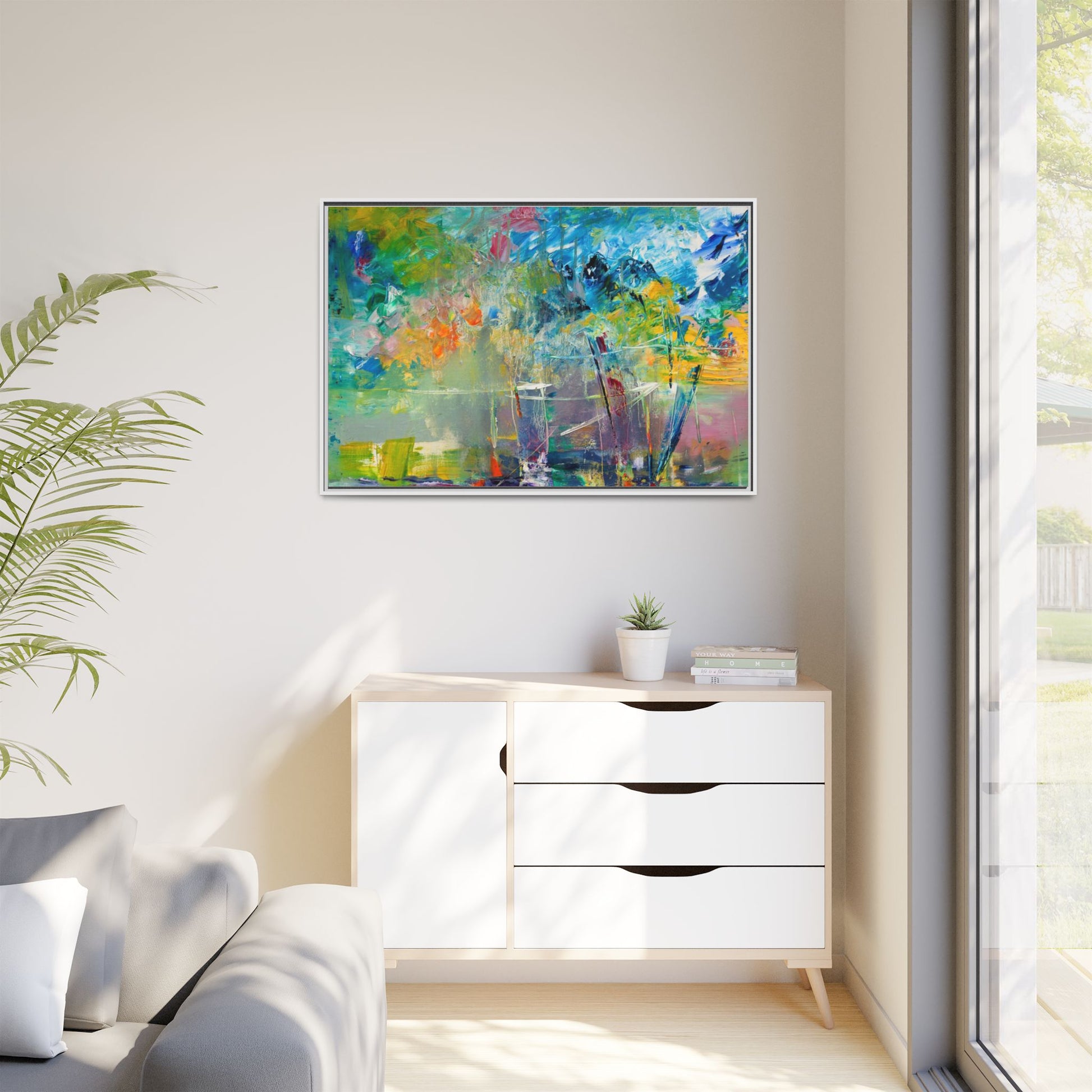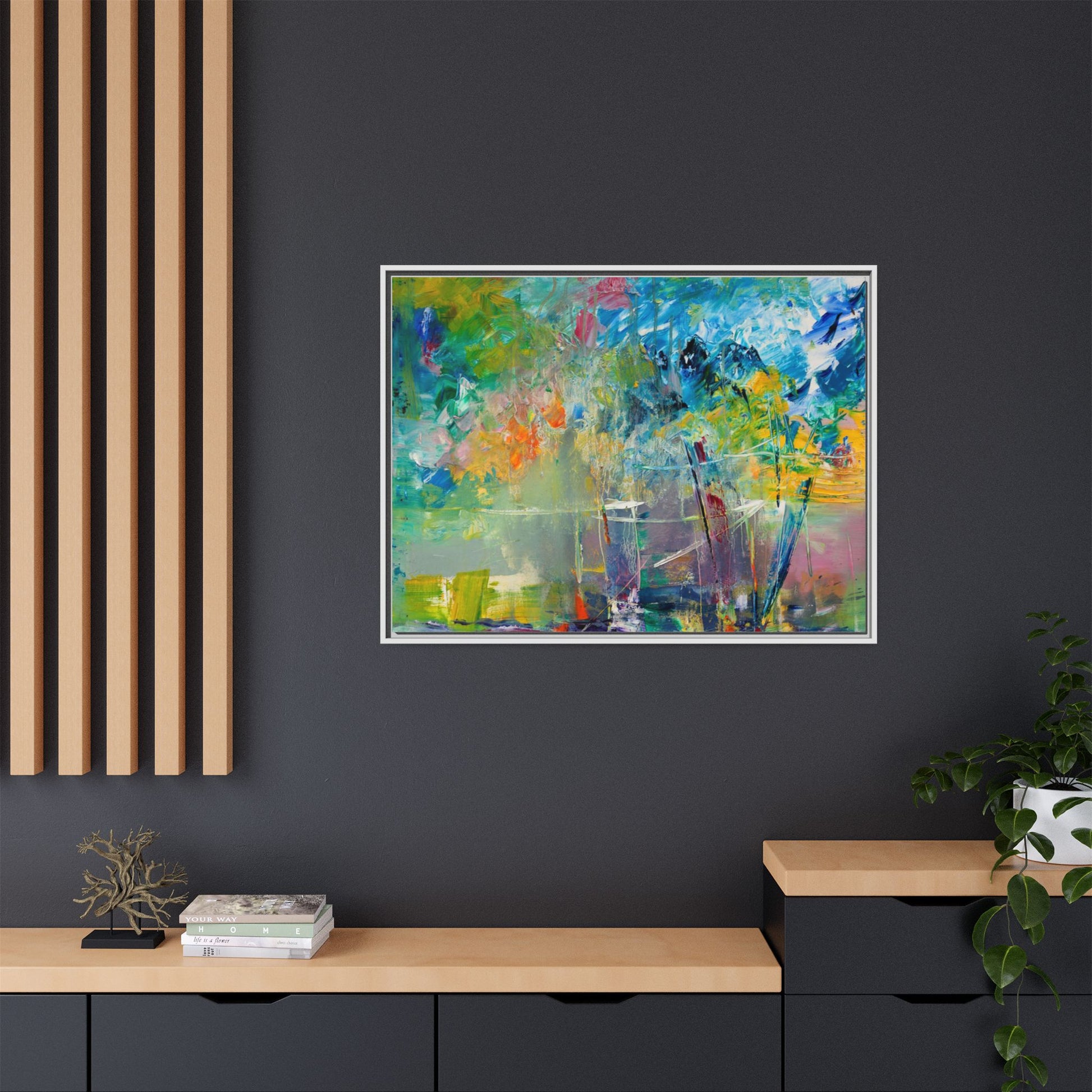This vibrant abstract painting bursts with a kaleidoscope of colors, featuring dynamic brushstrokes that create a sense of movement and energy. The artwork predominantly showcases a rich palette of blues, greens, yellows, and touches of orange and pink, blending and layering in a fluid, impressionistic style. Geometric and organic shapes emerge and dissolve throughout the composition, suggesting a landscape or seascape that has been deconstructed and reimagined through an emotional lens. Textured paint application reveals intricate details and depth, with sweeping strokes and delicate lines creating a complex visual narrative. The painting exudes a sense of spontaneity and freedom, inviting viewers to explore its intricate details and emotional resonance.
