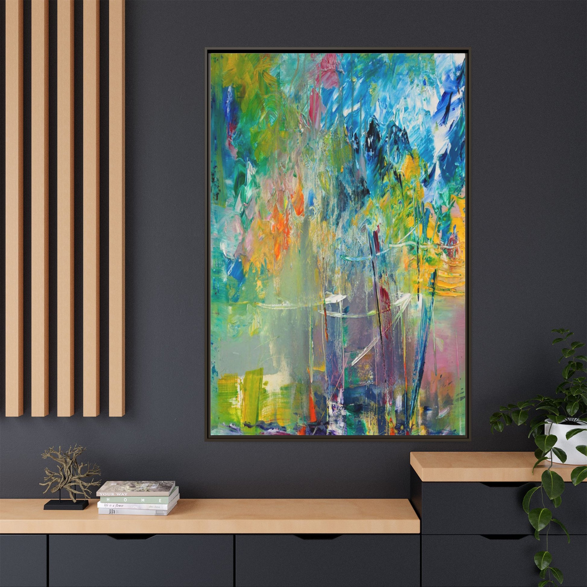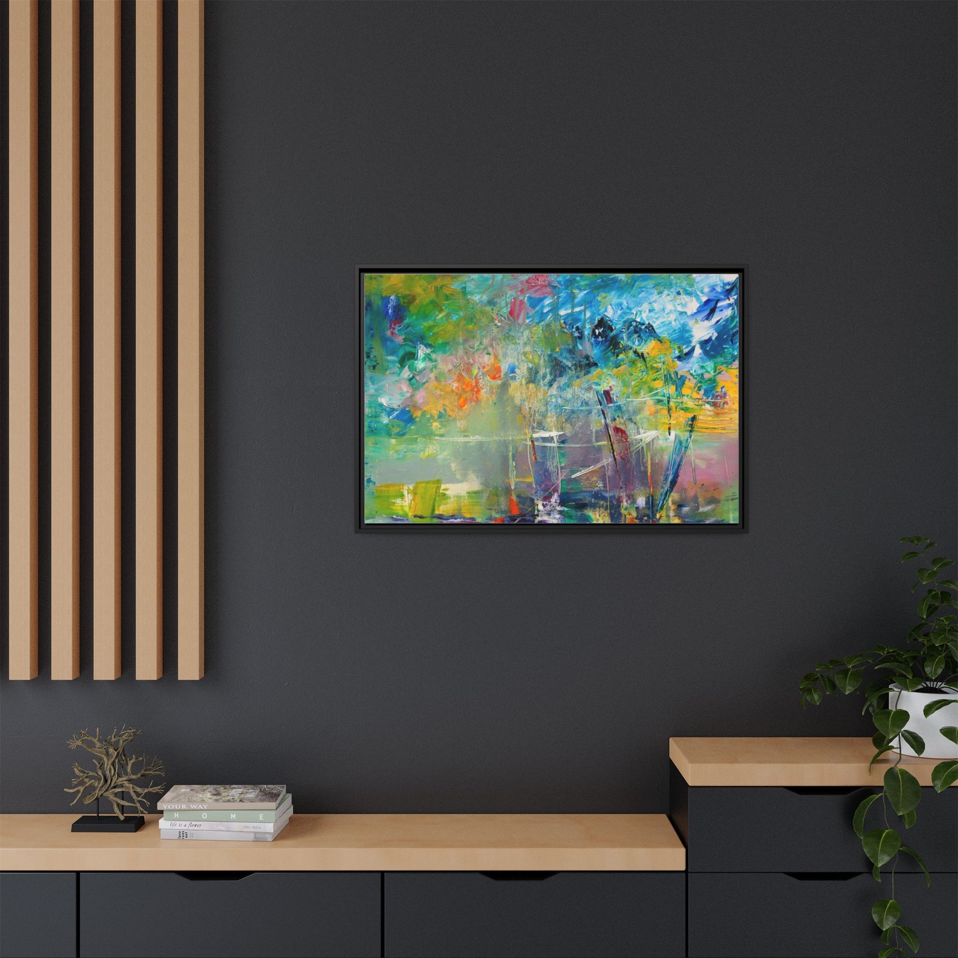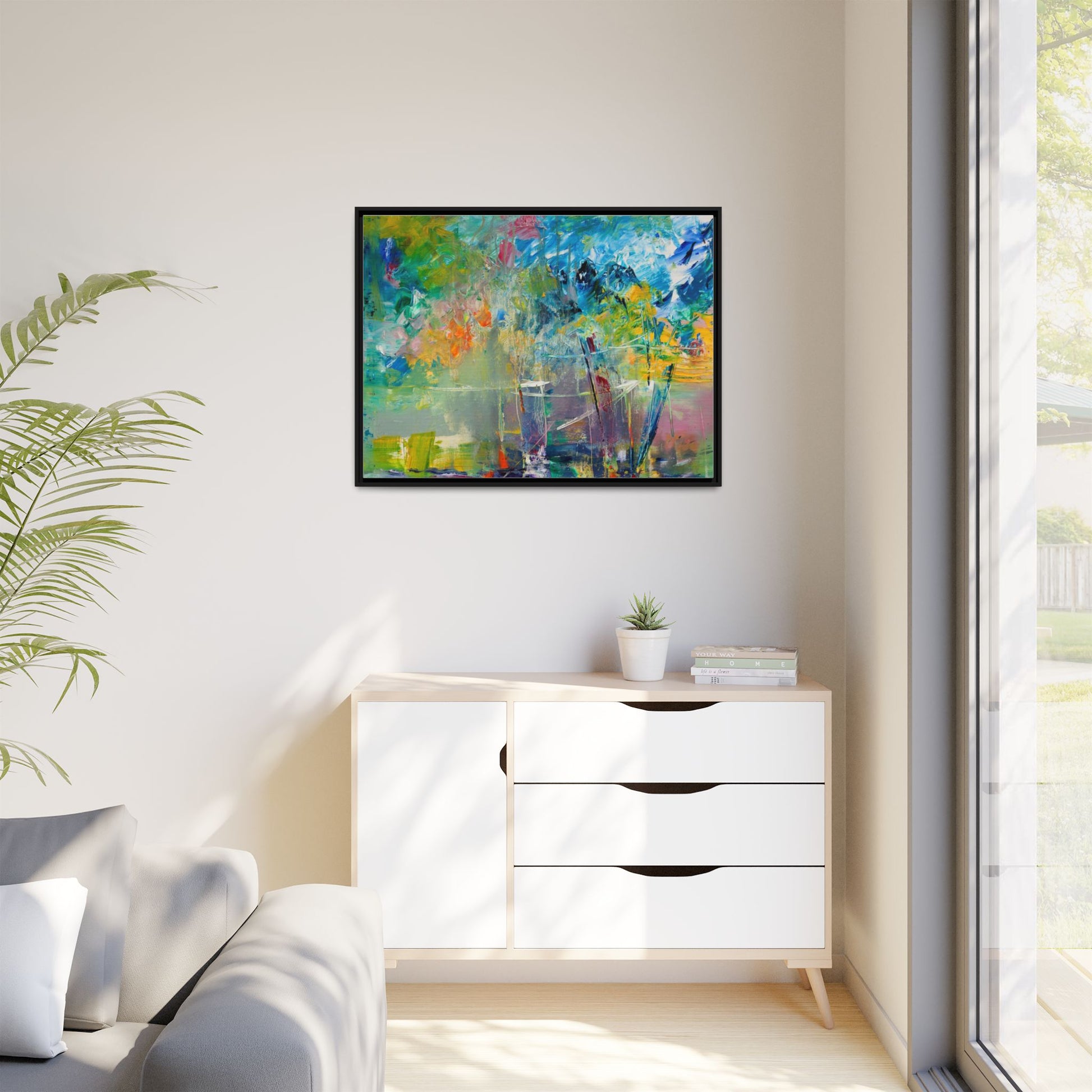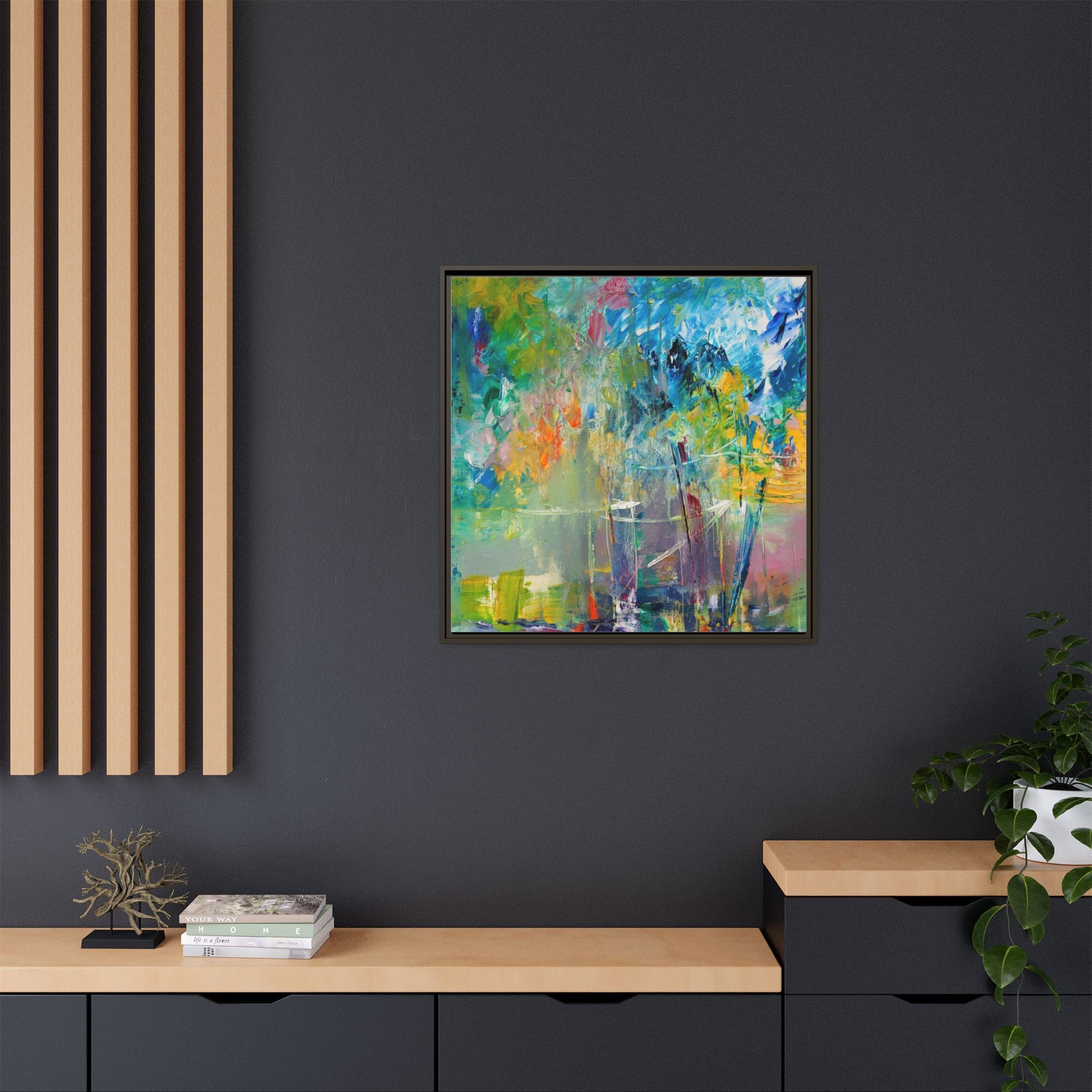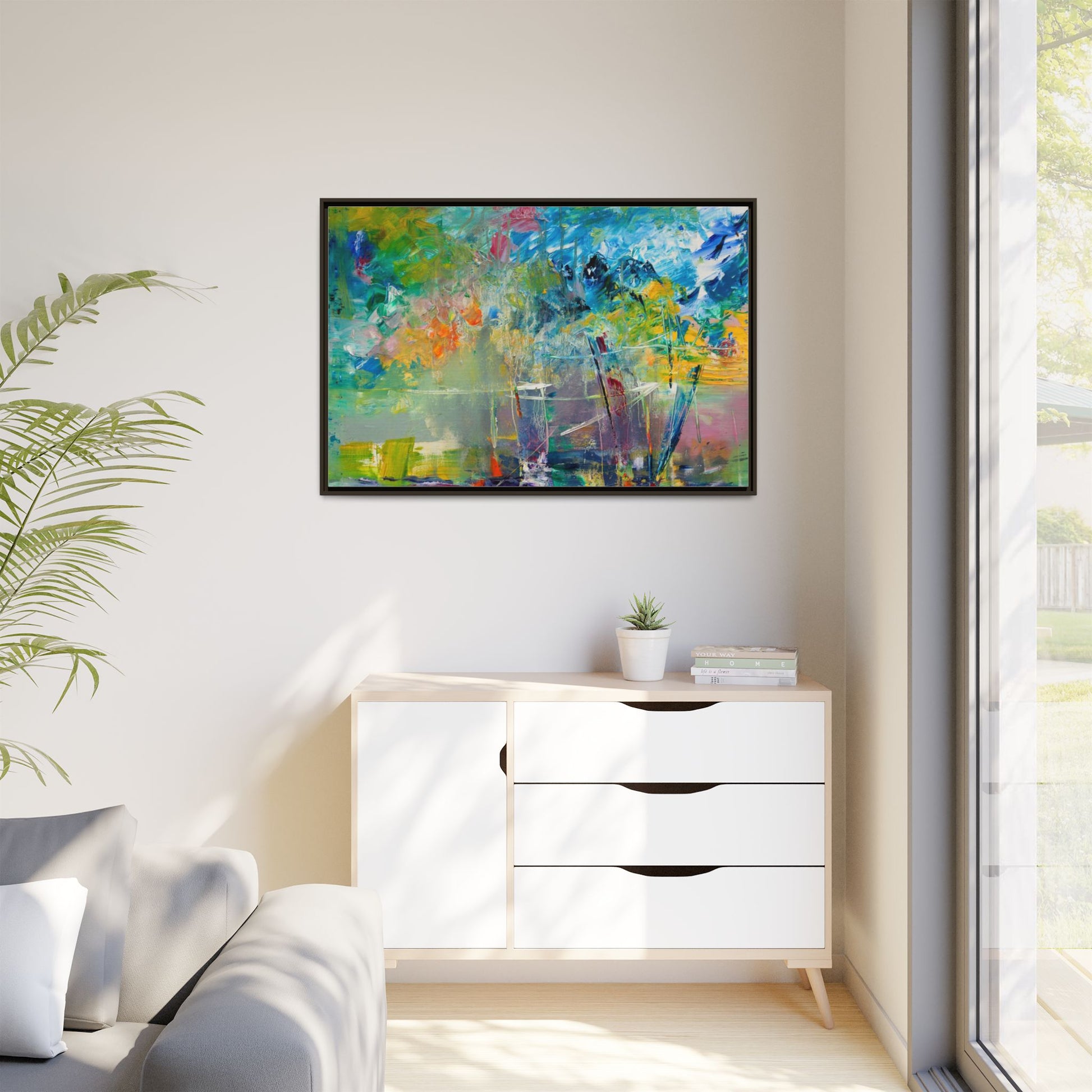 This vibrant abstract painting bursts with a kaleidoscope of colors, featuring dynamic brushstrokes that create a sense of movement and energy. The artwork predominantly showcases a rich palette of blues, greens, yellows, and touches of orange and pink, blending and layering in a fluid, impressionistic style. Geometric and organic shapes emerge and dissolve throughout the composition, suggesting a landscape or seascape that has been deconstructed and reimagined through an emotional lens. Textured paint application reveals intricate details and depth, with sweeping strokes and delicate lines creating a complex visual narrative. The painting exudes a sense of spontaneity and freedom, inviting viewers to explore its intricate details and emotional resonance.