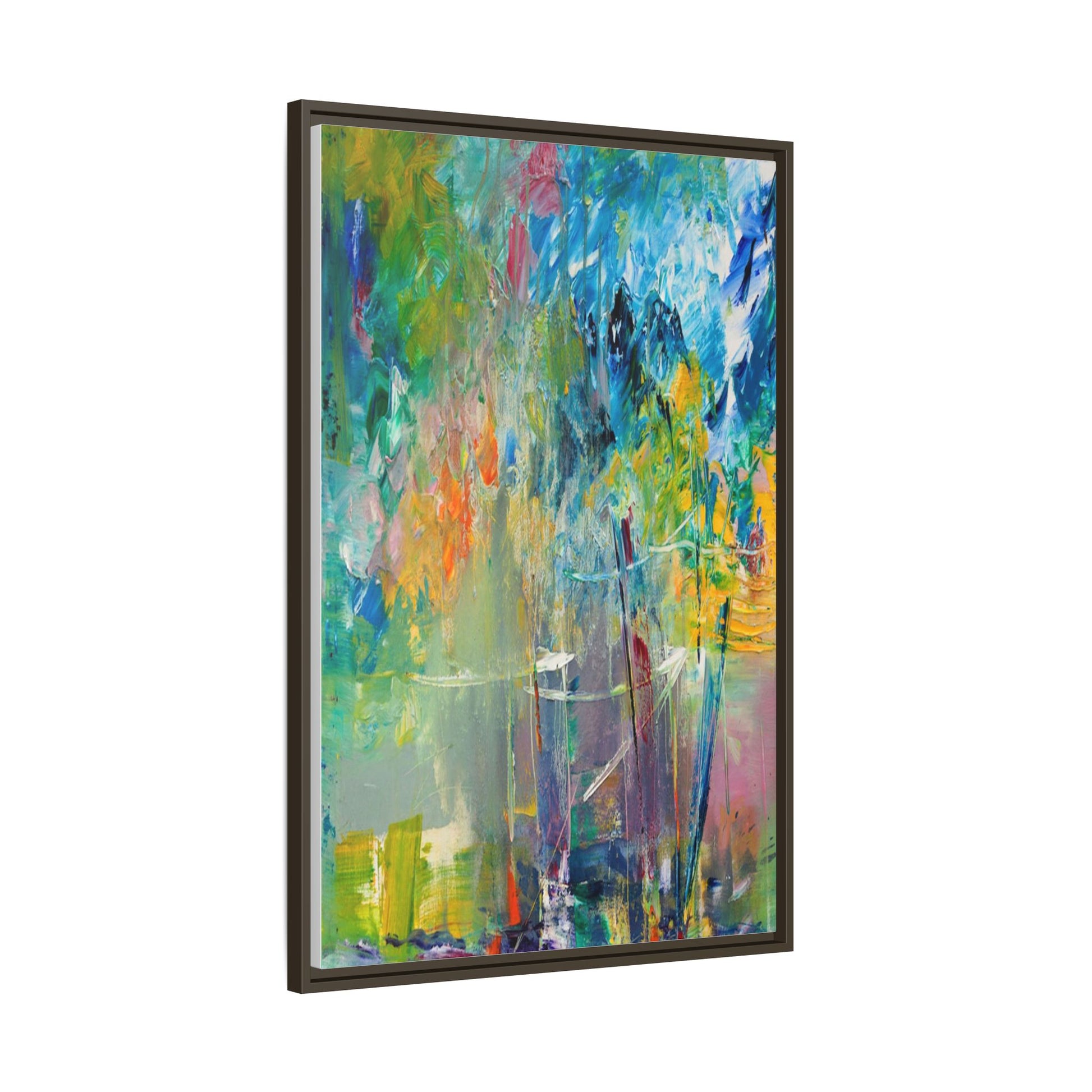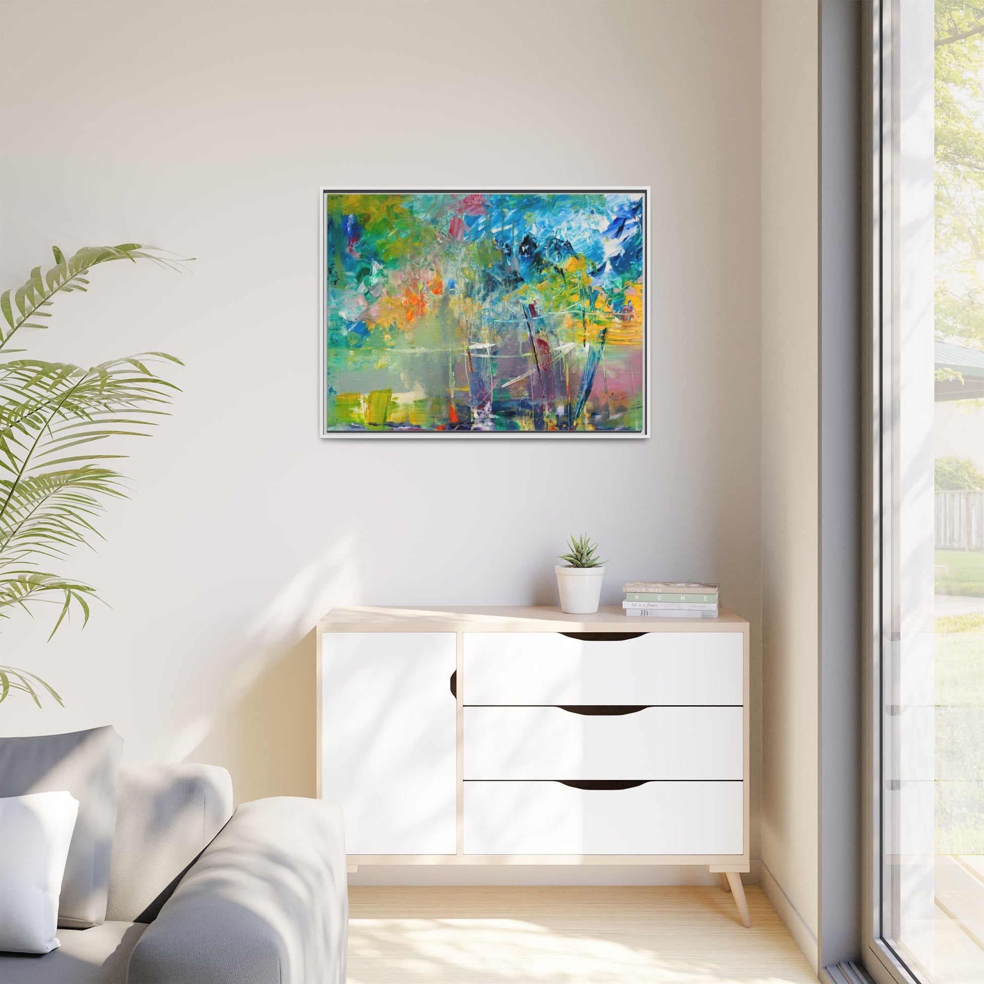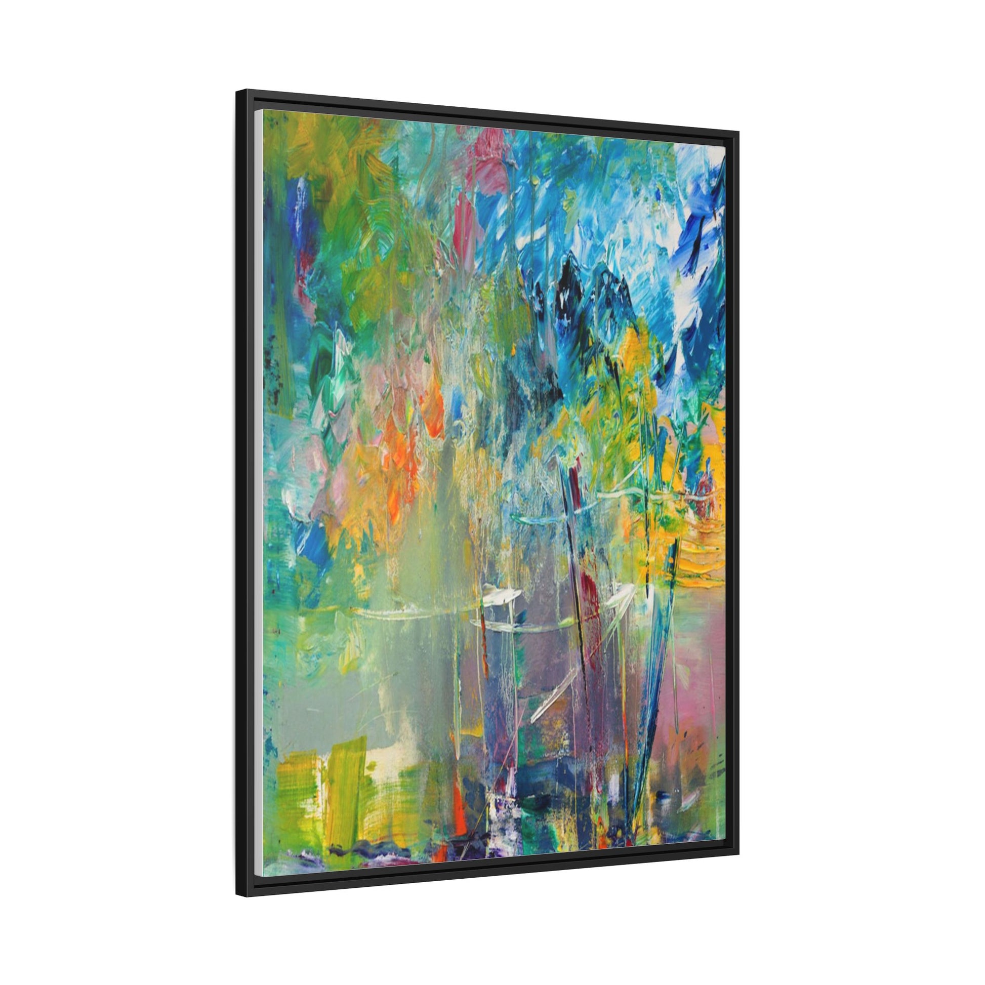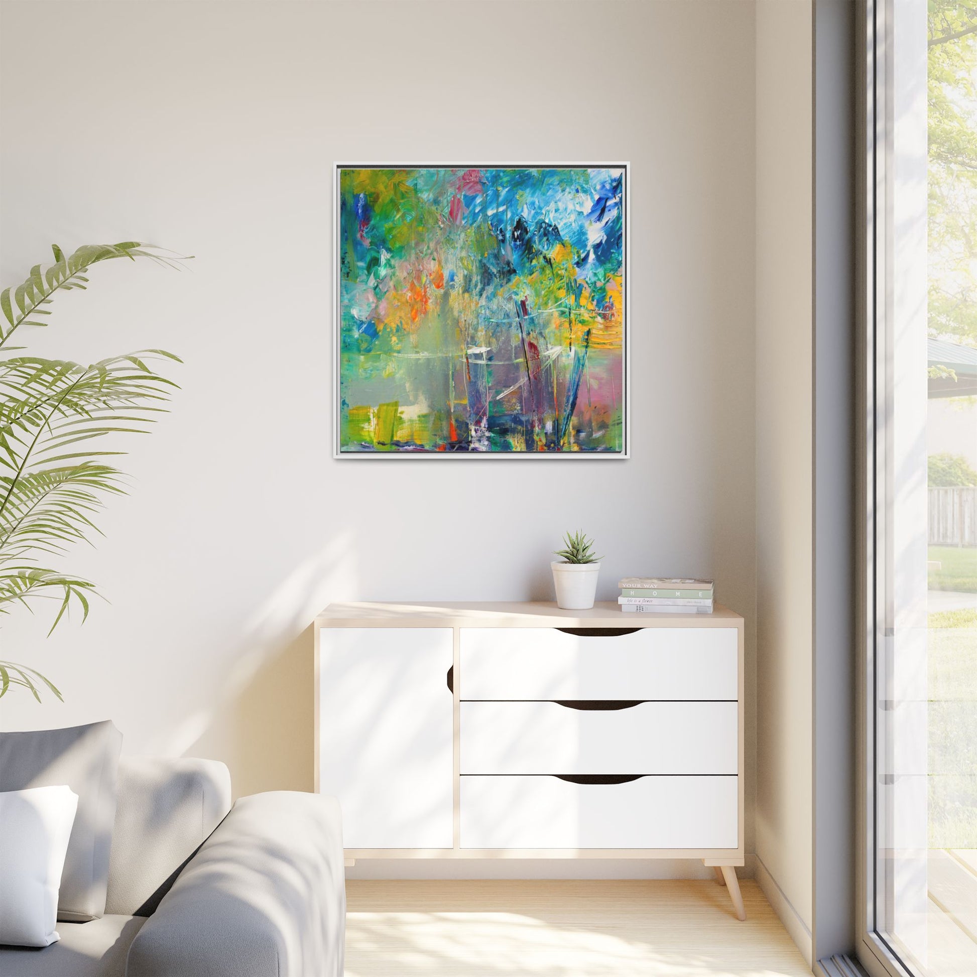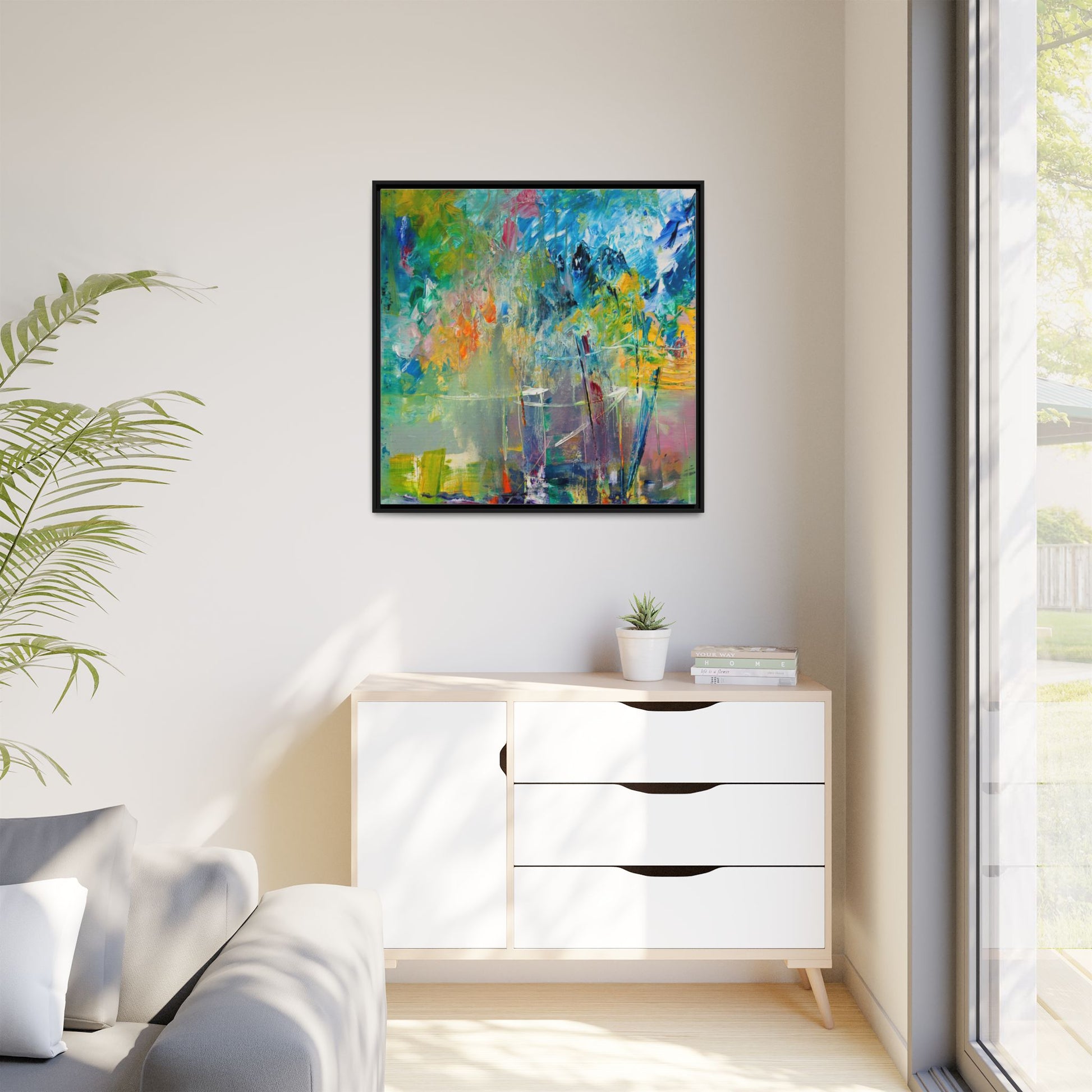 This vibrant abstract painting bursts with a kaleidoscope of colors, featuring dynamic brushstrokes that create a sense of movement and energy. The artwork predominantly showcases a rich palette of blues, greens, yellows, and touches of orange and pink, blending and layering in a fluid, impressionistic style. Geometric and organic shapes emerge and dissolve throughout the composition, suggesting a landscape or seascape that has been deconstructed and reimagined through an emotional lens. Textured paint application reveals intricate details and depth, with sweeping strokes and delicate lines creating a complex visual narrative. The painting exudes a sense of spontaneity and freedom, inviting viewers to explore its intricate details and emotional resonance.