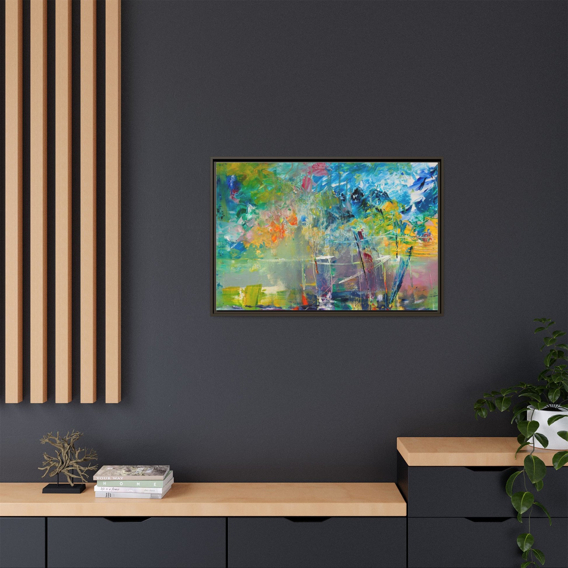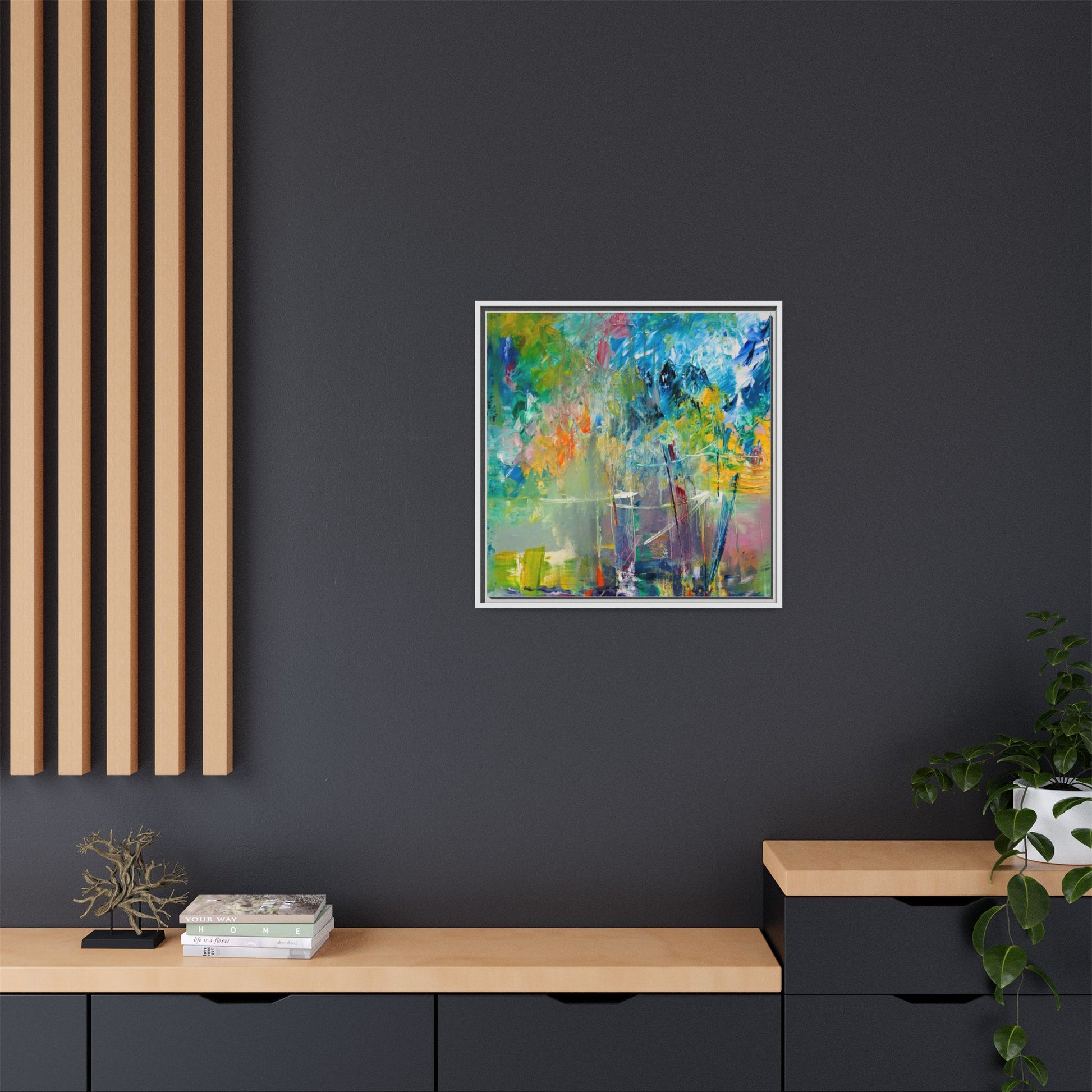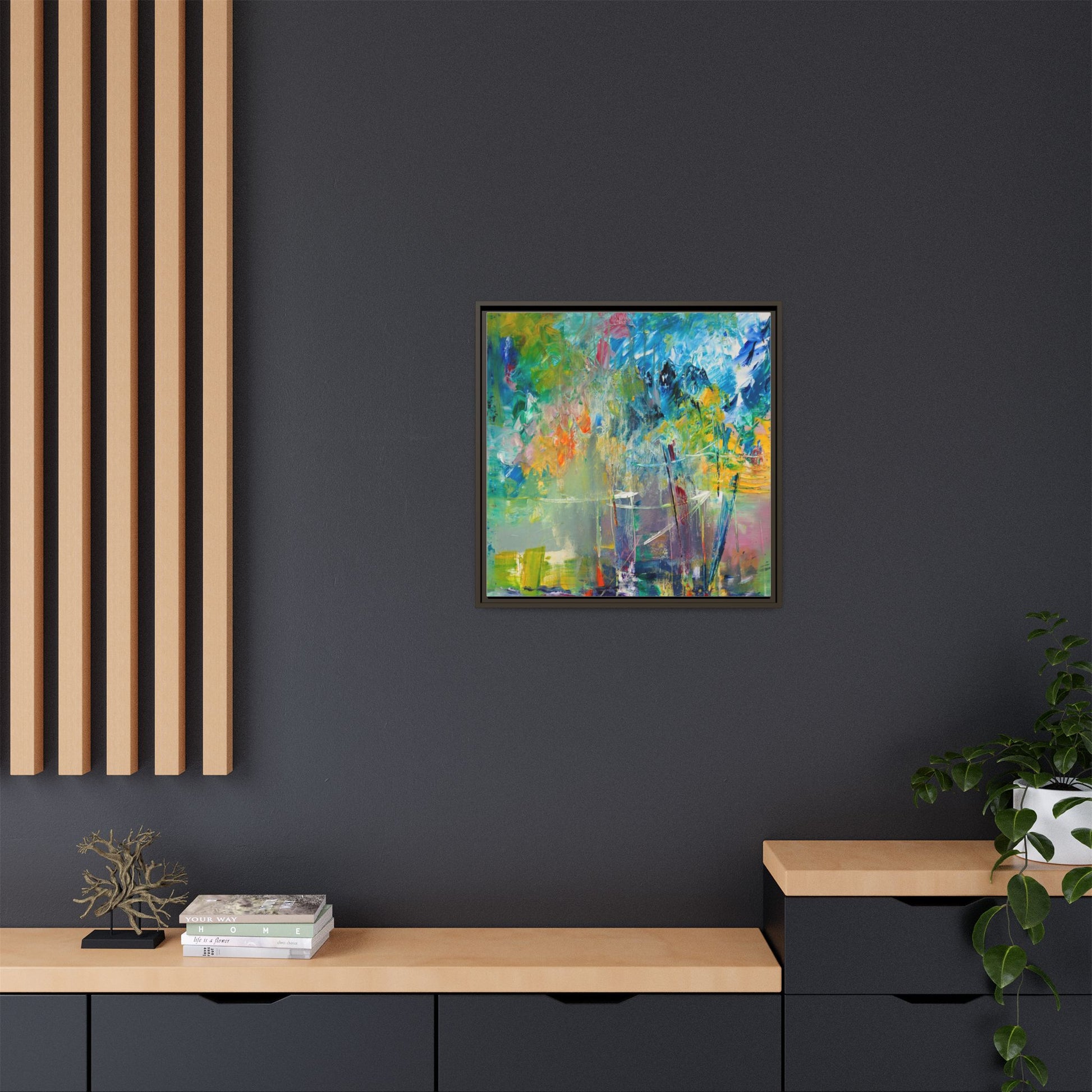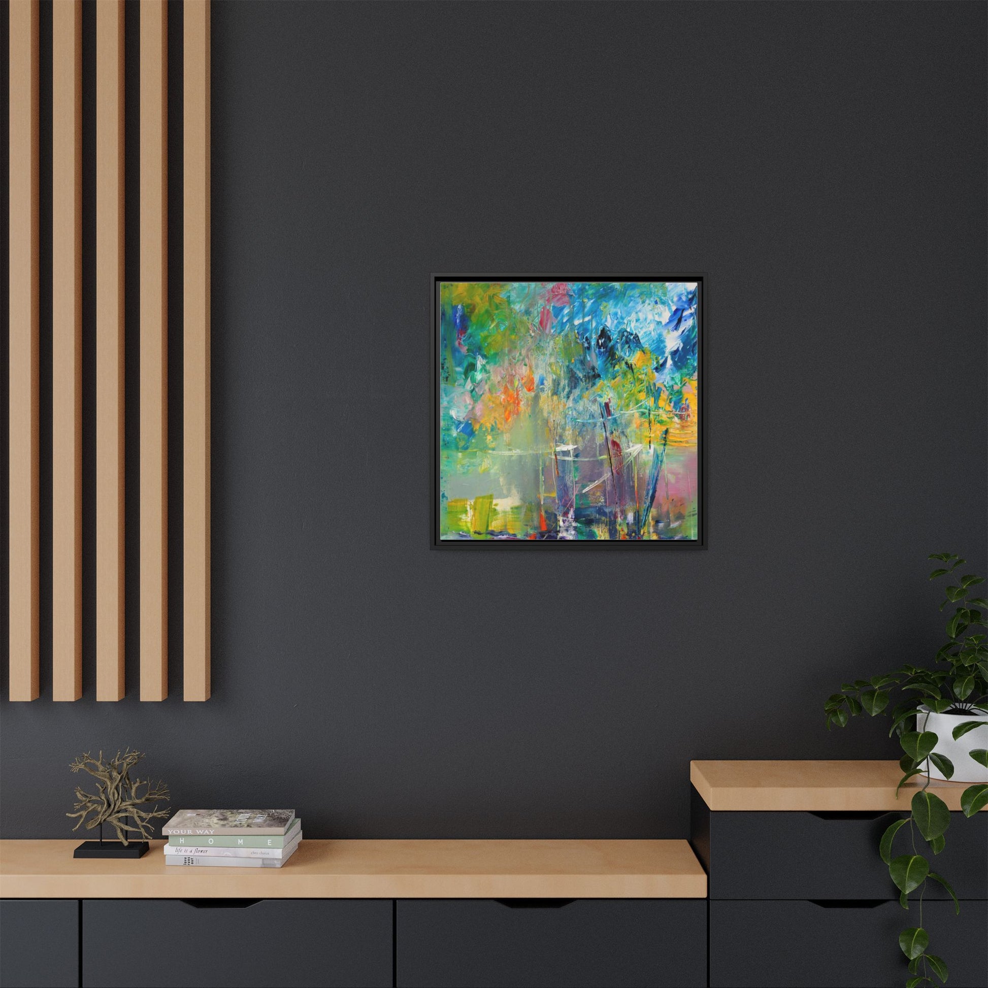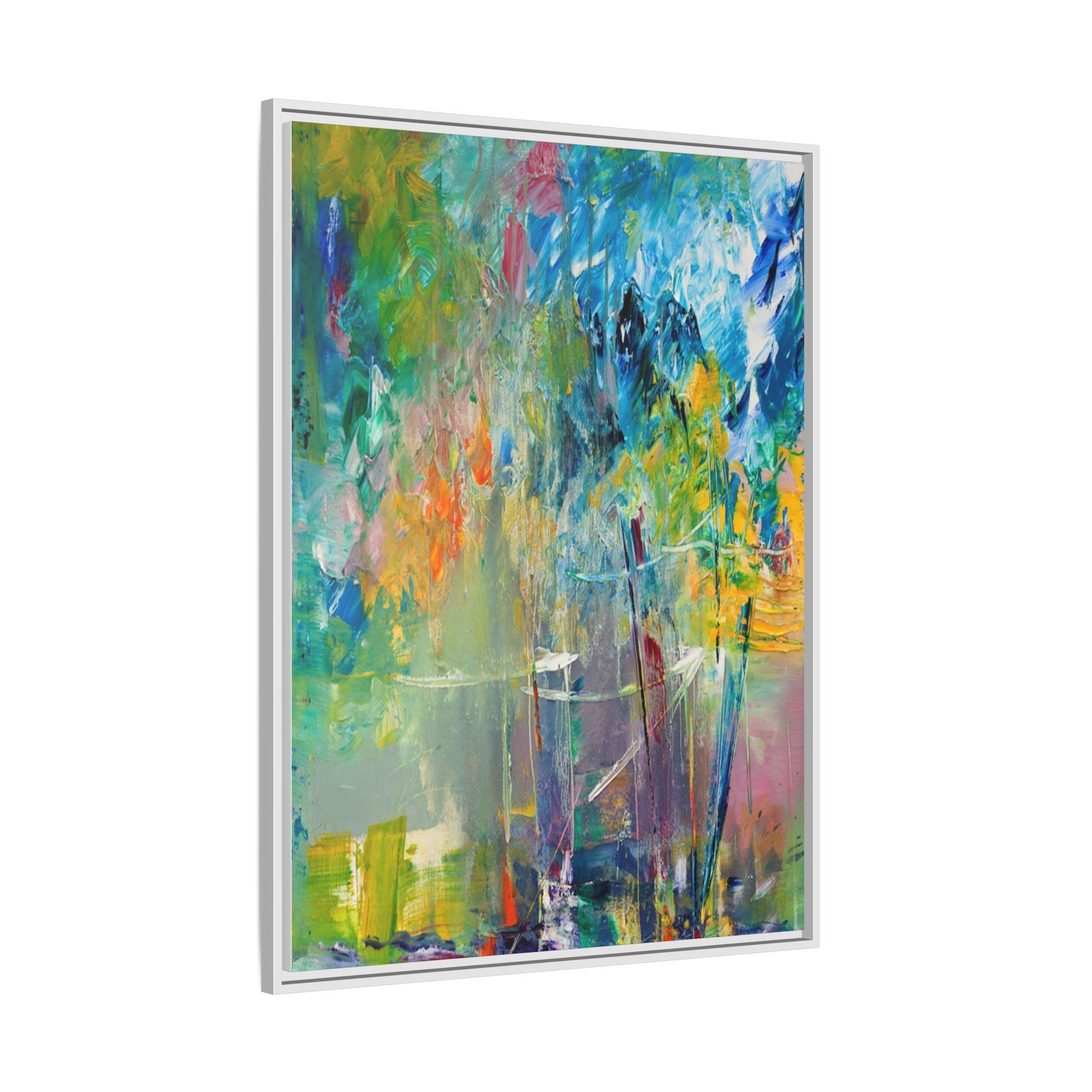 This vibrant abstract painting bursts with a kaleidoscope of colors, featuring dynamic brushstrokes that create a sense of movement and energy. The artwork predominantly showcases a rich palette of blues, greens, yellows, and touches of orange and pink, blending and layering in a fluid, impressionistic style. Geometric and organic shapes emerge and dissolve throughout the composition, suggesting a landscape or seascape that has been deconstructed and reimagined through an emotional lens. Textured paint application reveals intricate details and depth, with sweeping strokes and delicate lines creating a complex visual narrative. The painting exudes a sense of spontaneity and freedom, inviting viewers to explore its intricate details and emotional resonance.