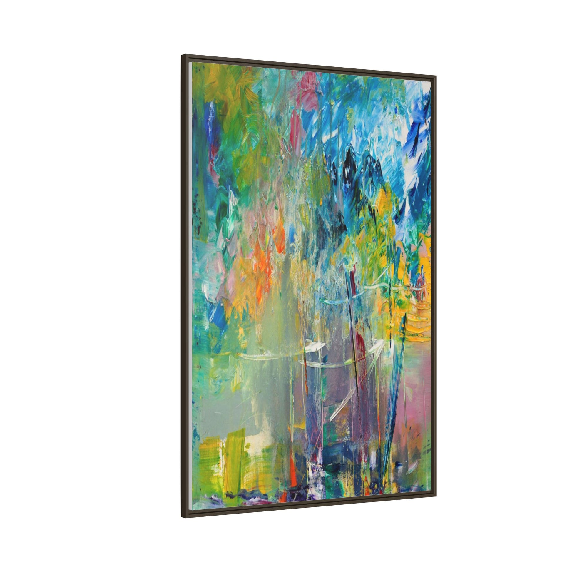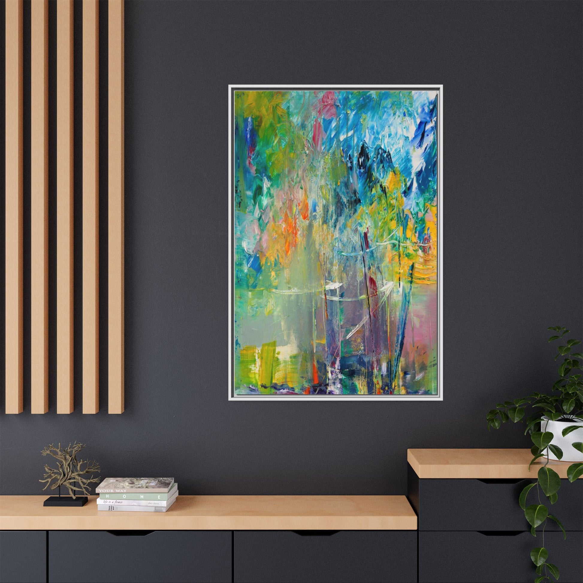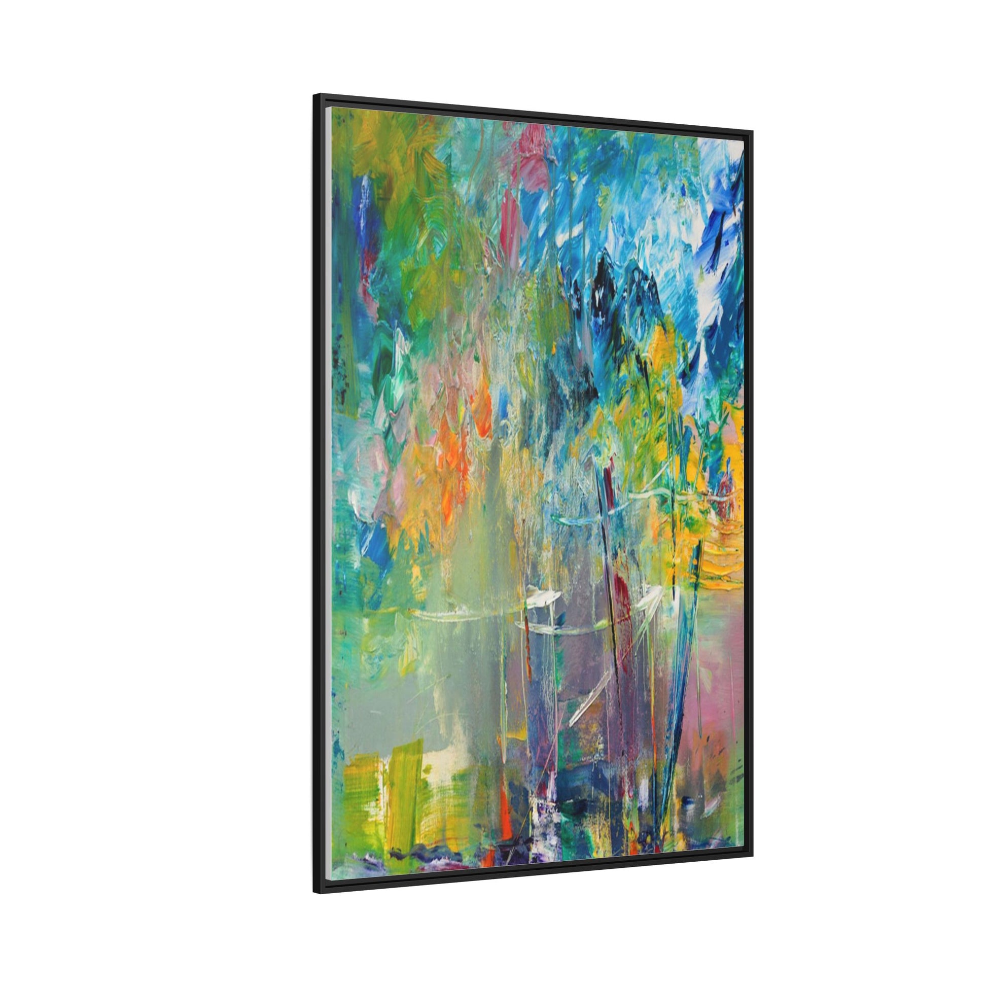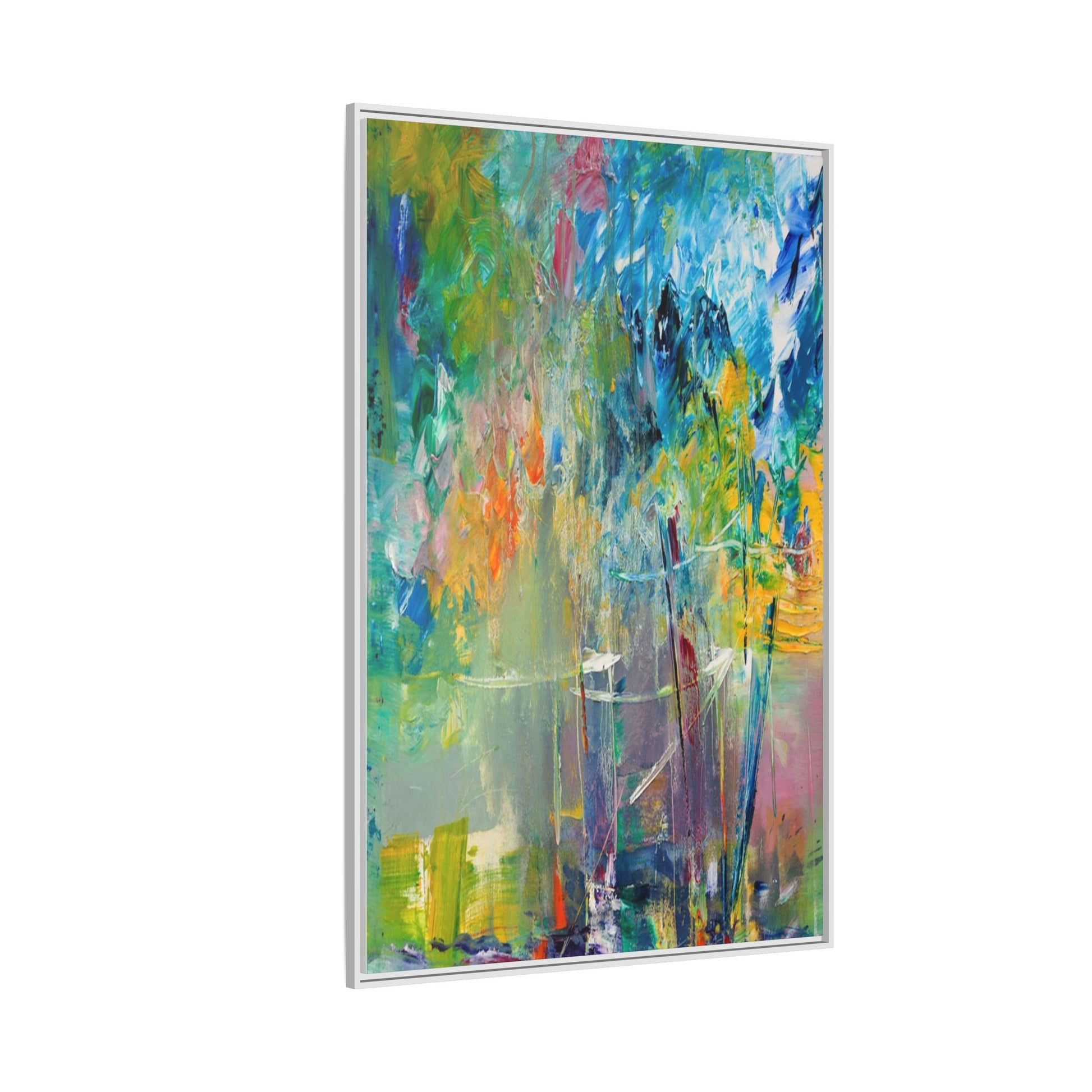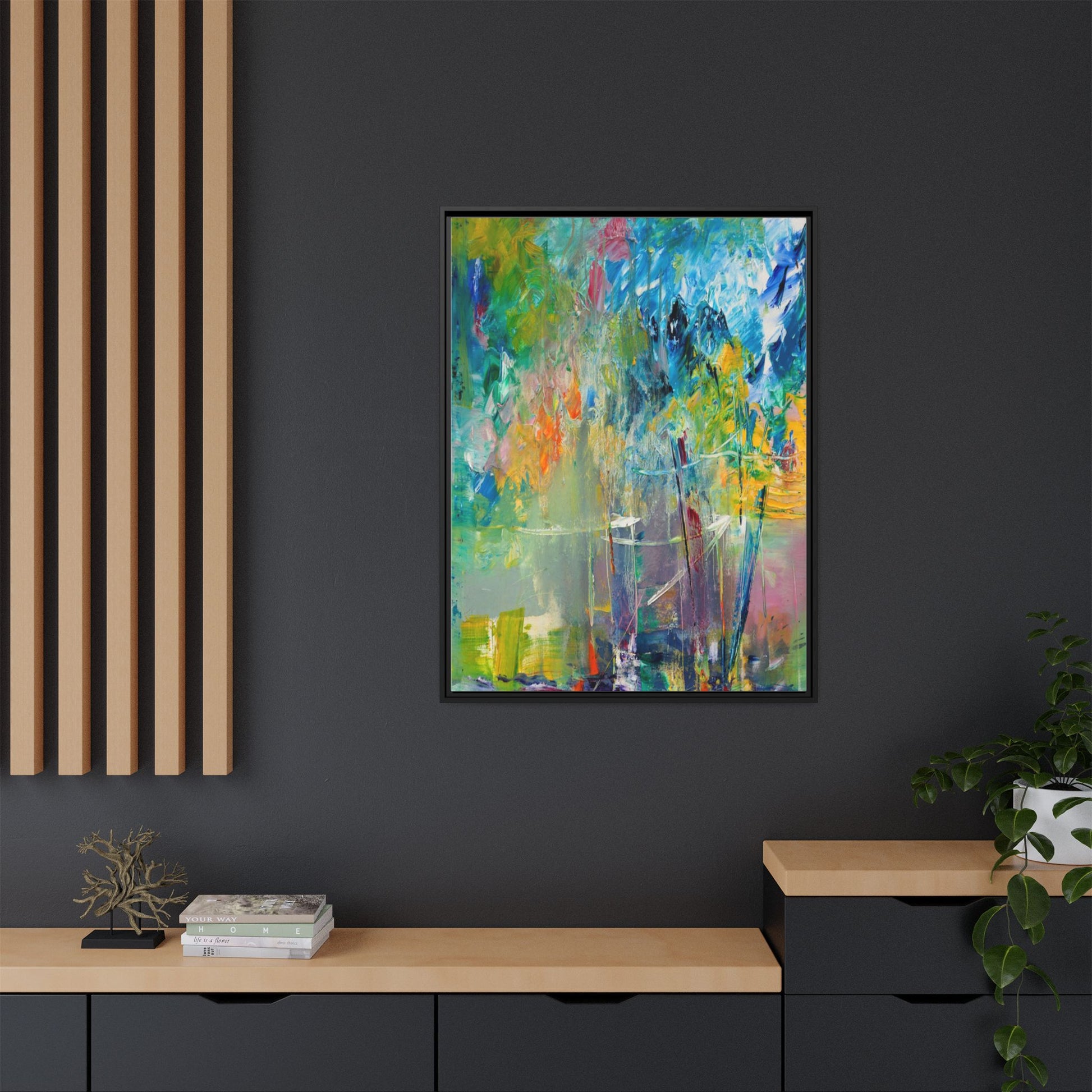 This vibrant abstract painting bursts with a kaleidoscope of colors, featuring dynamic brushstrokes that create a sense of movement and energy. The artwork predominantly showcases a rich palette of blues, greens, yellows, and touches of orange and pink, blending and layering in a fluid, impressionistic style. Geometric and organic shapes emerge and dissolve throughout the composition, suggesting a landscape or seascape that has been deconstructed and reimagined through an emotional lens. Textured paint application reveals intricate details and depth, with sweeping strokes and delicate lines creating a complex visual narrative. The painting exudes a sense of spontaneity and freedom, inviting viewers to explore its intricate details and emotional resonance.