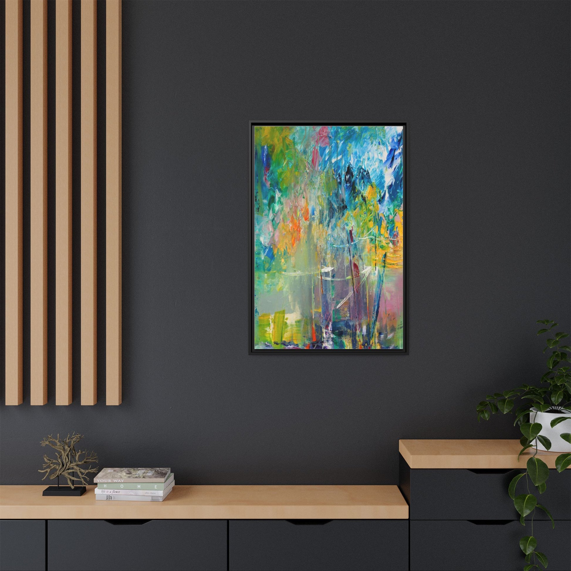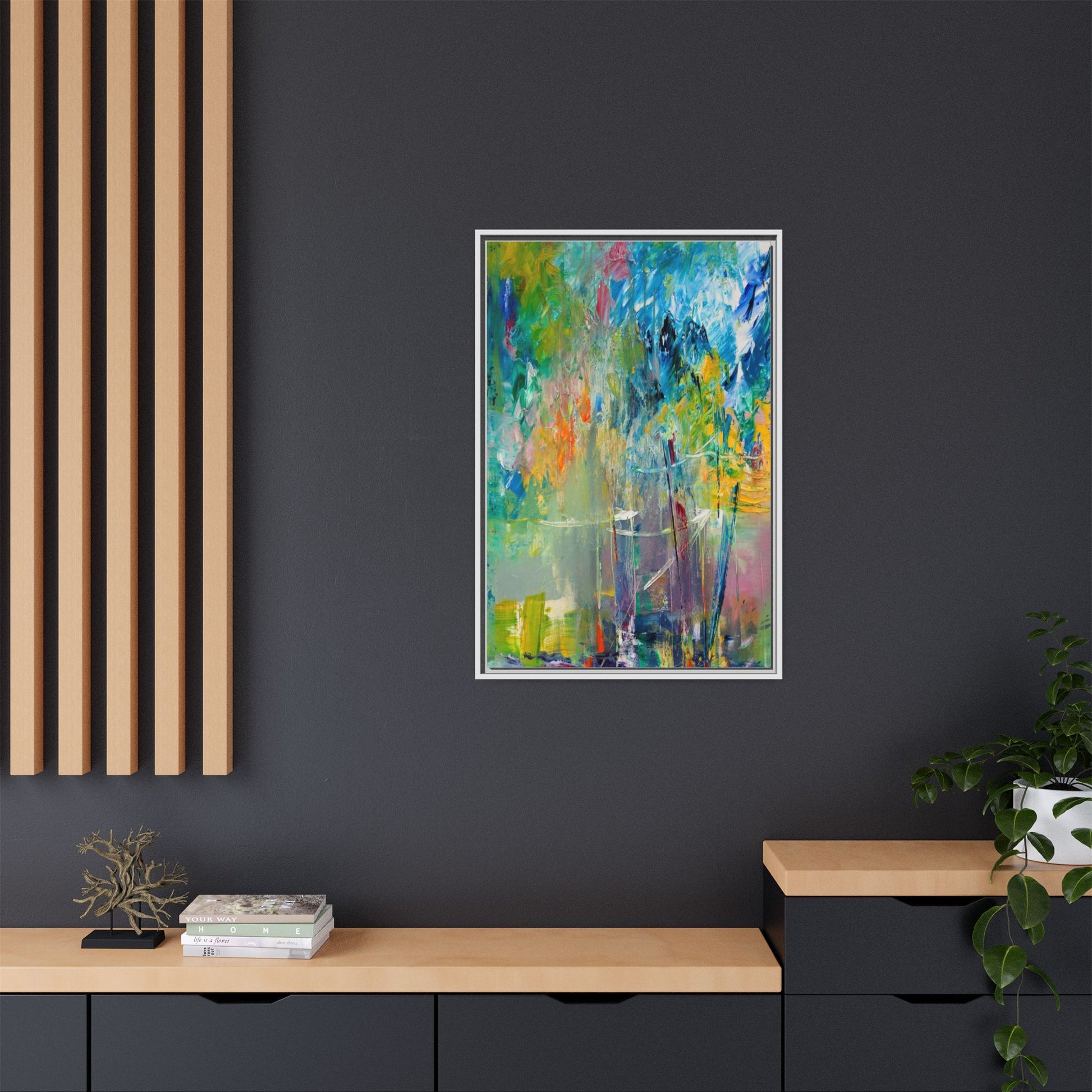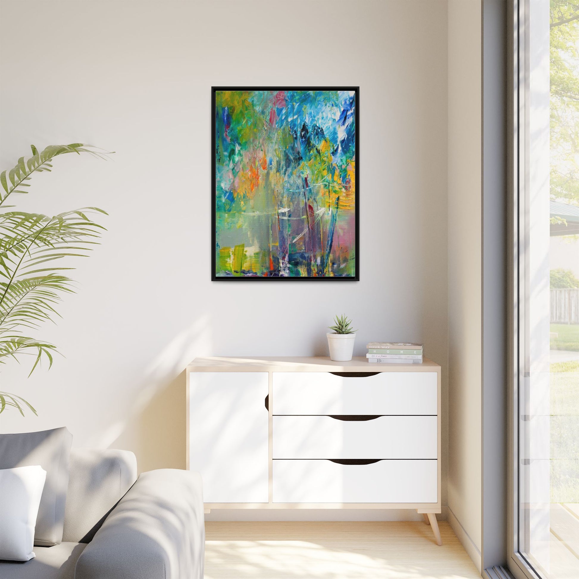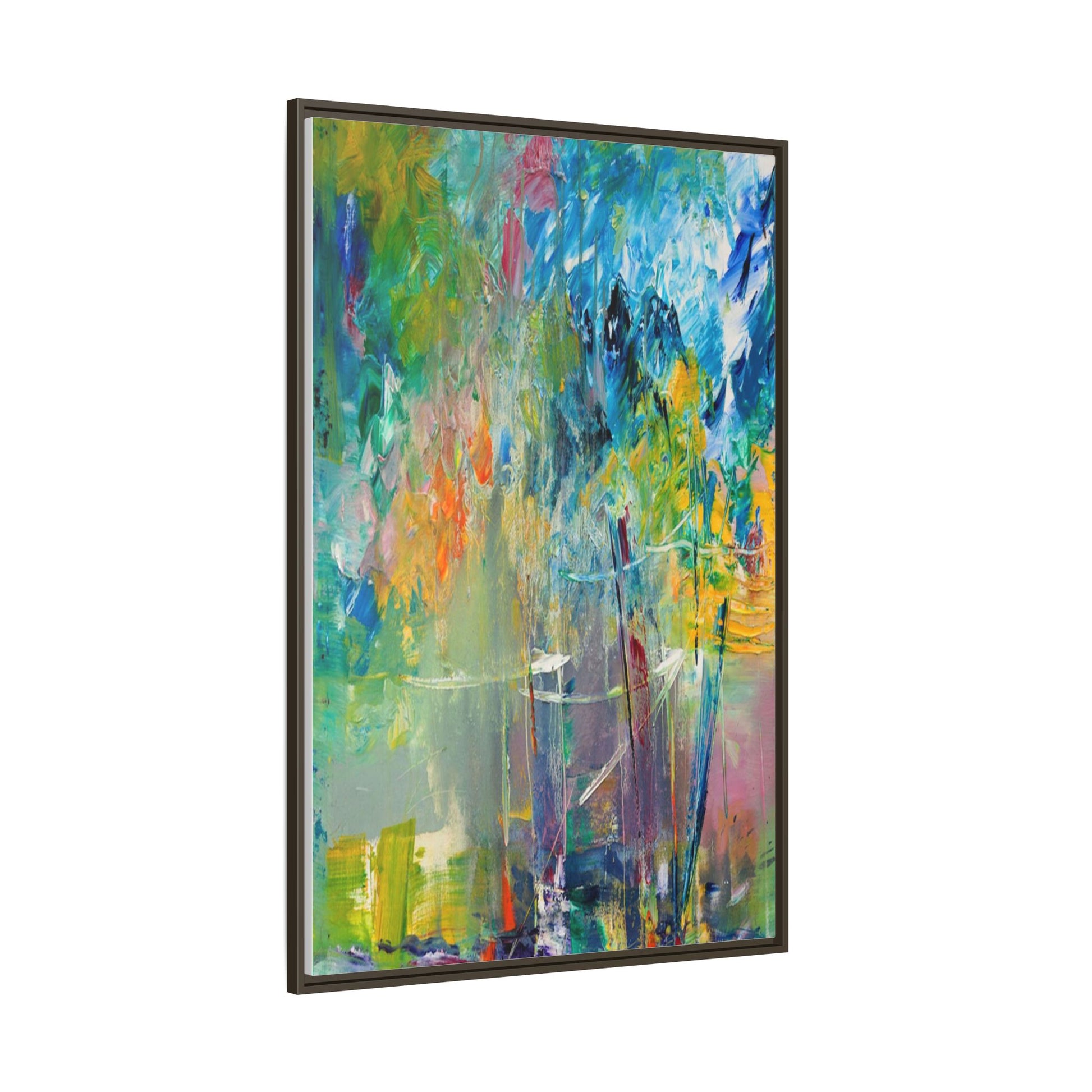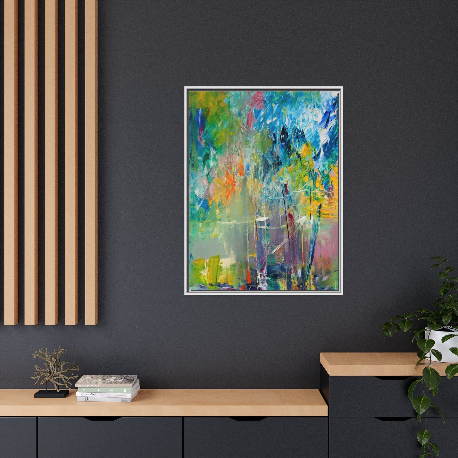 This vibrant abstract painting bursts with a kaleidoscope of colors, featuring dynamic brushstrokes that create a sense of movement and energy. The artwork predominantly showcases a rich palette of blues, greens, yellows, and touches of orange and pink, blending and layering in a fluid, impressionistic style. Geometric and organic shapes emerge and dissolve throughout the composition, suggesting a landscape or seascape that has been deconstructed and reimagined through an emotional lens. Textured paint application reveals intricate details and depth, with sweeping strokes and delicate lines creating a complex visual narrative. The painting exudes a sense of spontaneity and freedom, inviting viewers to explore its intricate details and emotional resonance.