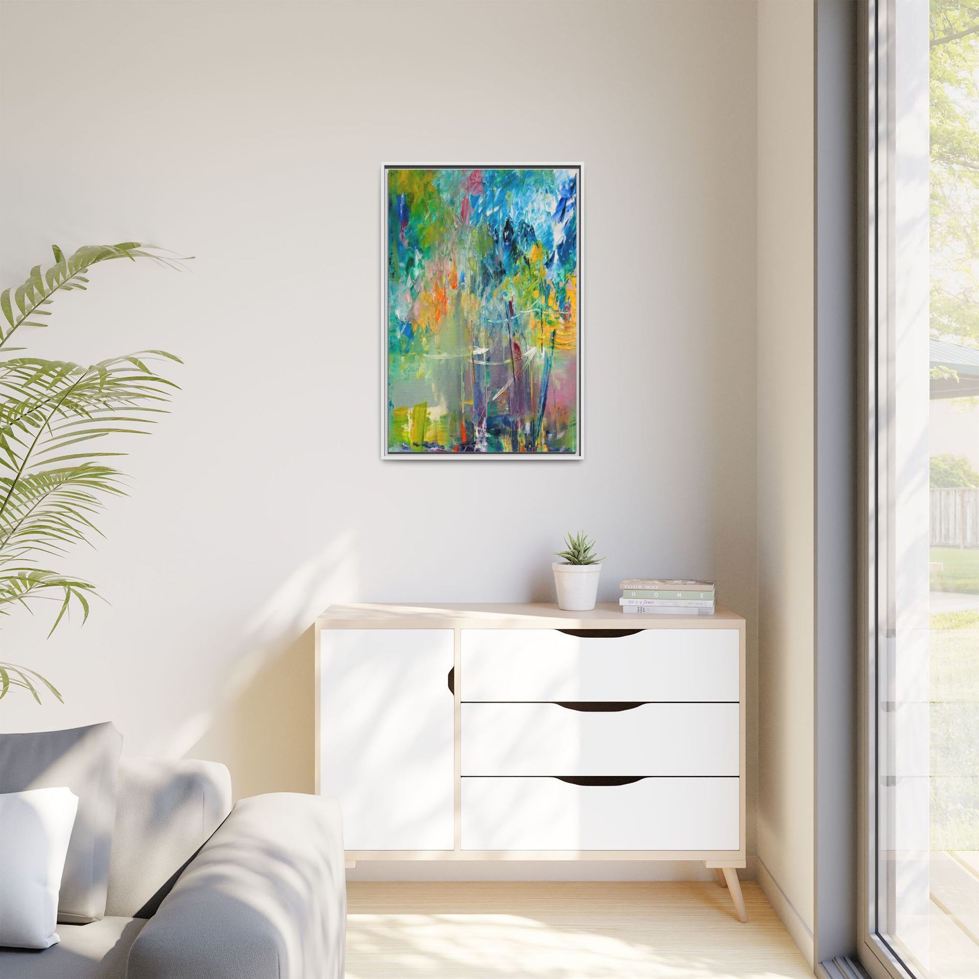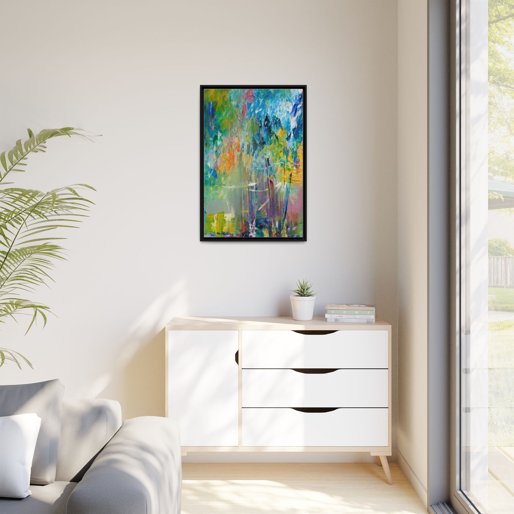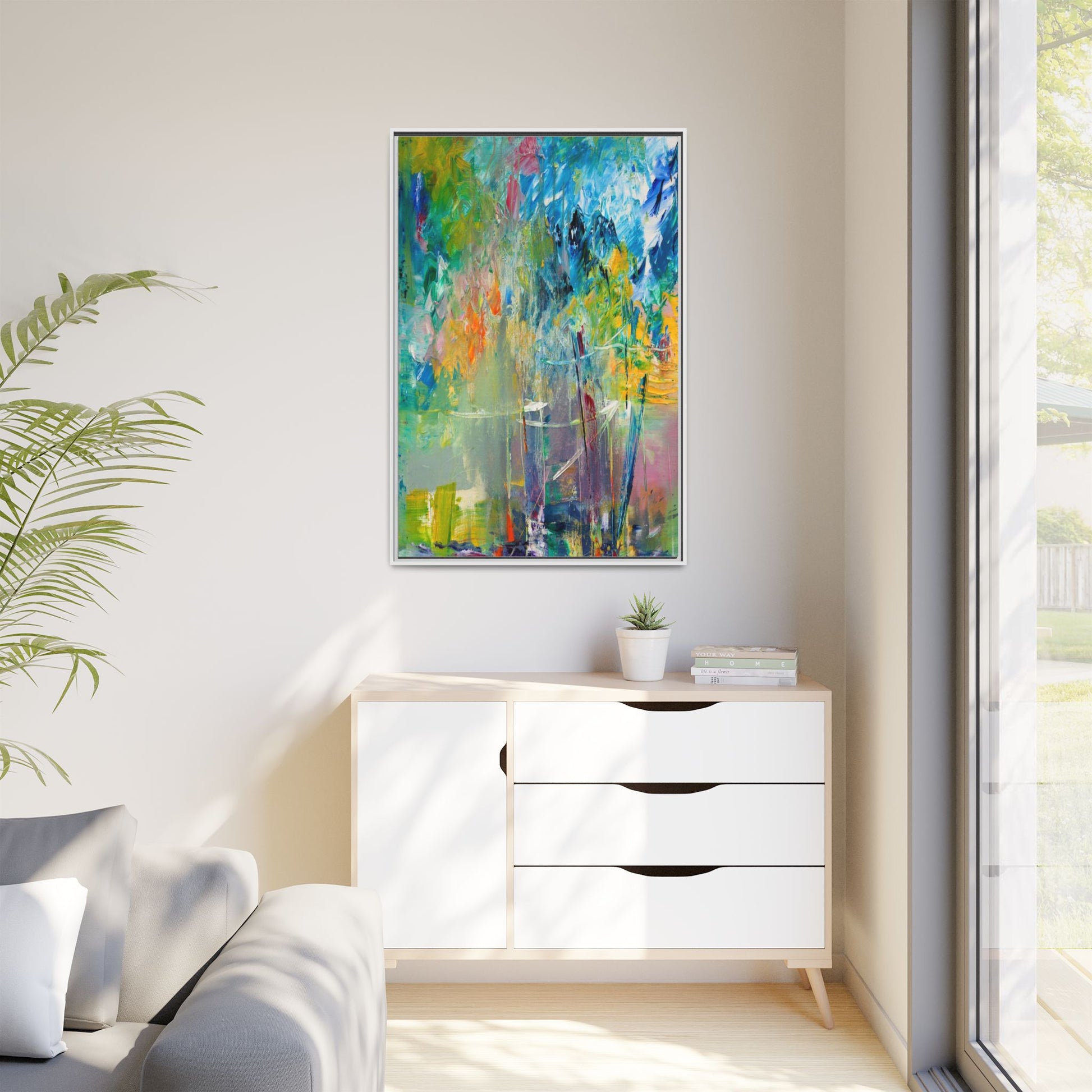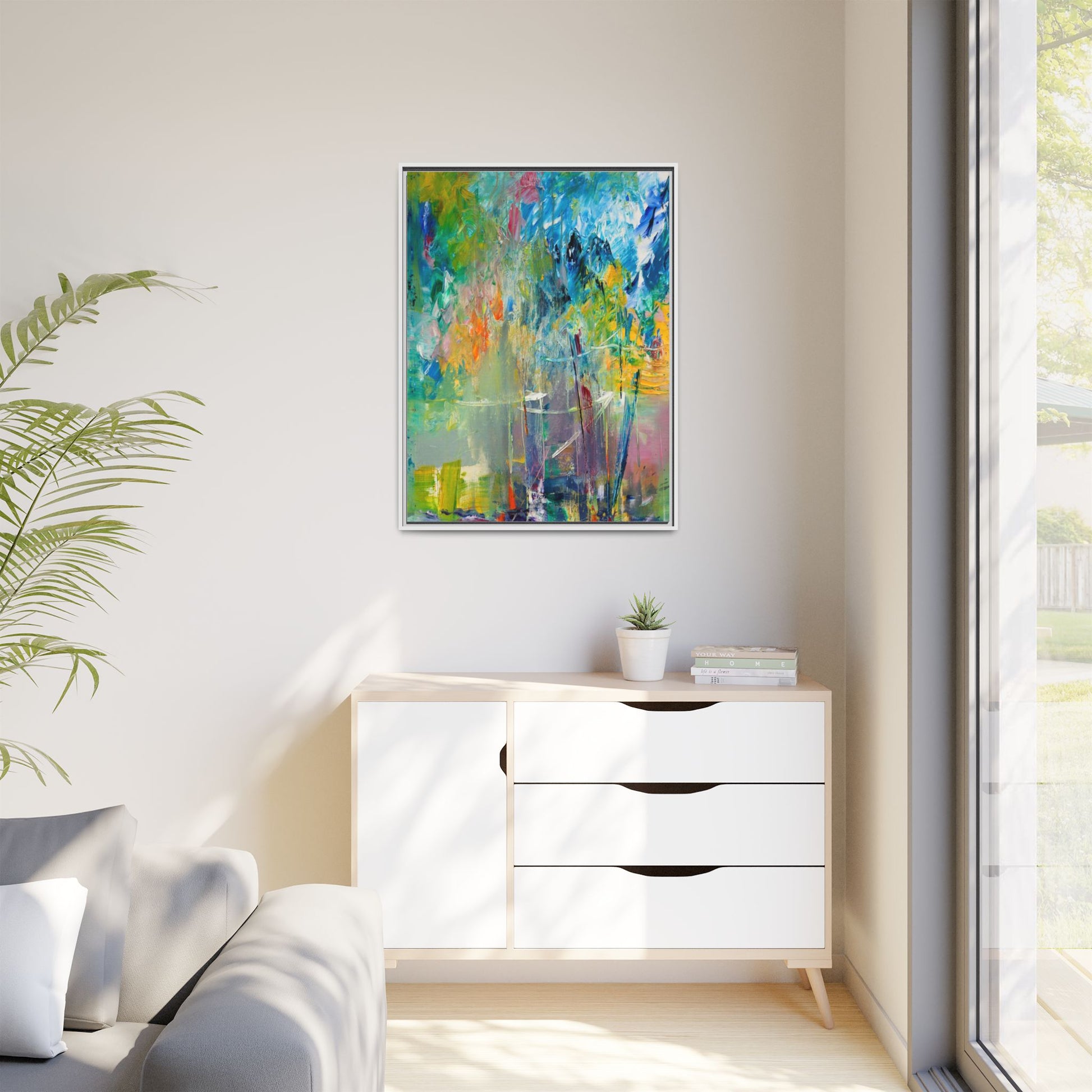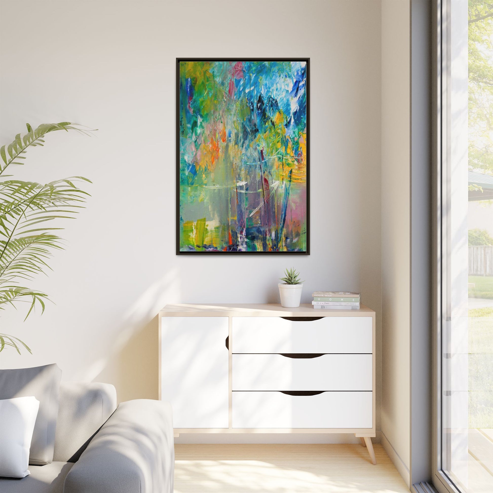 This vibrant abstract painting bursts with a kaleidoscope of colors, featuring dynamic brushstrokes that create a sense of movement and energy. The artwork predominantly showcases a rich palette of blues, greens, yellows, and touches of orange and pink, blending and layering in a fluid, impressionistic style. Geometric and organic shapes emerge and dissolve throughout the composition, suggesting a landscape or seascape that has been deconstructed and reimagined through an emotional lens. Textured paint application reveals intricate details and depth, with sweeping strokes and delicate lines creating a complex visual narrative. The painting exudes a sense of spontaneity and freedom, inviting viewers to explore its intricate details and emotional resonance.
