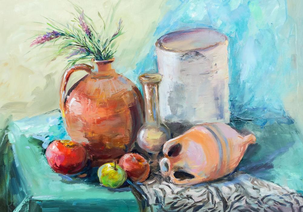 Earthen vessels and ripe fruits bask in a serene interplay of light and shadow, whispering tales of rustic harmony and age-old traditions.