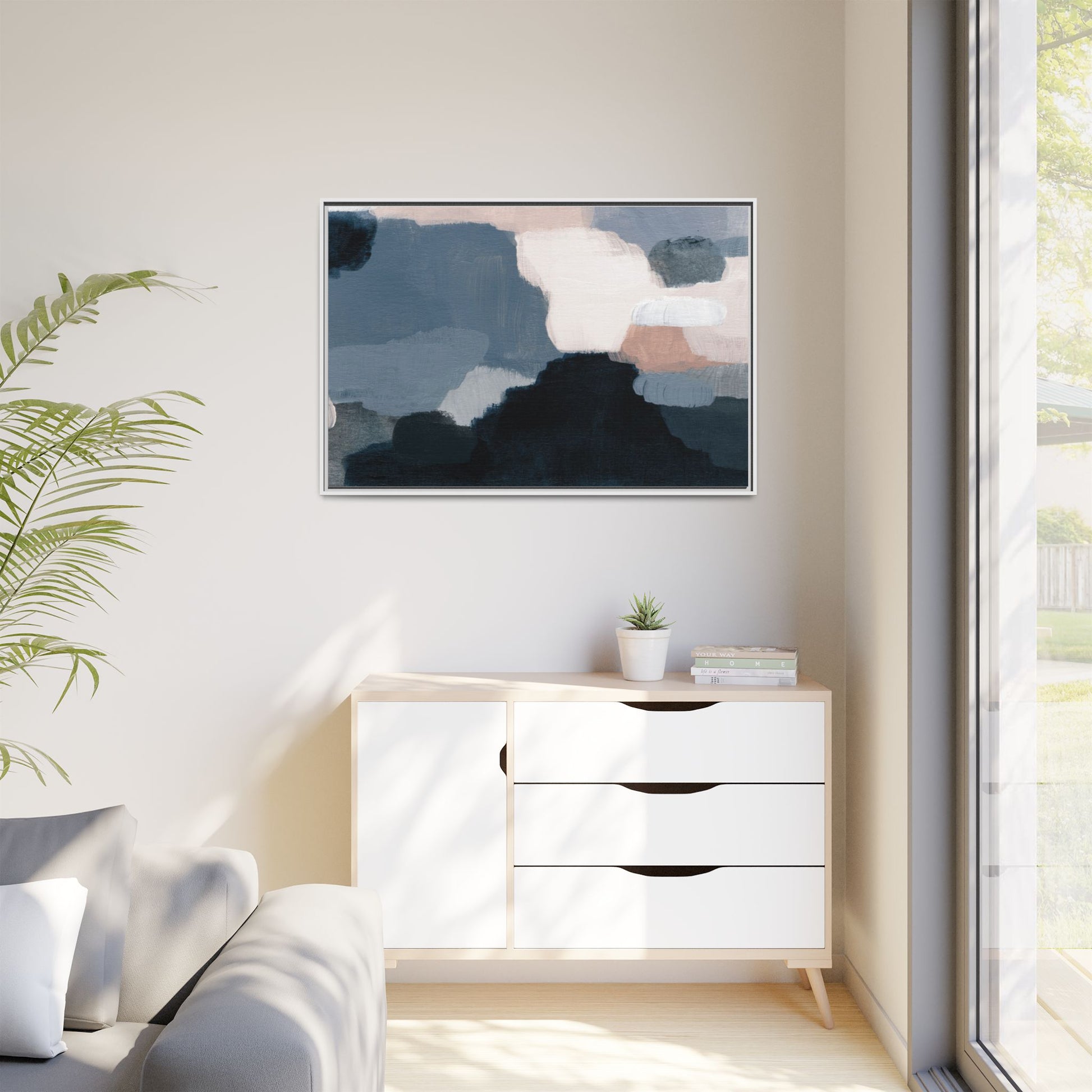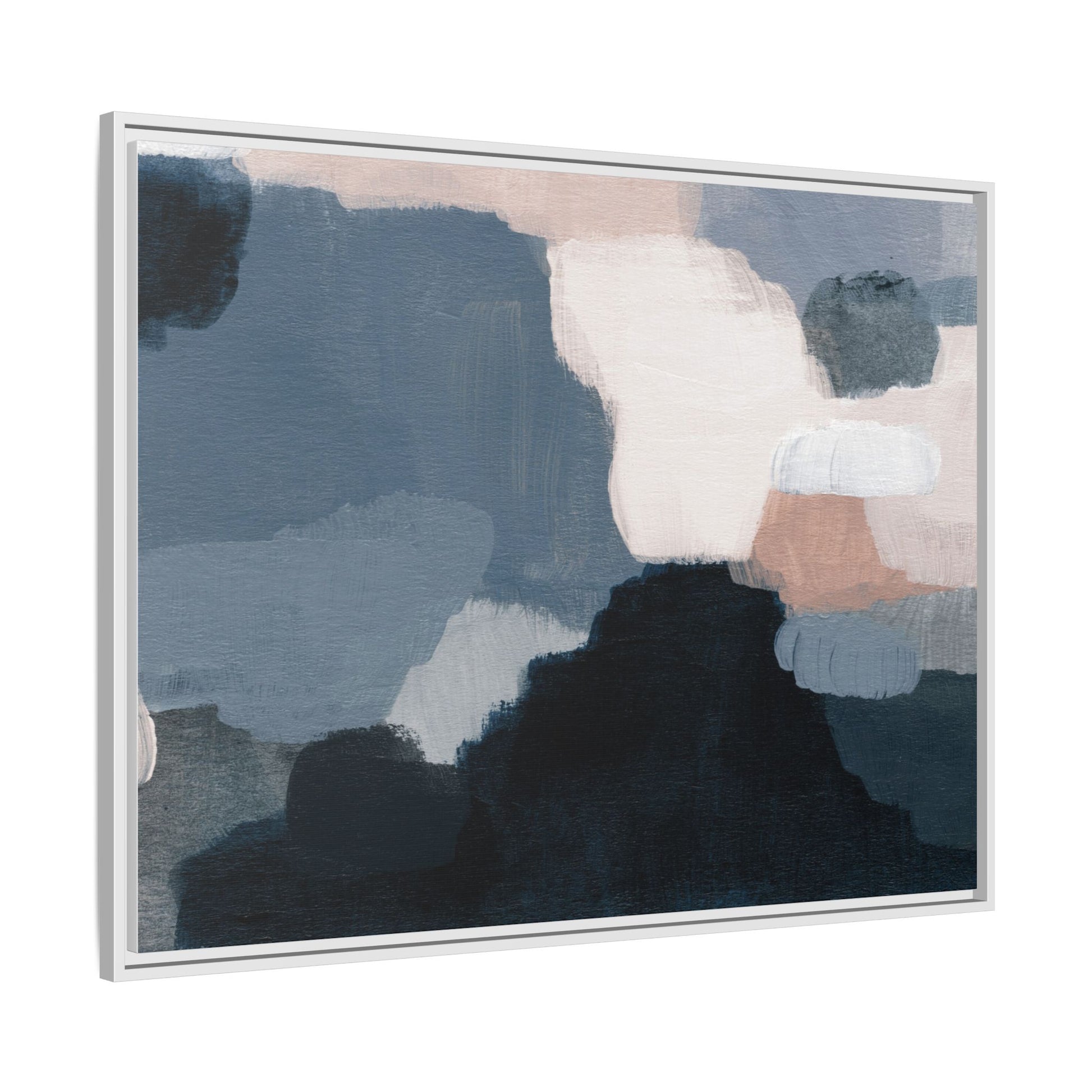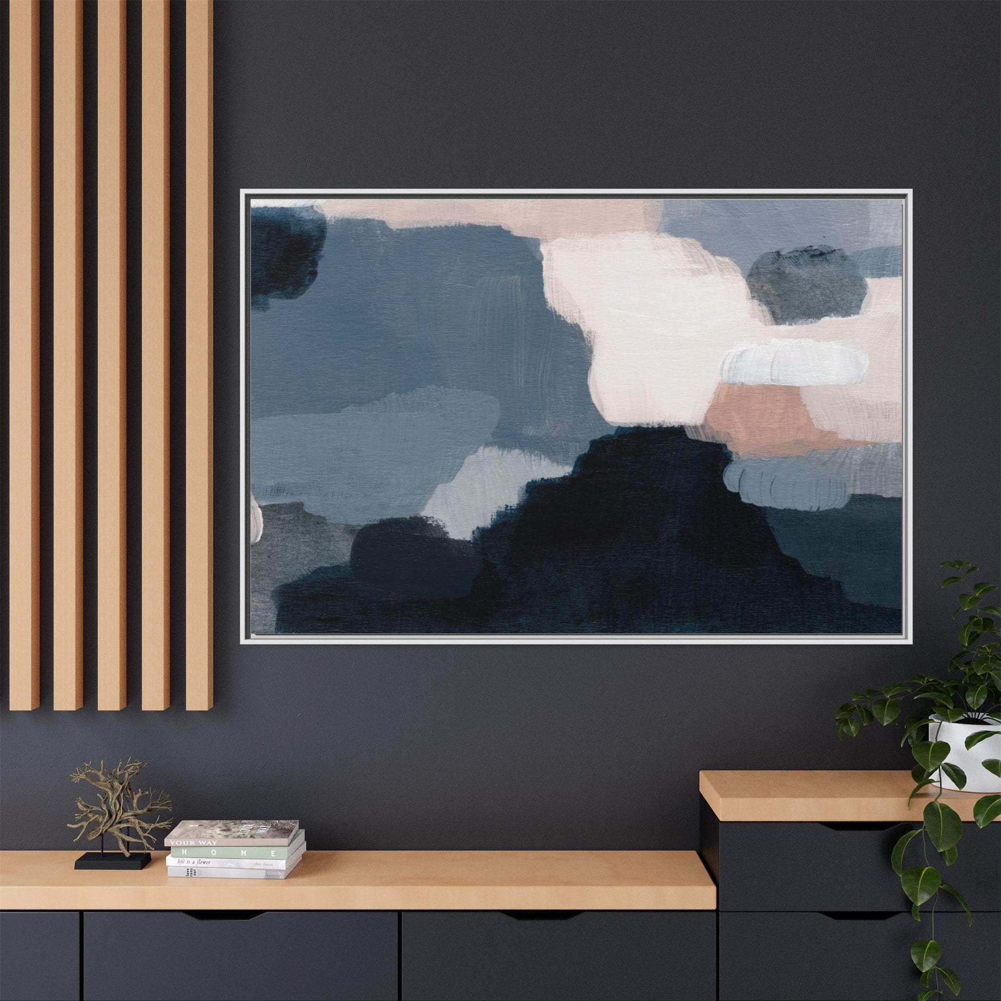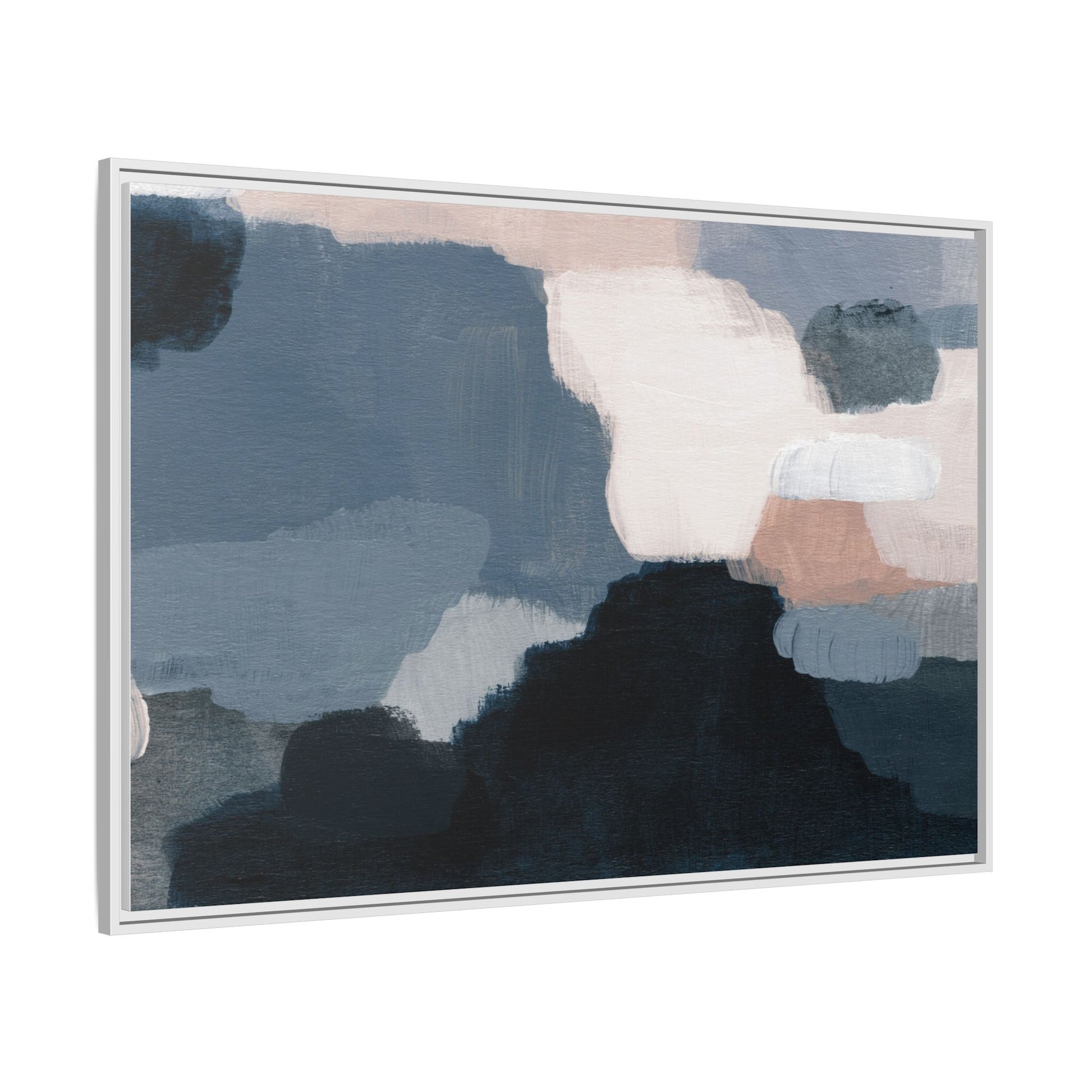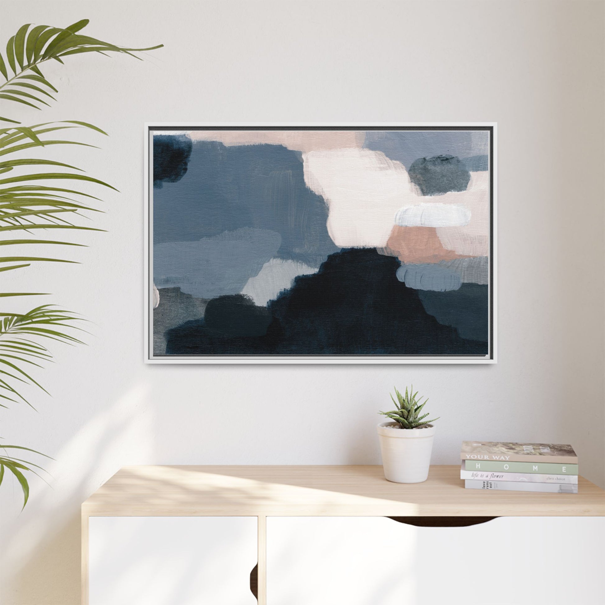 This abstract painting features a serene color palette of deep navy blues, soft grays, muted blush tones, and crisp white hues. The artwork appears to be created with acrylic or watercolor, showcasing loose, layered brushstrokes that create organic, overlapping shapes and forms. Textural brushwork gives the piece a sense of depth and movement, with each color block blending softly into the next, creating a contemplative and balanced composition. The image evokes a sense of landscape or atmospheric elements, with the colors and shapes suggestive of clouds, horizons, or geological formations. The painting's style is minimalist and contemporary, utilizing a restrained color scheme to create a sense of calm and visual harmony.