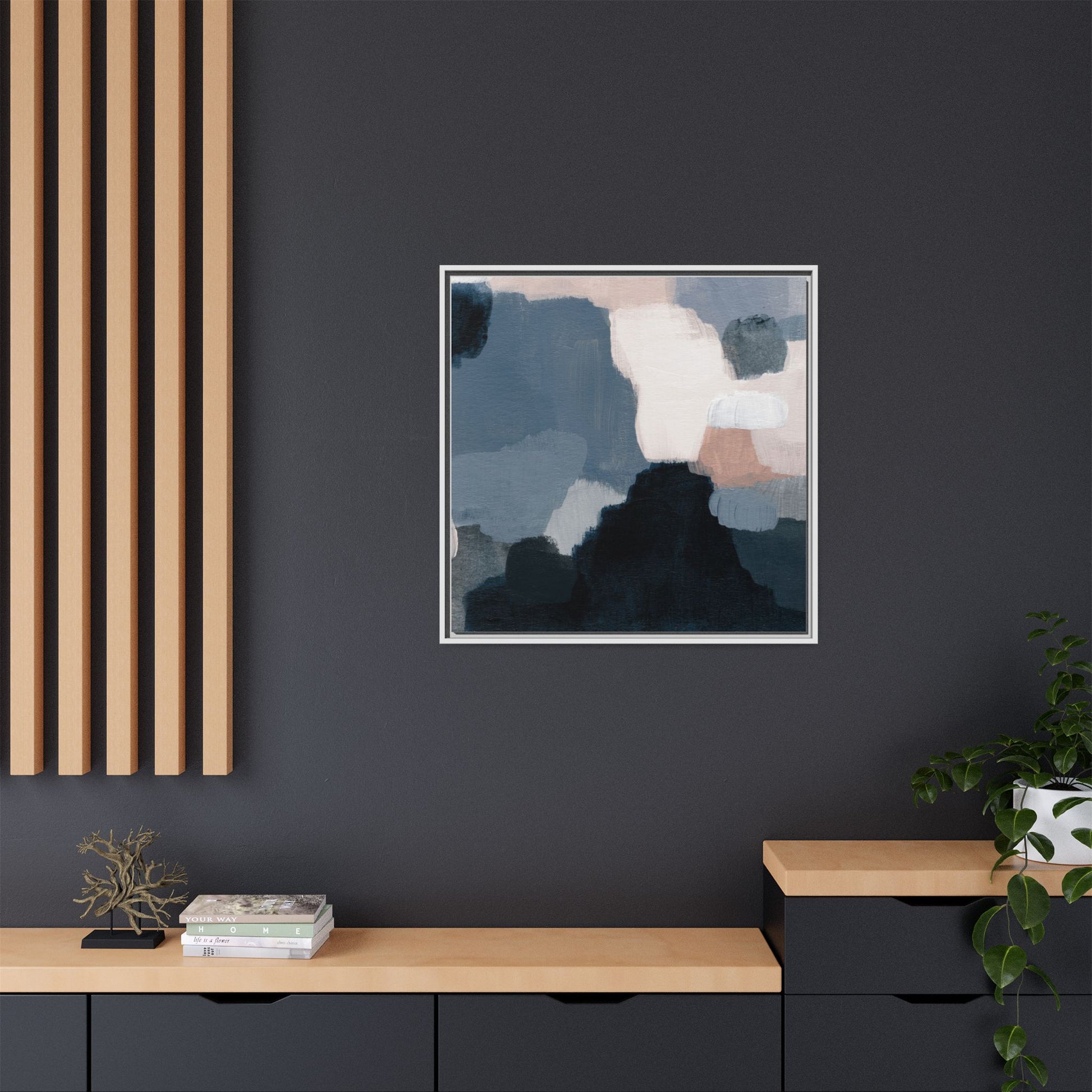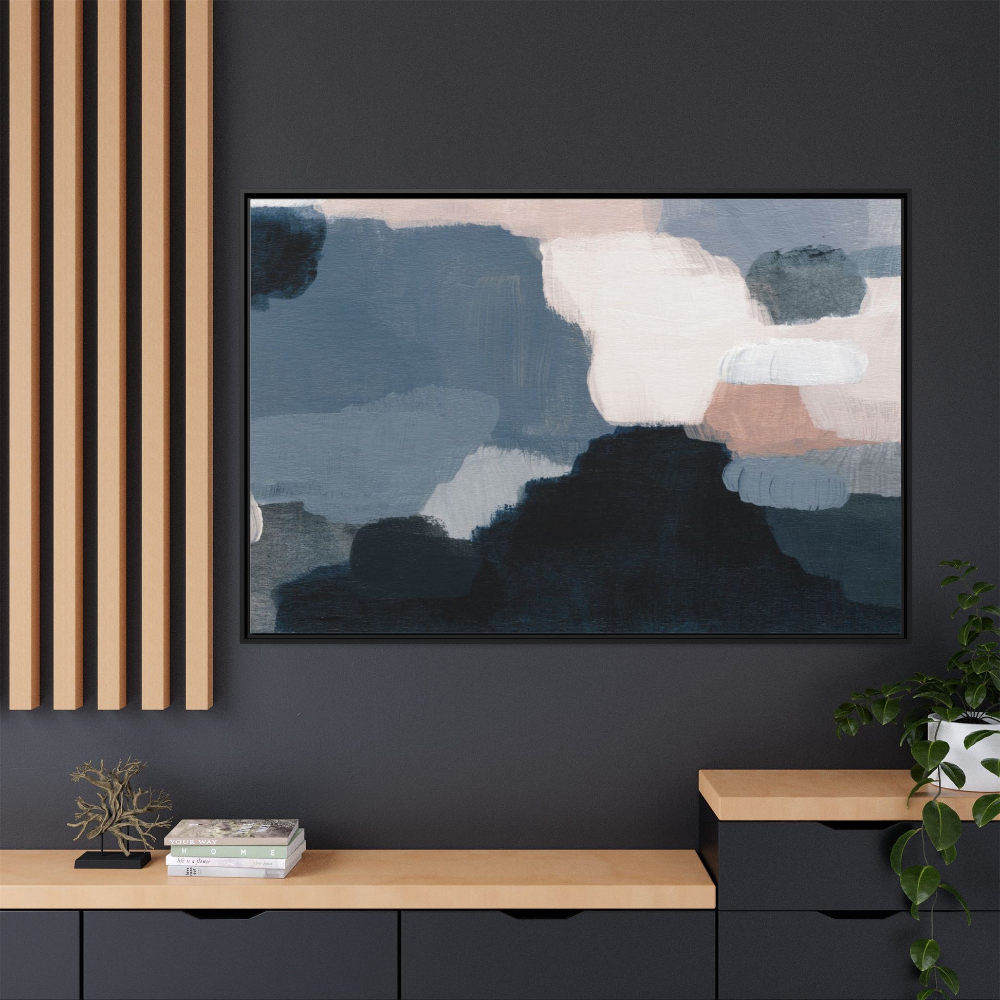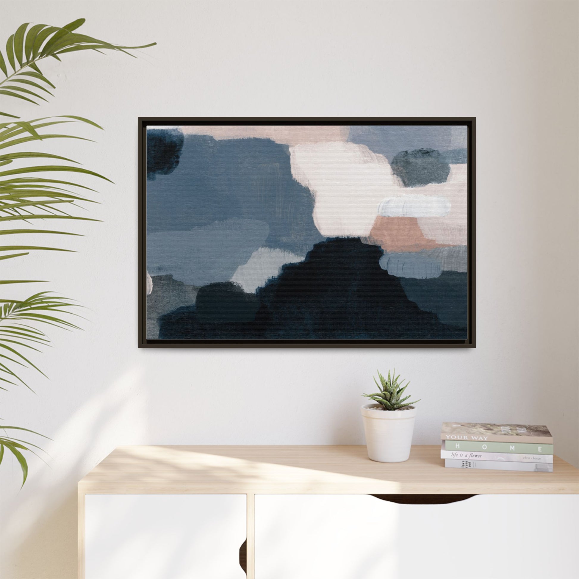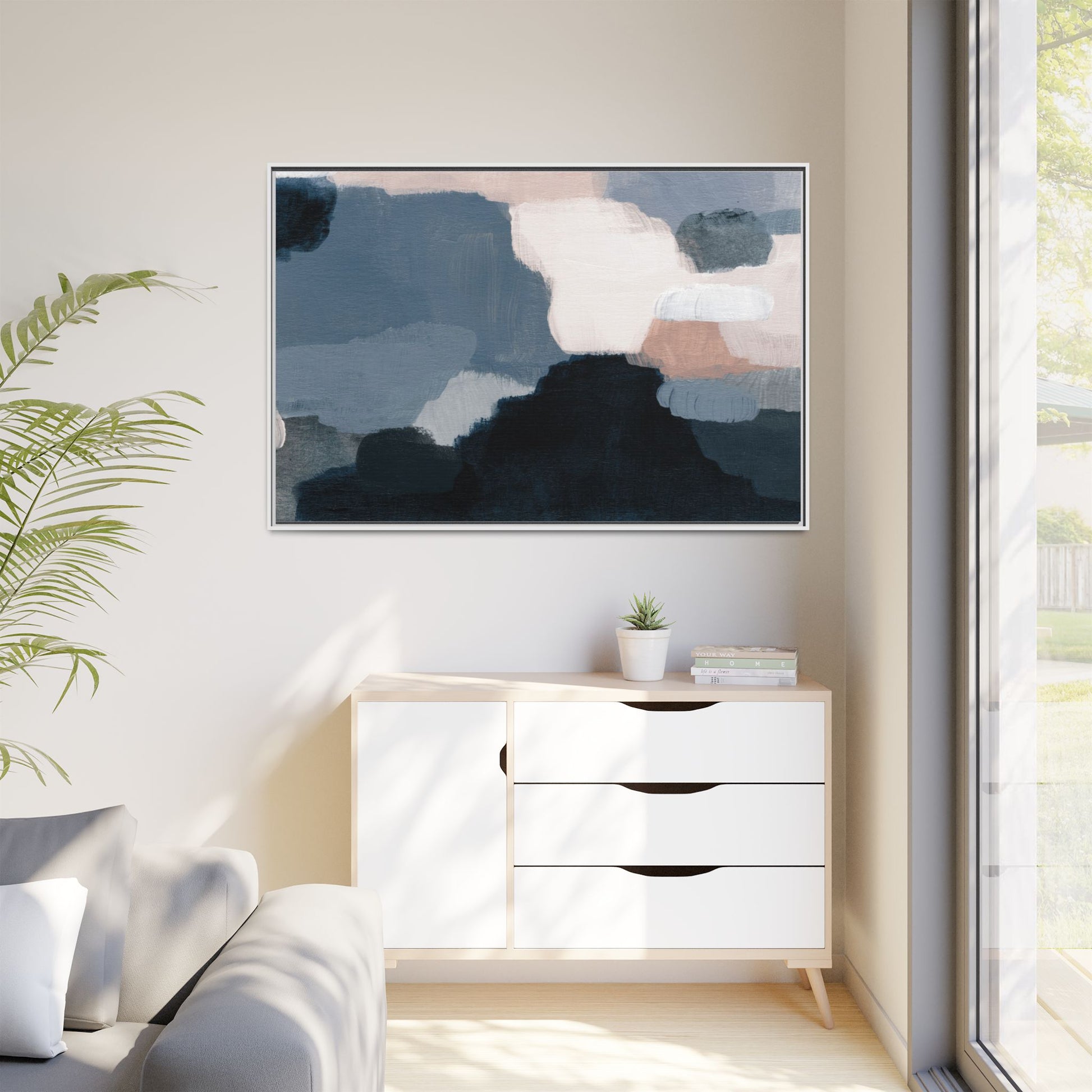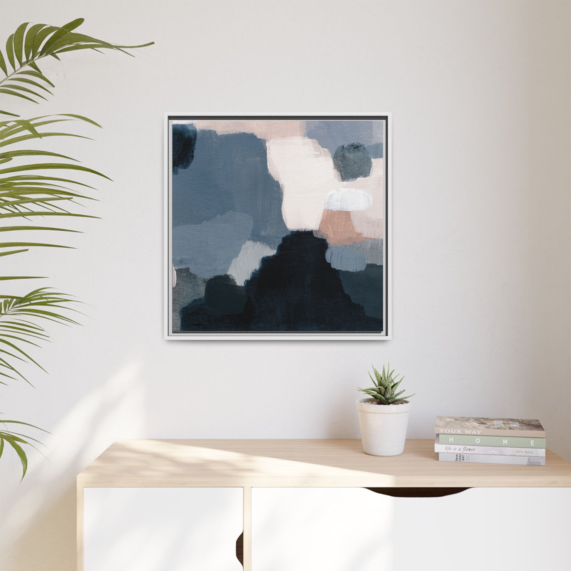 This abstract painting features a serene color palette of deep navy blues, soft grays, muted blush tones, and crisp white hues. The artwork appears to be created with acrylic or watercolor, showcasing loose, layered brushstrokes that create organic, overlapping shapes and forms. Textural brushwork gives the piece a sense of depth and movement, with each color block blending softly into the next, creating a contemplative and balanced composition. The image evokes a sense of landscape or atmospheric elements, with the colors and shapes suggestive of clouds, horizons, or geological formations. The painting's style is minimalist and contemporary, utilizing a restrained color scheme to create a sense of calm and visual harmony.