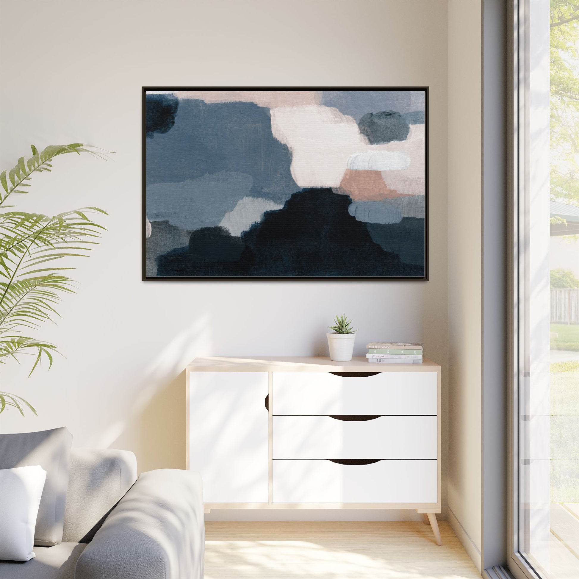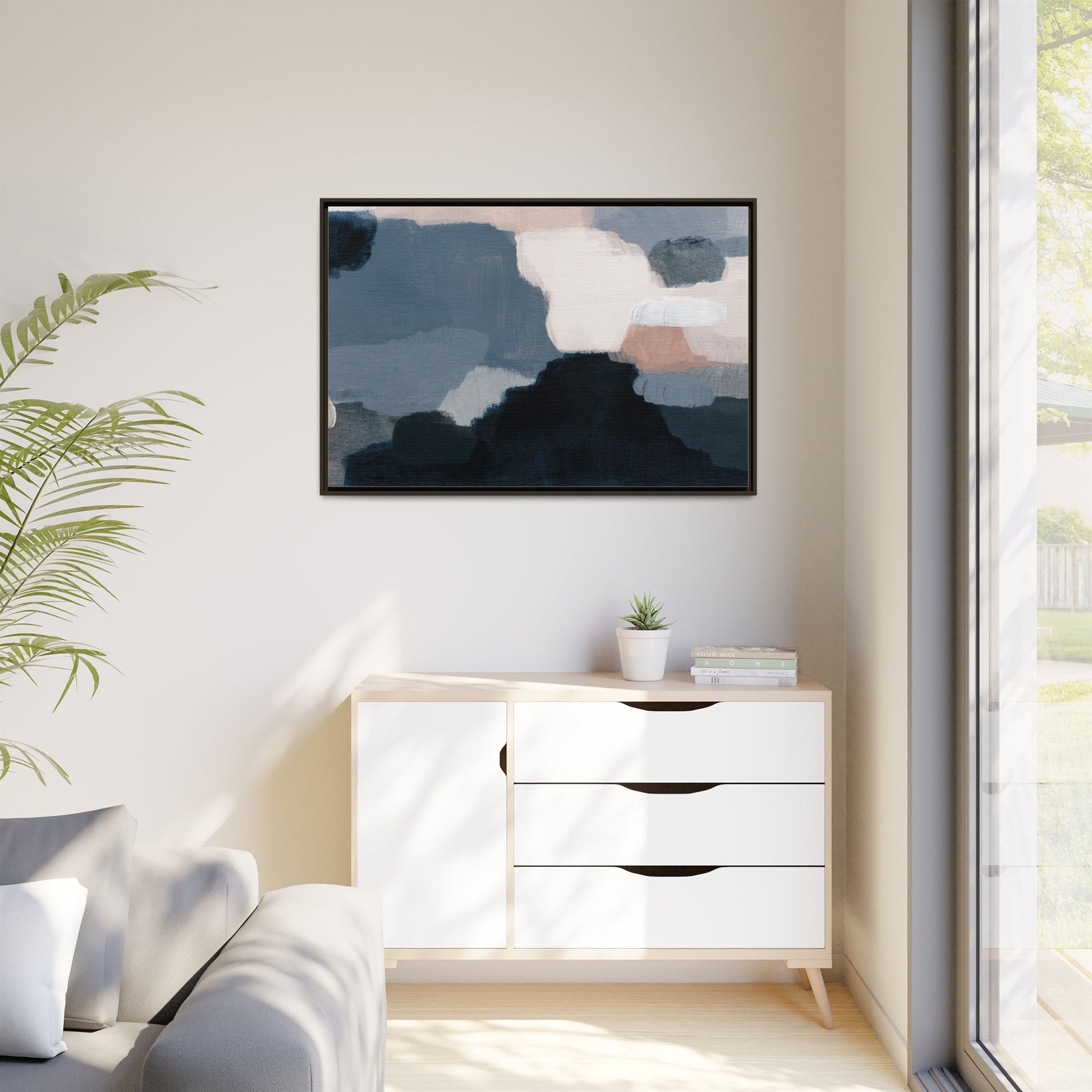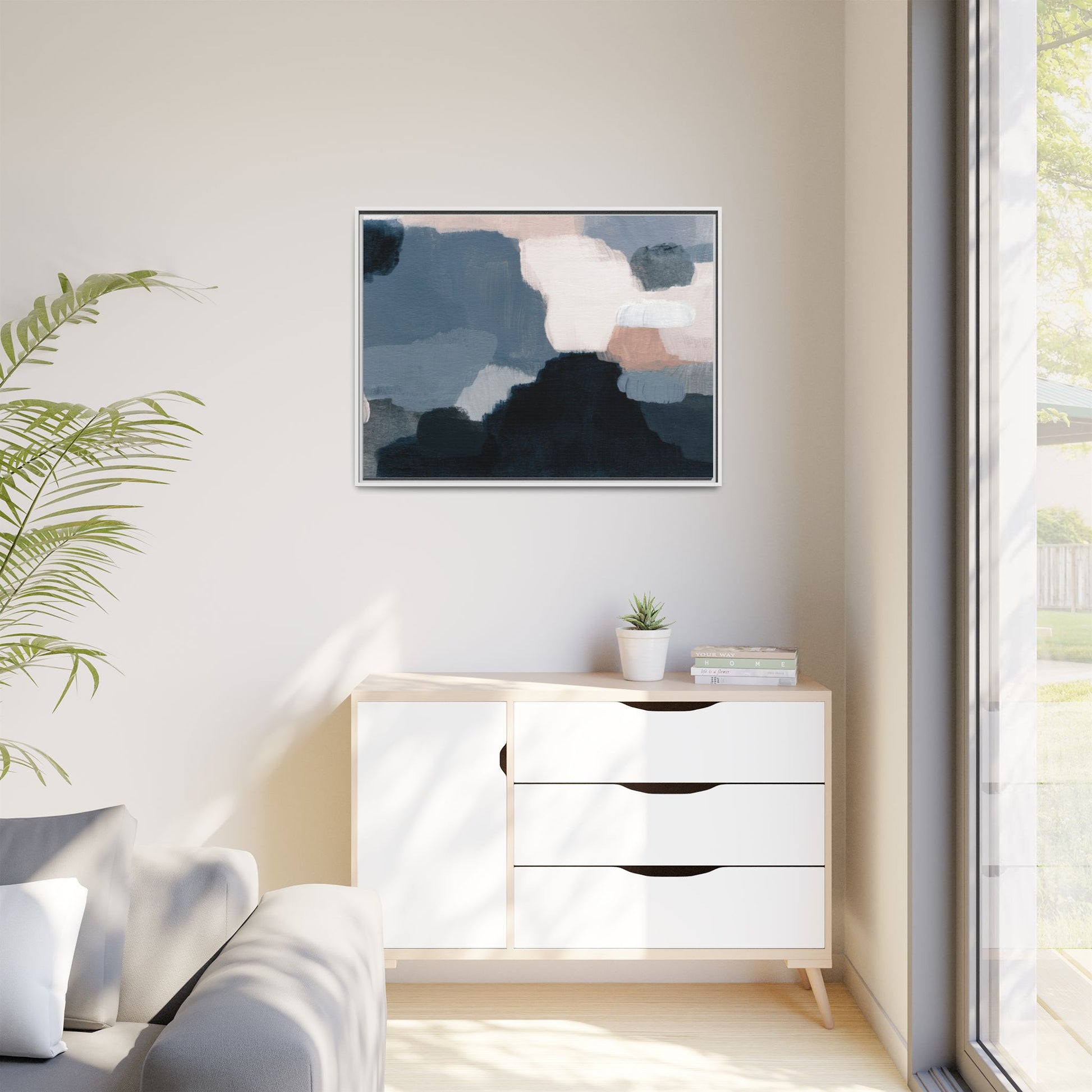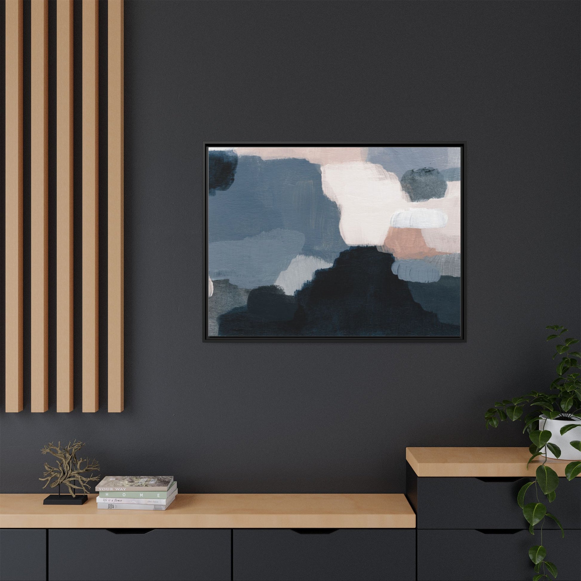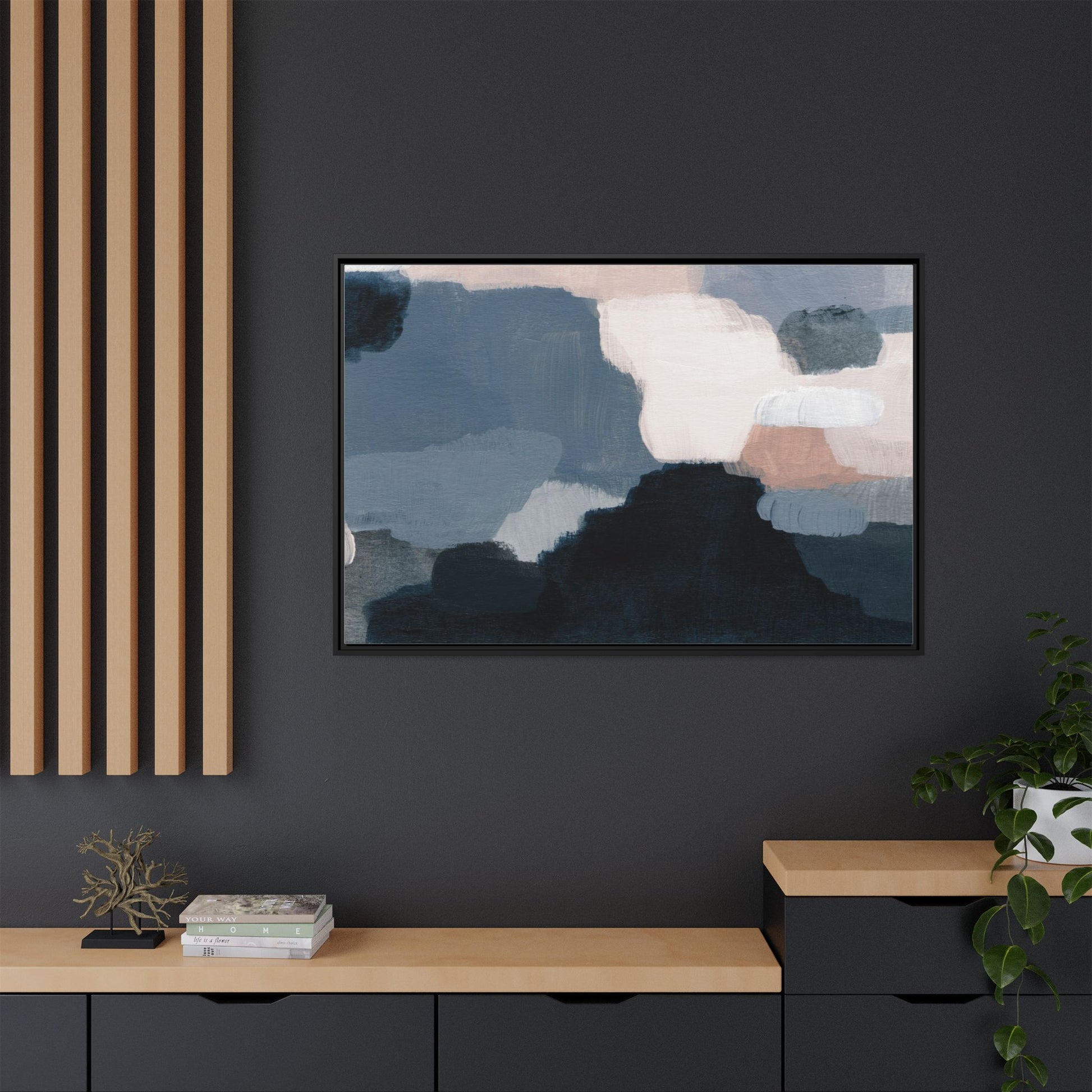 This abstract painting features a serene color palette of deep navy blues, soft grays, muted blush tones, and crisp white hues. The artwork appears to be created with acrylic or watercolor, showcasing loose, layered brushstrokes that create organic, overlapping shapes and forms. Textural brushwork gives the piece a sense of depth and movement, with each color block blending softly into the next, creating a contemplative and balanced composition. The image evokes a sense of landscape or atmospheric elements, with the colors and shapes suggestive of clouds, horizons, or geological formations. The painting's style is minimalist and contemporary, utilizing a restrained color scheme to create a sense of calm and visual harmony.