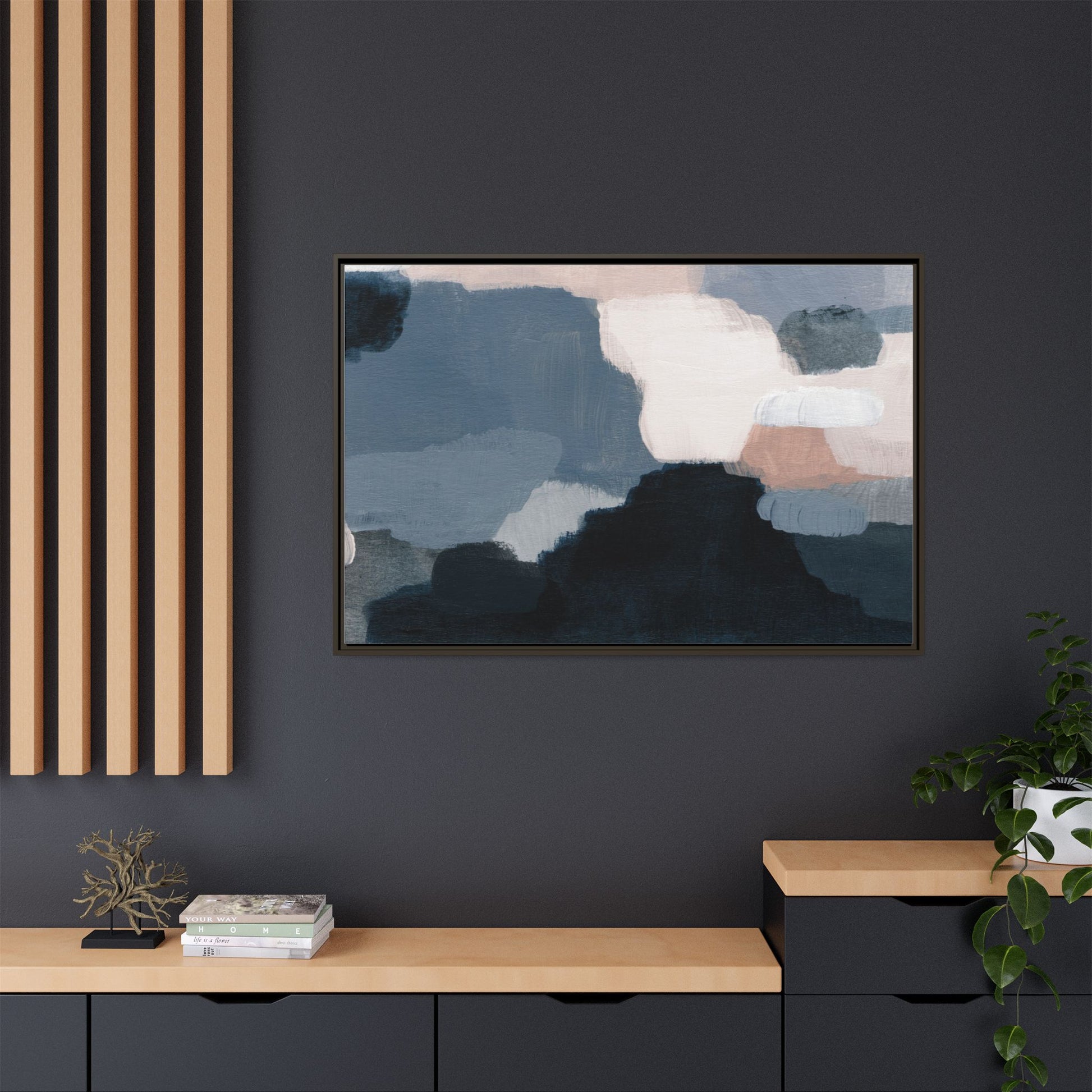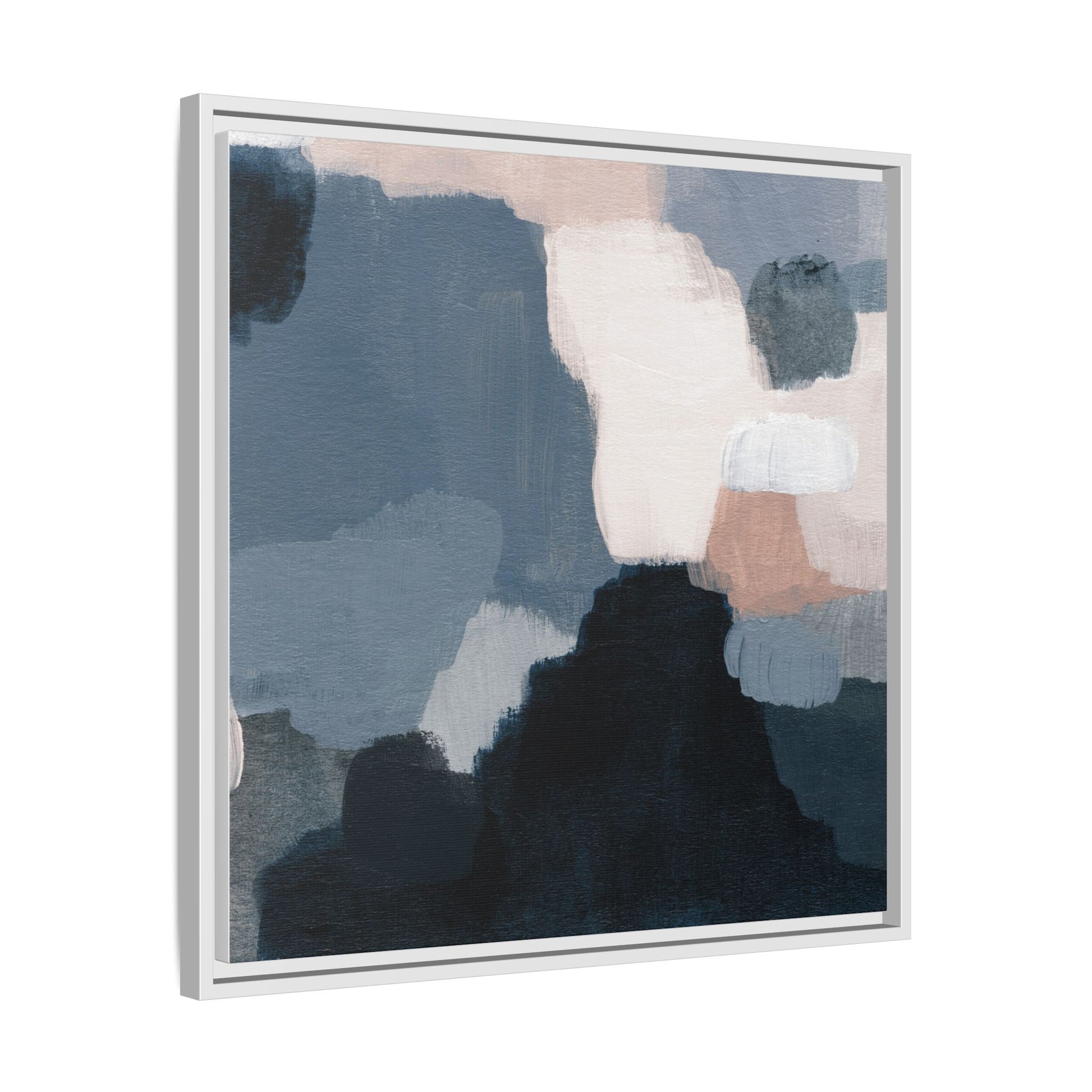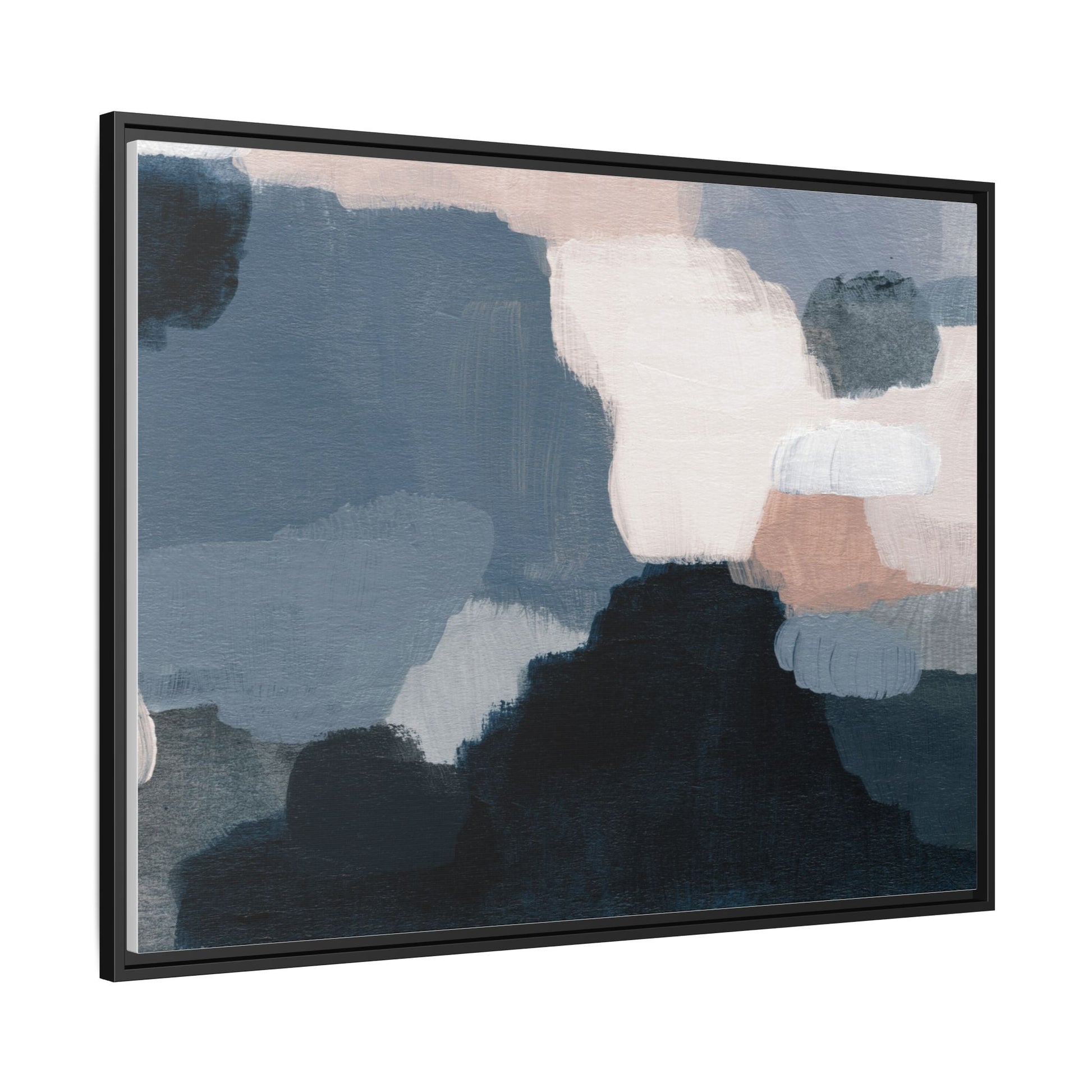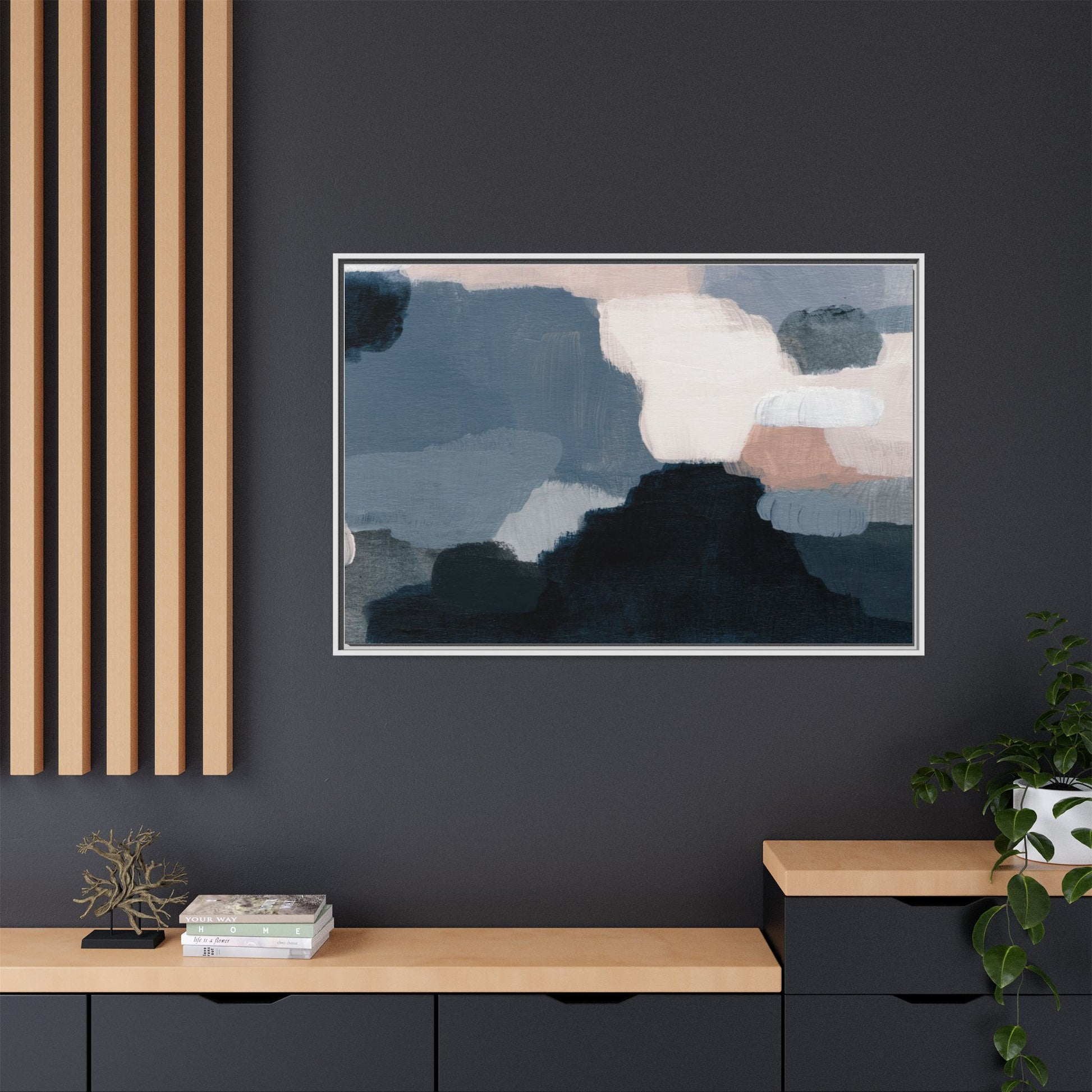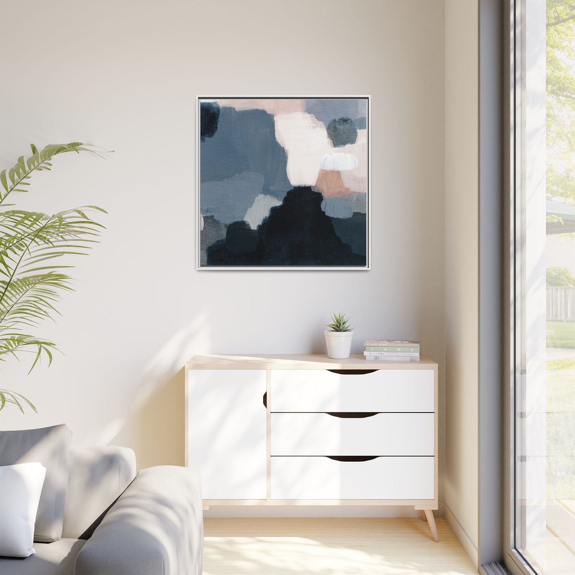 This abstract painting features a serene color palette of deep navy blues, soft grays, muted blush tones, and crisp white hues. The artwork appears to be created with acrylic or watercolor, showcasing loose, layered brushstrokes that create organic, overlapping shapes and forms. Textural brushwork gives the piece a sense of depth and movement, with each color block blending softly into the next, creating a contemplative and balanced composition. The image evokes a sense of landscape or atmospheric elements, with the colors and shapes suggestive of clouds, horizons, or geological formations. The painting's style is minimalist and contemporary, utilizing a restrained color scheme to create a sense of calm and visual harmony.