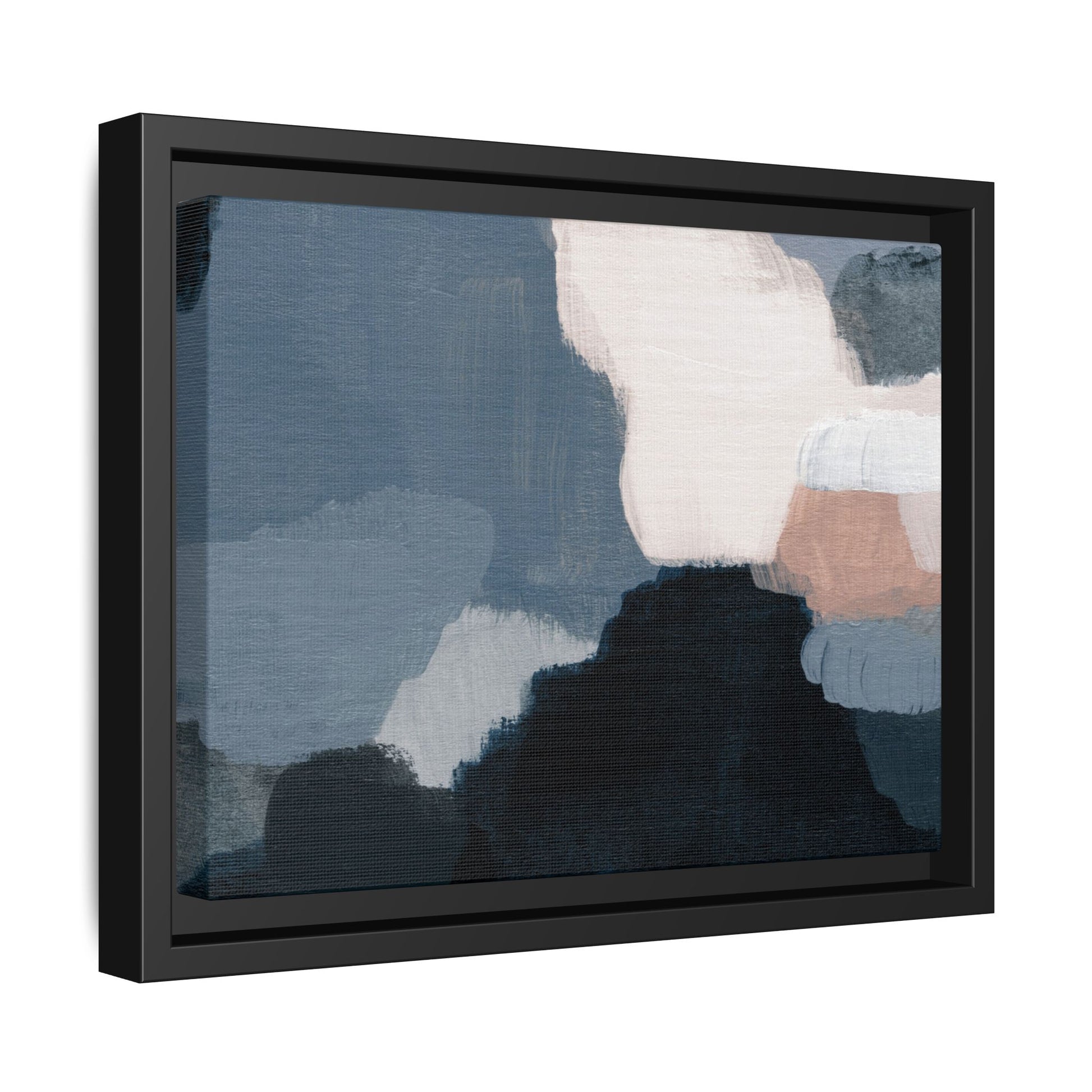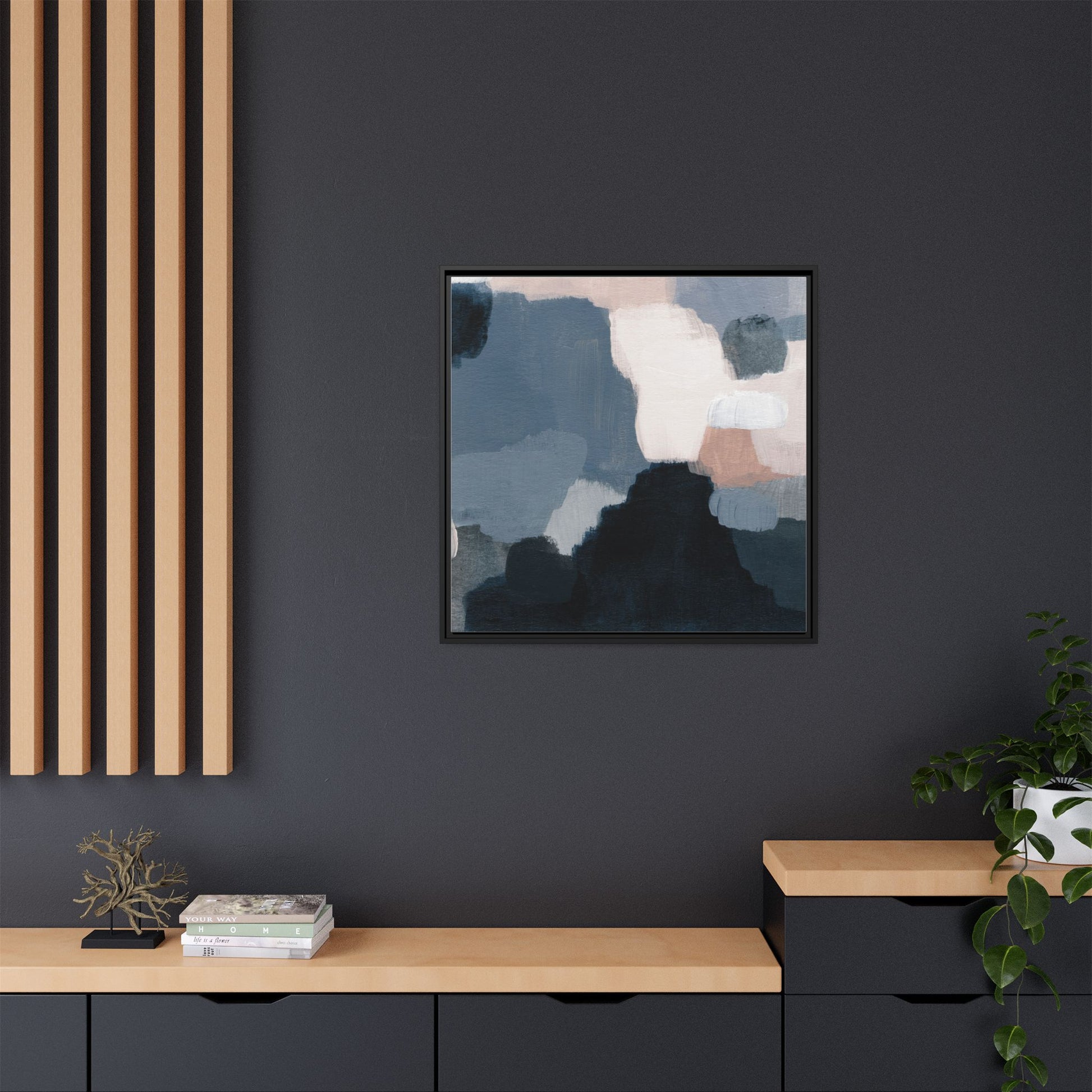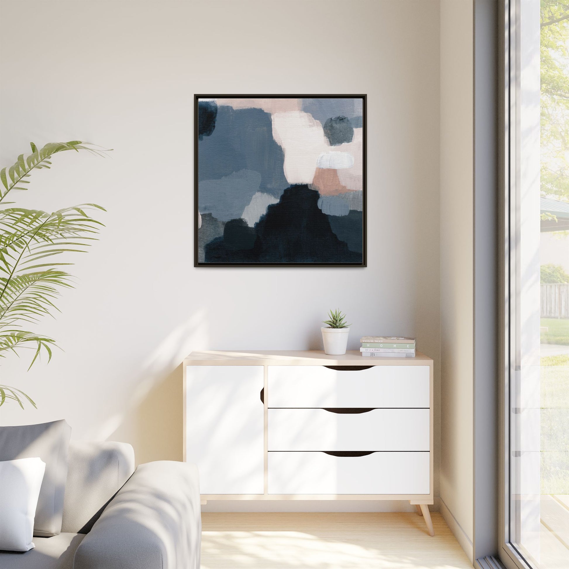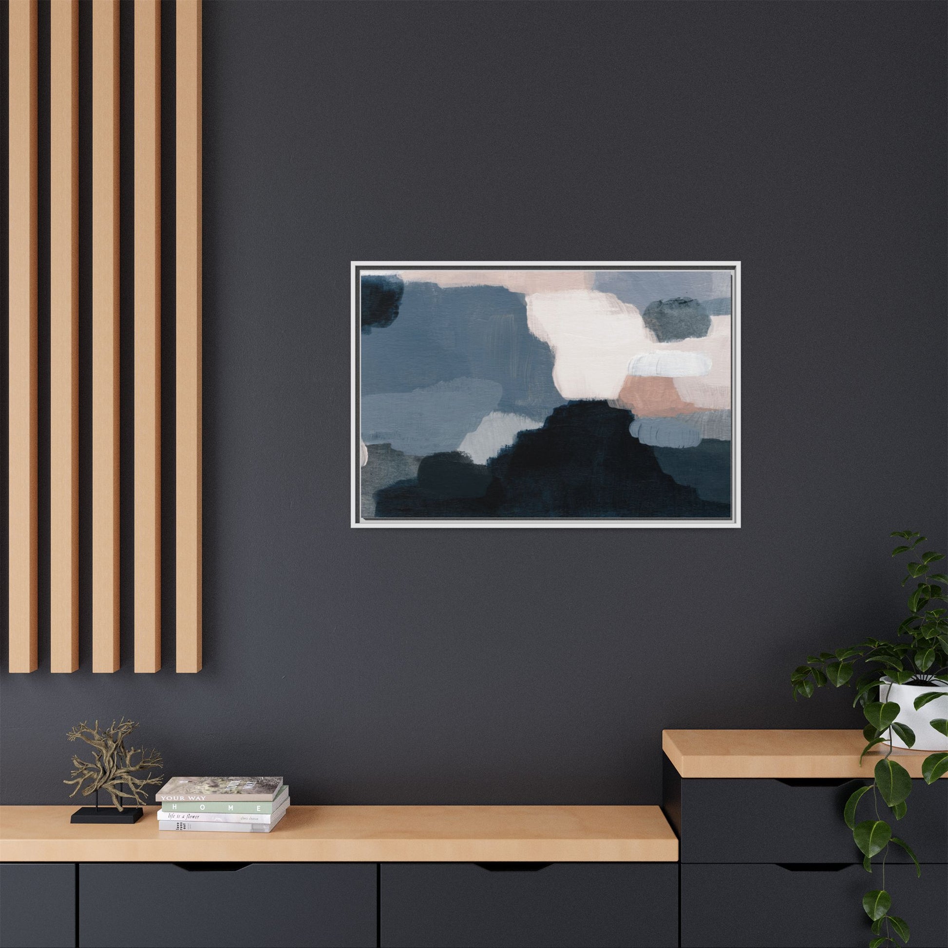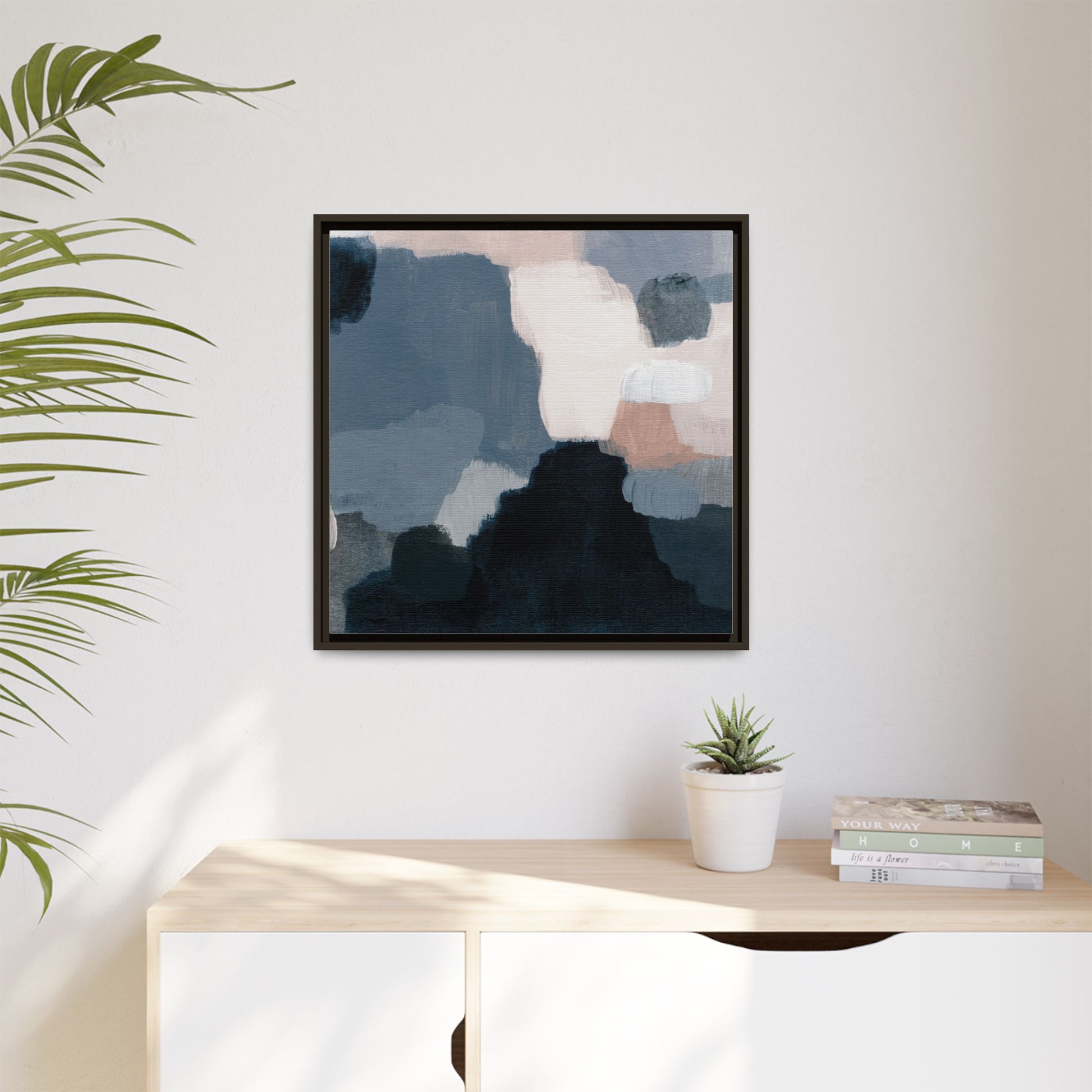 This abstract painting features a serene color palette of deep navy blues, soft grays, muted blush tones, and crisp white hues. The artwork appears to be created with acrylic or watercolor, showcasing loose, layered brushstrokes that create organic, overlapping shapes and forms. Textural brushwork gives the piece a sense of depth and movement, with each color block blending softly into the next, creating a contemplative and balanced composition. The image evokes a sense of landscape or atmospheric elements, with the colors and shapes suggestive of clouds, horizons, or geological formations. The painting's style is minimalist and contemporary, utilizing a restrained color scheme to create a sense of calm and visual harmony.