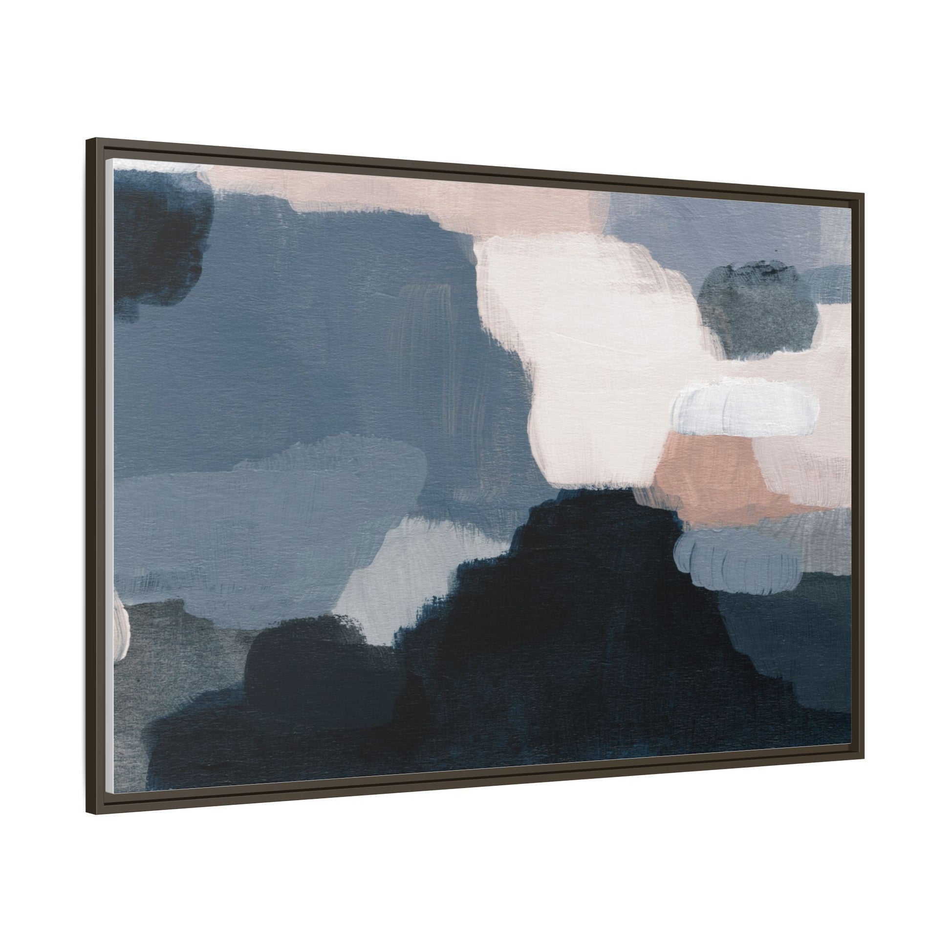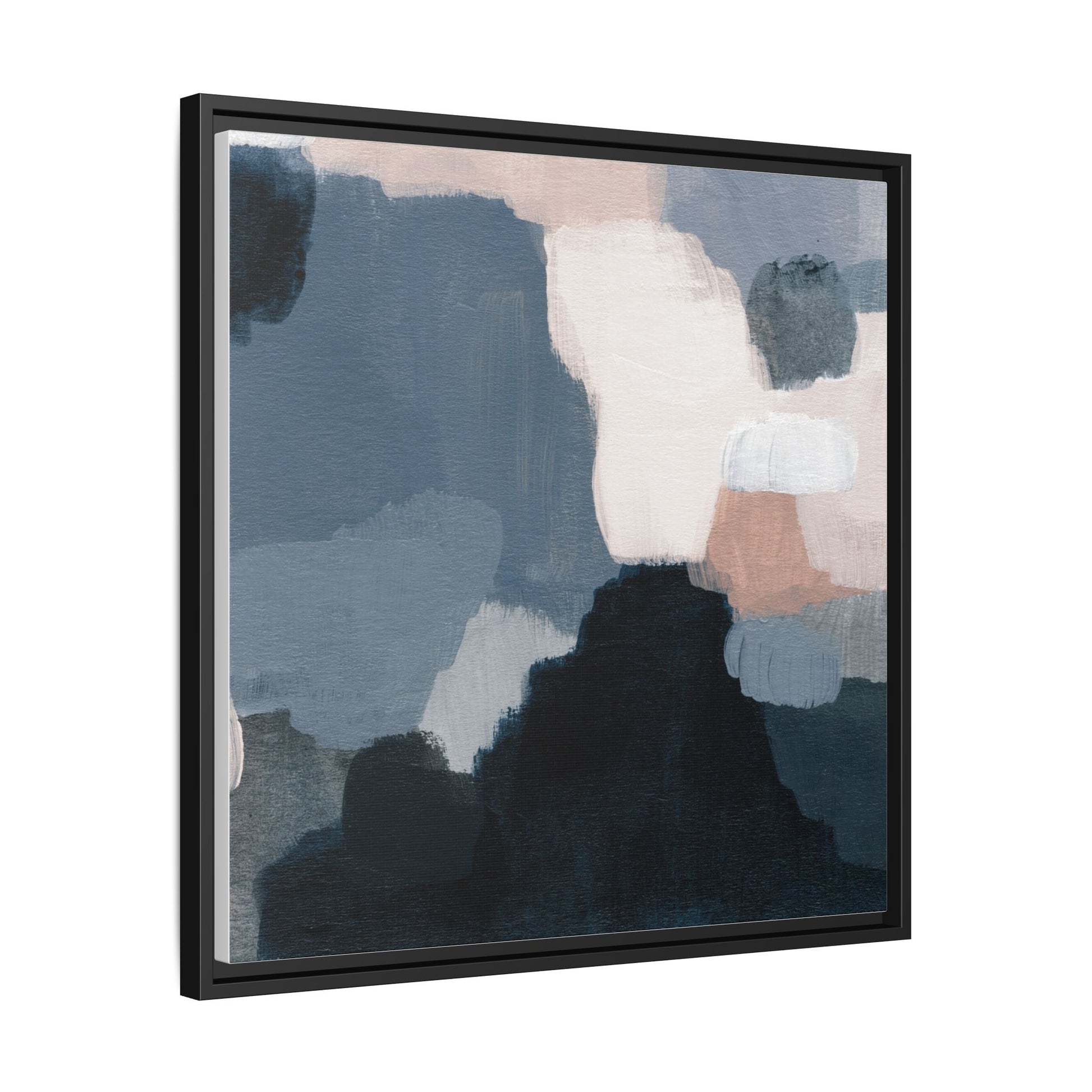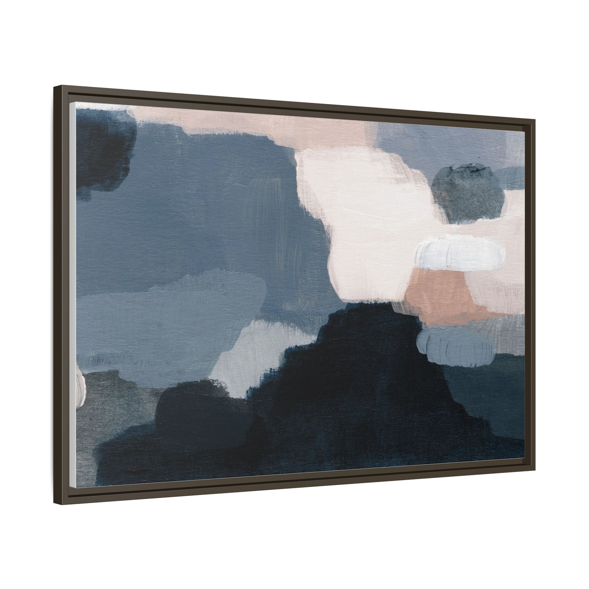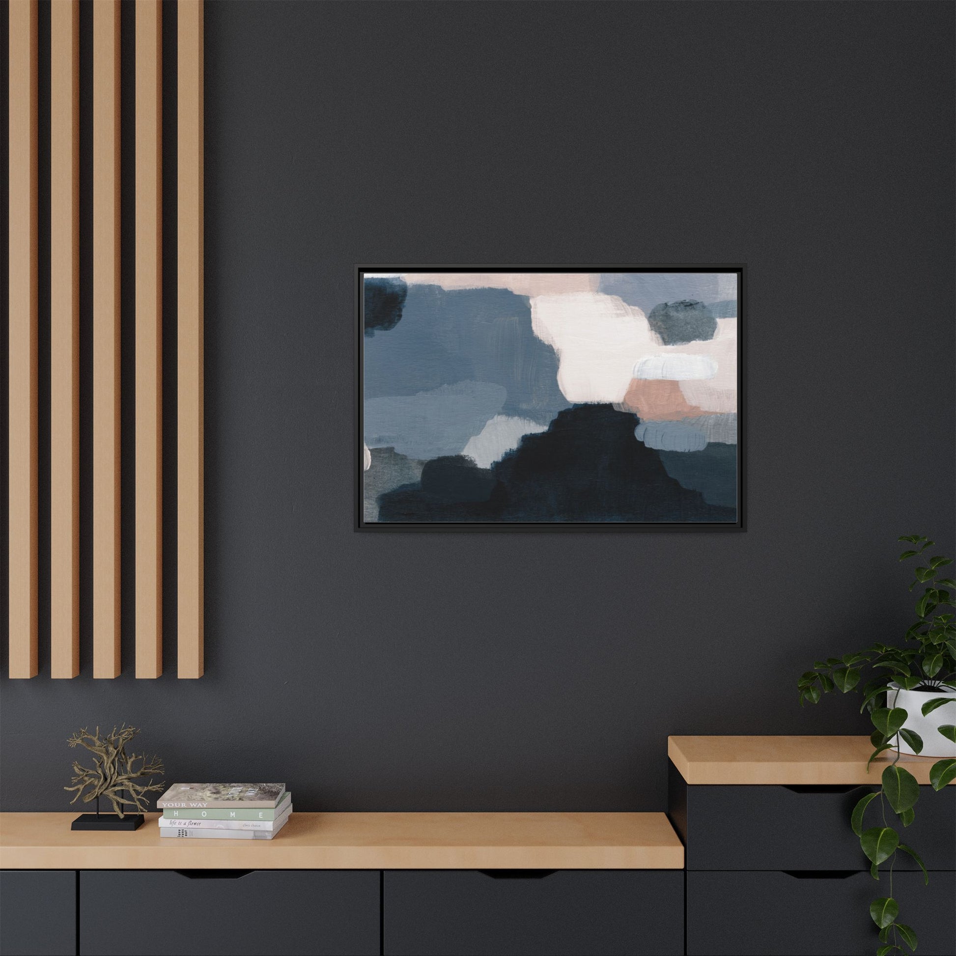 This abstract painting features a serene color palette of deep navy blues, soft grays, muted blush tones, and crisp white hues. The artwork appears to be created with acrylic or watercolor, showcasing loose, layered brushstrokes that create organic, overlapping shapes and forms. Textural brushwork gives the piece a sense of depth and movement, with each color block blending softly into the next, creating a contemplative and balanced composition. The image evokes a sense of landscape or atmospheric elements, with the colors and shapes suggestive of clouds, horizons, or geological formations. The painting's style is minimalist and contemporary, utilizing a restrained color scheme to create a sense of calm and visual harmony.