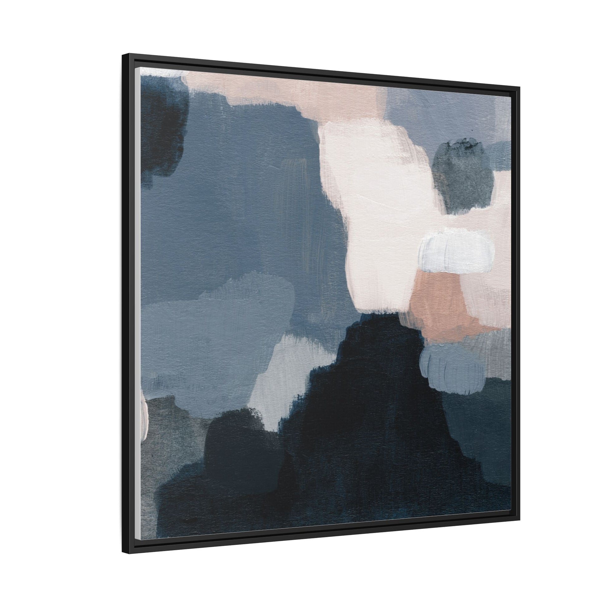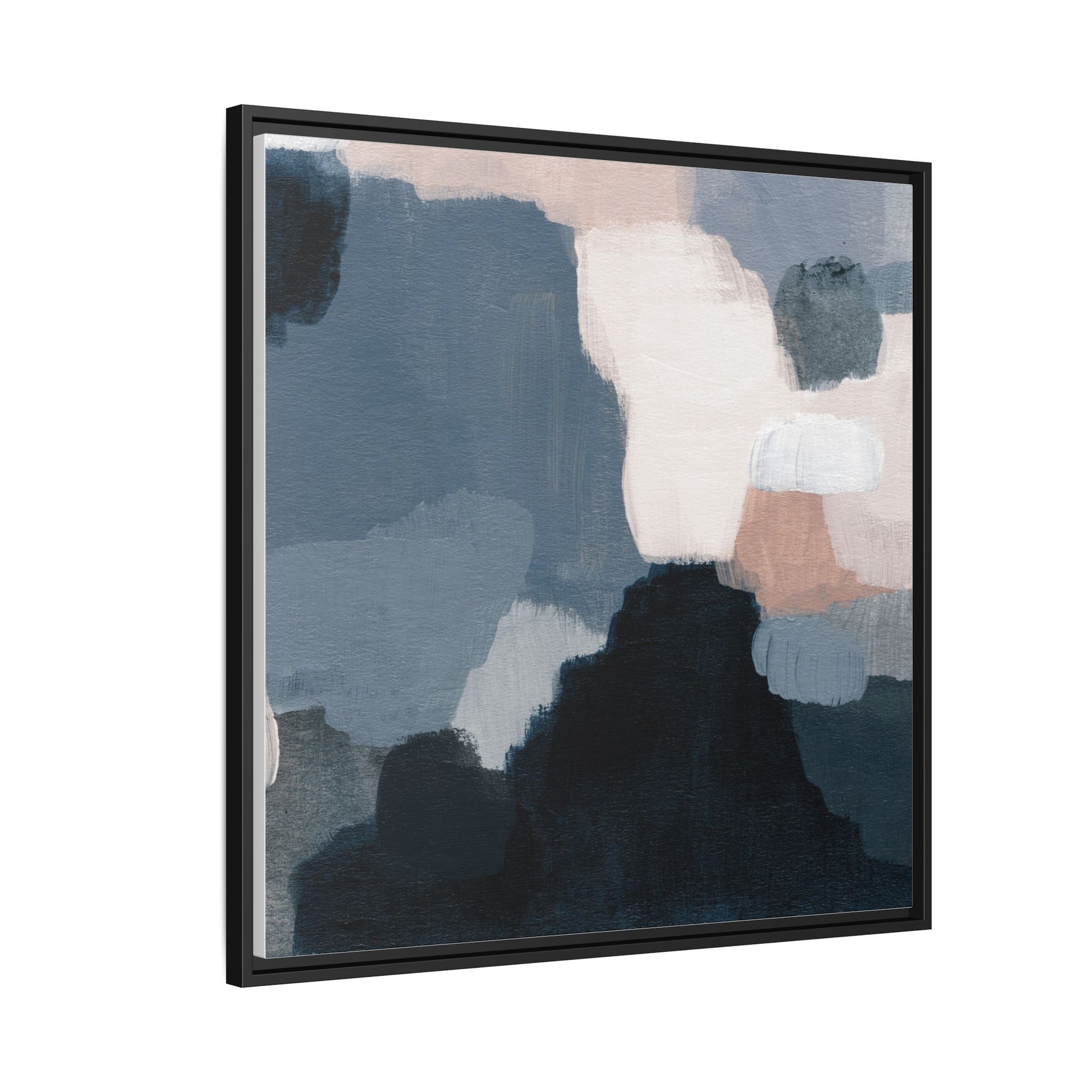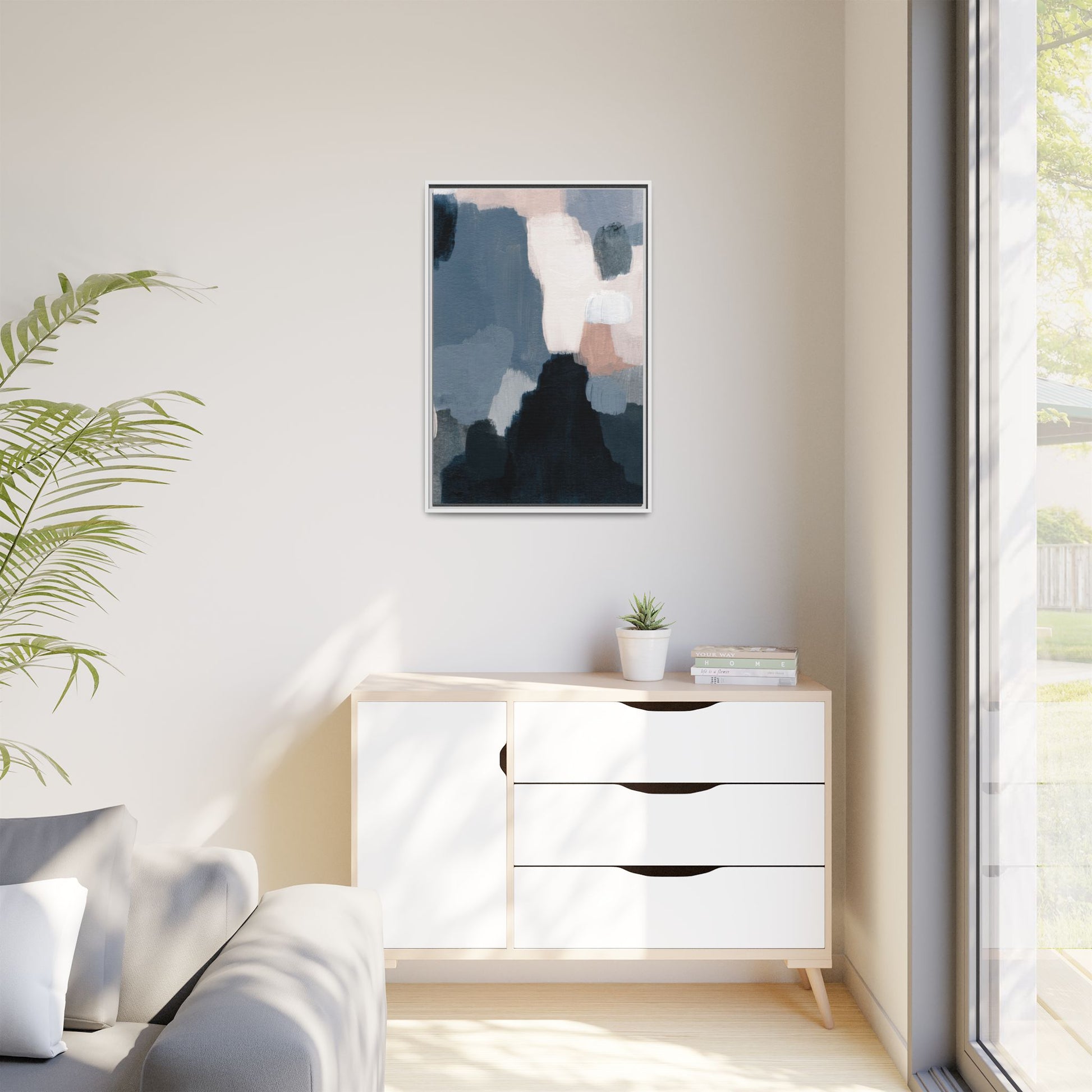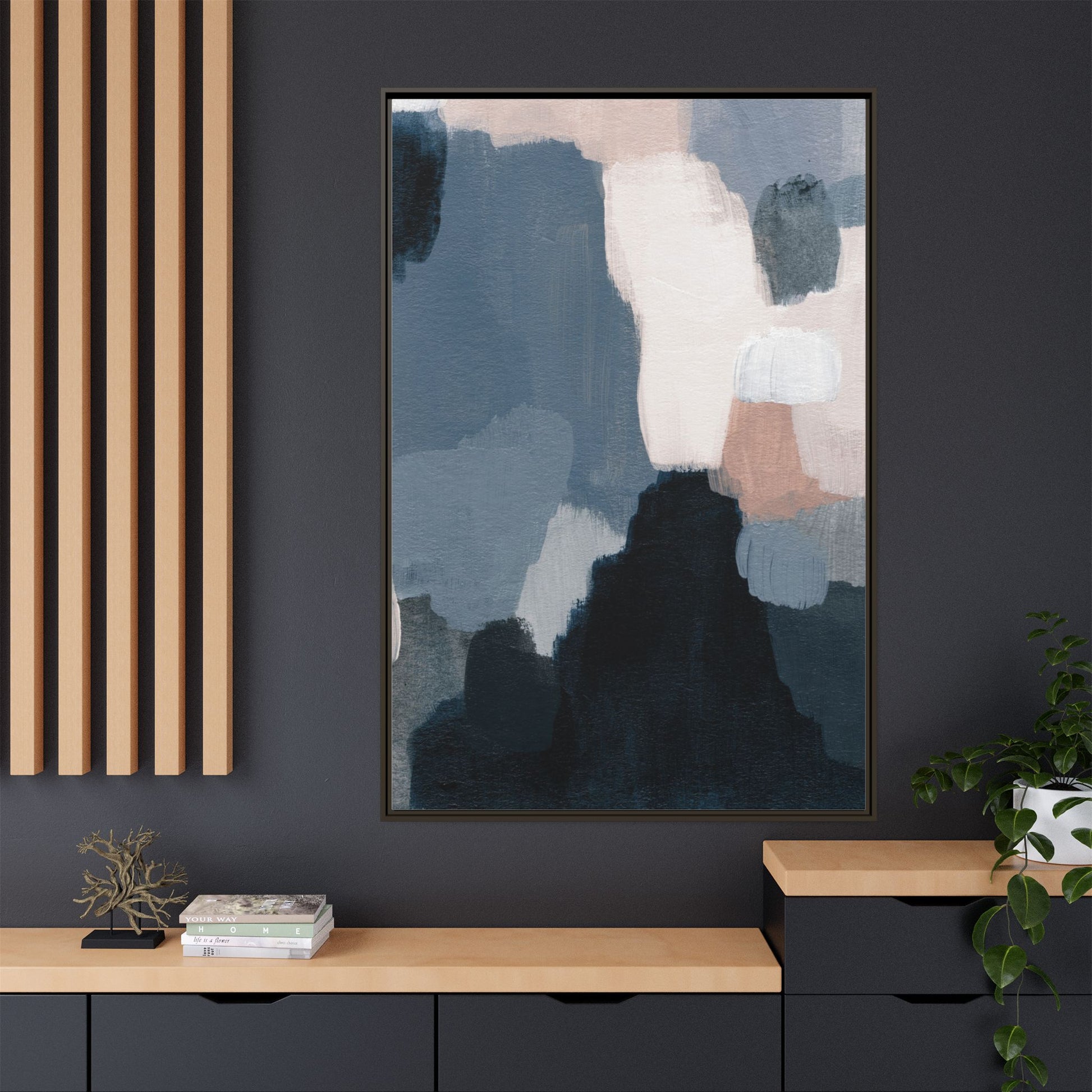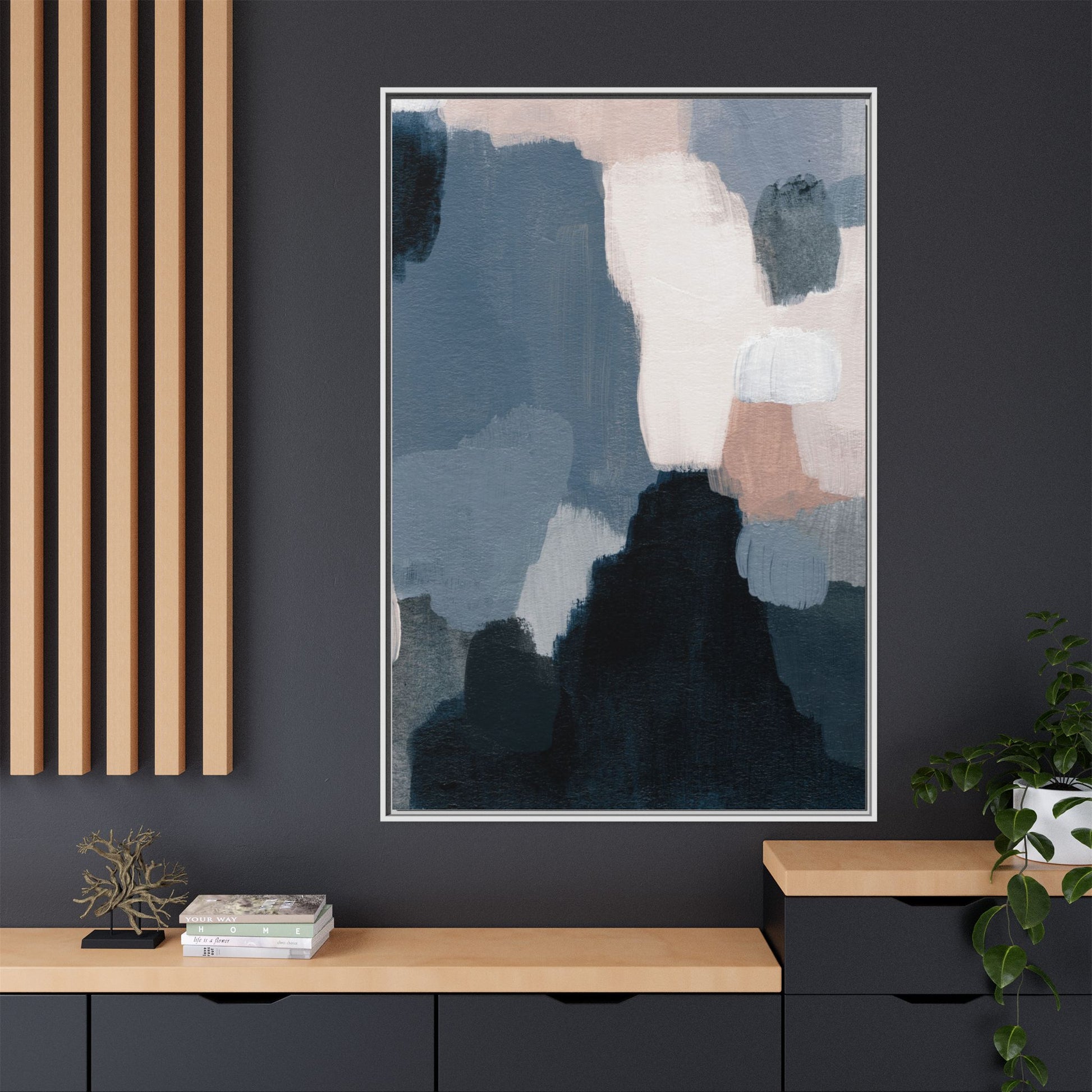 This abstract painting features a serene color palette of deep navy blues, soft grays, muted blush tones, and crisp white hues. The artwork appears to be created with acrylic or watercolor, showcasing loose, layered brushstrokes that create organic, overlapping shapes and forms. Textural brushwork gives the piece a sense of depth and movement, with each color block blending softly into the next, creating a contemplative and balanced composition. The image evokes a sense of landscape or atmospheric elements, with the colors and shapes suggestive of clouds, horizons, or geological formations. The painting's style is minimalist and contemporary, utilizing a restrained color scheme to create a sense of calm and visual harmony.
