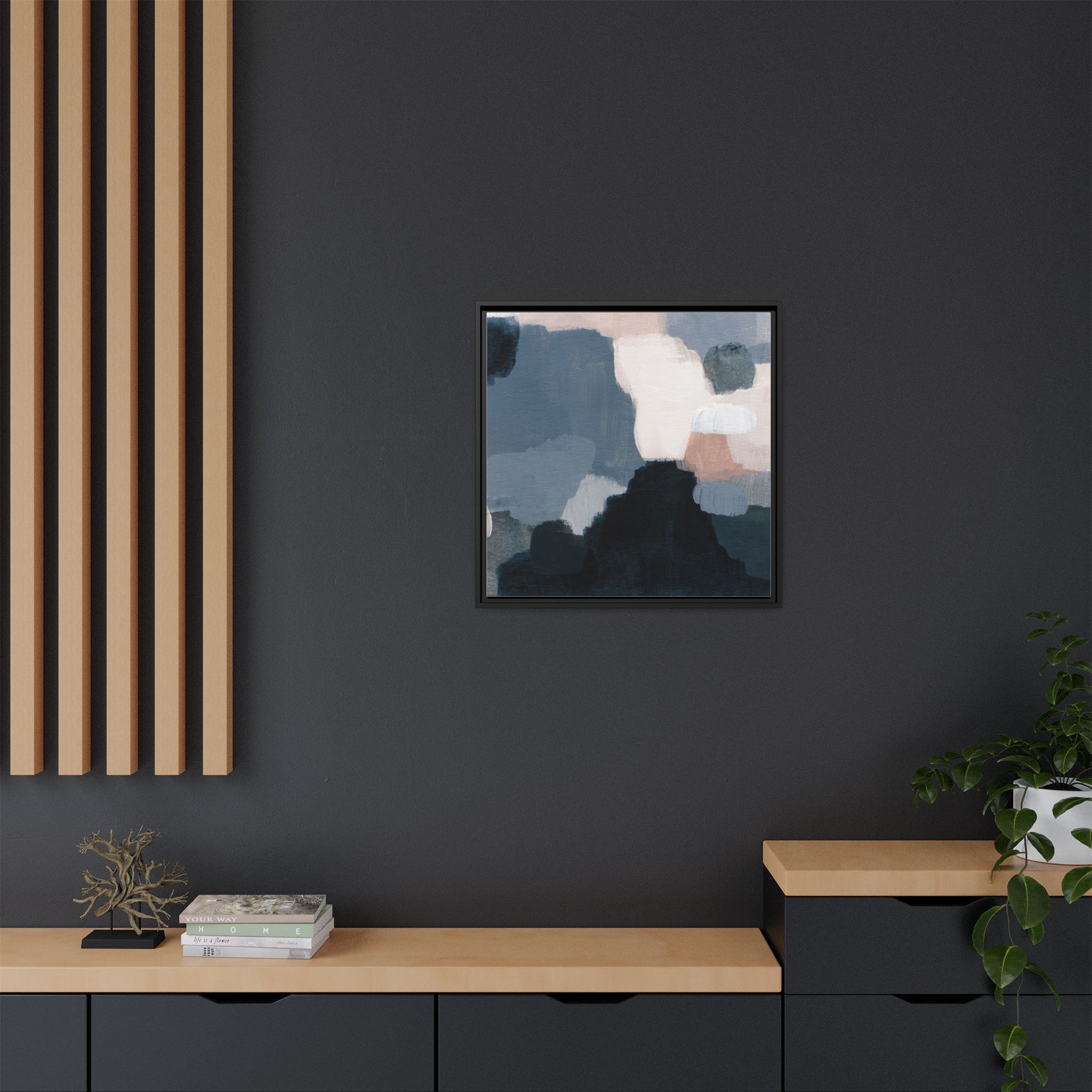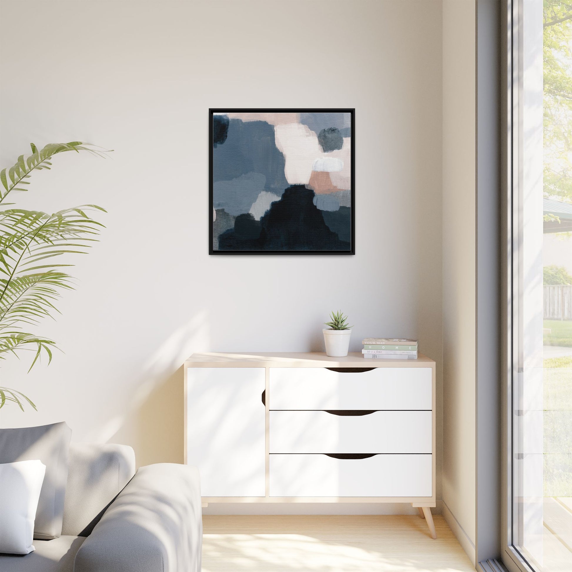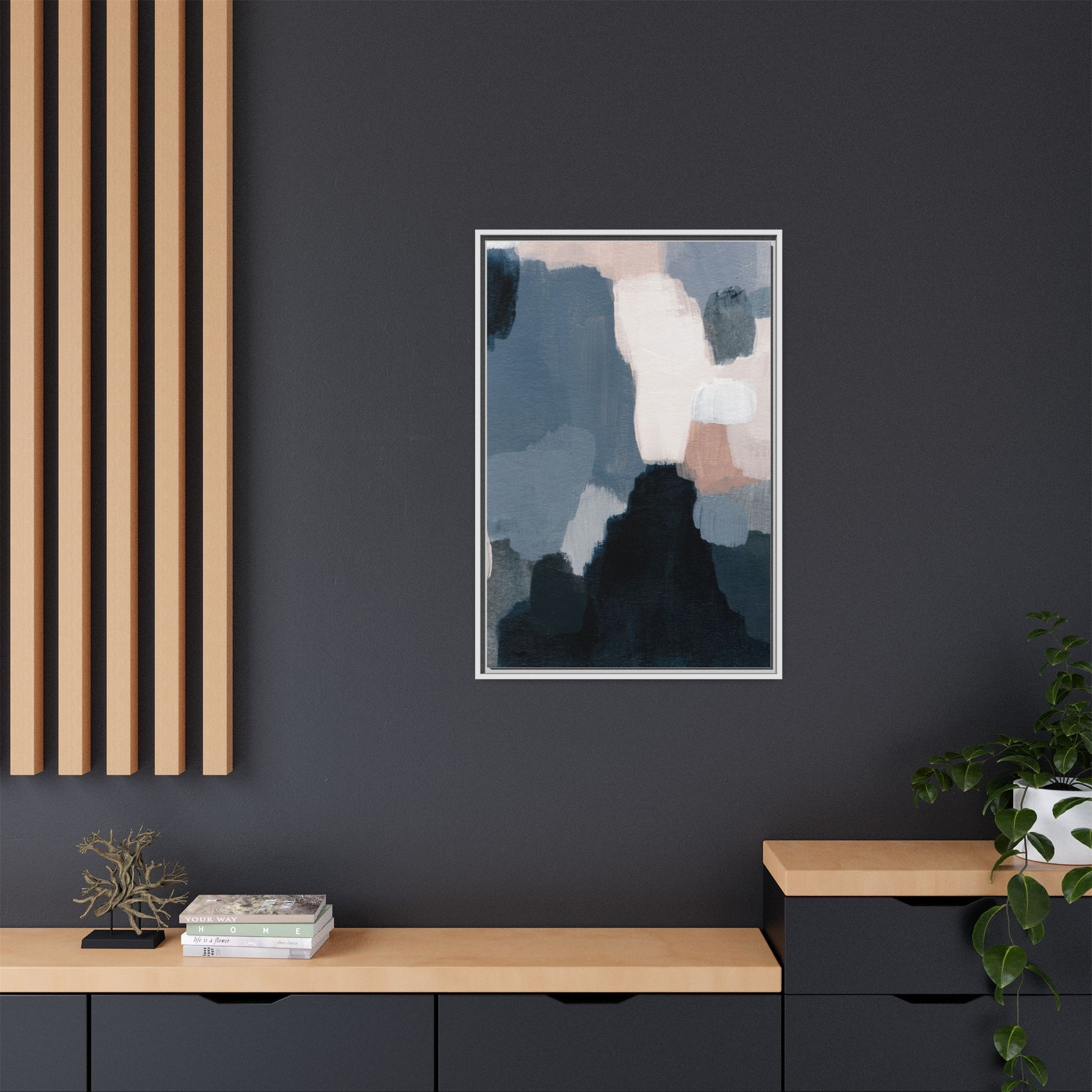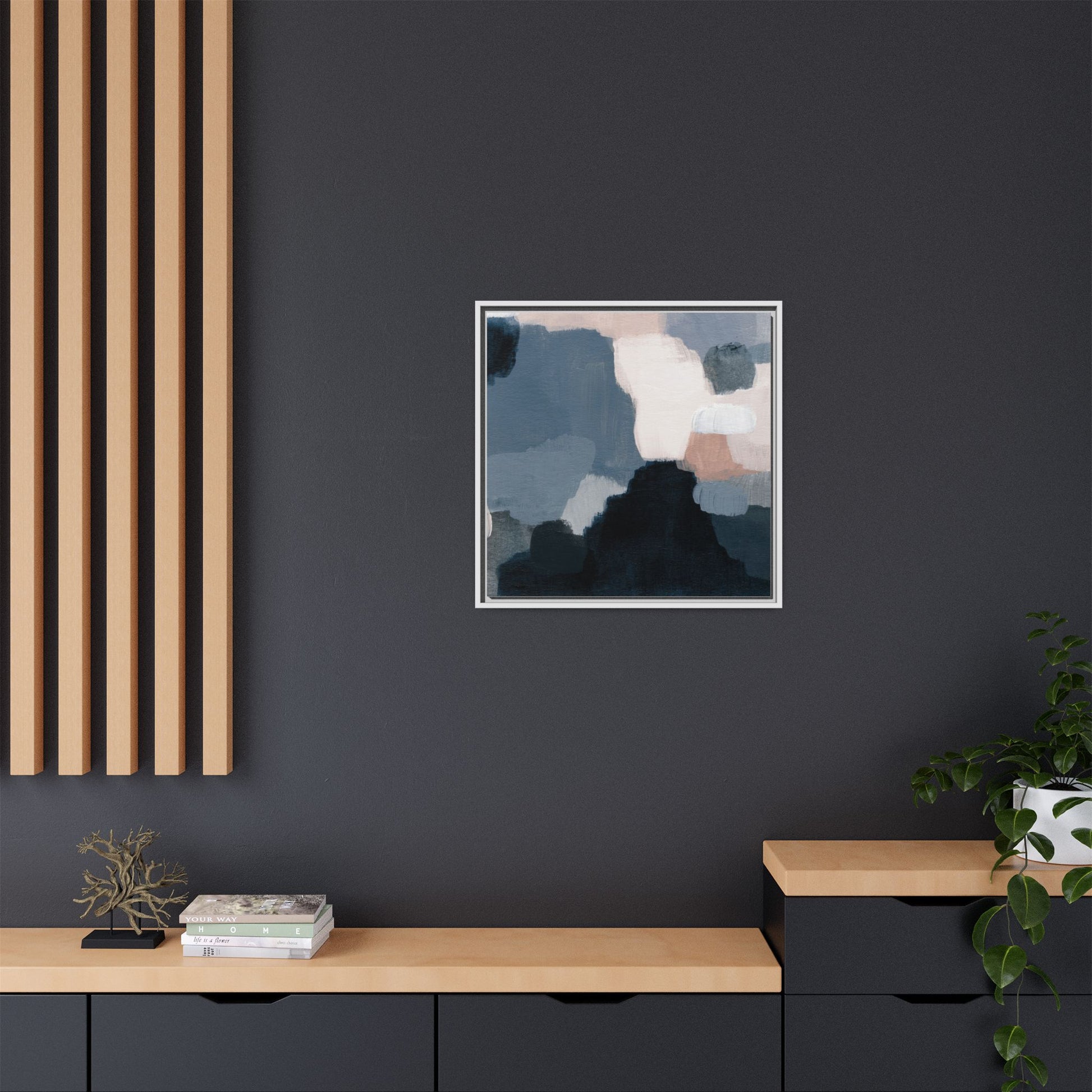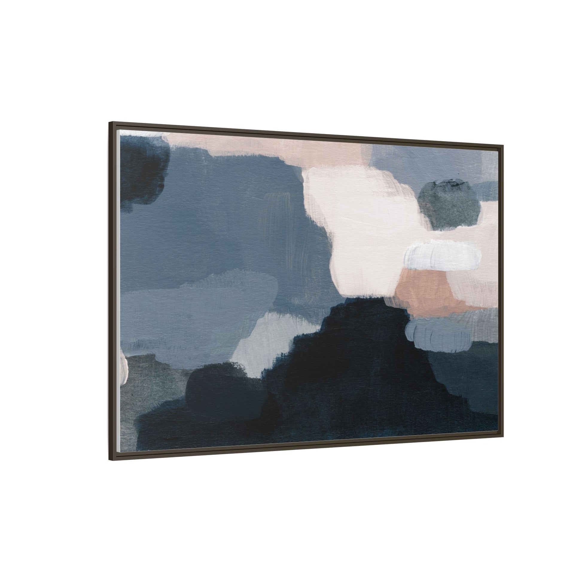 This abstract painting features a serene color palette of deep navy blues, soft grays, muted blush tones, and crisp white hues. The artwork appears to be created with acrylic or watercolor, showcasing loose, layered brushstrokes that create organic, overlapping shapes and forms. Textural brushwork gives the piece a sense of depth and movement, with each color block blending softly into the next, creating a contemplative and balanced composition. The image evokes a sense of landscape or atmospheric elements, with the colors and shapes suggestive of clouds, horizons, or geological formations. The painting's style is minimalist and contemporary, utilizing a restrained color scheme to create a sense of calm and visual harmony.
