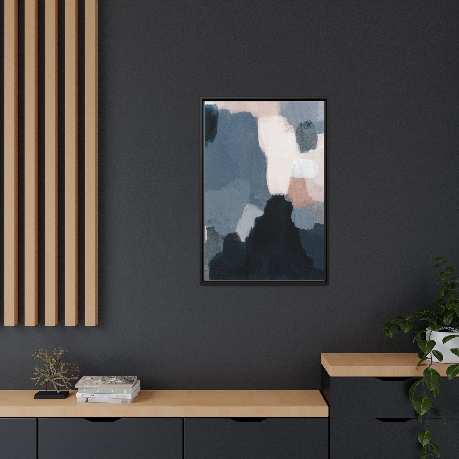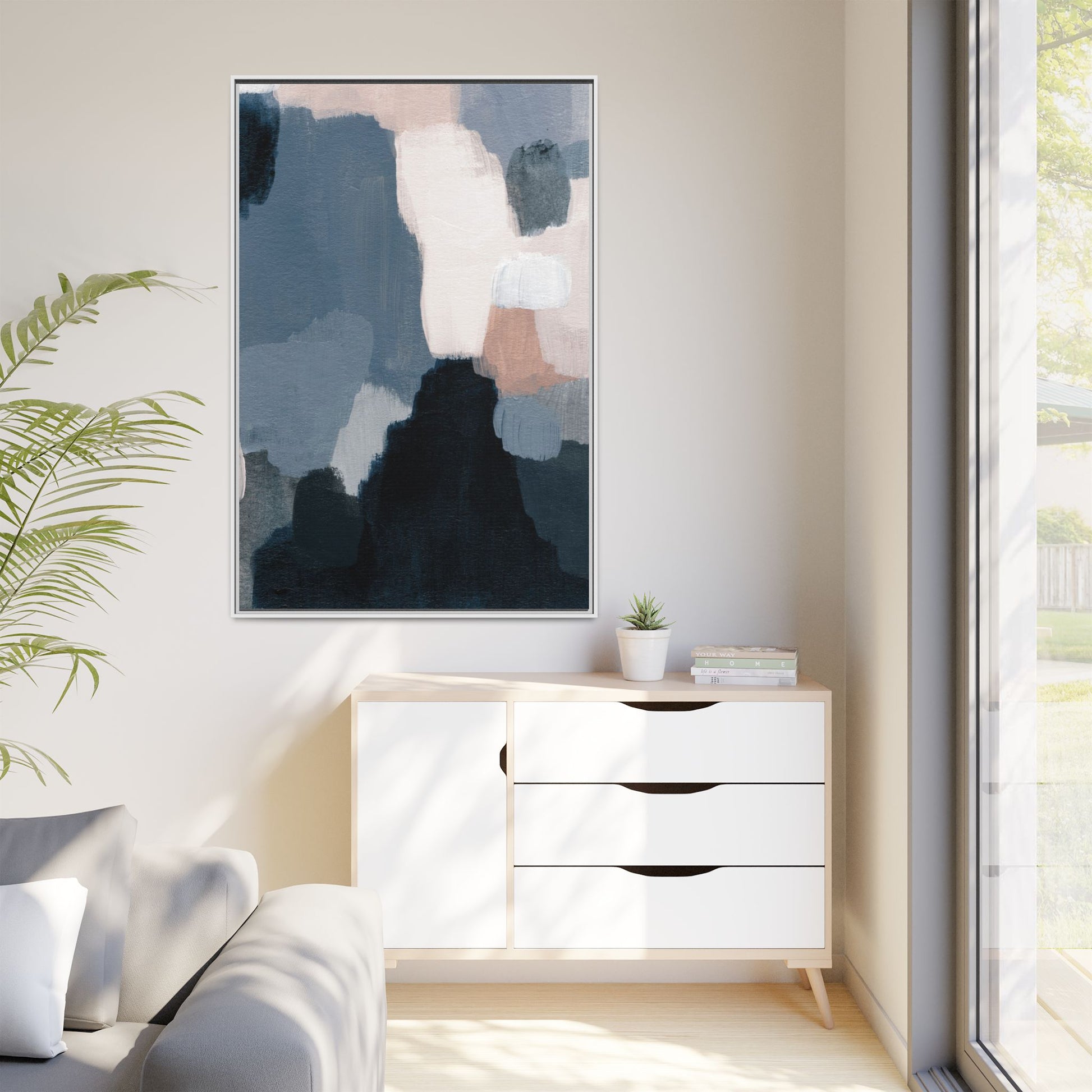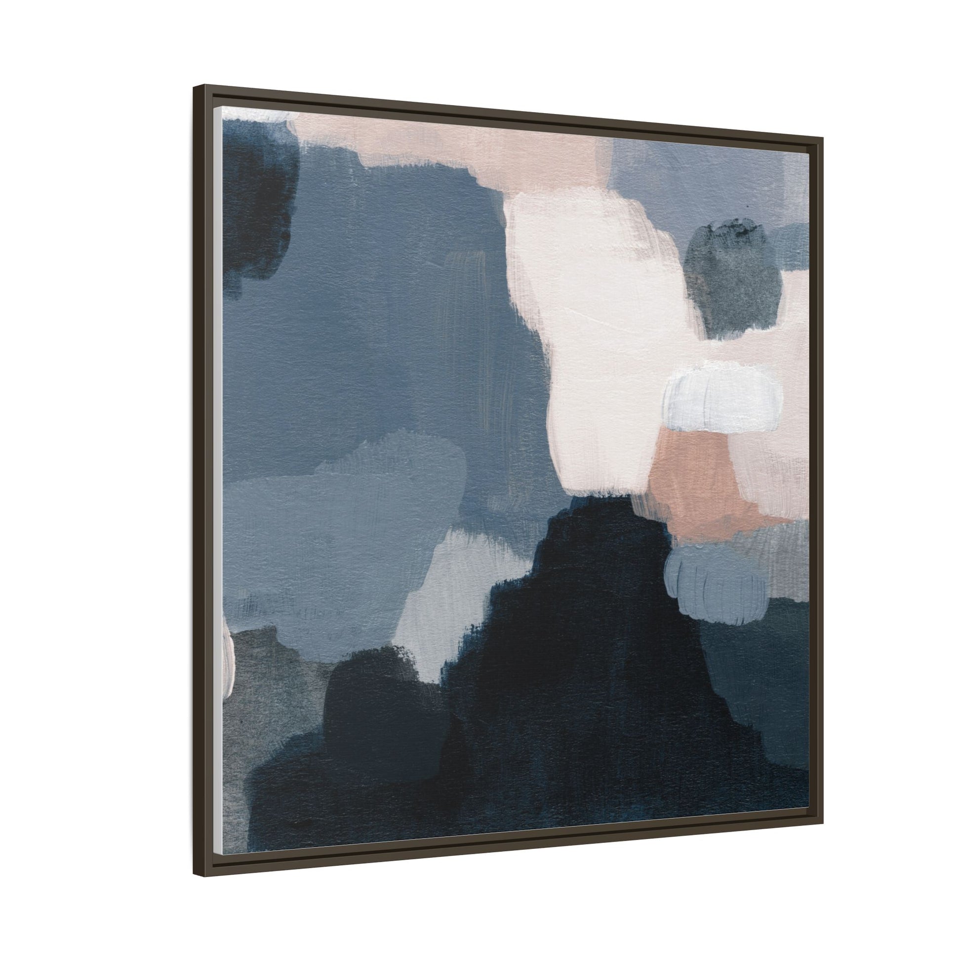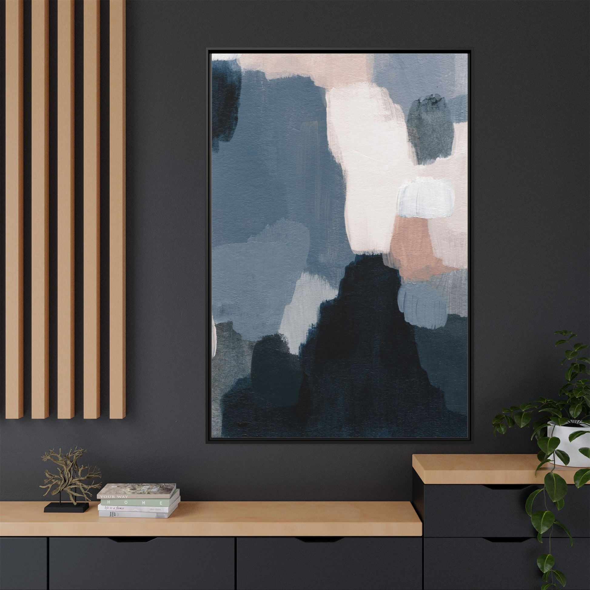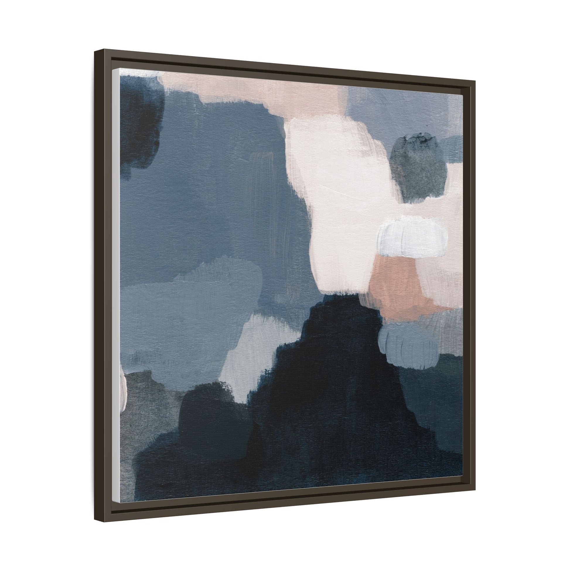 This abstract painting features a serene color palette of deep navy blues, soft grays, muted blush tones, and crisp white hues. The artwork appears to be created with acrylic or watercolor, showcasing loose, layered brushstrokes that create organic, overlapping shapes and forms. Textural brushwork gives the piece a sense of depth and movement, with each color block blending softly into the next, creating a contemplative and balanced composition. The image evokes a sense of landscape or atmospheric elements, with the colors and shapes suggestive of clouds, horizons, or geological formations. The painting's style is minimalist and contemporary, utilizing a restrained color scheme to create a sense of calm and visual harmony.